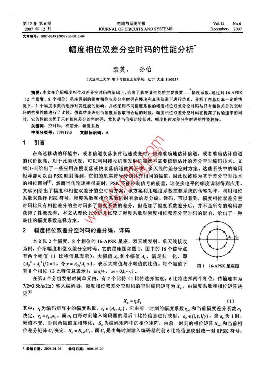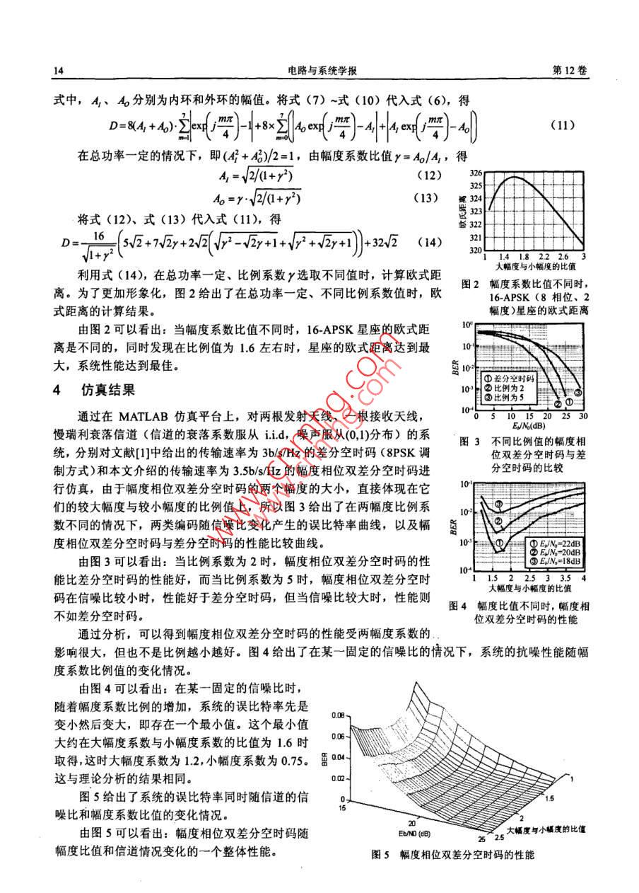 第12卷第6期電路與系統(tǒng)學(xué)報(bào)Vol 12 No 62007年12月JJOURNAL OF CIRCUITS AND SYSTEMSDecember, 2007文章編號(hào):1007-0249(2007)06001204幅度相位雙差分空時(shí)碼的性能分析袁英,孫怡(大連理工大學(xué)電子與信息工程學(xué)院,遼寧大連115023)搞要,本文在介紹幅度相位雙差分空時(shí)碼的基礎(chǔ)上,給出了影響其性能的主要參數(shù)—幅度系數(shù)。通過對(duì)16APSK(2個(gè)幅度、8個(gè)相位)星座調(diào)制的幅度相位雙差分空時(shí)碼在慢瑞利衰落信道下進(jìn)行仿真,分析了在總功率一定的情況下,2個(gè)幅度系數(shù)的選擇對(duì)其性能的影響,并將采用不同幅度系數(shù)的幅度相位雙差分空時(shí)碼與只有相位差分的空時(shí)碼的抗噪性能進(jìn)行了比較。仿真結(jié)果表明當(dāng)幅度系數(shù)取得合適的時(shí)候,幅度相位雙差分空時(shí)碼在提高了傳輸速率的同時(shí),它的性能也優(yōu)于只有相位差分的空時(shí)碼,尤其是當(dāng)信噪比較低時(shí),幅度相位雙差分空時(shí)碼的性能較好。關(guān)鍵詞:空時(shí)碼;雙差分;幅度系數(shù)中圖分類號(hào),TN9193文獻(xiàn)標(biāo)識(shí)碼:A1引言在高速移動(dòng)的環(huán)境中,或者信道衰落條件迅速改變時(shí),很難準(zhǔn)確地估計(jì)信道,或者準(zhǔn)確估計(jì)信道的代價(jià)很高。對(duì)于此類狀況,可以利用接收機(jī)和發(fā)射機(jī)端都不需要信道估計(jì)的差分空時(shí)編碼技術(shù)。文獻(xiàn)[1~5]給出了一些應(yīng)用在慢衰落或快衰落信道的兩天線、多天線的差分空時(shí)方案。這些系統(tǒng)中的編碼矩陣都可以由PSK映射得到,它們的星座符號(hào)分別具有相同的幅值,因此也被稱為基于差分空時(shí)技術(shù)的相位調(diào)制。然而當(dāng)傳輸速率很高時(shí),PSK不能控制信號(hào)的能量,這使多電平的幅度調(diào)制得到應(yīng)用。文獻(xiàn)[]給出了幅度和相位雙差分的空時(shí)碼方案,該方案利用幅度系數(shù)控制系統(tǒng)的傳輸功率,利用相位系數(shù)來選擇PSK符號(hào),幅度系數(shù)和相位系數(shù)同時(shí)有效的差分編、譯碼??梢钥吹?幅度相位雙差分空時(shí)碼比只有相位差分的空時(shí)碼多了幅度系數(shù)的差分,但是加了幅度系數(shù)差分后,并不是所有的編碼都獲得了性能改善。本文從理論上分析并比較了幅度系數(shù)對(duì)幅度相位雙差分空時(shí)碼的影響,給出了一種最佳的幅度系數(shù)選擇方案。2幅度相位雙差分空時(shí)碼的差分編、譯碼本文以2個(gè)幅度、8個(gè)相位的16APSK星座,雙天線發(fā)射、單天線接收為例,介紹幅度相位雙差分空時(shí)碼。它的星座圖如圖1,圖中的16個(gè)信號(hào)點(diǎn)有兩個(gè)幅值(Ⅰ比特信息表示):大幅值A(chǔ)和小幅值A(chǔ),滿足歸一化,即(42+A2)2=1.令y=4/A>1,表示大幅值與小幅值的比值。每個(gè)幅值下圖116As有8個(gè)相位(3比特信息表示):mx/4,m=01…,7在第k個(gè)分組發(fā)射時(shí)間單元內(nèi),有7個(gè)比特(1比特選擇幅度,6比特選擇兩個(gè)相位,傳輸速率為7/2-3.5b/s/Hz)輸入編碼器,幅度相位雙差分空時(shí)碼的空時(shí)編碼矩陣為X,由幅度系數(shù)和相位矩陣決定X=nS其中:n為編碼矩陣中的幅度系數(shù),n∈{4,A},它由前一時(shí)刻的幅度系數(shù)n和當(dāng)前幅度差分系數(shù)a決定,n=嗎,而a由每時(shí)刻輸入編碼器的最后1比特信息進(jìn)行映射,a∈{y,ly},當(dāng)a4為1時(shí),幅值不變,否則兩幅值互相轉(zhuǎn)化;S為編碼矩陣中的相位矩陣,由前一時(shí)刻的相位矩陣S和當(dāng)前相位差分矩陣C決定,S4=SC,而C4是由每時(shí)刻輸入編碼器的前6比特信息映射成一對(duì)8PSK符號(hào),·收稿日期,200601-06修訂日期:2006-03-20第6期袁英等:幅度相位雙差分空時(shí)碼的性能分析再通過正交設(shè)計(jì)而形成的酉矩陣。假設(shè)信道為頻率非選擇性衰落信道,則在第k個(gè)符號(hào)周期,接收天線上接收的信號(hào)為=√P/2HX4+N(2)其中:H為接收數(shù)據(jù)矩陣,p為每根接收天線的信噪比,H為信道矩陣,N為獨(dú)立同分布的信道噪聲,滿足復(fù)高斯N(0,)(均值為0,方差為1)分布。通過差分變量代換,得II=aICt+N(3)其中,N=N4-aNC4。由于C為酉矩陣,所以N滿足復(fù)高斯M0、+a)分布幅度相位雙差分空時(shí)碼的譯碼分為兩步:第一步檢測(cè)幅度信息位切= arg(4)式中, argminf'(x)表示求使f(x)達(dá)到最小值時(shí)的x值,表示矩陣的 Frobenius范數(shù)。依據(jù)檢測(cè)結(jié)果逆映射得到原輸入編碼器的幅度信息。第二步檢測(cè)酉矩陣C。將式(4)得到的a帶入式(3),通過搜索得到C的檢測(cè)式:CaY -a, -I(5)將C逆映射得到原輸入編碼器的相位信息。將譯碼后獲得的幅度信息和相位信息聯(lián)合起來,就完成了整個(gè)系統(tǒng)的譯碼3性能分析幅度相位雙差分空時(shí)碼采用幅度和相位同時(shí)差分的方法來提高編碼性能,其中相位系數(shù)部分利用正交設(shè)計(jì)的準(zhǔn)則來提高系統(tǒng)的性能;而幅度系數(shù)則用來控制系統(tǒng)的功率,但是對(duì)于16APSK來說,兩種幅度的距離的大小是直接影響系統(tǒng)的抗噪性能的。比如,當(dāng)兩個(gè)幅度相差很小時(shí),即圖1上外環(huán)和內(nèi)環(huán)很接近時(shí),相同相位的兩個(gè)碼的間距必然減小,造成譯碼錯(cuò)誤;而當(dāng)幅度相差很大時(shí),由于兩個(gè)幅度受到歸一化的限制