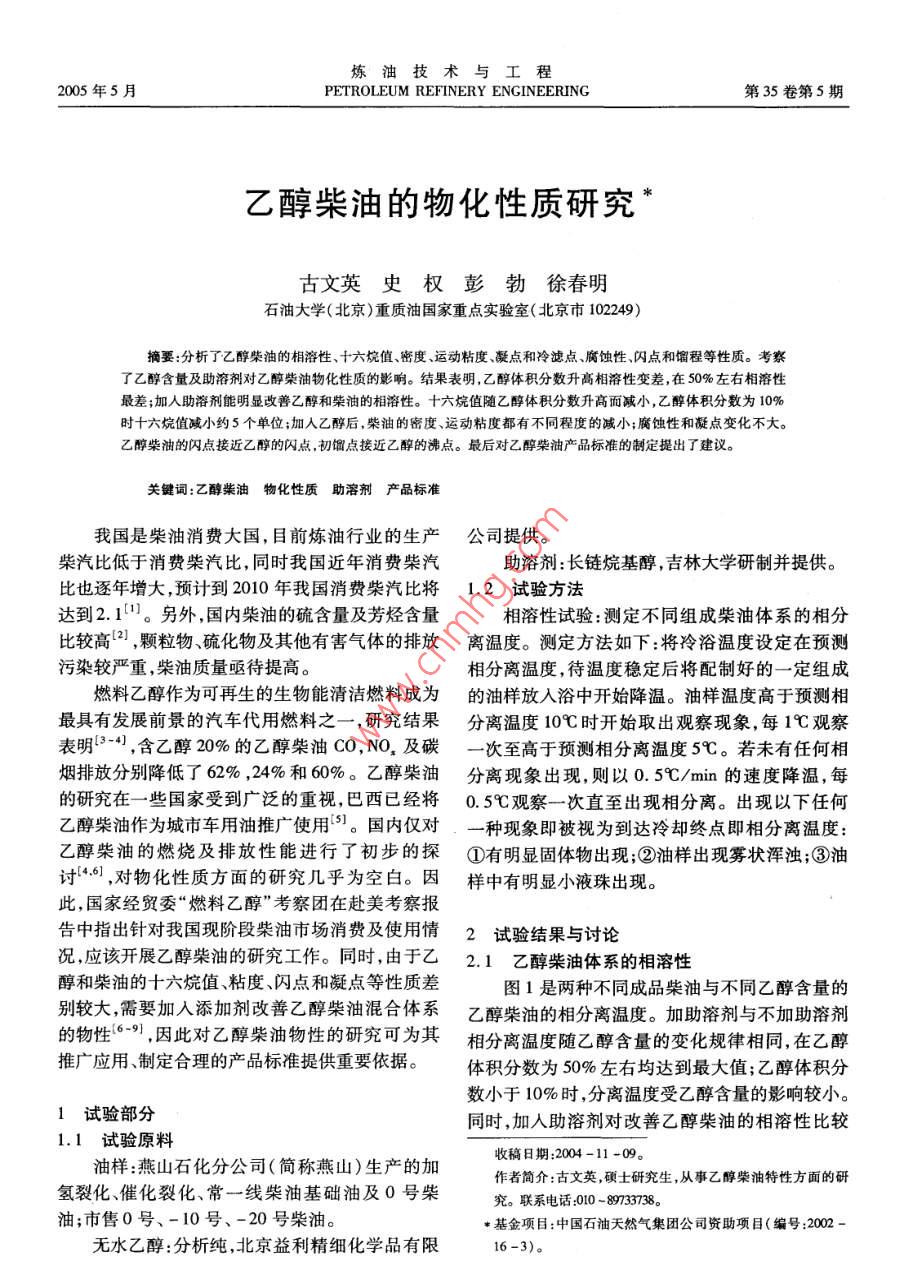 煉油技術(shù)與工程2005年5月PETROLEUM REFINERY ENGINEERING第35卷第5期乙醇柴油的物化性質(zhì)研究古文英史權(quán)彭勃徐春明石油大學(xué)(北京)重質(zhì)油國(guó)家重點(diǎn)實(shí)驗(yàn)室(北京市102249)摘要:分析了乙醇柴油的相溶性、十六烷值、密度、運(yùn)動(dòng)粘度、凝點(diǎn)和冷濾點(diǎn)、腐蝕性、閃點(diǎn)和餾程等性質(zhì)??疾炝艘掖己考爸軇?duì)乙醇柴油物化性質(zhì)的影響。結(jié)果表明,乙醇體積分?jǐn)?shù)升高相溶性變差,在50%左右相溶性最差;加人助溶劑能明顯改善乙醇和柴油的相溶性。十六烷值隨乙醇體積分?jǐn)?shù)升高而減小,乙醇體積分?jǐn)?shù)為10%時(shí)十六烷值減小約5個(gè)單位;加入乙醇后,柴油的密度、運(yùn)動(dòng)粘度都有不同程度的減小;腐蝕性和凝點(diǎn)變化不大。乙醇柴油的閃點(diǎn)接近乙醇的閃點(diǎn),初餾點(diǎn)接近乙醇的沸點(diǎn)。最后對(duì)乙醇柴油產(chǎn)品標(biāo)準(zhǔn)的制定提出了建議。關(guān)鍵詞:乙醇柴油物化性質(zhì)助溶劑產(chǎn)品標(biāo)準(zhǔn)我國(guó)是柴油消費(fèi)大國(guó),目前煉油行業(yè)的生產(chǎn)公司提供。柴汽比低于消費(fèi)柴汽比,同時(shí)我國(guó)近年消費(fèi)柴汽助溶劑:長(zhǎng)鏈烷基醇,吉林大學(xué)研制并提供比也逐年增大,預(yù)計(jì)到2010年我國(guó)消費(fèi)柴汽比將1.2試驗(yàn)方法達(dá)到2.11。另外,國(guó)內(nèi)柴油的硫含量及芳烴含量相溶性試驗(yàn):測(cè)定不同組成柴油體系的相分比較高2,顆粒物、硫化物及其他有害氣體的排放離溫度。測(cè)定方法如下:將冷浴溫度設(shè)定在預(yù)測(cè)污染較嚴(yán)重,柴油質(zhì)量亟待提高。相分離溫度,待溫度穩(wěn)定后將配制好的一定組成燃料乙醇作為可再生的生物能清潔燃料成為的油樣放入浴中開(kāi)始降溫。油樣溫度高于預(yù)測(cè)相最具有發(fā)展前景的汽車代用燃料之一,研究結(jié)果分離溫度10℃時(shí)開(kāi)始取出觀察現(xiàn)象,每1℃觀察表明3“,含乙醇20%的乙醇柴油CO,NO,及碳次至高于預(yù)測(cè)相分離溫度5℃。若未有任何相煙排放分別降低了62%,24%和60%。乙醇柴油分離現(xiàn)象出現(xiàn),則以0.5℃/mn的速度降溫,每的研究在一些國(guó)家受到廣泛的重視,巴西已經(jīng)將0.5℃觀察一次直至出現(xiàn)相分離。出現(xiàn)以下任何乙醇柴油作為城市車用油推廣使用。國(guó)內(nèi)僅對(duì)一種現(xiàn)象即被視為到達(dá)冷卻終點(diǎn)即相分離溫度:乙醇柴油的燃燒及排放性能進(jìn)行了初步的探①有明顯固體物出現(xiàn);②油樣出現(xiàn)霧狀渾濁;③油討6),對(duì)物化性質(zhì)方面的研究幾乎為空白。因樣中有明顯小液珠出現(xiàn)。此,國(guó)家經(jīng)貿(mào)委“燃料乙醇”考察團(tuán)在赴美考察報(bào)告中指出針對(duì)我國(guó)現(xiàn)階段柴油市場(chǎng)消費(fèi)及使用情2試驗(yàn)結(jié)果與討論況應(yīng)該開(kāi)展乙醇柴油的研究工作。同時(shí),由于乙2.1乙醇柴油體系的相溶性醇和柴油的十六烷值、粘度、閃點(diǎn)和凝點(diǎn)等性質(zhì)差圖1是兩種不同成品柴油與不同乙醇含量的別較大需要加人添加劑改善乙醇柴油混合體系乙醇柴油的相分離溫度。加助溶劑與不加助溶劑的物性9,因此對(duì)乙醇柴油物性的研究可為其相分離溫度隨乙醇含量的變化規(guī)律相同,在乙醇推廣應(yīng)用、制定合理的產(chǎn)品標(biāo)準(zhǔn)提供重要依據(jù)。體積分?jǐn)?shù)為50%左右均達(dá)到最大值;乙醇體積分?jǐn)?shù)小于10%時(shí),分離溫度受乙醇含量的影響較小。1試驗(yàn)部分同時(shí),加人助溶劑對(duì)改善乙醇柴油的相溶性比較1.1試驗(yàn)原料油樣:燕山石化分公司(簡(jiǎn)稱燕山)生產(chǎn)的加收稿日期:2004-11-09。作者簡(jiǎn)介:古文英,碩士研究生,從事乙醇柴油特性方面的研氫裂化、催化裂化、常一線柴油基礎(chǔ)油及0號(hào)柴究。聯(lián)系電話:010-89733738油;市售0號(hào)、-10號(hào)、-20號(hào)柴油。*基金項(xiàng)目:中國(guó)石油天然氣集團(tuán)公司資助項(xiàng)目(編號(hào):2002無(wú)水乙醇:分析純,北京益利精細(xì)化學(xué)品有限16-3)。煉油技術(shù)與工程2005年第35卷明顯,加入質(zhì)量分?jǐn)?shù)為1.5%的助溶劑可使含乙醇不同組成乙醇柴油的實(shí)測(cè)密度如表2所示。10%的0號(hào)乙醇柴油相分離溫度降低7℃,-20與實(shí)測(cè)值相比,公式法所得混合密度結(jié)果相對(duì)誤號(hào)乙醇柴油降低12℃,兩種乙醇柴油均能達(dá)到使差不大于0.04%。所以可直接采用公式法求得乙用溫度的要求。醇柴油的密度?;A(chǔ)柴油的密度越大,相同含量乙醇的混合油樣的密度減小率越大,但減小率整體幅度較小。乙醇體積分?jǐn)?shù)為15%的乙醇柴油密度減小率最大為1.15%表2乙醇含量的乙醇柴油的實(shí)測(cè)密度(20℃)φ(乙醇),%燕山常一線柴油基礎(chǔ)油0.80200.80040.799401020304050607080燕山加氫裂化柴油0.82000.81640.8145油中乙醇體積分?jǐn)?shù),%燕山催化裂化柴油0.85860.85240.8493圖1乙醇柴油的相溶性市售-20號(hào)柴油0.85340.84830.84491-0號(hào)柴油,不含助溶劑;2-0號(hào)柴油,助溶劑質(zhì)量分?jǐn)?shù)市售-10號(hào)柴油0.86030.85440.8504為1.5%;3—-20號(hào)柴油,不含助溶劑;4--20號(hào)柴油助溶劑質(zhì)量分?jǐn)?shù)為1,5%2.4運(yùn)動(dòng)粘度理論上分析9,乙醇和