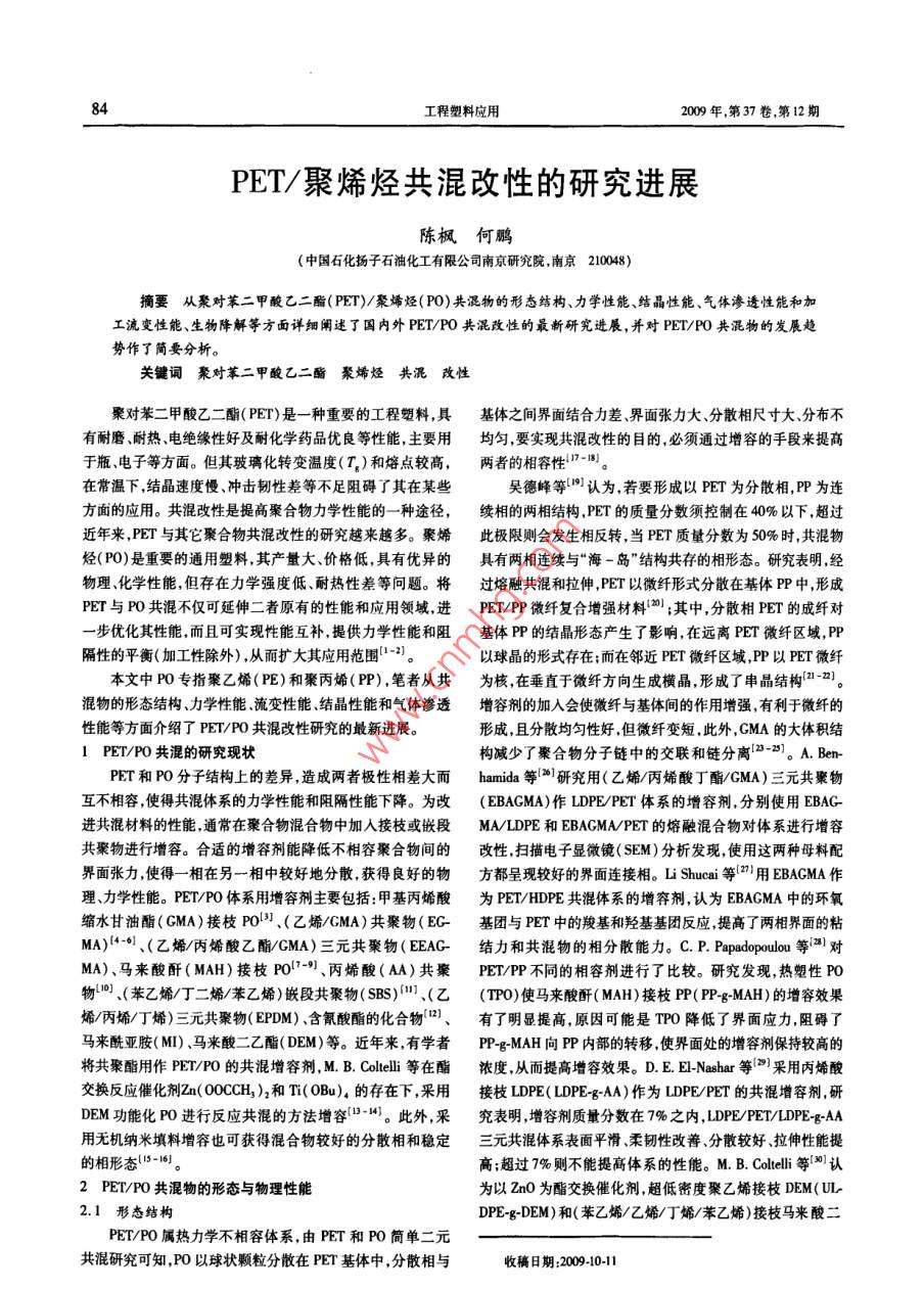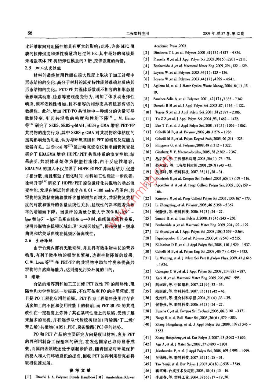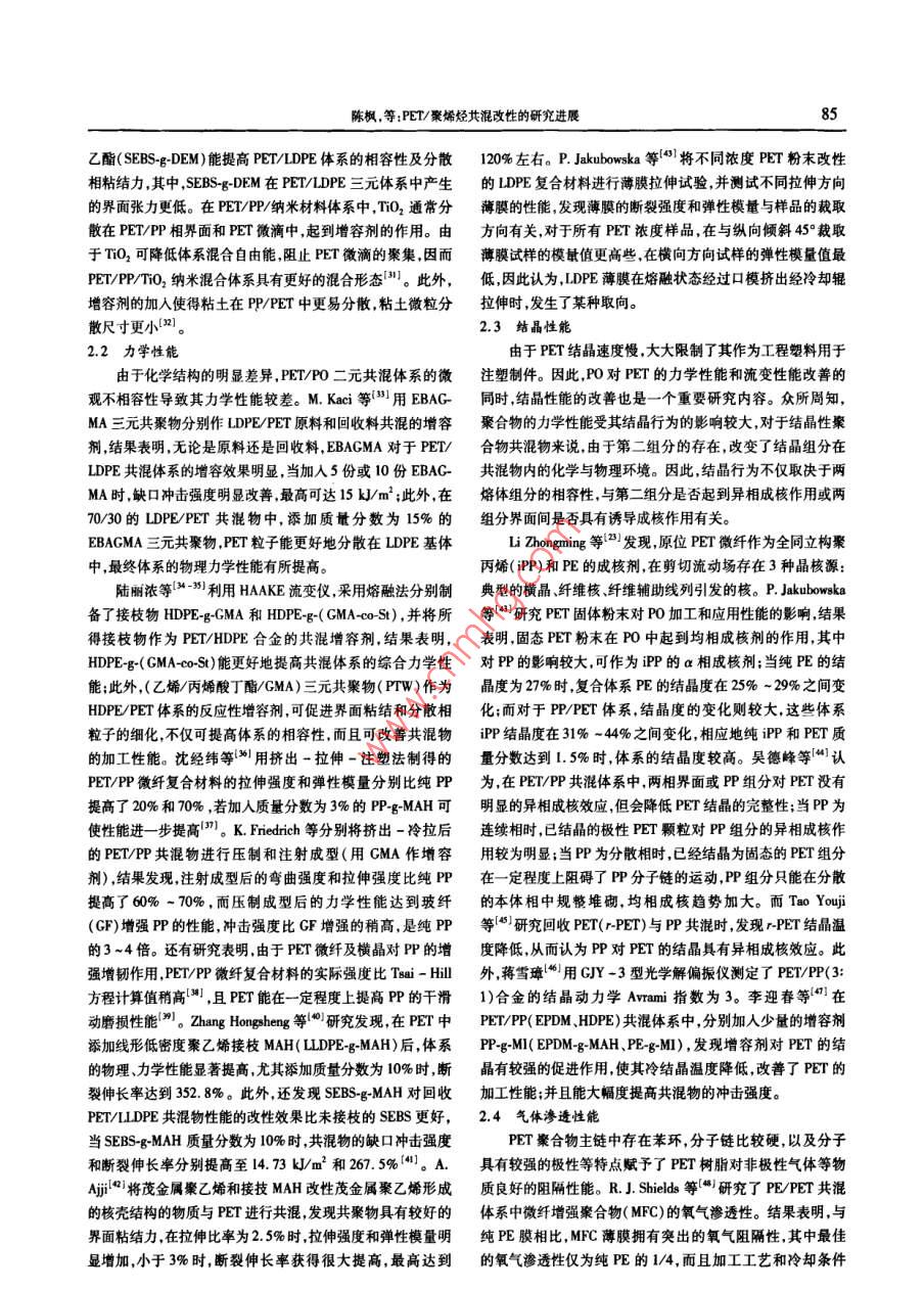 84工程塑料應(yīng)用2009年,第37卷,第12期PET/聚烯烴共混改性的研究進(jìn)展陳楓何鵬(中國石化揚(yáng)子石油化工有限公司南京研究院,南京210048)摘要從聚對苯二甲酸乙二酯( PET)/聚烯烴(P0)共混物的形態(tài)結(jié)構(gòu)、 力學(xué)性能、結(jié)晶性能 氣體滲透性能和加工流變性能、生物降解等方面詳細(xì)闡述了國內(nèi)外PET/PO共混改性的最新研究進(jìn)展,并對PET/P0共混物的發(fā)展趨勢作了簡要分析。關(guān)鍵詞聚對苯二甲酸乙二酯 聚烯烴共混改性聚對苯二甲酸乙二酯( PET)是一種重要的工程塑料,具基體之間界面結(jié)合力差、界面張力大分散相尺寸大分布不有耐磨耐熱、電絕緣性好及耐化學(xué)藥品優(yōu)良等性能,主要用均勻,要實(shí)現(xiàn)共混改性的目的,必須通過增容的手段來提高于瓶、電子等方面。但其玻璃化轉(zhuǎn)變溫度( rg)和熔點(diǎn)較高,兩者的相容性!"7-8。在常溫下,結(jié)晶速度慢、沖擊韌性差等不足阻礙了其在某些吳德峰等l%認(rèn)為,若要形成以PET為分散相,PP為連方面的應(yīng)用。共混改性是提高聚合物力學(xué)性能的一-種 途徑,續(xù)相的兩相結(jié)構(gòu), PET的質(zhì)量分?jǐn)?shù)須控制在40%以下,超過近年來,PET與其它聚合物共混改性的研究越來越多。聚烯此極限則會發(fā)生相反轉(zhuǎn),當(dāng)PET質(zhì)量分?jǐn)?shù)為50%時(shí),共混物烴( PO)是重要的通用塑料,其產(chǎn)量大、價(jià)格低,具有優(yōu)異的具有兩相連續(xù)與“海-島”結(jié)構(gòu)共存的相形態(tài)。研究表明,經(jīng)物理化學(xué)性能,但存在力學(xué)強(qiáng)度低、耐熱性差等問題。將過熔融共混和拉伸,PET以微纖形式分散在基體PP中,形成PET與PO共混不僅可延伸二者原有的性能和應(yīng)用領(lǐng)域,進(jìn)PET/PP微纖復(fù)合增強(qiáng)材料}2) ;其中,分散相PET的成纖對-步優(yōu)化其性能.而且可實(shí)現(xiàn)性能互補(bǔ),提供力學(xué)性能和阻基體PP的結(jié)晶形態(tài)產(chǎn)生了影響,在遠(yuǎn)離PET微纖區(qū)域,PP隔性的平衡(加工性除外),從而擴(kuò)大其應(yīng)用范圍(1-2)。以球晶的形式存在;而在鄰近PET微纖區(qū)域,PP以PET微纖本文中PO專指聚乙烯( PE)和聚丙烯(PP),筆者從共為核,在垂直于微纖方向生成橫晶,形成了串晶結(jié)構(gòu)(21 -7)。混物的形態(tài)結(jié)構(gòu)力學(xué)性能.流變性能.結(jié)晶性能和氣體滲透增容劑的加入會使微纖與基體間的作用增強(qiáng),有利于微纖的性能等方面介紹了PET/PO共混改性研究的最新進(jìn)展。形成,且分散均勻性好,但微纖變短,此外,GMA的大體積結(jié)1 PET/P0 共混的研究現(xiàn)狀構(gòu)減少了聚合物分子鏈中的交聯(lián)和鏈分離[2-21。A. Ben-PET和PO分子結(jié)構(gòu)上的差異,造成兩者極性相差大而hamida等'2*1 研究用(乙烯/丙烯酸丁酯/GMA)三元共聚物互不相容,使得共混體系的力學(xué)性能和阻隔性能下降。為改(EBACMA)作LDPE/PET體系的增容劑,分別使用EBAG-進(jìn)共混材料的性能,通常在聚合物混合物中加入接枝或嵌段MA/LDPE和EBAGMA/PET的熔融混合物對體系進(jìn)行增容共聚物進(jìn)行增容。合適的增容劑能降低不相容聚合物間的改性,掃描電子顯微鏡(SEM)分析發(fā)現(xiàn),使用這兩種母料配界面張力,使得- -相在另一相中較好地分散,獲得良好的物方都呈現(xiàn)較好的界面連接相。Li Shuceai等[2)用EBAGMA作理、力學(xué)性能。PET/PO 體系用增容劑主要包括:甲基丙烯酸為PET/HDPE共混體系的增容劑,認(rèn)為EBAGMA中的環(huán)氧縮水甘油酯( GMA)接枝P0l)].(乙烯/GMA)共聚物( EG-基團(tuán)與PET中的羧基和羥基基團(tuán)反應(yīng),提高了兩相界面的粘MA)[4-61、(乙烯/丙烯酸乙酯/GMA)三元共聚物( EEAG-結(jié)力和共混物的相分散能力。C. P. Papadopoulou等8]對MA)、馬來酸酐(MAH)接枝P017-9)、丙烯酸(AA)共聚PET/PP不同的相容劑進(jìn)行了比較。研究發(fā)現(xiàn),熱塑性PO物["0] .(苯乙烯/丁二烯/苯乙烯)嵌段共聚物( SBS)".(乙(TPO)使馬來酸酐( MAH)接枝PP( PP-g-MAH)的增容效果烯/丙烯/丁烯)三元共聚物( EPDM)、含氰酸酯的化合物[2]、有了明顯提高,原因可能是TPO降低了界面應(yīng)力,阻礙了馬來酰亞胺( MI)、馬來酸二乙酯(DEM)等。近年來,有學(xué)者PP-g-MAH向PP內(nèi)部的轉(zhuǎn)移,使界面處的增容劑保持較高的將共聚酯用作PET/PO 的共混增容劑, M. B. Coleli等在酯濃度,從而提高增容效果。D. E. E-Nashar等[采用丙烯酸交換反應(yīng)催化劑Zn( 00CCH,)2和Ti(OBu)。的存在下,采用接枝LDPE( LDPE-g-AA)作為LDPE/PET的共混增容劑,研DEM功能化PO進(jìn)行反應(yīng)共混的方法增容(-4。此外,采究表明,增容劑質(zhì)量分?jǐn)?shù)在7%之內(nèi), LDPE/PET/LDPE.g-AA用無機(jī)納米填料增容也可獲得混合物較好的分散相和穩(wěn)定三元共混體系表面平滑、柔韌性改善、分散較好、拉伸性能提的相形態(tài)15-16。高;超過7%則不能提高體系的性能。M. B. Coleli等{0]認(rèn)2 PET/P0 共混物的形態(tài)與物理性能為以Zn0為酯交換催化劑,超低密度聚乙烯接枝DEM(UL~2.1形 態(tài)結(jié)構(gòu)DPE-g-DEM)和(苯乙烯/乙烯/丁烯/苯乙烯)接枝馬來酸二PET/PO屬熱力學(xué)不相容體系,由PET和PO簡單二元共混研究可知,P0以球狀顆粒分散在PET基體中,分散相與收稿日期:2009-10-11陳楓,等:PET/聚烯烴共混政性的研究進(jìn)展35乙酯( SEBS-gDEM)能提高PET/LDPE體系的相容性及分散120%左右。P. Jakubowska