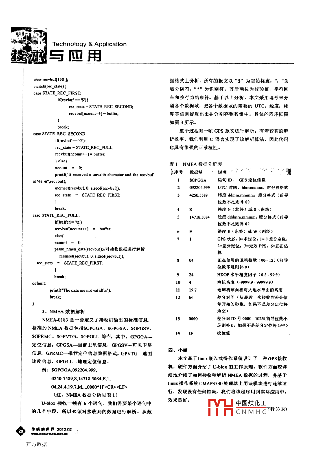 Technollogy Application被測(cè)與回用葚!N的GP齣應(yīng)周摘要:基于凵-box公司的LEA-5S模塊,介紹了GPS在inux俄人式操作系統(tǒng)上的應(yīng)用以及具體買現(xiàn),并洋細(xì)分析了模塊的硬件實(shí)現(xiàn)以及軟件方面NEA數(shù)據(jù)的接收和解析的方法,最后在實(shí)際平臺(tái)進(jìn)行了調(diào)試與論證。結(jié)果表明,該模塊具有硬件簡(jiǎn)單、定位精度高,穩(wěn)定性好的優(yōu)點(diǎn),相應(yīng)的軟件有較好的可移植性,實(shí)際應(yīng)用中效果良好關(guān)鍵詞:Lnux;GPs;NEMA;接收;解析中圖分類號(hào):TP3文獻(xiàn)標(biāo)識(shí)碼:A文章編號(hào):1006-883×(2012)020018-04收稿日期:2011-12-12陳雪小引言隨著信息化、智能化、網(wǎng)絡(luò)化的發(fā)展,嵌入式系統(tǒng)技術(shù)已經(jīng)全面滲透到日常生活中的每個(gè)角落。嵌入式 linux操作系統(tǒng)由于它可以移植到多個(gè)不同的結(jié)構(gòu)的CPU和硬件平臺(tái)上,具有很好的穩(wěn)定性,各種性能的升級(jí)能力,并且其是開(kāi)放的,提供標(biāo)準(zhǔn)的API,能夠方便地與眾多第三方的軟硬件溝通,使其得到了廣泛的應(yīng)用叫。GPS即全球定位系統(tǒng),這個(gè)系統(tǒng)可以保證在任意時(shí)刻,地球上任意一點(diǎn)都可以同時(shí)觀測(cè)到4顆衛(wèi)星,以保證用戶GPS模塊可以采集到各觀察點(diǎn)的經(jīng)緯度和高度,以便實(shí)現(xiàn)導(dǎo)航、定位、授時(shí)等功能。GPS模塊分為軟GPS和硬GPS。軟GPS一般需要主控芯片控制其運(yùn)行狀態(tài),直接輸出衛(wèi)星數(shù)據(jù),利用應(yīng)用處理器端進(jìn)行解析計(jì)算再轉(zhuǎn)換為標(biāo)準(zhǔn)NMEA(國(guó)際海洋電子協(xié)會(huì)),因此驅(qū)動(dòng)相對(duì)復(fù)雜。而硬GPS是功能獨(dú)立的模塊,上電就可以運(yùn)行,直接輸出NMEA數(shù)據(jù)(。本文采用的是ubox公司生產(chǎn)的LEA-5S模塊介紹其硬件實(shí)現(xiàn)以及相應(yīng)的軟件實(shí)現(xiàn)。二、GPS模塊硬件GPS RFIN走線按500阻抗匹配實(shí)現(xiàn)LEA-5s模塊B定位精度為25m,定位性能優(yōu)異準(zhǔn)C:160803U60IT確,在防漫反射及數(shù)BHD OLT抗干擾能力方面十分強(qiáng)勁,并且其外圍電路十分簡(jiǎn)單TMIEPLLSE中國(guó)煤化工其電路圖如圖1所圖1LEA5S外圍電路圖CNMHG示H傳感器世界201202Technology Application如圖1所示,模塊采用33V供電,需要注意的是: options. c cc[VTIME]可以通過(guò)UART、USB以及SPI與應(yīng)用和 options. c cc [Vmin對(duì)read函數(shù)影響處理器連接和通訊,本文采用UART接較大。VTME指定了等待的時(shí)間,VMIN口。圖中VANT引腳可以對(duì)有源天線的初始化指定了讀取字節(jié)的最小數(shù)量正常、開(kāi)路及短路進(jìn)行檢測(cè),并可以自2、NMEA數(shù)據(jù)的接收動(dòng)在NMEA數(shù)據(jù)里輸出。接收NMEA數(shù)據(jù)本文在非阻塞的方式下采用o多路轉(zhuǎn)接 select對(duì)串口文件描述符的狀態(tài)三、GPS模塊軟件實(shí)現(xiàn)解析NMEA數(shù)據(jù)進(jìn)行監(jiān)視。 select函數(shù)原型為:int由于LEA58通過(guò)UART直接與處elect( int nfds, fd set * readfds, fd set理器進(jìn)行通訊,因此對(duì)處理器而言,驅(qū)顯示NMEA數(shù)據(jù).writefds, fd set*exceptfds, struct timeval動(dòng)主要為 linux標(biāo)準(zhǔn)的串口驅(qū)動(dòng),應(yīng)用時(shí)"timeout);當(dāng)串口句柄沒(méi)有變化時(shí),程序只要打開(kāi)相應(yīng)串口即可。其程序的總體將阻塞,阻塞的時(shí)間取決于 select的第三框圖如圖2所示。圖2模塊總體程序流程圖個(gè)形參 struct timeval'" timeout 3.本文將1、模塊初始化timeout值設(shè)為NULL,程序?qū)⒁恢蓖A裟K初始化主要是對(duì)GPS相關(guān)GPo直到串口句柄發(fā)生變化,即只有串口接的設(shè)置和串口的設(shè)置。首先設(shè)置引腳NMEA數(shù)據(jù)收到數(shù)據(jù)時(shí)才不會(huì)阻塞。解析GPS ON為高電平,處理器發(fā)出一個(gè)脈當(dāng)串口文件描述符發(fā)生變化后,調(diào)沖對(duì)引腳 GPS RST進(jìn)行復(fù)位,最后打開(kāi)利用“,·解析出各數(shù)據(jù)域井用read函數(shù)讀取一個(gè)字符到緩存 buffer;電源對(duì)其供電。然后打開(kāi)串口,設(shè)置波存于二維數(shù)據(jù) Comma[(n]中由于本文串口設(shè)置為: options.c_cc特率,數(shù)據(jù)位,奇偶校驗(yàn)位以及停止位[VTIME]=150; options. c cclVMIN]0等信息。 termios函數(shù)族提供了一個(gè)常規(guī)“GGA所以read調(diào)用讀到數(shù)據(jù)則立即返回,否的終端接口,用于控制非同步通信端口。則將為每個(gè)字符最多等待ⅤTIME時(shí)間。結(jié)構(gòu)體為:為使程序有較好的規(guī)范性和可移植hh: mmstruct termio性,本文在程序設(shè)計(jì)中采用狀態(tài)機(jī)的設(shè)經(jīng)度 Comma12]了符型轉(zhuǎn)化為計(jì)方法。由于所接收到的NMEA數(shù)據(jù)unsigned short c_iag,/·輸入模式標(biāo)整型“度分”格式首字符和次字符均為“$”和“G”,本文unsigned short c_onag;P·輸出模式標(biāo)緯度comm4]字子符型轉(zhuǎn)化為將依此為狀態(tài)改變的觸發(fā)條件。程序首志整型“度分格式先定義一個(gè)緩存數(shù)組 recvbuf并初始化一unsigned short c cflag;/·控制模式標(biāo)個(gè)起始狀態(tài),當(dāng)緩存buer收到首字符卩星使用數(shù)景 Comma[門字符型轉(zhuǎn)化為整型$”時(shí),觸發(fā)了狀態(tài)改變?yōu)榈诙€(gè)狀態(