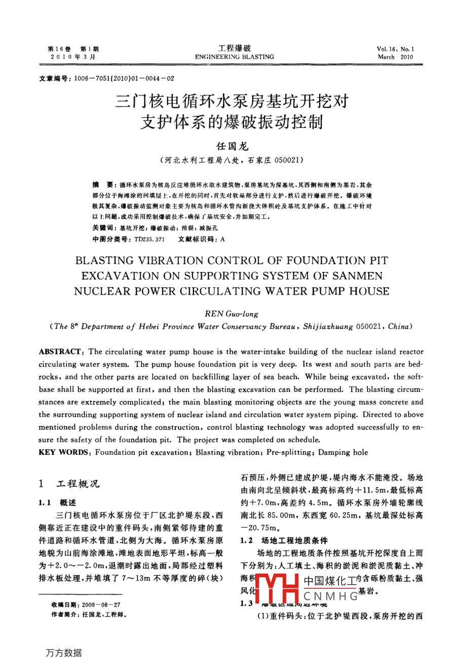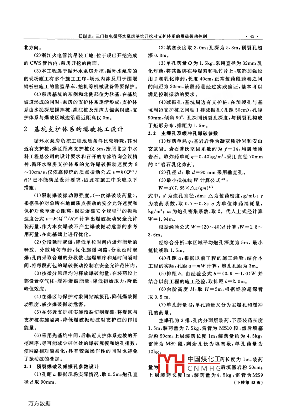 第16卷第1期工程爆破Vol. 16, No. 1.2010年3月ENGINEERING BLASTINGMarch 201文章編號: 1006 - 7051(2010)01- -0044 -02三門核電循環(huán)水泵房基坑開挖對支護(hù)體系的爆破振動控制任國龍(河北水利工程局八處,石家莊050021)摘要:循環(huán)水泵房為核島反應(yīng)堆循環(huán)水取水建筑物,泵房基坑為深基坑,其西側(cè)和南側(cè)為基巖,其余部分位于海灘徐的間填層上,在開挖的同時,首先對軟翡部分進(jìn)行支護(hù),然后進(jìn)行煤破開挖。爆破環(huán)境極其復(fù)雜,爆破振動監(jiān)測對象主要為核島和循環(huán)水管溝新曉大體積砼及基坑支護(hù)體系。在施工中針對以上:問題,成功采用控制爆破技術(shù),確保S基坑安全,并如期完工。關(guān)鍵詞:基坑開挖;爆破振動;預(yù)裂;減锨孔中圈分類號: TD235.371文獻(xiàn)標(biāo)識碼: ABLASTING VIBRATION CONTROL OF FOUNDATION PITEXCAVATION ON SUPPORTING SYSTEM OF SANMENNUCLEAR POWER CIRCULATING WATER PUMP HOUSEREN Guo-long(The 8* Department of Hebei Province Water Conservancy Bureau, Shijia zhuang 050021, China)ABSTRACT: The circulating water pump house is the water intake building of the nuclear island reactorcirculating water system. The pump house foundation pit is very deep. Its west and south parts are bed-rocks, and the other parts are located on backfilling layer of sea beach. While being excavated, the soft-base shall be supported at first, and then the blasting excavation can be performed. The blasting circum-stances are extremely complicated; the main blasting monitoring objects are the young mass concrete andthe surrounding supporting system of nuclear island and circulation water system piping. Directed to abovementioned problems during the construction, control blasting technology was adopted successfully to en-sure the safety of the foundation pit. The project was completed on schedule.KEY WORDS: Foundation pit excavation; Blasting vibration; Pre splitting; Damping hole石預(yù)壓,外側(cè)已建成護(hù)堤,堤內(nèi)海水不能淹沒。場地1工程概況由南向北呈傾斜狀,最高標(biāo)高約+11.5m,最低標(biāo)高1.1 概述約十+7.0m,高差約4. 5m.循環(huán)水泵房外墻輪廓線三門核電循環(huán)水泵房位于廠區(qū)北護(hù)堤東段,西南北長85. 00m,東西寬60. 25m,基坑最深處標(biāo)高側(cè)靠近正在建設(shè)中的重件碼頭,南側(cè)緊鄰待建的重-20. 75m.件道路和循環(huán)水管道,北側(cè)為大海。循環(huán)水泵房原1.2場地工程地質(zhì)條件地貌為山前海涂灘地,灘地表面地形平坦,標(biāo)高一般場地的工程地質(zhì)條件按照基坑開挖深度自上而為+2.0~-2.0m,退潮時露出地面,局部經(jīng)過塑料下分別為:人工填土、海積的淤泥和淤泥質(zhì)黏土、沖排水板處理,并堆填了7~13m不等厚度的碎(塊)海中國煤化工內(nèi)含礫粉質(zhì)黏土、強(qiáng)風(fēng)CNMH G基巖。收稿日期: 2009-08- 271.3犀聯(lián)四以問心個呢作者簡介:任國龍,工程師。(1)重件碼頭:位于北護(hù)堤西段,泵房開挖的西任國龍:三門核電循環(huán)水泵房基坑開挖對支護(hù)體系的爆破振動控制北方向。(2)填塞長度取2. 0m;孔深為5. 3m,預(yù)裂孔超(2)浙江火電管溝吊裝工地:位于現(xiàn)已開挖完成深0.3m.的CWS管溝內(nèi),泵房開挖的南面。(3)單孔藥最Q為1.5kg,采用直徑為32mm乳(3)本工程屬于循環(huán)水泵房開挖,循環(huán)水泵房的化炸藥,將其捆綁在導(dǎo)爆索和毛竹片上,底部加強(qiáng)段的現(xiàn)場施工有多個施工工序,場地內(nèi)涉及用于圍堰用2卷乳化炸藥,長度40cm,正常裝藥段藥卷之間鋼板樁施工的重型吊車、挖機(jī)等機(jī)械設(shè)備需要保護(hù).的間距為20cm,該段藥量經(jīng)過實(shí)踐驗(yàn)證,基本可以(4)泵房基坑的東側(cè)和北側(cè)部位為軟基,在基坑滿足控制振動的要求。坡道形成的同時,泵房的支護(hù)體系逐漸形成,支護(hù)體(4)減振孔:基坑周邊有支護(hù)樁,在預(yù)裂孔與基系由水泥深層攪拌樁、灌注樁及預(yù)應(yīng)力錨索組成,支坑周邊支護(hù)樁之間鉆1排減振孔(孔距50cm) ,孔徑護(hù)體系與爆破區(qū)域邊沿最近距離僅3m.90mm,傾角90°.孔深同預(yù)裂孔深度,與預(yù)裂孔構(gòu)成了矩形分布,排距為1.5m。2基坑支護(hù)體系的爆破施工設(shè)計2.2主爆孔及緩沖孔爆破參數(shù)循環(huán)水泵房負(fù)挖工程地質(zhì)條件比較特殊,其附(1)炸藥單耗q:基巖巖性為凝灰質(zhì)砂巖和安山近有支護(hù)樁,爆區(qū)距離支護(hù)樁僅3m,按照北京中水玄武巖。巖石普氏堅固系數(shù)約為f=14,均屬硬質(zhì)科工程總公司的設(shè)計要求和召開的專家咨詢會議精巖石。取炸藥單耗q=0.40kg/m3 ,采用直徑70mm神,循環(huán)水泵房支護(hù)體系的允許爆破振動速度為8的2#巖石乳化炸藥. .~ 10cm/s,僅依靠傳統(tǒng)的質(zhì)點(diǎn)振動公式v=k(Q"3/(2)孔徑d:取d=90 mm采用垂直孔。R)°已不能滿足設(shè)計要求,因此在施工中采取以下(3)最小抵抗線W計算公式“2):措施:W = d(7.85X Ot/qm)}/2(1)限制爆破振動源強(qiáng)度,(一次爆破裝藥量)。式中: d為炮孔直徑,dm;△為裝藥密度,g/mL; τ根據(jù)保護(hù)對象所在地面質(zhì)點(diǎn)振動的安全允許速度和為裝藥系數(shù),取0.7~0.8; q為單位炸藥消耗量,保護(hù)對象至爆心距離,根據(jù)爆破安全規(guī)程“的振動kg/m'; m為炮孔密集系數(shù),取2。代人上式經(jīng)計算速度公式v=k(Q'*/R)*計算出爆破振動安全允許W=1.94m.裝藥量,作為本次爆破不產(chǎn)生爆破振動危害的參考根據(jù)經(jīng)驗(yàn)公式W= (20~40
