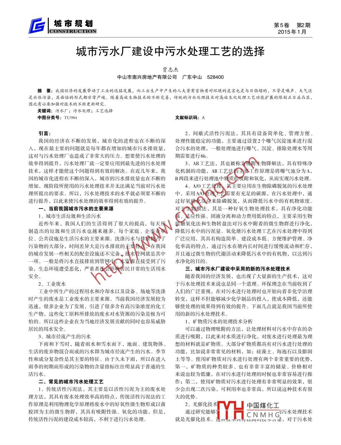城市規(guī)劃第5卷第2期GCONSTRUCTION2015年1月城市污水廠建設(shè)中污水處理工藝的選擇賈志杰中山市南興房地產(chǎn)有限公司廣 東中山528400滴要:我國經(jīng)濟(jì)的發(fā)展帶動了工業(yè)的迅猛發(fā)展,而工業(yè)生產(chǎn)中產(chǎn)生的人大量有害物質(zhì)對環(huán)境的危害也是與日俱增的,不管是噪聲、大氣還是水體污染,其面臨的形式都非常嚴(yán)峻。隨著高效生物技術(shù)的不斷完善,傳統(tǒng)的污水處理技術(shù)對高效生化處理工藝功能擴(kuò)展的限制正日益凸顯,因此有必要加強(qiáng)對技術(shù)的不斷更新研究。關(guān)鍵詞:污水廠;污水處理;工藝選擇中圖分類號: TU984文獻(xiàn)標(biāo)識碼: A引言:2、間歇式活性污泥法,其具有設(shè)備簡單化、管理方便、我國的經(jīng)濟(jì)在不斷的發(fā)展,城市化的進(jìn)程也在不斷的深處理性能穩(wěn)定的功能,主要通過設(shè)置2個曝氣沉淀池來進(jìn)行混人,現(xiàn)在最主要的問題就是每年都在增加的城市污水排放量,合污水的處理,一般處理池進(jìn)行曝氣、沉淀、排除處理水等周這對與污水處理廠也造成了非常大的壓力。想要使污水處理的期需要進(jìn)行6h。效率得到提升,污水處理廠就- -定 要應(yīng)用到最先進(jìn)的污水處理3、AB工藝法,其也被稱為吸附生物降解法,具有特殊凈技術(shù),這樣才能使這個問題得到有效的解決。在近幾年來,我化機(jī)制的功能 ,AB 工藝法的主要工作原理是將曝氣池分為A,國的城市化進(jìn)程在不斷的深入,城市的污水排放量也在不斷的B兩段 來進(jìn)行處理池中物質(zhì)的吸附和氧化,從而實(shí)現(xiàn)污水處理。增加,現(xiàn)階段所使用的污水處理技術(shù)并無法滿足當(dāng)前對污水處4、A/0工藝處理,其主要應(yīng)用在生物除磷脫氮的污水處理理所提出的要求。所以,污水處理技術(shù)的水平就必須要不斷的中, 采用A/O處理工藝需要有充足的碳源,在污水處理中,通進(jìn)行提升,以此來使污水處理的效率得到有效的提升。過好氧硝化反應(yīng)來除磷脫氮,從而降低污水中的有機(jī)物濃度。一、 當(dāng)前我國城市污水的主要來源對于生物膜法,其是- - 種好氧生物處理技術(shù),具有凈化功能1、城市生活垃圾和生活污水強(qiáng)、適應(yīng)性強(qiáng)、固液分離和動力費(fèi)用低的特點(diǎn),主要采用生物近些年來,我國人們的生活得到了很大的提高,每天所接觸 氧化法和生物轉(zhuǎn)盤法對污水中附著的微生物群進(jìn)行凈化,制造出的垃圾和生活污水也越來越多。每個家庭、企事業(yè)單降 低污水中的污泥量。氧化塘污水處理工藝在污水處理中得到位、公共設(shè)施是生活污水的主要來源。洗滌污水與排泄物占了廣 泛應(yīng)用,其具有構(gòu)造簡單、建設(shè)成本低、方便維護(hù)管理、凈污染物的大部分,時間差異大是污水排放的主要特點(diǎn)。在我國化 率高的特點(diǎn),通過污水在塘內(nèi)長時間進(jìn)行緩慢流動和貯存,的城市發(fā)展一些相關(guān)的配套設(shè)施還不完備,排水管網(wǎng)就是其中并 且通過微生物的代謝活動來降低污水中的有機(jī)物,以達(dá)到污一項(xiàng)。一般是將污水直接排放到管網(wǎng)中,水資源直接受到了污水凈化的 目的。染,生態(tài)環(huán)境遭受惡化,嚴(yán)重者還會影響居民日常的生活用水三、城市污水廠建設(shè)中采用的新的污水處理技術(shù)隨著我國的經(jīng)濟(jì)發(fā)展,也出現(xiàn)了大量新的生產(chǎn)技術(shù),這對2、工業(yè)廢水.于污水處理技術(shù)來說也是同一-個道理。環(huán)保理念在當(dāng)前收到了工業(yè)中所生產(chǎn)的過程用水和冷卻水以及設(shè)備、場地等洗滌人們的廣 泛重視,在對污水進(jìn)行處理時也開始向著非化學(xué)治理時產(chǎn)生的廢水是工業(yè)廢水的主要來源。當(dāng)前我國經(jīng)濟(jì)發(fā)展較為轉(zhuǎn)變, 這樣不但能夠減少化學(xué)制品的投入,使成本降低,還能迅速,很多企業(yè)為了發(fā)展,引進(jìn)了很多含有高污染濃度的化工夠使處理的效果得到有效的提升。下面幾點(diǎn)就是我國當(dāng)前所使生產(chǎn)物,這些化工原料所排放的廢水對水資源的污染是極為可用的 新的污水處理技術(shù)。怕的。所以這些企業(yè)在為當(dāng)?shù)亟?jīng)濟(jì)發(fā)展貢獻(xiàn)的同時也容易威脅1、礦物質(zhì)污水的處理技術(shù)分析居民的用水安全。可以通過物理吸附的方法,讓處理材料對污水中存在的雜3、城市徑流產(chǎn)生的污水質(zhì)進(jìn)行吸附,以此來對水質(zhì)進(jìn)行凈化,對廢水進(jìn)行處理最為理下雨和下雪時,隨著雨水和雪水而下,地面、建筑物體、想的材料就是礦 物質(zhì)。大部分礦物質(zhì)都具有對污水進(jìn)行處理的生活的廢棄物混合而成的污水即為城市徑流產(chǎn)生的污水。季節(jié)功能, 比如說非常常見的材料,如:硅藻土、海泡石以及膨潤性和成分復(fù)雜性是其主要的特征。由于久未下雨,所以在進(jìn)入土等等。使用礦物質(zhì)對污水進(jìn)行處理有兩個非常重要的優(yōu)勢,雨季的初期而形成的污染物的含量指標(biāo)往往明顯高于普通的生第--,礦物質(zhì)的種類較多、也有非常豐富的儲量、價格相對活污水。來說也較為低廉,在對污水進(jìn)行處理的時候也非常容易進(jìn)行操二、常