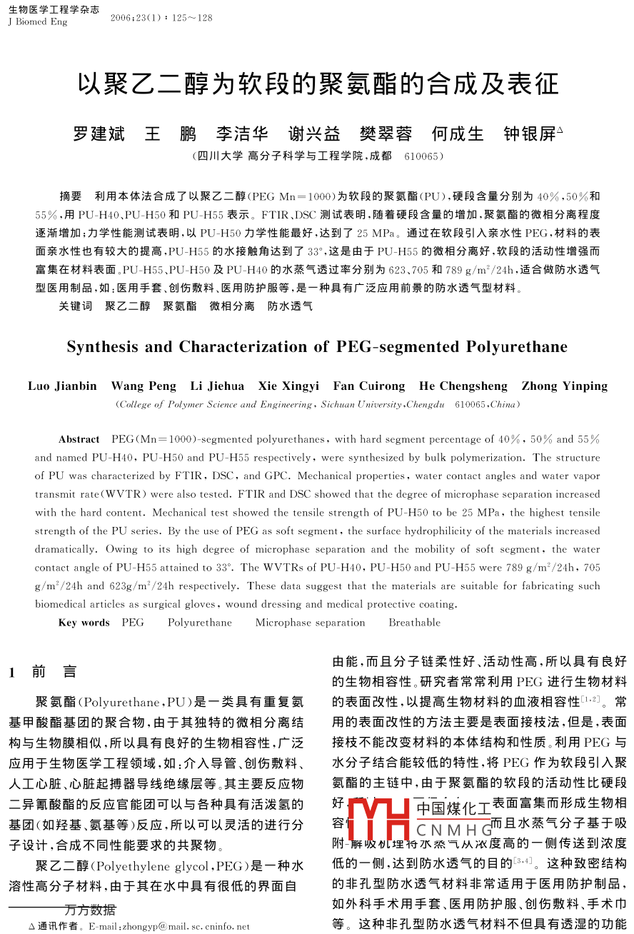 生物醫(yī)學工程學雜志2006;23(1): 125~128J Biomed Eng .以聚乙二醇為軟段的聚氨酯的合成及表征羅建斌王鵬李潔華謝興益.樊翠蓉何成生鐘銀 屏^(四川大學高分子科學與工程學院,成都610065)摘要利用本體法合 成了以聚乙二醇(PEG Mn= 1000)為軟段的聚氨酯(PU),硬段含量分別為40%,50%和55%,用PU-H40、PU-H50和PU-H55表示。FTIR.DSC測試表明.隨著硬段含量的增加,聚氨酯的微相分離程度逐漸增加;力學性能測試表明,以PU-H50力學性能最好,達到了25 MPa。通過在軟段引入親水性PEG,材料的表面親水性也有較大的提高,PU-H55的水接觸角達到了33°,這是由于PU-H55的微相分離好,軟段的活動性增強而富集在材料表面。PU-H55、PU-H50及PU-H40的水蒸氣透過率分別為623.705和789 g/m*/24h,適合做防水透氣型醫(yī)用制品,如:醫(yī)用手套.創(chuàng)傷敷料、醫(yī)用防護服等,是一種具有廣泛應用前景的防水透氣型材料。關鍵詞聚乙二醇 聚氨酯微相分離防水透氣Synthesis and Characterization of PEG-segmented PolyurethaneLuo Jianbin Wang Peng Li Jiehua Xie Xingyi Fan Cuirong He Chengsheng Zhong YinpingCollege of Polymer Science and Engineering , Sichuan University ,Chengdu 610065,China)Abstract PEG(Mn = 1000)-segmented polyurethanes, with hard segment percentage of 40%,50% and 55%and named PU-H40, PU-H50 and PU-H55 respectively,were synthesized by bulk polymerization. The structureof PU was characterized by FTIR, DSC, and GPC. Mechanical properties, water contact angles and water vaportransmit rate(WV TR) were also tested. F TIR and DSC showed that the degree of microphase separation increasedwith the hard content. Mechanical test showed the tensile strength of PU-H50 to be 25 MPa, the highest tensilestrengthof the PU series. By the use of PEG as soft segment, the surface hydrophilicity of the materials increaseddramatically. Owing to its high degree of microphase separation and the mobility of soft segment, the watercontact angle of PU-H55 attained to 33°. The WVTRs of PU-H40, PU-H50 and PU-H55 were 789 g/m2/24h, 705g/m*/24h and 623g/m2 /24h respectively. These data suggest that the materials are suitable for fabricating suchbiomedical articles as surgical gloves, wound dressing and medical protective coating.Key words PEGPolyurethaneMicrophase separationBreathable由能,而且分子鏈柔性好、 活動性高,所以具有良好1前言的生物相容性。研究者常常利用PEG進行生物材料聚氨酯(Polyurethane,PU)是一類具有重復氨的表面改性,以提高生物材料的血液相容性[1.2]。?;姿狨セ鶊F的聚合物,由于其獨特的微相分離結(jié)用的表面改性的方法主要是表面接枝法,但是,表面構(gòu)與生物膜相似,所以具有良好的生物相容性,廣泛接枝不能改變材料的本體結(jié)構(gòu)和性質(zhì)。利用PEG與應用于生物醫(yī)學工程領域,如:介入導管、創(chuàng)傷敷料、水分子結(jié)合能較低的特性,將PEG作為軟段引入聚人工心臟、心臟起搏器導線絕緣層等。其主要反應物氨酯的主鏈中,由于聚氨酯的軟段的活動性比硬段二異氰酸酯的反應官能團可以與各種具有活潑氫的好中國煤化I表面富集而形成生物相.基團(如羥基、氨基等)反應,所以可以靈活的進行分容CHCN MH c而且水蒸氣分子基于吸子設計,合成不同性能要求的共聚物。附-解吸札埋將水祭氣從濃度高的一側(cè)傳送到濃度聚乙二醇(Polyethylene glycol ,PEG)是- - -種水低的一側(cè),達到防水透氣的目的534。這種致密結(jié)構(gòu)溶性高分子材料,由于其在水中具有很低的界面自的非孔型防水透氣材料非常適用于醫(yī)用防護制品,如外科手術用手套、醫(yī)用防護服、創(chuàng)傷敷料、手術巾△通訊作者。E-mail :zhongyp@ mail. sc. cninfo. net .等。這種非孔型防水透氣材料不但具有透濕的功能126生物醫(yī)學工程學雜志第23卷而且使用者感到舒適,還可以防止細菌和病毒的通將聚氨酯薄膜制成長2cm厚約為1mm的樣過,具有很好的安全性。品。按GB 1040-92,在廣州材料試驗機廠的XLL-James等[$.研究了不同分子量PEG對PU性能100型拉力試驗機上測定,拉伸速率為200mm/的影響.,但沒有提出合成方法。本文以數(shù)均分子量為min。1000的PEG(PEG1000)為軟段,4,4,-二苯基甲烷.采用Eyma(Japan)接觸角測定儀測水接觸角。二異氰酸酯(MDI)和1,4丁二醇(BDO)為硬段合根據(jù)ASTME96- 80標準來測定膜的水蒸汽成了不同硬段含量的聚氨酯,并對其進行表征。透過率。采用正杯法,試驗箱的溫度控制在30C,濕度控制在50%,杯中所盛蒸餾水大致為杯體的3/4,2實驗部分然后用蠟封閉膜四周的空隙。水蒸汽透過率的計算2.1原料與試劑公式如下所示:PEG為Sigma公司的產(chǎn)品,使用前真空脫水。WVTR=G/(t●A)MDI由山東合成革廠提供,并蒸餾提純。1,4-二式中:G為測試時間內(nèi)杯內(nèi)損失的質(zhì)量(g);A為測醇(BDO)真空脫水。四氫呋喃(AR)及N,N-二甲基試膜的有效面積(m2);t為測試時間(h)甲酰胺(AR)直接使用。2.2實驗部分3結(jié)果與討論將計量的PEG加入到裝有攪拌器、溫度計和氮3. 1材料的分子量氣保護的三頸瓶中,溫度控制在100C脫水半小時用GPC測的聚氨酯的分子量及分布如表2所以上,降溫加入定量的MDI,75C左右預聚,直到預示。聚結(jié)束。然后加入計量的擴鏈劑,直到異氰酸根反應完畢,將其倒出于聚四氟乙烯板上放入烘箱中后處表2聚氨酯的分子量 及分布理,冷卻后得到無色透明或白色的彈性體。本實驗合Table 2 The molecular weight of polyurethanes and its distribution成了以PEG為軟段的系列聚氨酯(PU-H40,PU-SampleMnMwMw/MnH50,PU-H55)。樣品名稱中的數(shù)字代表聚氨酯