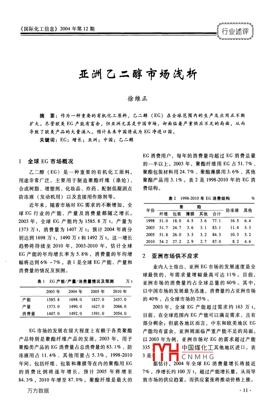 《國際化工信息》2004年第12期行業(yè)述評正洲乙二醇市場洩析徐維正摘要:作為一種重要的有機化工原料,乙二醇(EG)在全球范圍內(nèi)的生產(chǎn)及應用正不斷擴大。盡管歐美EG產(chǎn)能有富余,但亞洲尤其是中國市場,卻面臨著嚴重供應不足的局面,從而導致了歐美產(chǎn)品的大量涌入。預計未來中國將成為EG凈進口國。關(guān)鍵詞:EG;增長;亞洲;中國;乙二醇EG消費用戶,每年的消費量均超過EG消費總量1全球EG市場概況的一半以上。2003年,聚酯纖維用EG占51.7%、乙二醇(EG)是一種重要的有機化工原料,聚酯包裝材料用24.7%、聚酯薄膜用3.6%、其他用途非常廣泛,主要用于制造聚酯纖維(滌綸)、聚酯產(chǎn)品用3.1%。表2是1998-2010年的EG消合成樹脂、增塑劑、化妝品、炸藥、配制低凝固點費結(jié)構(gòu)。防凍液(發(fā)動機用)以及直接用作溶劑等。表219982010年EG消費結(jié)構(gòu)近年來,隨著市場對EG需求的不斷增加,全聚酯球EG行業(yè)的產(chǎn)能、產(chǎn)量及消費量都隨之增長。年份纖維包裝簿膜其他合計防凍液其他2003年,全球EG產(chǎn)能約為1585.8萬t,產(chǎn)量為199851.018.04.53.677.116.56.41373萬t,消費量為1407萬t;預計2004年將分200351.724.73.63.183.111.45.3別達到1698萬t,1490萬t和1492萬t。這一增長200551.82603.33.284310.35.2201054.227.22.92.787.08.24.6趨勢將持續(xù)至2010年,2003-2010年,估計全球EG產(chǎn)能的年均增長率為58%,消費量的年均增2亞洲市場供不應求幅將達到6%~7%。表1是全球EG產(chǎn)能、產(chǎn)量和消費量的情況及預測。業(yè)內(nèi)人士指出,亞洲EG市場的發(fā)展速度是全球最快的,年需求量增幅最高可達11%。目前,表1EG產(chǎn)能/產(chǎn)量/消費量情況及預測萬:亞洲市場的消費量約占全球總量的60%。其中,2003年2004年2005年2010年以中國市場的發(fā)展最為迅速,消費量約占亞洲市場產(chǎn)能1585.81698.01827.02457.0的40%,占全球市場的25%。產(chǎn)量1373.01490.01627.02066.02003年,全球EG產(chǎn)能超過需求約163萬t消費量1407.01492.01594.02054.0目前,在全球范圍內(nèi)EG產(chǎn)能可以滿足需求,且有部分剩余;但就各地區(qū)而言,中東和歐美地區(qū)EGEG市場的發(fā)展在很大程度上有賴于各類聚酯產(chǎn)能均有富余,亞洲則面臨嚴重產(chǎn)能不足的局面。產(chǎn)品特別是聚酯纖維產(chǎn)品的發(fā)展。2003年,用于以2003年為例,亞洲市場對EG的需求超過產(chǎn)能聚酯類產(chǎn)品的EG消費量占總消費量的83.1%、防35中國煤化工其他地區(qū)進口。表凍液用占11.4%、其他用量占5.3%。199820103是CNMHG年間,包括纖維、包裝和薄膜等在內(nèi)的聚酯用EC據(jù)估計,204年全球EG消費量增長將接近的消費比例將逐年增長,預計2005年將增至7%,凈增長約100萬t,超過產(chǎn)能增長量,從而導84.3%,2010年增至87.0%。聚酯纖維是最大的致市場的供應趨緊。而供應緊張將推動價格上漲。11行業(yè)述評《國際化工信息》2004年12月表3各地區(qū)EG供需情況2001產(chǎn)能需求產(chǎn)能產(chǎn)能445.0722.6801.2509,4中東285.0285.039.6285.0275.1南美41.327.541.3歐洲232.5184.023190合計1566.81247.91587.61344.91585.81422.1年來,亞洲EG現(xiàn)貨價格上漲已超過50%,要包括:中國聚酯對EG的需求增長遠超過產(chǎn)能增達到880~900美元/t(CFR中國,下同),預計今長,1997年以來,中國EC產(chǎn)能的年均增長率為年底或明年初仍將維持這一高位9%,同期聚酯纖維和瓶級聚酯樹脂的需求年均增長率高達25%;購買商看到乙烯漲價,因此在EG3歐美產(chǎn)品涌入生產(chǎn)商乘機抬價漲價前搶購EG;能源、原料漲價,使乙烯價格攀業(yè)內(nèi)人士指出,近年來歐美日韓等發(fā)達國家EG升、供應吃緊;國外大型EG裝置(如陶氏位于墨產(chǎn)能過剩,而亞洲發(fā)展中國家特別是中國的供應卻西哥灣和加拿大普倫蒂斯的兩套裝置)停產(chǎn)等。嚴重短缺。就全球而言,EG供需仍存在很大缺口。市場分析人士特別指出,EG供應緊張促使價到2010年,亞洲EG消費量將占世界消費總格上揚很大程度上是受中國需求拉動的影響。中國量的一半,其中中國消費量將占世界EG消費總量聚酯裝置的開工率一直很高,因此估計庫存即將耗的25%,占亞洲的40%。2003年,中國聚酯對盡,中國買主將再次返回國際市場進行采購EG需求量的估計值為300萬t,未來還將以年均20%的速度繼續(xù)增長;加上其他方面的需求量,估4新增擴建裝置緩解供應壓力計2003年中國對EG的總需求量將達到350萬t面對亞洲及中國這一迅速擴大的市場,各大公因此未來幾年,中國將成為國外EG廠商競相爭奪司均加緊新建和擴建EG產(chǎn)能,不少新的EG裝置的目標市場。特別是今年1月1日,中國將EG進正在建設或待建中。特別是中東等低成本生產(chǎn)地區(qū)口稅從7%下調(diào)至5.5%之后,更是吸引了眾多歐正大力發(fā)展EG生產(chǎn),預計將在未來幾年大幅增加美EG生產(chǎn)和銷售商積極投身中國市場,以期在市對中國的EG供應量。事實上,近年來沙特對中國場快速增長的大好形勢下分得一杯糞。EG市場的占有率正迅速增長。2005年前沒有新的EG產(chǎn)能投產(chǎn),2004年將今后幾年,國內(nèi)外將有一批新建EG項目投是EG市場非常紅火的一年。目前,亞洲市場對產(chǎn)。據(jù)不完全統(tǒng)計,在此期間至少有526萬t/a新EG的需求非常強勁,加上各裝置維持正常運轉(zhuǎn),產(chǎn)能投產(chǎn)。表4為全球主要新增/擴建的EG項目。生產(chǎn)商競相增加對亞洲的出口,