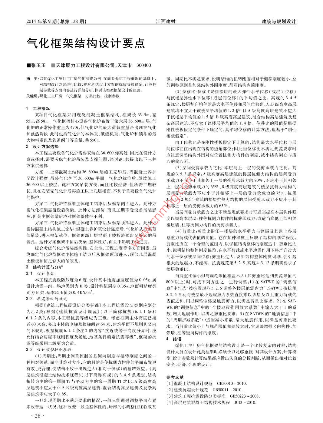2014年第9期(總第138期)江西建材建筑與規(guī)劃設(shè)計(jì)氣化框架結(jié)構(gòu)設(shè)計(jì)要點(diǎn)■張玉玉■天津辰力工程設(shè)計(jì)有限公司,天律市 3004000摘要:以某煤化工項(xiàng)目主廠(chǎng)房氣化框架為例. 在簡(jiǎn)要介紹工程概況的基礎(chǔ)上,微。周期比不滿(mǎn)足要求,說(shuō)明結(jié)構(gòu)的扭轉(zhuǎn)剛度相對(duì)于側(cè)移剛度較小,總對(duì)結(jié)構(gòu)設(shè)計(jì)方案進(jìn)行比較,并對(duì)所選設(shè)計(jì)方案的抗震等級(jí)確定.計(jì)算控的調(diào)整原則是加強(qiáng)結(jié)構(gòu)外圈剛度.削弱結(jié)構(gòu)內(nèi)簡(jiǎn)剛度。制參數(shù)等方面內(nèi)容進(jìn)行詳細(xì)分析.探討該類(lèi)型框架設(shè)計(jì)的經(jīng)驗(yàn)。(2)位移比:位移比是指樓層的最大彈性:水平位移(或?qū)娱g位移)關(guān)鍵詞:煤化工主廠(chǎng)房氣化框架方案比較控制參數(shù)與該樓層彈性水平位移(或?qū)娱g位移)的平均值之比。高規(guī)的3.4.5條規(guī)定.樓層豎向構(gòu)件的最大水平位移和層間位移角,入.B級(jí)高度高層1工程概況建筑均不宜大于該樓層平均值的1.2倍;且A級(jí)高度高層建筑不應(yīng)大某項(xiàng)目氣化框架采用現(xiàn)澆混凝土框架結(jié)構(gòu)??蚣荛L(zhǎng)63. 5m,寬于該樓層平均值的1.5倍B級(jí)高度高層建筑混合結(jié)構(gòu)高層建筑及復(fù)55m,高58m。氣化框架核心設(shè)備氣化爐布置于第六層36.600m層,氣雜高層建筑,不應(yīng)大于該樓層平均值的 1.4倍。位移比的限值是根據(jù)化爐的正常操作重量為470,但氣化爐的最大荷載重量是出現(xiàn)在氣化剛性樓板假定的條件下確定的,其平均位移的計(jì)算方法,也基于”剛性爐預(yù)熱階段,此時(shí)包括氣化爐的本體重破渣機(jī)重氣化爐和鎖斗的最樓板假定"。大物料重以及管道閥門(mén)等重量,共5501。由于位移比是E剛性8E樓板假定下計(jì)算的,結(jié)構(gòu)最大水平位移與層2設(shè)計(jì)方案選擇間位移往往出現(xiàn)在結(jié)構(gòu)的邊角部位;因此當(dāng)位移比足規(guī)范要求時(shí)本工程主要設(shè)備氣化爐需要安裝在36.600標(biāo)高處,因此在設(shè)計(jì)方應(yīng)注意調(diào)整結(jié)構(gòu)外圍對(duì)應(yīng)位置抗側(cè)力構(gòu)件的剛度.減小結(jié)構(gòu)剛心與質(zhì)案選擇時(shí),需要考慮氣化爐吊裝及支撐問(wèn)題,經(jīng)討論.共提出以下三種心的偏心距。方案供選擇:(3)層間受剪承載力之比:本層與上一層的受剪承載力之比。 高方案一:上部混凝土結(jié)構(gòu)36. 600m層施工完畢后,待混凝土養(yǎng)護(hù)規(guī)的3. s.3條規(guī)定:A級(jí)高度高層建筑的樓層抗側(cè)力結(jié)構(gòu)的層間受剪至設(shè)計(jì)強(qiáng)度吊裝氣化爐至36. 600m平面。氣化爐就位后.繼續(xù)施工承載力不宜小于其相鄰上一層的受剪承載力的80% ,不應(yīng)小于其相鄰36.600以上樓層。此種方案吊裝方便.而且比較經(jīng)濟(jì).但所需工期較上一層的受剪承載力的65%,B級(jí)高度高層建筑的樓層抗側(cè)力結(jié)構(gòu)的長(zhǎng).且在安裝完氣化爐后再施工以上幾層樓面,不利于重要設(shè)備氣化爐層間受剪承載力不應(yīng)小于其相鄰上一層的受剪承載力的75%.抗規(guī)的保護(hù)。3.4.4-2規(guī)定:建筑的樓層抗側(cè)力結(jié)構(gòu)的層間受剪承載力不應(yīng)小于其方案二:氣化爐待框架 主體施工結(jié)束后從框架側(cè)面進(jìn)入。此種方;相鄰上一層的受剪承載力的65%。案氣化框架需留設(shè)后澆梁。此種方法經(jīng)濟(jì),而且工期不受設(shè)備吊裝影當(dāng)層間受剪承載力之比不滿(mǎn)足規(guī)范要求時(shí)可適當(dāng)提高本層構(gòu)件強(qiáng)響,但是主框架梁后澆對(duì)框架整體性不利。度以提高本層墻、柱等抗側(cè)力構(gòu)件的抗剪承載力.或適當(dāng)降低上部相關(guān)方案三:氣化爐待框架主體施工結(jié)束后從框架頂部進(jìn)入。此種方樓層墻 、柱等抗側(cè)力構(gòu)件的抗剪承載力。案待混凝土結(jié)構(gòu)施工完畢,混凝土養(yǎng)護(hù)至設(shè)計(jì)強(qiáng)度后,氣化爐從框架頂(4)剪重比:剪重比指任-樓層的水平剪力與該層及其以上各層部吊裝.進(jìn)入框架就位??蚣茼敳繋讓踊炷翗前逍桀A(yù)留足夠大的吊總 重力荷載代表值的比值。它在某種程度上反映了結(jié)構(gòu)的剛?cè)岢潭?,裝孔。這種方案框架不留后澆梁,整體性好,而且不影響工程進(jìn)度。剪重比應(yīng)在一個(gè)合理的范圍內(nèi),以保證結(jié)構(gòu)整體的剛度適中,剪重比太綜合考慮氣化爐吊裝經(jīng)濟(jì)性,安全性,工程進(jìn)度等多方面因素,最小,說(shuō)明結(jié)構(gòu)整體剛度偏柔,在水平荷載或水平地震作用下將產(chǎn)升過(guò)大終確定氣化爐待框架主體施工結(jié)束后從框架頂部進(jìn)人。頂部幾層混凝的水平位移或?qū)娱g位移;剪重比過(guò)大,說(shuō)明結(jié)構(gòu)整體剛度偏剛,會(huì)引起土樓板預(yù)留足夠大的吊裝孔,很大的地震力,不經(jīng)濟(jì)??拐鹨?guī)范第5.25.高規(guī)4.3. 12條明確要求了3結(jié)構(gòu)計(jì)算與分析樓層剪重比。3.1設(shè)計(jì)參數(shù)當(dāng)剪重比偏小但與規(guī)范限值相差不大(如剪重比達(dá)到規(guī)范限值的本工程抗震設(shè)防烈度為6度.設(shè)計(jì)基本地震加速度值為0.05g,屬80%