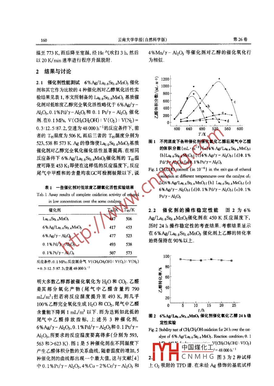 云南大學(xué)學(xué)報(自然科學(xué)版),200426(2):159-161CN53-1045/ N ISSN0258-7971Journal of Yunnan University乙醇燃料車尾氣凈化催化劑研究王偉,涂學(xué)炎,張世鴻云南大學(xué)化學(xué)與材料工程學(xué)院,云南昆明650091)摘要制備了一種具有鈣態(tài)礦結(jié)構(gòu)的Ag修飾的L4.6S04Mnk催化劑實驗表明這種催化劑對低濃度乙醇完全氧化的催化活性高于負(fù)載型貴金屬催化劑,O2-TPD譜表明,Ag對126 Sro mNo3表面的修飾可以增加催化劑表而O/O物種的量,從而有利于對乙醇的完全催化氧化關(guān)鍵詞:完全催化氧化;廢氣;乙醇;催化劑中圖分類號:O643.36文獻(xiàn)標(biāo)識碼:A文章編號:0258-7971(2004)02-0159-03乙醇作為車用燃料已有很長的歷史,隨著的催化劑試樣Ag/L206Sm04MnO2;后經(jīng)壓片、再破世界石油價格的提高,我國也日益關(guān)注乙醇汽油車碎篩分出直徑約為021~0.15mm的催化劑備的開發(fā),目前國家已經(jīng)制定了相關(guān)的規(guī)劃,在部分用將計算量的Ag,Pd和Pt的相應(yīng)硝酸鹽溶液按地區(qū)開始推廣乙醇汽油車.乙醇燃料車尾氣污染的等容浸漬法分別浸漬負(fù)載于y-A2O載體上,經(jīng)消除是其實用化必須解決的關(guān)鍵技術(shù)之一,汽、柴陳放10h,393K烘于4h,773K空氣氣氛中焙燒油燃料車尾氣污染物主要是CH,NO2和SOn,而b,即得Ag/V-Al2O3,PdV-Al2O3和Pt/V醇燃料車尾氣排放的主要污染物是乙醇燃燒的中Al2O3催化劑.所制得上述各類催化劑均經(jīng)壓片、間產(chǎn)物醛、OO和未燃燒的醇(尤其是在冷啟動再破碎,篩分出試樣備用時)2.至今有關(guān)乙醇燃料車尾氣凈化催化劑的研12催化劑的評價方法用固定床式石英傲型反究開發(fā)大多集中于y-A2O3負(fù)載的貴金屬(應(yīng)器評價樣品的催化性能,反應(yīng)器內(nèi)以玻璃棉撐托Pa,R)和某些過渡金屬氧化催化劑(如CuO,催化劑顆粒催化劑用量為0.1mL(約200mg),顆CO-Cn2O3,ZnO-Cr2O3等),在非貴金屬燃燒催粒徑為0.21-0.15mm反應(yīng)裝置見圖1.將空氣通化劑中,鈣鈦礦(ABO3)型稀土氧化物具有潛在的盛有乙醇的鼓泡裝置里鼓泡器置于室溫下即可,應(yīng)用前景本文在ABO2型氧化物基礎(chǔ)上引入帶有乙醇的空氣與氮氣混合,通過調(diào)整空氣和氮氣使其作為乙醇完全氧化的催化劑實驗結(jié)果顯示,的流量使反應(yīng)混合氣組成為v( H3CH3OH該催化劑對低濃度CH3CH2OH的完全氧化具有優(yōu)WO):WN)=0.3:12.5:87.3,在4800b-1的空良的催化性能,即具有低的完全起燃溫度、高的轉(zhuǎn)速下通過加熱的催化劑床層,反應(yīng)尾氣組成由氣相化率和較高的完全氧化選擇性色譜儀(GD-102,上海分析儀器廠)作在線分析1實驗部分色譜柱擔(dān)體為GDX-103;柱長3m;柱溫393K;FIT檢測器在線分析乙醇或部分還原產(chǎn)物乙1.1催化劑制備催化劑La0.6Sm.4MnO3試樣系醛先由檸檬酸為配體的溶膠一凝膠法制備其干凝膠,13催化劑的O2-TPD測試氧程序升溫脫附而后經(jīng)873K焙燒4h即得試樣,將該試樣作為基(簡稱O2-TPD,下同)測試在 Omnistar GSD3000質(zhì)浸漬計量AgNO3溶液陳放10h,而后浸漬試Ms儀上進(jìn)行,催化劑用量為20mg,測試前將前樣在空氣氣氛中973K下焙燒4h,則制得Ag修飾驅(qū)態(tài)催化劑試樣置于反應(yīng)管中,在純O2氣氛下升中國煤化工收稿日期:2003-06-1車者簡介:王偉(1963-),男,云南人,副研究員,博土,主要從事物YHCNMHG云南大學(xué)學(xué)報(自然科學(xué)版)第26卷溫至77K,而后降至室溫,經(jīng)He氣吹掃3h,然后4%Mn/Y-A2O等催化劑對乙醇的催化氧化行以20K/min速率進(jìn)行程序升溫脫附為相似2結(jié)果與討論21催化劑性能測試6%Ag/La.6Sm.4MO3催化劑和其它作為比較的4種催化劑對乙醇氧化活性實d00驗結(jié)果見表1,本文所制備的L06S04MnO基質(zhì)催化劑對低濃度乙醇完全氧化活性略優(yōu)于6%Ag/yA2O3,0.1%Py-A2O和0.1Py-AM2O3催化劑在0.1MPa,V( CH3CHOH):V(O2):V(N)=0.3:125:87.2,空速為48000h的反應(yīng)條件下,前400440480520560600者的T95溫度為506K而后三者的Ty溫度分別為523,538和573KAg的修飾使LA,6Sm04MO2基質(zhì)圖1不同溫度下各種催化荊催化氯化乙醇后尾氣中乙醛催化劑對乙醇完全氧化催化活性顯著提高在相同的體積分?jǐn)?shù)(mLm3)(a)6%Ag/La.6S04MnO3;反應(yīng)條件下6%Ag/La.6S0.4MnO3催化劑的Ts溫(b)La。6Sr.4MnO;(c)6%Ag/y-A2Oh;【d)0.1%尾氣中甲醛和的含量均在OC可檢測極限以下,說冬,PMy-A2O;(e)0.,1%P/Y-A2O度可降至453K;即使在這樣低的反應(yīng)溫度下,反應(yīng)CH,CHO content (in 10-6)in the exit-gas of ethanoloxidation at different temperatures ower the catalyst of:(a)6% Ag/Lao.s Srp, 4 MnO: (b) Lao. Sto. 4 MnO: (c)表1一些催化劑對低濃度乙醇氧化活性實驗結(jié)果6%Ag/y-A2O為;(d)0.1%PdY-A2O為;(e)0.1%Tab. I Assay results of complete oxidation activity of ethanolPt/y-AlO3in low concentration over the some catalysts催化劑Ts/KTw/K2.2催化劑的操作穩(wěn)定性能圖2為6%An.Sro.4 MnO3Ag/La0.6So4MnO3催化劑在450K反應(yīng)溫度下,6%Ag/Lao. Srp. 4MnO歷時24h操作穩(wěn)定性的考查結(jié)果考察結(jié)果顯示6% Ag/-AlO3在6%Ag/La0.Sm4MnO2催化劑上乙醇的轉(zhuǎn)化率始終保持在90%以上0.1%P/y-A2O24930. 1%Pt/y-ALO反應(yīng)條件:0.1MPa;反應(yīng)混合氣v((H3CHOH):V(O2):V(N2)=0.3:12.5:87.3;空速48000h明大多數(shù)乙醇都被催化氧化為H2O和CO2,乙醛是其部分氧化產(chǎn)物(尾氣中乙醛含量約790L/m3;但若將反應(yīng)溫度提升至493K,則幾乎100%乙醇完全氧化生成H2O和CO2,尾氣中乙醛含量能下降到1m/m3以下.而為達(dá)到如此低的尾氣中乙醛排放指標(biāo),上