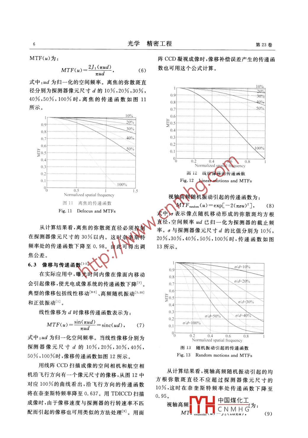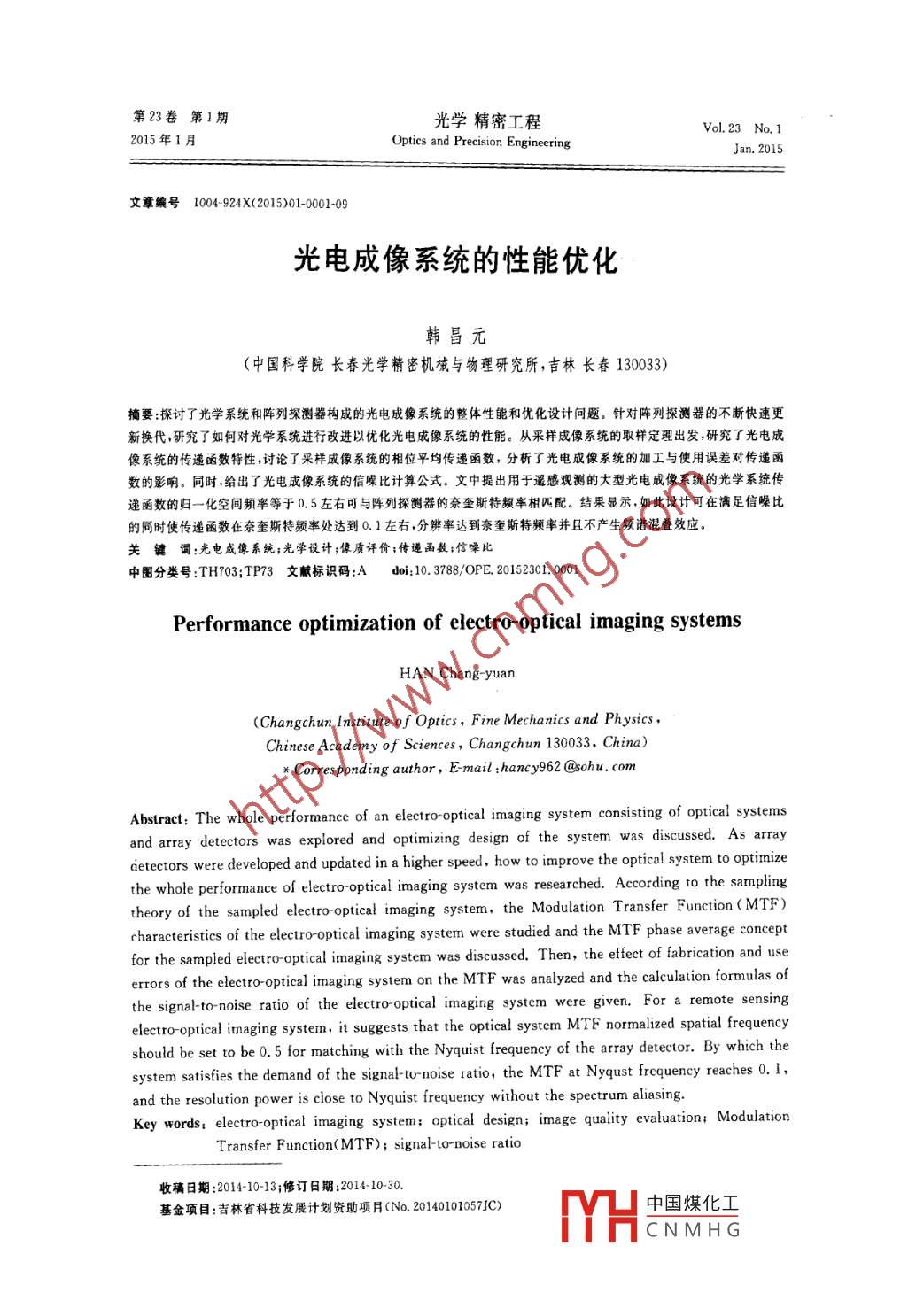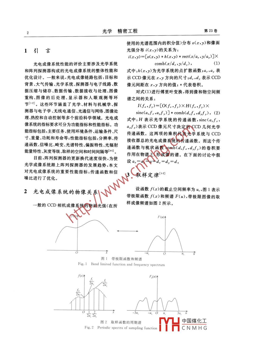 第23卷第1期光學(xué)精密工程Vol. 23 No. 12015年1月Optics and Precision EngineeringJan. 2015文章編號1004-924X(201501-0001-09光電成像系統(tǒng)的性能優(yōu)化韓昌元(中國科學(xué)院長春光學(xué)精密機(jī)械與物理研究所,吉林長春130033)摘要:探討了光學(xué)系統(tǒng)和陣列探測器構(gòu)成的光電成像系統(tǒng)的整體性能和優(yōu)化設(shè)計(jì)問題。針對陣列探測器的不斷快速更新?lián)Q代,研究了如何對光學(xué)系統(tǒng)進(jìn)行改進(jìn)以優(yōu)化光電成像系統(tǒng)的性能。從采樣成像系統(tǒng)的取樣定理出發(fā),研究了光電成像系統(tǒng)的傳遞函數(shù)特性,討論了采樣成像系統(tǒng)的相位平均傳遞函數(shù),分析了光電成像系統(tǒng)的加工與使用誤差對傳遞函數(shù)的影響。同時(shí),給出了光電成像系統(tǒng)的信噪比計(jì)算公式。文中提出用于遢感觀鍘的大型光電成像系統(tǒng)的光學(xué)系統(tǒng)傳遞函數(shù)的歸一-化空間頻率等于0.5左右可與陣列探圍器的奈奎斯特頻率相匹配。結(jié)果顯示,如此設(shè)計(jì)可在滿足信噪比的同時(shí)使傳遞函數(shù)在奈奎斯特頻率處達(dá)到0.1左右,分辨率達(dá)到奈奎斯特頻率并且不產(chǎn)生頻譜混疊效應(yīng)。關(guān)鍵詞:光電成像系統(tǒng);光學(xué)設(shè)計(jì);像質(zhì)評價(jià);傳遞函敖;信噪比中圍分類號:TH703;TP73文獻(xiàn)標(biāo)識碼:Adoi: 10.3788/OPE. 20152301.0001Performance optimization of electro-optical imaging systemsHAN Chang-yuan(Changchun Institule of Optics, Fine Mechanics and Physics,Chinese Academy of Sciences, Changchun 130033 China)* Corresponding author, E-mail :hancy962 @sohu. comAstract: The whole performance of an leroroptical imaging system consisting of optical systemsand array detectors was explored and optimizing design of the system was discussed. As arraydetectors were developed and updated in a higher speed, how to improve the optical system to optimizethe whole performance of eletro optical imaging system was researched. According to the samplingtheory of the sampled electro-optical imaging system, the Modulation Transfer Function (MTF)charactrstics of the eletro-optical imaging system were studied and the MTF phase average conceptfor the sampled etrorotial imaging system was dscussed. Then, the efet of fabrication and useerrors of the eletro-optical imaging system on the MTF was analyzed and the calculation formulas ofthe signal-t-rnoise ratio of the eletroropical imaging system were given. For a remote sensingelectro-optical imaging system, it suggests that the optical system MTF normalized spatial frequencysbould be set to be 0. s for matching with the Nyquist frequency of the aray detetor. By which thesystem stisies the demand of the signal-to noise ratio, the MTF at Nyqust frequency reaches 0. I,and the resolution power is close to Nyquist frequency without the spectrum aliasing.Key words: eletro-optical imaging system; optical design; image qualit evaluation; ModulationTransfer Function(MTF); signal-to-noise ratio收稿日期:2014-10-13;修訂日期:2014-10-30.基金項(xiàng)目:吉林省科技發(fā)展計(jì)劃資助項(xiàng)目(No.20140101057JC)中國煤化工MHCNMHG.2光學(xué)精密工程第23卷使用的光譜范圍內(nèi)的積分值)分布o(jì)(x,y)和像面1引言光強(qiáng)分布i(x,y)的關(guān)系為:i(x,y)=[o(x,y) * h(x,y) * ret(x/a, ,y/a,)]X光電成像系統(tǒng)性能的評價(jià)主要涉及光學(xué)系統(tǒng)comb(x/d;,y/d,),(1)和陣列探測器構(gòu)成的光電成像系統(tǒng)的整體性能和式中:h(x,y)為光學(xué)系統(tǒng)的點(diǎn)擴(kuò)散函數(shù);a,ay表優(yōu)化設(shè)計(jì)。一般來說,光電成像鏈路包括:目標(biāo)和示CCD像元在x,y方向的尺寸;d, ,d,表示CCD背景、大氣傳輸、光學(xué)系統(tǒng)、探測器與電子線路、數(shù)像元間距在x,y方向的值; *代表卷積。據(jù)壓縮與儲(chǔ)存、數(shù)據(jù)傳輸、數(shù)據(jù)接收與處理、圖像對式(1)進(jìn)行傅里葉變換,得到像和物空間頻重構(gòu)、圖像的后處理、顯示器和人眼觀測等環(huán)譜之間的關(guān)系:節(jié)[1-2]。這些環(huán)節(jié)涵蓋了光學(xué)、材料與機(jī)械學(xué)、探I(fs,f,)=[O(f,,f,)XH(f.,f,)X .測器與電子學(xué)、無線電通信、光通信與網(wǎng)絡(luò)、圖像處sinc(axfx,azf,)] * comb(d_fs,d,f,), (2)理熱控和自動(dòng)控制等多個(gè)前沿科學(xué)領(lǐng)域。光電成式中:H表示光學(xué)系統(tǒng)的傳遞函數(shù), sinc(arf.,像系統(tǒng)的指標(biāo)要求可分為功能指標(biāo)和性能指標(biāo)。功asf,)表示CCD像元尺寸決定的CCD幾何光學(xué)能指標(biāo)包括:主要任務(wù)、使用環(huán)境條件、運(yùn)輸條件、尺傳遞函數(shù)。這兩項(xiàng)的乘積代表光學(xué)系統(tǒng)與CCD寸、重量功耗和壽命等;性能指標(biāo)包括:分辨率、傳接收器總的光電成像系統(tǒng)的傳遞函數(shù)。而這個(gè)傳遞函數(shù)、信噪比、畸變、光譜特性、偏振特性、光輻射遞函數(shù)與梳狀函數(shù)comb(d.f.,d,f,)的卷積要能量特性、灰度等級、取樣的空間和時(shí)間間隔等135。作用在物譜上,形成像的譜。在下面的討論中假目前,陣列探測器的更新?lián)Q代速度很快,為使設(shè)a.=a,=a=d,=d,=d。光學(xué)成像系統(tǒng)跟上陣列探測器的發(fā)展趨勢,本文對光電成像系統(tǒng)的重要性能指標(biāo):傳遞函數(shù)和信3取樣定律[|22噪比進(jìn)行了優(yōu)化。2光電成像系統(tǒng)的物像關(guān)系設(shè)函數(shù)f(x)的截止空間頻率為uc,圖1表示帶極限函數(shù)f(x)