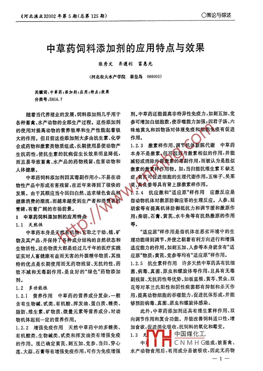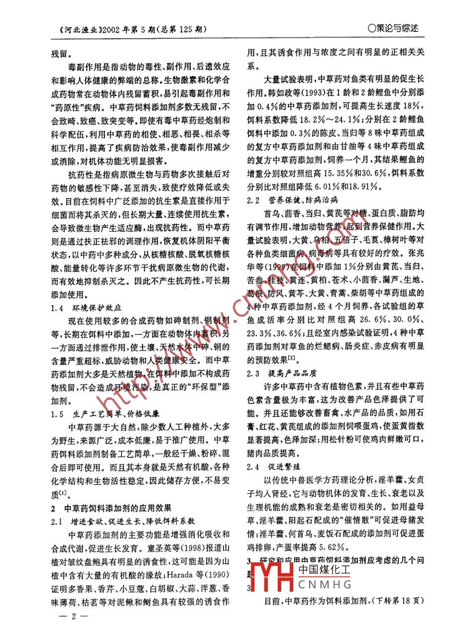 《河北漁業(yè)》2002年第5期(總第125期)O策論與綜述中草藥飼料添加劑的應(yīng)用特點(diǎn)與效果張秀文齊遵利富惠光(河北農(nóng)大水產(chǎn)學(xué)院秦皇島066003)關(guān)鍵詞:中草藥;添加劑;應(yīng)用;特點(diǎn);效果分類號(hào):S816.7隨著當(dāng)代養(yǎng)殖業(yè)的發(fā)展,飼料添加劑幾乎用于劑。中草藥還能提高非特異性免疫力,如刺五加、黨各種畜禽、水產(chǎn)動(dòng)物的全部生產(chǎn)c過程。這些忝加劑參可增加白細(xì)胞數(shù),使吞噬能力加強(qiáng);四君子湯、六的使用對(duì)提高動(dòng)物的營養(yǎng)效率和生產(chǎn)性能起著極味地黃丸和四物湯對(duì)體液免疫和細(xì)胞免疫有促進(jìn)大的作用。但目前這些添加劑大多由抗生素、化學(xué)作用。合成藥物和激素類物質(zhì)組成,長期使用易使動(dòng)物產(chǎn)1. 2.3激素樣作用、 調(diào)節(jié)機(jī)體新陳代謝中草藥生抗藥性,使抗生素的抗病促生長效果明顯降低,本 身不是激素,但可起到與激素相似的作用,并能而且易導(dǎo)致畜、水產(chǎn)品的藥物殘留,危害動(dòng)物和減輕或消除外源激素的毒副作用,而被認(rèn)為是勝似人體健康。激索的激素樣作用物。如:當(dāng)歸能抗維生素E缺乏中草藥飼料添加劑因其毒副作用小,不易在動(dòng)癥,黃芪可促進(jìn)細(xì)胞的生理代謝作用,五味子、吳茱物性產(chǎn)品中形成有害殘留,在近年來得到了很快的萸、高良姜等具有腎上腺激素樣作用。發(fā)展。由于其順應(yīng)當(dāng)今回歸白然、追求綠色食品和1.2.4 抗應(yīng)激和“適應(yīng)原”樣作用 應(yīng)激反應(yīng)是健康消費(fèi)的潮流,而越來越受到生產(chǎn)者和消費(fèi)者的指 動(dòng)物機(jī)體對(duì)激原防御應(yīng)答的生理反應(yīng)。人參、延青睞,有著廣闊的市場(chǎng)前景。胡索等有提高機(jī)體防御抵抗力和調(diào)節(jié)緩和激原作1中草藥飼料添 加劑的應(yīng)用特點(diǎn)用;柴胡、石膏、黃芪、水牛角等有抗熱激原的作用1.1 天然性等。中草藥本身是天然有機(jī)物,它取之于動(dòng)、植、礦“適應(yīng)原”樣作用是指機(jī)體在惡劣環(huán)境中的生物及其產(chǎn)品,并保持了各種成分結(jié)構(gòu)的自然狀態(tài)和理功能得到調(diào)節(jié),并使之朝著有利方向進(jìn)行和增強(qiáng)生物活性。這些物質(zhì)大都是經(jīng)過幾千年的醫(yī)療實(shí)踐適 應(yīng)能力的作用。如刺五加、人參等本身就含有“適證實(shí)對(duì)人畜健康有益而無害的外源精華物質(zhì),其獨(dú)應(yīng)原"物質(zhì);黃芪、黨參等均有“適應(yīng)原”樣作用。特的優(yōu)點(diǎn)是長期使用而無藥物殘留、無抗約性、藥1.2.5抗生素樣作用 許多天然中草藥具有 抗細(xì)效不減和無毒副作用,是良好的“綠色”藥物添加菌、病毒、真菌、原蟲和螺旋體等作用,且具有無毒劑。副殘留、無抗藥性等優(yōu)勢(shì)。如板藍(lán)根、黃芩、貫眾、雙1.2多功能性花等對(duì)革蘭氏陽性和陰性病菌都有抑制和殺滅作1.2.1營養(yǎng)作用中草藥的營 養(yǎng)成分復(fù)雜,一般用,提高動(dòng)物細(xì)胞的吞噬能力,促進(jìn)抗體形成,并能含有生物堿、甙類、有機(jī)酸、揮發(fā)油、蛋白質(zhì)、糖類、夠預(yù)防病毒、真菌、原蟲和螺旋體感染。脂肪、維生素、礦物質(zhì)、微量元素等營養(yǎng)成分,對(duì)動(dòng)此外,中草藥添加劑還具有維生素樣作用、雙物機(jī)體起到一定的營養(yǎng)作用。向調(diào)節(jié)作用和復(fù)合功能。并能改善飼料適口性,增1.2.2增強(qiáng)免疫作用天然中草 藥中的多糖類、加食欲,促進(jìn)消化吸收,抗飼料的氧化和霉變。有機(jī)酸類、生物堿類、甙類和揮發(fā)油類有增強(qiáng)免疫1.3 無中國煤化工的作用?,F(xiàn)已確定黃芪、刺五加、黨參、當(dāng)歸、穿心YHCNMHG組成,被畜禽、蓮、大蒜、石膏等有增強(qiáng)免疫作用,可作為免疫增強(qiáng)水產(chǎn) 動(dòng)物食用后,有用成分易被吸收,因此無藥物《河北漁業(yè)》2002年第5期(總第125期)O策論與綜述殘留。用,且其誘食作用與濃度之間有明顯的正相關(guān)關(guān)毒副作用是指動(dòng)物的毒性、副作用、后遺效應(yīng)系。和影響人體健康的弊端的總稱。生物激素和化學(xué)合大量試驗(yàn)表明,中草藥對(duì)魚類有明顯的促生長成藥物常在動(dòng)物體內(nèi)殘留蓄積,易引起毒副作用和作用。韓如政等(1993)在1齡和2齡鯉魚中分別添“藥原性”疾病。中草藥飼料添加劑多數(shù)無殘留,不加0. 4%的中草藥添加劑,可提高生長速度18%,會(huì)致畸、致癌、致突變等.即使有毒中草藥經(jīng)炮制和餌料系數(shù)降低18. 2%~24.1% ;分別在2齡鯉魚科學(xué)配伍,利用中草藥的相使、相惡、相畏、相殺等餌料中添加0.3%的陳皮、當(dāng)歸等8味中草藥組成相互作用,提高了疾病防治效果,使毒副作用減少的復(fù)方中草藥添加劑和由甘油等4味中草藥組成或消除,對(duì)機(jī)體功能無明顯損害。的復(fù)方中草藥添加劑,飼養(yǎng)-一個(gè)月 ,其結(jié)果鯉魚的抗藥性是指病原微生物與藥物多次接觸后對(duì)增重分別較對(duì)照組高15. 35%和30.6% ,餌料系數(shù)藥物的敏感性下降,甚至消失,致使療效降低或失分別比對(duì)照組降低6. 01%和18.91%。效。目前在飼料中廣泛添加的抗生絮是直接作用于2.2營養(yǎn