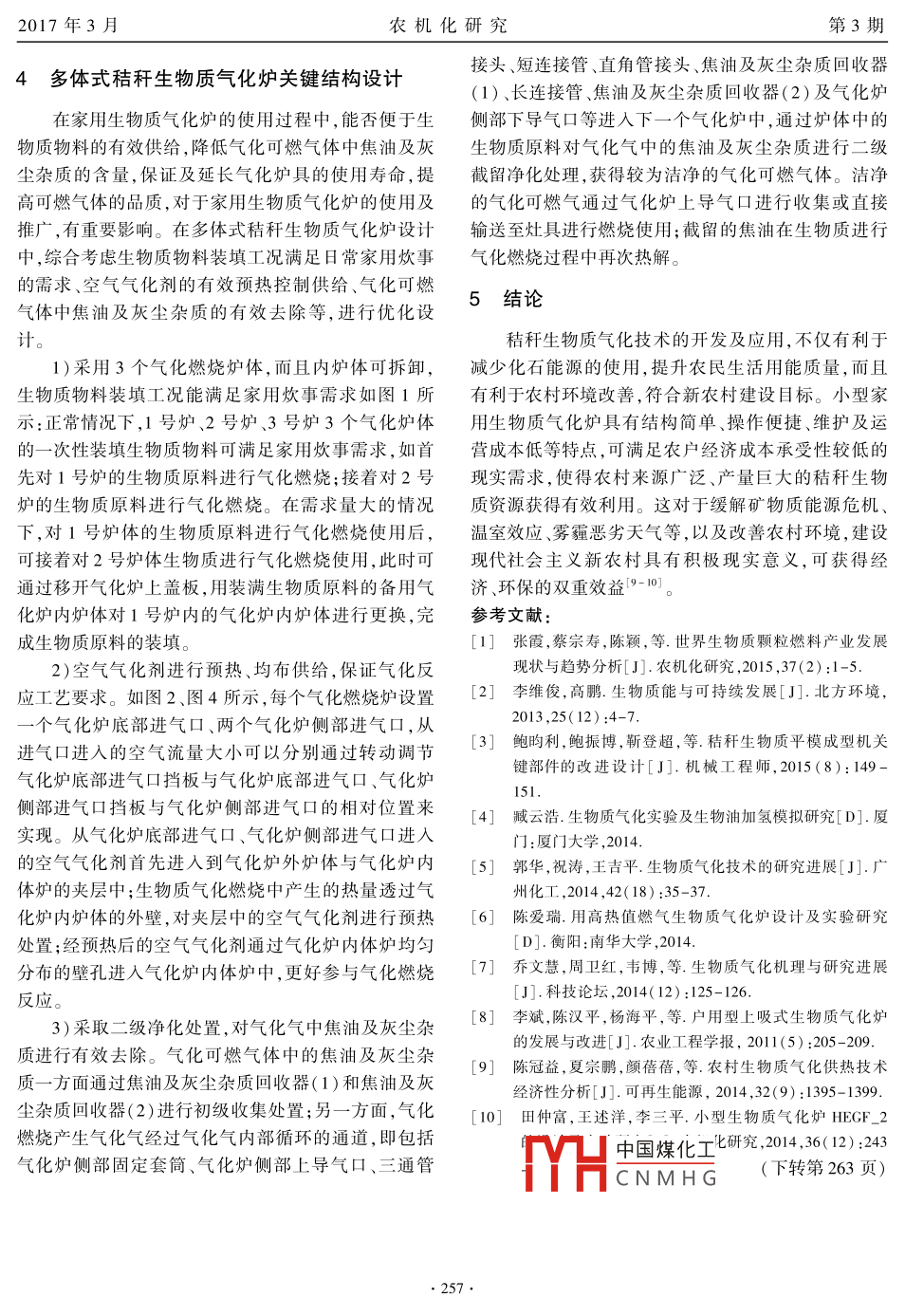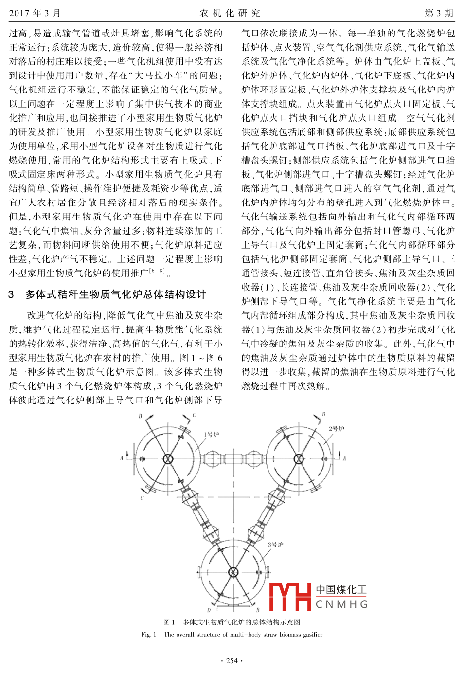 2017年3月.農(nóng)機化研究第3期多體式秸稈生物質(zhì)氣化爐的設(shè)計鮑振博',劉長安,解光傳,彭錦星',靳登超'.,劉玉樂'(1.天津農(nóng)學(xué)院工程技術(shù)學(xué)院,天津300384; 2.天津市創(chuàng)輝津控科技發(fā)展有限公司,天津300392 )摘要:生物質(zhì)能是一種清潔、可再生的能源,秸稈生物質(zhì)能的開發(fā)、應(yīng)用具有廣闊前景,而氣化燃燒是秸稈生物質(zhì)能利用的一種形式。針對小型家用生物質(zhì)氣化爐在使用中存在氣化氣中焦油、灰分含量多,物料連續(xù)添加工藝復(fù)雜,而物料間斷供給使用不便等問題,提出一種多體式秸稈生物質(zhì)氣化爐的設(shè)計。通過3個氣化燃燒爐體且內(nèi)爐體可拆卸,空氣氣化劑預(yù)熱、均布供給,焦油及灰塵雜質(zhì)二級凈化處置等結(jié)構(gòu)設(shè)計,可使得生物質(zhì)物料裝填工況滿足家用炊事需求、保證氣化反應(yīng)工藝要求、有效去除氣化氣中焦油及灰塵雜質(zhì)。多體式秸稈生物質(zhì)氣化爐的使用推廣,可實現(xiàn)對秸稈生物質(zhì)能源有效利用,也有助于解決秸稈生物質(zhì)資源浪費及污染問題。關(guān)鍵詞:秸稈生物質(zhì);氣化爐;多體式;氣化燃燒;焦油凈化.中圖分類號: TK64 .文獻(xiàn)標(biāo)識碼: A文章編號: 1003-188X(2017)03-0253-05物質(zhì)作為可再生的清潔能源,具有低污染性:一方面0引言秸稈生物質(zhì)的硫、氮含量低,在利用轉(zhuǎn)化過程中可以能源問題關(guān)系著人類社會的生存與發(fā)展,隨著世減少硫化物、氮化物和粉塵等排放;此外,在秸稈生物界經(jīng)濟快速發(fā)展和交通工具數(shù)量的劇增,石油、煤、天質(zhì)再生過程中需要吸收CO2氣體,可有效地減輕溫室然氣等能源急劇消耗,由此引發(fā)的能源緊缺及生態(tài)環(huán)效應(yīng);光合作用能釋放出大量氧氣,還可改善生態(tài)環(huán)境破壞,已成為世界關(guān)注的熱點。開發(fā)和利用可再生境[2-3]。針對產(chǎn)量巨大的可再生、綠色清潔的秸稈生的清潔能源,減少對石化能源的依賴和消耗,減少溫物質(zhì)資源,國內(nèi)外科研工作者開展了多種秸稈生物質(zhì)室氣體排放,已成為緩解能源危機、解決環(huán)境污染問利用技術(shù)。題的共識。生物質(zhì)能是綠色植物經(jīng)光合作用將太陽生物質(zhì)氣化燃燒是秸稈生物質(zhì)能清潔利用的一.種能轉(zhuǎn)化儲藏在生物質(zhì)內(nèi)的化學(xué)能,是--種既清潔又可形式之一。生物質(zhì)氣化是以空氣、水蒸氣、氧氣、富氧再生的能源,是繼石油、煤、天然氣之后的第4大能空氣等作為氣化介質(zhì)(.又稱氣化劑) ,在高溫條件下通源。生物質(zhì)是直接或間接利用綠色植物光合作用形過熱化學(xué)反應(yīng),將生物質(zhì)燃料轉(zhuǎn)化為氣態(tài)產(chǎn)物的過成的有機物質(zhì),具有儲量豐富、來源普遍及可再生等程。生物質(zhì)氣化過程是熱解、氧化、還原等許多反應(yīng)特點,陸地每年生產(chǎn)1000億t多生物質(zhì),海洋每年生的組合,該過程可概括為:生物質(zhì)燃料遇熱后首先發(fā)產(chǎn)500億t。對生物質(zhì)能源的開發(fā)和利用是解決生態(tài)生熱解,然后熱解產(chǎn)物和木炭進(jìn)行燃燒,最后燃燒產(chǎn)環(huán)境問題和實現(xiàn)可持續(xù)發(fā)展的戰(zhàn)略選擇,已經(jīng)日益引物被碳還原,生成以CO、H2、CH為主要可燃成分的氣起世界各國的重視[1-3]?;瘹怏w。氣化氣體不僅可以直接作為燃料進(jìn)行燃燒,還可以進(jìn)行燃燒發(fā)電等[4-51)。1秸稈生 物質(zhì)氣化燃燒的形式秸稈生物質(zhì)屬于農(nóng)業(yè)廢棄物,是生物質(zhì)的重要組2秸稈生物質(zhì)氣化燃燒技術(shù)中存在的問題成部分。我國秸稈生物質(zhì)數(shù)量大,每年產(chǎn)量約為7億生物質(zhì)氣化技術(shù)的應(yīng)用主要包括兩大形式:大型t,除一-部分作為畜牧飼料、肥料還田造紙原料等,大管網(wǎng)輸氣式生物質(zhì)氣化站和小型家用生物質(zhì)氣化爐。約有4億t秸稈可以作為生物質(zhì)能源使用。秸稈生大型管網(wǎng)輸氣式生物質(zhì)氣化站是以一個村鎮(zhèn)為供氣區(qū)域建產(chǎn)世氣計與化護(hù)立的氣化氣首先存儲在儲中國煤化工收稿日期: 2016-02-22氣柜中MHCNMHG最終用戶。目前,我國基金項目:天津農(nóng)學(xué)院實驗教學(xué)示范中心教學(xué)改革項目( 2015SY020) ;管網(wǎng)輸式土物質(zhì)(化珀干化爐主要采取上吸式、天津市大學(xué)生創(chuàng)新創(chuàng)業(yè)訓(xùn)練計劃項目(201510061 100)作者簡介:鮑振博( 1971-),內(nèi)蒙赤峰人,副教授, ( E- mai) bazhenbo下吸式固定床形式,技術(shù)已逐漸成熟。但在推廣應(yīng)用@ tjau. edu. cn。過程中依然存在以下問題:生物質(zhì)氣化氣中焦油含量2017年3月.農(nóng)機化研究第3期過高,易造成輸氣管道或灶具堵塞,影響氣化系統(tǒng)的氣口 依次聯(lián)接成為一體。每一單獨的氣化燃燒爐包正常運行;系統(tǒng)較為龐大,造價較高,使得一般經(jīng)濟相括爐體、點火裝置、空氣氣化劑供應(yīng)系統(tǒng)、氣化氣輸送對落后的村莊難以接受;一些氣化機組使用中沒有達(dá)系統(tǒng)及氣化氣凈化系統(tǒng)等。爐體由氣化爐上蓋板、氣到設(shè)計中使用用戶數(shù)量,存在“大馬拉小車”的問題;化爐外爐體、氣化爐內(nèi)爐體、氣化爐下底板、氣化爐內(nèi)氣化機組運行不穩(wěn)定,
