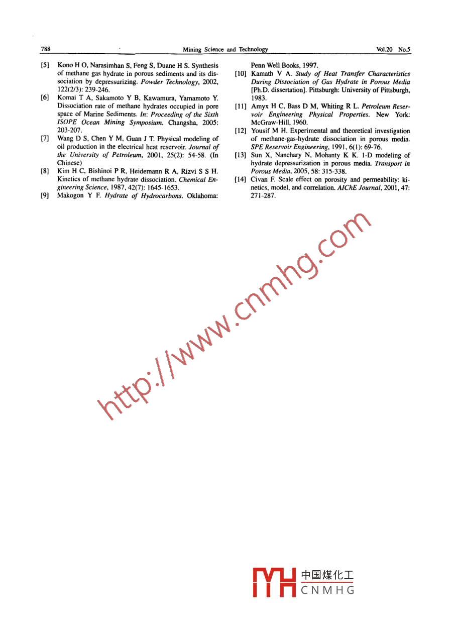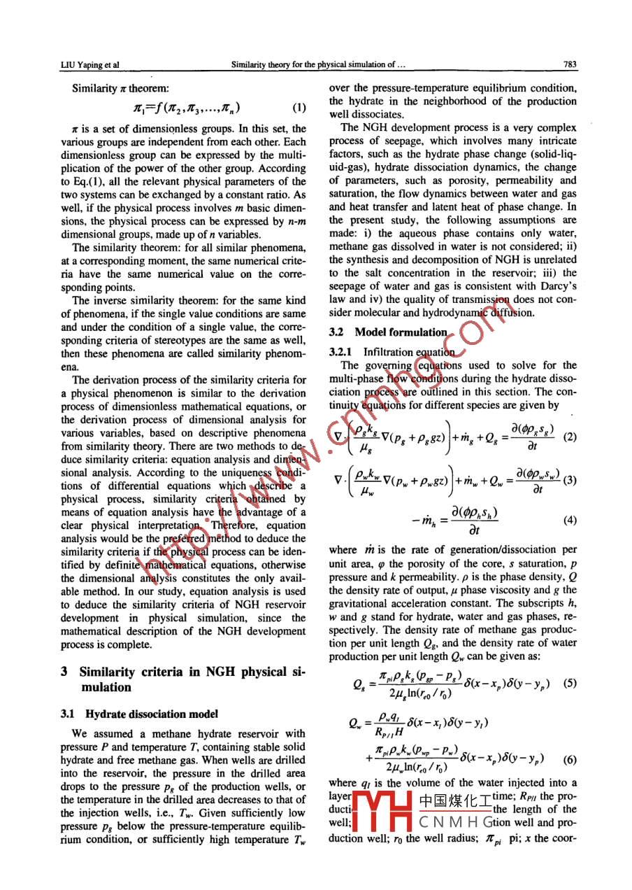 Availableonlineatwww.sciencedirect.comMININGScienceDirectSCIENCE ANDTECHNOLOGYELSEVIERMining Science and Technology 20(2010)0782-0788sevier. com/locate/jcumtSimilarity theory for the physical simulation ofnatural gas hydrate reservoir developmentLIU Yaping.2., CHEN Yueming, BAI Yuhu,LI ShuxiaSchool of Petroleum Engineering, China University of Petroleum, Dongying 257006, Chine2Globe Research Center, Exploration and Production Research Institute of SINOPEC, Beijing 100083, ChinaTechnology Research Department, CNOOC Research Center, Beijing 100027, ChinaAbstract: In order to apply physical simulation results to natural gas hydrate reservoir parameters to provide a theoretical frame-work for the design of a development plan, an analytical equation method was used to obtain the similarity criteria of natural gashydrate reservoir development by physical simulation, based on a mathematical model of natural gas hydrate development. Giventhe approach of numerical simulation, a sensitivity analysis for all parameters was carried out, which specifically demonstrated thatnitial temperature is the most important parameter. Parameters of thermal conductivity coefficients are not necessary for conduct-ing the NGH dissociation process, which will fundamentally simplify the design and establishment of the model. The analysisvides a sound theoretical basis and design principles for particular similarityKeywords: mathematical model; equation analysis; similarity criteria; nature gas hydrate; sensitivity analysis1 Introductionexperiments involving the same parameters withidentical measurements may still provide very differ-At present, Natural Gas Hydrate (NGH), a high- ent results. Developing such a physical simulationquality, clean and new solid energy source, repre- device does not simply require scaling down thesenting high-density enrichment, has a wide applica- NGH field conditions. It requires an understandingion and development potential to help meet and control of a large number of multi-scale physicallong-term energy demands. Based on a scientific and chemical phenomena, spanning in scale fromestimate the methane resources in NGH account for decimeters to hundreds of meters. Consequently, italmost twice the total methane resources in all fossil becomes necessary to apply the principles of similfuels(coal, oil and natural gas)worldwide. Along ity theory as a guide in physical simulation experiwith in-depth theoretical studies, laboratory research ments. Based on similarity theory, a similarity physi-and field practices for NGH, commercial exploitation cal model of NGH was constructed by scaling downof NGh has gradually become of primary interest". the prototype parameters. Subsequently, the physicalThe hydrate dissociation process involves many processes of the prototype would be reproduced accomplex mechanisms, which cannot be explained cording to specific similarity relations where, throughsatisfactorily by means of existing theories, field short-term, small-scale simulation experiments, thepractices or physical simulation(5-6) Compared with seepage process of hydrate reservoirs would be ob-field practices, physical simulation has many advan-served rapidly and the required parameters deter-tages, such as low-cost, short time prerequisites and minedeasy operation. A NGH physical simulation devicetypically integrates many fluid components and con- 2 Basic principles of the similarity theorytains functions simulating actual NGh reservoir con-ditions. Although a large number of hydrate dissocia-Similarity theory is a theory expressing similar re-tion experiments have been carried out, a unified un-tionships between the same phenomena, which canderstanding of NGH has not been formulated so far be described by the same formal equations, requiringand without the guidance of similarity theory, varioussImI中國(guó)煤化工 kind of physicalReceived 11 December 2009: accepted 22 February 2010*Corresponding author. Tel: 86 10 823381 14CNMHGonstructs of simiwcorem. the similardoi:10.1016/S16745264(09)60281-7and its inverseLIU Yaping et alSimilarity theory for the physical simulation ofSimilarity I theoremover the pressure-temperature equilibrium condition兀1=∫(丌2,丌3y…,mn)the hydrate in the neiwell dissociatest is a set of dimensionless groups. In this set, theThe NGH development process is a very complexvarious groups are independent from each other. Each process of seepage, which involves many intricatedimensionless group can be expressed by the multi- factors, such as the hydrate phase change(solid-liq-plication of the power of the other group. According uid-gas), hydrate dissociation dynamics, the changeto eq (1), all the relevant physical parameters of the of parameters, such as porosity, permeability andtwo systems can be exchanged by a constant ratio. As saturation, the flow dynamics between water and gaswell, if the physical process involves m basic dimen- and heat transfer and latent heat of phase change. Insions, the physical process can be expressed by n-m the present study, the following assumptions aredimensional groups, made up of n variablesmade: i)the aqueous phase contains only water,The similarity theorem: for all similar phenomena, methane gas dissolved in water is not considered; ii)at a corresponding moment, the same numerical crite- the synthesis and decomposition of NGH is unrelatedria have the same numerical value on the corre- to the salt concentration in the reservoir; iii)thesponding points.seepage of water and gas is consistent with DarcysThe inverse similarity theorem: for the same kind law and iv) the quality of transmission does not conof phenomena, if the single value conditions are same sider molecular and hydrodynamic diffusion.and under the condition of a single value, the corre- 3.2 Model formulationsponding criteria of stereotypes are the same as well,then these phenomena are called similarity phenom- 3.2.1 Infiltration equationprocess of dimensionless mathemat