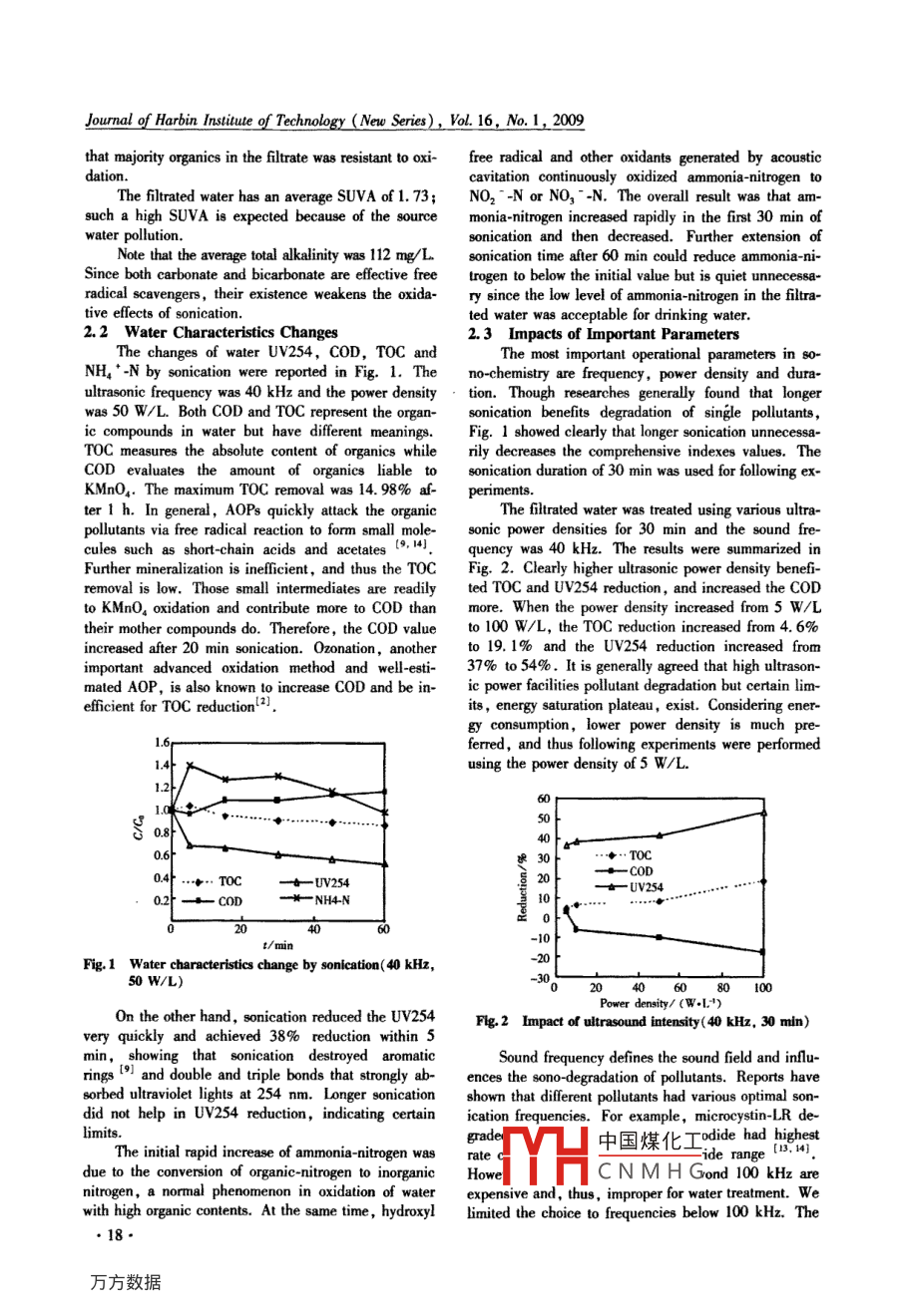 Journal of Harbin Insitute of Technology (New Series), Vol. 16, No.1, 2009Sonication for advanced drinking water treatmentZHANG Guang-ming, WEI Xi-zhu, L Xiang-kun, ZHANG Jie, DOU Zi-bo張光明,魏希柱,李相昆,張杰,豆子波.(State Key Lab of Urban Water Reoure Enionment, Harbin Institute of Technology, Harbin 150090 ,China, gmgwen@ gmail. com)Abstract: This paper investigated the feasibility of sonication as an advanced treatment method for drinking w陸ter production and used comprehensive indexes of water quality to examine its eficience. Results show that som-ication significantly reduces the toxicity of water. Sonicationith5 W/L at 90 kHz lating for 30 min decreasesthe water SUVA and the disinfection byproduct formation potential ( DBPFP) by 38. 7% and 27. 2% respective-ly. Sonication also decreases the UV254 by more than 50% through destroying unsaturated chemical bonds.Higher sound intensity and higher frquency benefit the reduction of TOC and UV254. Besides, sonication sig-nificantly increases the afinity of organics with granular activated carbon (GAC), and thus the hybrid sonica-tion-CAC method reduces the water T0C, COD, UV254, and DBPFP by 78.3%,69.4%,75.7%,and70. 0% respectively. Therefore, sorication and the hybrid sonication-GAC method are proposed as advancedtreatment methods for drinking water.Key words: sonication; drinking water; advanced treatment; DBPFPCLC oumber: TU991Document code; AArticle ID: 1005-9113(2009)01 0016-05Surface water pollution is a serious problem in de-chanically attack sludge flocs. Sonication also gener-veloping countries. In 2006, 50% of surface water inates hydroxyl free radical that is a very active oxidantChina was polluted and failed to meet the national sur~and may react with almost all chemicals. These extremeface water quality standard. Hundreds of persistentconditions and active radicals provide unique environ-chemicals including endocrine disruptors ( EDCs) werements to convert organic matters in water into CO2,found at unsafe levels in 14 major rivers including Son-H2O,inorganie ions, and simple organic acids.ghujiang River , Zhujiang River, and Xiangjiang Riv-Hundreds of studies show that sonication can rapidlyerl. The prevailing pollution of surface waler meansdegrade CCI4,CFC 11, CFC 113, phenols, benzenethat hundreds of water supply plants are forced to useand substituted benzenes, pesticides, and polychlori-unqualified source water, which cannot be purified ef-nated biphenyl ( PCBs), and can effectively deactivatefectively using conventional water treatment process ofbacteria-”。 These researches showed that sonicationcoagulation, sedimentation, filration, and disinfee-quickly degraded many pollutants butmineralizationtion. As a result, many water supply plants use or planwas less effective, the products were often more benignto use advanced treatment after filtration to further puri-than the mother compounds. Since sonication is knownfy the water. The established advanced treatment meth-effcient to remove so many pollutants, it is natural toods include ozone oxidation, granular activated carbontest the feasibility of the technique for advanced drink-(GAC) absorption, ozone-GAC, and membrane filtra-ing water trealment. However, researches focus on sin-tion, Many new technologies have been proposed andgle pollutant degradation and no experiment using com-intensively studied, in which an important group is ad-prehensive indexes is reported,vanced oxidation processes ( AOPs) characterized byhydroxyl free radical oxidation (2-. This paper inves-1 Experimentaltigates one AOP method, sonication, for advanced pur-ification of drinking water from polluted source waler.1.1 Equipments and MaterialsSonication, ultrasonic irradiation, has been stud-Four ultrasonic reactors of the same dimensiongied for water and wastewater treatment for many years.were used for sonication. The sound frequency was 25When applied to liquids, powerful ultrasound causes akHz, 40 kHz, 60 kHz, and 90 kHz respectively. Thecoustic cavitation in which millions of small bubblesreactors were of stainless steel and the volume was 13collapse to produce very high temperature (5000 K)," 中國(guó)煤化工granular activatedpressure (500 bar) , and extreme shear forces that me-carbollumn diameter wasReeived 2008 -05 - 29.TYHCNMHGSponsored by the National High Technology Research and Development Program of China( Gront No. 2007 A062339) and the National Science Foundation for Post-doctoral Scientists of China( Grant No. 2006AA06Z306).●16.Joumal of Harbin Insiue of Tchnology (New Series), Vol. 16, No. 1, 200910 cm, and was flled with 1.2 m wood based GAC.chlorination. These DBPs were measured using an Agi-The empty bed retention time ( EBRT) was 30 min.lent 6890 N gas chromalography (GC) with a 30 m xAll experiments were performned using filtraled wa-0.32 mm x0.25 μm HP-5 column and ECD detector.ter collected from a local water supply plant. The waterCHC], and CHBr, were extracted with n-pentane ac-plant used river water as source water and had a stand-cording to standard methods[ method 6322B,ard treatment process of screening, coagulation, sedi-APHA]. The extract was then analyzed using a CC in-mentation, filtration, and chlorine disinfection. Thelet temperature of 220C, detector temperature offiltrated water was kept at4 C before use. For trials U-300C,column pressure of 15 psi, and column flowsing 100 W/L power density, 5 L of water was usedrate of 0.7 mL/ min. The column temperature programeach trial since the maximum power was 500 w. Forwas as following: kept at 35 C for 4 min , increased toall other trials, 10 L of water was used each time.120 at the rate of 20 C/min, and then maintainedDisinfection by-products ( DBPs ) standards were0.5 min. For haloacetic acids analysis, samples werepurchased from Aldrich. All chemicals were used with-pretreated using a micro-extraction procedure without further purification. Homemade de-ioned water wasmethyl tertbutyl 