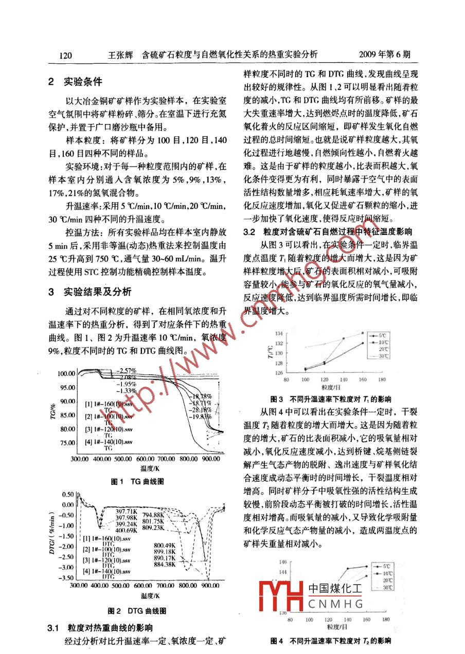 2009年第6期能源技術(shù)與管理l19d:l0.3969jisn.1672-9943.200906049含硫礦石粒度與自燃氧化性關(guān)糸的熱重實(shí)驗(yàn)分析王張輝西安科技大學(xué)能源學(xué)院,陜西西安710054)[摘要]在相同氧濃度下,對(duì)不同粒度含硫礦石樣本在不同升溫速率下進(jìn)行熱重試驗(yàn),分析了隨著礦樣粒度和升溫速率的變化特征溫度點(diǎn)的變化規(guī)律,得到粒度與含硫礦石氧化性的關(guān)系,并結(jié)合含硫礦石自燃杋理對(duì)實(shí)驗(yàn)結(jié)果進(jìn)行了解釋。[關(guān)鍵詞]粒度;礦石自燃;熱重實(shí)驗(yàn);特征溫度[中圖分類號(hào)]TD898[文獻(xiàn)標(biāo)識(shí)碼]A[文章編號(hào)]16729943(20090601193方面的研究有了比較多的應(yīng)用,但在含硫礦石的0引言相關(guān)研究還是比較少的6。本文在熱重分析實(shí)驗(yàn)含硫礦石自燃是一種典型的本身自燃,定義的基礎(chǔ)上,結(jié)合含硫礦石自燃機(jī)理,分析含硫如下:含硫礦石在低溫環(huán)境下與空氣中的氧不斷礦石不同粒度和升溫速率對(duì)含硫礦石自燃氧化性發(fā)生氧化作用包括物理吸附、化學(xué)吸附和氧化反影響規(guī)律應(yīng)),產(chǎn)生微小熱量,當(dāng)產(chǎn)生熱量的速度超過(guò)向外界散發(fā)的速度時(shí)硫化礦石將不斷積聚熱量使碗1實(shí)驗(yàn)儀器及原理化礦石的溫度緩慢而持續(xù)的上升,最終達(dá)到硫化1.1實(shí)驗(yàn)儀器礦石自燃的最低溫度,引起硫化礦石的燃燒12。本實(shí)驗(yàn)采用的儀器為德國(guó)耐馳公司生產(chǎn)的目前,熱重分析方法在煤自燃及其氧化特性TG209熱重分析儀,其具體的參數(shù)如表1所示。表1TG209熱重分析儀參數(shù)表溫度范圍最大承重g靈敏度/μg天平精確度載氣流量加熱速率樣品盤(pán)室溫至750℃±Q1%載氣90ml/mim5-30℃/min鉑坩鍋保護(hù)氣體10ml/min最小間隔為001℃min熱重實(shí)驗(yàn)儀主要由記錄天平、爐體、程序控溫態(tài)。吸引線圈中的電流變化與樣品的重量變化成裝置、記錄儀器和支撐器等幾個(gè)部分組成。記錄天正比,由計(jì)算機(jī)自動(dòng)采集數(shù)據(jù)得到TG曲線燃燒平是其中最主要的組成部分,它將測(cè)量到的重量失重速率曲線DTG可以通過(guò)對(duì)曲線的數(shù)學(xué)分析變化用適當(dāng)?shù)霓D(zhuǎn)換器變成與重量變化成比例的電得到。信號(hào),并可以將得到的連續(xù)記錄轉(zhuǎn)換成其他方式12實(shí)驗(yàn)原理如原數(shù)據(jù)的微分、積分、對(duì)數(shù)或者其他函數(shù)等,用熱重法(TG)是在程序控制溫度下,測(cè)量物質(zhì)來(lái)進(jìn)行對(duì)試驗(yàn)的多方面的熱分析。爐體是熱重分質(zhì)量與溫度關(guān)系的一種技術(shù)。許多物質(zhì)在加熱過(guò)析儀的主要部分,承載樣品的坩鍋置于支撐架上,程中常伴隨質(zhì)量的變化,這種變化過(guò)程有助于研樣品的重量變化用扭轉(zhuǎn)式微電天平來(lái)測(cè)量,當(dāng)試究晶體性質(zhì)的變化,如熔化、蒸發(fā)、升華和吸附等樣因分解作用或化學(xué)反應(yīng)發(fā)生重量變化時(shí),天平物質(zhì)的物理現(xiàn)象;也有助于研究物質(zhì)的脫水解梁發(fā)生偏轉(zhuǎn)梁中心的紐帶同時(shí)被拉緊,光電檢測(cè)離氧化、還原等物質(zhì)的化學(xué)現(xiàn)象。熱重分析通常元件的偏轉(zhuǎn)輸出變大,導(dǎo)致吸引線圈中電流的改可分為兩類:非等溫(動(dòng)態(tài)熱重法和等溫?zé)嶂?靜變。在天平一端懸掛著一根位于吸引線圈中的磁態(tài)法中國(guó)煤化工,但考慮到等溫棒,通過(guò)自動(dòng)調(diào)節(jié)線圈電流使天平梁保持平衡狀法的溫法是從礦樣幾乎NMHx,,皿,樣品在各溫度基金項(xiàng)目:國(guó)家“十一五”科技支撐計(jì)劃項(xiàng)目(2006BAK0下的重量迕續(xù)地被記錄下來(lái),而且相對(duì)于等溫法更加節(jié)省時(shí)間。因此本實(shí)驗(yàn)采用了非等溫?zé)嶂胤ā?20王張輝含硫礦石粒度與自燃氧化性關(guān)系的熱重實(shí)驗(yàn)分析2009年第6期樣粒度不同時(shí)的TG和DTG曲線,發(fā)現(xiàn)曲線呈現(xiàn)2實(shí)驗(yàn)條件出較好的規(guī)律性。從圖12可以明顯看出隨著粒以大冶金銅礦礦樣作為實(shí)驗(yàn)樣本,在實(shí)驗(yàn)室度的減小,TG和DTG曲線均有所前移。礦樣的最空氣氛闈中將礦樣粉碎、篩分。在室溫下進(jìn)行充氮大失重速率增大達(dá)到燃燼點(diǎn)時(shí)的溫度降低礦石保護(hù),并置于廣口磨沙瓶中備用。氧化著火的反應(yīng)區(qū)間縮短,即礦樣發(fā)生氧化自燃樣本粒度:將礦樣分為100目,120目,140過(guò)程的總時(shí)間縮短。也就是說(shuō)礦樣粒度越大,其氧目,160目四種不同的樣品化過(guò)程進(jìn)行地越慢,自燃傾向性越小,自燃著火越實(shí)驗(yàn)環(huán)境:對(duì)于每一種粒度范圍內(nèi)的礦樣,在難。這是由于礦樣的粒度越小,比表而積越大氧樣本室內(nèi)分別通入含氧濃度為5%,9%,13%,化條件變得更為有利,同時(shí)暴露于空氣中的表面17%,21%的氮氧混合物?;钚越Y(jié)構(gòu)數(shù)量增多,相應(yīng)耗氧速率增大,礦樣的氧升溫速率:采用5℃/min,10℃/min,20℃/min,化反應(yīng)速度增加氧化又促進(jìn)礦石顆粒的縮小進(jìn)30℃min四種不同的升溫速度。步加快了氧化速度,使得反應(yīng)時(shí)間縮短??販胤椒?所有實(shí)驗(yàn)樣品均在樣本室內(nèi)靜放32粒度對(duì)含硫礦石自燃