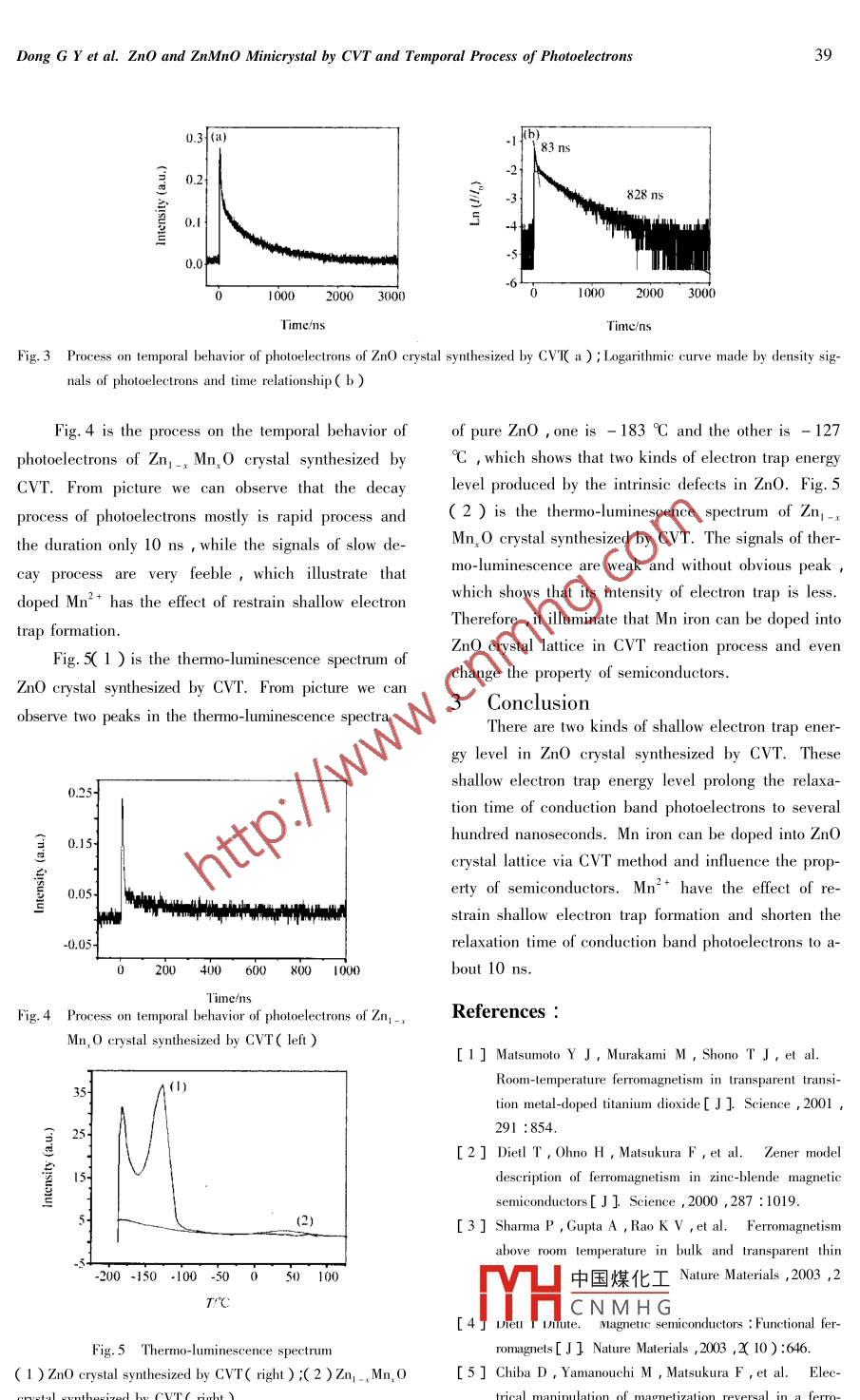 JOURNAL OF RARE EARTHSVol.24 , Spec. Issue , Mar.2006 ,p. 37ZnO and Zn_x Mn, 0 Minicrystal by CVT and Temporal Process ofPhotoelectronsDong Guoyi(董國義),Lin Lin(林琳),Zhang Xiaojun(張曉軍), Wei Zhiren(韋志仁)*( College of Physics Science and Technology , Hebei University , Baoding 071002 , China )Abstract :The ZnO and Zn-. Mn, O minicrystal were synthesized by chemical vapor transport( CVT ). The electron trapstructure( donor level ) and process on the temporal behavior of photoelectrons of materials were respectively studied bythermo-luminescence and microwave absorption dielectric spectrometry. There are two peaks in the thermo-luminescencespectra in pure ZnO ,oneis -183 C and the other is - 127 C , which shows two kinds of electron trap energy level pro-duced by the intrinsic defects in ZnO ; but obtain very low thermo-luminescence that only equals to ten percent of pure ZnOin Zn, .,Mn,O ,which shows that its intensity of electron trap is less. The studies of microwave absorption dielectric spetrometry show that conduction band photoelectrons are two-step exponential decay process in ZnO , the lifetime of rapidprocess is 83 ns , while slow process is 828 ns ,the reason of delay is relaxation effects of electron trap to conduction bandphotoelctrons. The intensity of electron Itrap is less in Zn, _。Mn, O minicrystal , the relaxation efects of conduction bandphotoelectrons from electron trap is lttle , so electrons disappeared quickly at conduction band , and the decay process ofphotoelectrons is only 10 ~ 20 ns.Key words :Zn0 ; chemical vapor transport ; thermo-luminescence ; photoelectronCLC number :0471.4 ;TN304 .Document code : AArticle ID : 1002 -0721( 2006 )- 0037 - 04ZnO attracts a wide interest as a promising mate-reaction with the free energy near zero and the equilib-rial for applications in blue and ultraviolet optoelec-rium constant near unity in an easily achievable tem-tronic devices and in future spintronics devices ( afterperature range , so that the reverse reaction can takedoping with magnetic impurities ) 1~7 ]. Melting pointplace. The CVT is a simple and not costly efficientof ZnO is close to 2000 C , and therefore obtainingtechnique suitable for the growth of large single crys-crystals by liquid phase epitaxy is practically impossi-tals when prolong the growth time. Dietl et al21 coble. It is also not possible to use physical vapor trans-cluded theoretically that obtained room-temperatureport method , because the vapor pressure of ZnO isferromagnetic in Mn, Zn_, 0 when the doping concen-very low( in the temperature range 900 ~ 1200 C ).tration of Mn is less than 5% and the hole density upFor this reason , chemical vapor transport( CVT)is ato 3.5 X 1020 hole per cm3 ; then ZnO diluted magneticsuitable method for high-purity and high-quality ZnOsemiconductors have drawn extraordinary atten-crystal ;furthermore increase crystal growth rates effec-But the reports about study doped Mn totively and obtain bigger crystal 6-10]. Useful methodsmaterial semiconductor properties is very few. So it isof ZnO growth are based on chemical transport. Irquite significant to study localization energy levelspite of a progress in the technology of ZnO growthformed by Mn ion and effect to movement of carrier.there is still a need of improvement in this field.In this paper , the Zny-x Mn, O minicrystals were ob-In the present study , the chemical vapor transporttained by doped manganese dioxide ( MnO2 ) in ZnO.( CVT ) of ZnO crystals using ammonium bromideScanning electron microscopy ( SEM ) , microwave ab-( NH,Br ) as a gaseous transporting agent has beensorption dielectric spectrum and thermo-luminescencecarried out in a closed system. Ammonium bromidespectrum have been used to characterize the propertieshas been chosen because it presents with ZnO a simpleof the crystals. .中國煤化工MYHCNMHGFoundation item : Project supported by the National Natural Science Foundation of China ( 50472037 ) ; the Natural Science Foundation of HebeiProvince ( E20040001 17 and F2004000130 ) ; the Science and Technology Research Program from the Bureau of Science andTechnology of Hebei Province( 2002158 )Biography P28$ Guoyi( 1964 - ) , Male , ProfessorCorrespondanguthor ( E-mail : weizhiren-1 @ 163. com )JOURNAL oF RARE EARTHS , Vol.24 ,Spec. Isuse ,Mar. 2006382 Results and Discussion1 ExperimentalAbout 30 g analytical Zn0 and 8 g ammoniumFig. 1 shows scanning electron micrograph of ZnObronide( NH,Br ) were mised equally , then the mix-cerystal material synthesized by CVT. The crystals haveture was put into silica crucible ,1 ml pure waler alsoZnO polarity growth charateristic obviously ,mostlyadded into silica erucible , after that put it in a silicaexposed eylinder m {10 10}, aper-facep {1011},ampoules ,then sealed heated about Ihat 960 C ,atnegative pole-face 0 {000 1 } and positive pole-facelast took it out and cooling naturally at room tempera-Zn {0001 } Fig. 2 shows scanning electron micro-tureMoreover in 10 g ZnO material doped 200 mggraph of 2Zn-. Mn,0 erystal material synthesied bymanganese dioxide ( MnO2 ) and 3 g ammonium bro-CVT ,keep morphological character of pure ZnO crys-mide( NH,Br ),then mixed them equality and addedtal ,mosly expoed erystal plane eylinder m {10 10},1ml water at one side , also sealed heated 1 hat 960taper-facep {101 }, negative pole-faceO f0001}C and cooled naturally at room temperature , synthe-and positive pole-face Zn {0001 }sized Zn, _Mn,0 semiconductor crystal power.Fig. 3( a) is the process on the temporal behaviorThe measurement of process on the temporal be-of polecrons of Zn0 erystal syuhesired by CVT.havior of photoletron was adopted by the technologyFig. 3( b ) is logarithmic curve made by density signalsof microwave absorption dielectrice spectrometry ,meas-of photoelectrons and time relationship. Compareduring principle and methods can refer to litera-with crystal synthesized by hydrothermal method ,mi-ture16J7]. When YAG pulse laser irad