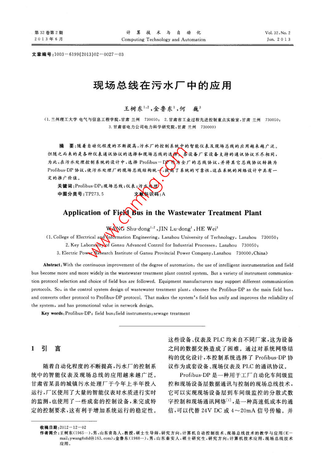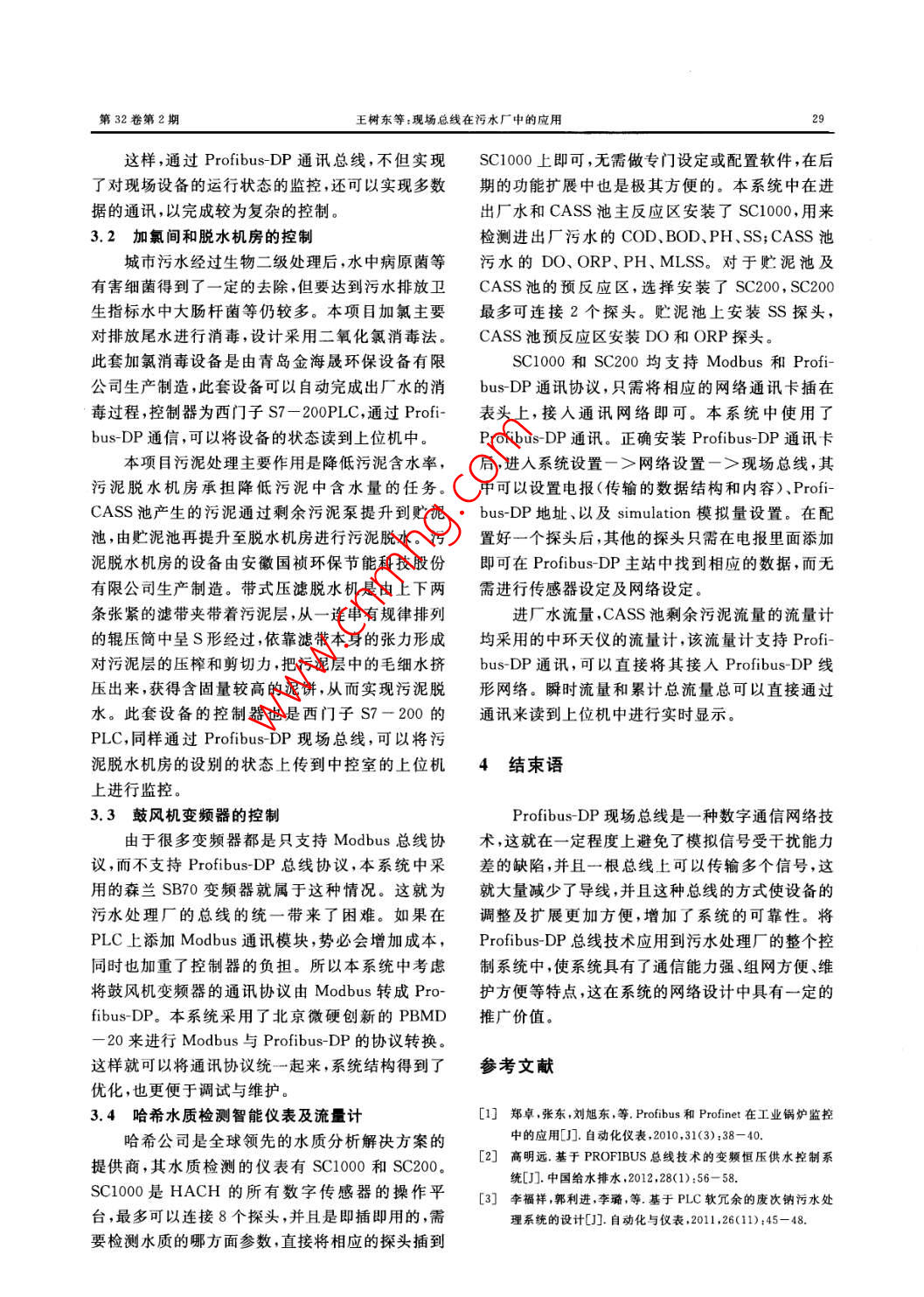 第32卷第2期計算技術(shù)與自動化Vo.32,No.22013年6月Computing Technology and AutomationJun,2013文章編號:1003-6199(2013)02-0027-03現(xiàn)場總線在污水廠中的應(yīng)用王樹東2,金魯東1,何巍3(1.蘭州理工大學(xué)電氣與信息工程學(xué)院,甘肅蘭州730050;2.甘肅省工業(yè)過程先進控制重點實驗室,甘肅蘭州7300503.甘肅省電力公司電力科學(xué)研究院,甘肅蘭州730000摘要:隨著自動化程度的不斷提高,污水廠的控制系統(tǒng)中的智能儀表及現(xiàn)場總線的應(yīng)用越來越廣泛,但隨之而來的是各種儀表通訊協(xié)議的選擇和現(xiàn)場總線的選擇。各設(shè)備廠家設(shè)備支持的通訊協(xié)議不盡相同,為此,在污水處理控制系統(tǒng)的設(shè)計中,選擇 Profibus-DP作為全廠的總線協(xié)議,并將其它總線協(xié)議轉(zhuǎn)換為Profibus-DP協(xié)議,使污水處理廠的現(xiàn)場總線結(jié)構(gòu)統(tǒng)一,提高了系統(tǒng)的可靠性,這在系統(tǒng)的網(wǎng)絡(luò)設(shè)計中具有」定的推廣價值。關(guān)鍵詞 Profibus-DP;現(xiàn)場總線;僅表;污水處理中圖分類號:TP273.5獻標識碼:AApplication of Field Bus in the Wastewater Treatment PlantWANG Shu-dong. 2, JIN Lu-dong, HE We(1. College of Electrical and Information Engineering, Lanzhou University of Technology, Lanzhou 730050;2. Key Laboratory of Gansu Advanced Control for Industrial Processes, Lanzhou 7300503. Electric Power Research Institute of Gansu Provincial Power Company, Lanzhou 730000, China)Abstract With the continuous improvement of the degree of automation, the use of intelligent instrumentation and fieldbus become more and more widely in the wastewater treatment plant control system. But a variety of instrument communication protocol selection and choice of field bus are followed. Equipment manufacturers may support different communicationprotocols. So, in the control system design of wastewater treatment plant, chooses the Profibus-DP as the main field busand converts other protocol to Profibus-DP protocol. That makes the systems field bus unify and improves the reliability ofthe system, and has promotional value in net work designKey words: Profibus-DP; field bus; field instruments; sewage treatment這些設(shè)備、儀表及PLC均來自不同廠家,這為設(shè)備1引言之間的數(shù)據(jù)交換造成了困難。通過對系統(tǒng)網(wǎng)絡(luò)結(jié)構(gòu)的優(yōu)化設(shè)計,本控制系統(tǒng)選擇了 Profibus-DP協(xié)隨著自動化程度的不斷提高,污水廠的控制系議作為成套設(shè)備、現(xiàn)場儀表及PC的通訊協(xié)議統(tǒng)中的智能儀表及現(xiàn)場總線的應(yīng)用越來越廣泛Profibus-DP是一種用于工廠自動化車間級監(jiān)甘肅省某縣的城鎮(zhèn)污水處理廠于今年上半年投入控和現(xiàn)場設(shè)備層數(shù)據(jù)通訊與控制的現(xiàn)場總線技術(shù),運行,廠區(qū)使用了大量的智能儀表對水質(zhì)進行實時它可以實現(xiàn)現(xiàn)場設(shè)備層到車間級監(jiān)控的分散式數(shù)的監(jiān)測,也使用了一些成套的控制設(shè)備,來完成特字控制和現(xiàn)場通訊網(wǎng)絡(luò),是一種高速低成本的通定的控制要求,這有利于增加系統(tǒng)運行的穩(wěn)定性。信,可以代替2VDC或4~20mA信號傳輸。并收稿日期:2012-12-02作者簡介:王樹東(1965-),男,山東青島人,教授,碩士生導(dǎo)師,研究方向:計算機自動控制技術(shù)、現(xiàn)場總線技術(shù)的教學(xué)與應(yīng)用(maii:yanga88d@163.com);金魯東(1988-)男,山東秦安人,碩土研究生,研究方向:計算機技術(shù)應(yīng)用,現(xiàn)場總線技術(shù)應(yīng)用計算技術(shù)與自動化2013年6月且 Profibus-DP作為最實用可靠的現(xiàn)場總線之一,柵、加氯間和污泥脫水機房的S7-200從站的通信在國內(nèi)也得到了很廣泛的應(yīng)用。很多PLC的生產(chǎn)根據(jù)現(xiàn)場設(shè)備到控制器的連接方式,現(xiàn)場總線廠家及儀表生產(chǎn)廠家均對 Profibus-DP協(xié)議做了的拓撲結(jié)構(gòu)通常采用線形、樹形和環(huán)形這三種方相應(yīng)的通訊模塊,這就使其在控制系統(tǒng)中更廣泛的式。 Profibus-DP采用的是線形結(jié)構(gòu),用一根總干使用成為可能。線從控制器連接到受控對象,總線電纜從主干電纜分支到現(xiàn)場設(shè)備處,控制器掃描所有IO站上的2系統(tǒng)結(jié)構(gòu)輸入,必要是還可以發(fā)送信息到輸出通道,實現(xiàn)主從方式和對等式通信2??刂葡到y(tǒng)的 Profibus-根據(jù)污水廠的布局,選擇使用兩個PLC控制DP總線以AC500系列PLC作為主站,與其他設(shè)站來完成整個廠區(qū)的監(jiān)控工作。兩個PLC控制站備以總線的形式連接,中間的設(shè)備的DP頭的終端均選用了ABB公司的AC500系列PLC,它具有網(wǎng)電阻在OFF位置,終端的設(shè)備終端電阻在ON位絡(luò)功能強、可靠性高、價格適中的特點,尤其是近十置。設(shè)備的連接方式如圖2所示。幾年,我國的污水供水項目,以ABB公司的AC500系列PLC為核心的控制系統(tǒng),有很多的工CM572流量計EM277程實例。全廠的網(wǎng)絡(luò)采用雙層網(wǎng)絡(luò)結(jié)構(gòu),底層使用的是Profibus-DP總線Profibus-DP總線,上層選用了傳輸速度更快,應(yīng)用更為廣泛的以太網(wǎng)。中控室和PLC站均使用了日白國netlink光纖收發(fā)器,通過光纖連接,傳輸距離更遠SC1000SC200變頻器且不受其他設(shè)備的干擾,使通信更加穩(wěn)定。網(wǎng)絡(luò)結(jié)構(gòu)如圖1所示。圖2 Profibus-DP總線結(jié)構(gòu)計算機打印機3系統(t