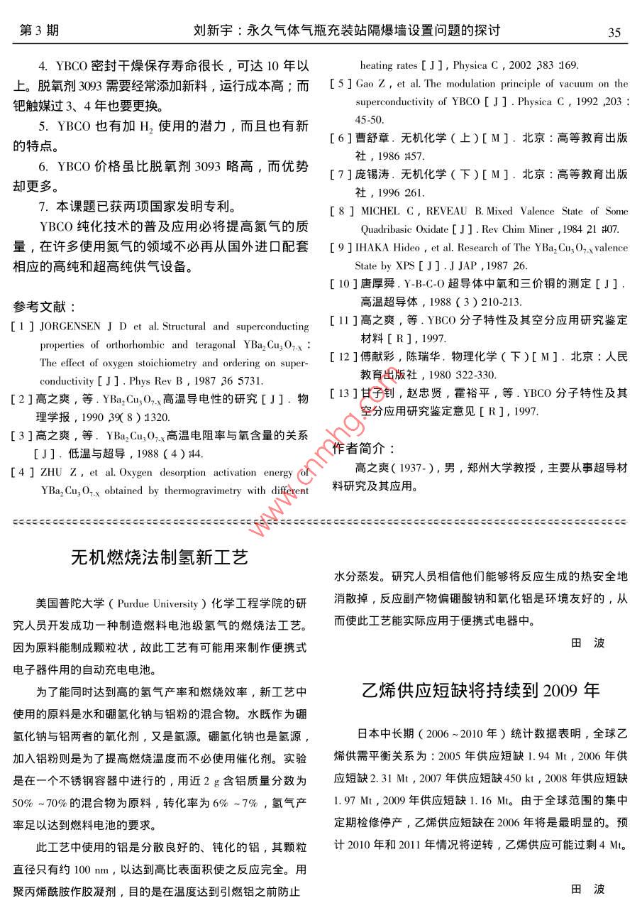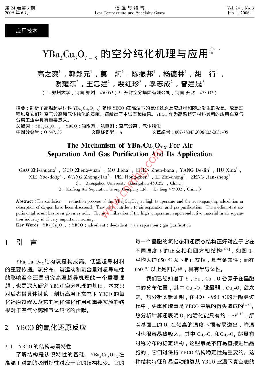第24卷第3期低溫與特氣Vol 24, No. 32006年6月mperature and Specialty Gases應(yīng)用技術(shù)YBa,Cu3o7-x的空分純化機(jī)理與應(yīng)用高之爽,郭鄭元,莫炯,陳振邦,楊德林,胡行謝耀東2,王忠建2,裴紅珍2,李志成,曾建晟21.鄭州大學(xué),河南鄭州450052;2.開(kāi)封空分集團(tuán)有限公司,河南開(kāi)封475002)摘要∶剖析了高溫超導(dǎo)材料 YBa, Cu3O,-(簡(jiǎn)稱(chēng)YBCO)在高溫下旳氧化還原反應(yīng)過(guò)程和隨之發(fā)生的吸氧、放氧過(guò)程以及它們對(duì)空氣分離和氣體純化的貢獻(xiàn)。還給出了中試實(shí)驗(yàn)結(jié)果。YBCO作為高溫超導(dǎo)材料其新的應(yīng)用在空氣分離工業(yè)中具有重要意義。關(guān)鍵詞:YBa2Cu3O,-x;YBCO;吸附劑;除氧劑;空氣分離;氣體純化中圖分類(lèi)號(hào):0647.33文獻(xiàn)標(biāo)識(shí)碼:A文章編號(hào):007-7804200603-0031405The Mechanism of YBa, Cu, O,x For AirSeparation And Gas Purification And Its applicationGAO Zhi-shuang, GUO Zheng-yuan, MO Jiong, CHEn Zhen-bang, YANG De-lin', HU XingXIE Yao-dong, WANG Zhong-jian, PEI Hong-zhen, LI Zhi-cheng, ZENG Jian-sheng(1. Zhengzhou University Zhengzhou 450052,China2. Kaifeng Air Separation Group Company Ltd. Kaifeng 475002, ChinaAbstract: The oxidation- reduction process of the Y Ba Cu, O,x at high temperatue and the accompanying adsorbtion ordesorption of oxygen have been discussed. They will contribute to air separation and gas purification. The medium-test experimental result has been given as well. The new utilization of the high temperature superconductive material in air separation industry is of very important meaningKey Words: Y Ba, Cu, O,x YBCO adsorbent deoxidant air separation gas purification引言每一個(gè)晶胞的氧化態(tài)和還原態(tài)結(jié)構(gòu)正好對(duì)應(yīng)于它在不同溫度下的正交相和四方相結(jié)構(gòu)3],如圖1YBa3Cu3O3結(jié)構(gòu)氧是構(gòu)成高、低溫超導(dǎo)材料平均大約650℃以下是正交相,具有金屬性;而在的重要依據(jù)。氧分布、氧運(yùn)動(dòng)和氧含量對(duì)超導(dǎo)電性650℃以上是四方相,具有半導(dǎo)體性。的影響至今還是研究高溫超導(dǎo)機(jī)理的一個(gè)重要課我們已經(jīng)知道了Y,Ba,Cu,O各原子在晶胞題,也是深入研究YBCO空分機(jī)理的基礎(chǔ)。本文只中的分布位置,其中Cu1O1鍵最弱,Cu2O3鍵次對(duì)后者做具體討論:剖析高溫正常態(tài)下YBCO的氧之。熱分析實(shí)驗(yàn)證明,在400~950℃的升降溫過(guò)化還原過(guò)程以及它的氧化催化作用和重要實(shí)驗(yàn)的結(jié)果對(duì)于空氣分離和氣體純化的貢獻(xiàn)程中,失重和增重是YBCO中氧的得失造成的23熱分析計(jì)算還表明01的活化能只有約1eV4,所2YBCO的氧化還原反應(yīng)以基面上的O1在較高的溫度下很容易逸出,降溫時(shí)也很容易被吸入。其中Cu2O2和Cu2O4都具有2.1YBCO的結(jié)構(gòu)與氧特性對(duì)稱(chēng)分布的穩(wěn)定結(jié)構(gòu),這些氧是不容易直接進(jìn)出晶了解結(jié)構(gòu)是認(rèn)識(shí)特性的基礎(chǔ)。YBa2Cu3Ox在胞的,它們對(duì)保持YBCO結(jié)構(gòu)穩(wěn)定性是重要的。這高溫下對(duì)氧的吸附特性對(duì)應(yīng)于它的結(jié)構(gòu)相變。它的種結(jié)構(gòu)特征和易運(yùn)動(dòng)的氧從YBCO室溫下真空態(tài)的低溫與特氣第24卷中子衍射結(jié)果就能得到證明1↑①正交相a≠b≠c;a≠B=Y=90°②四方相a=b≠c;a=B=-90°圖1YBCO的兩種相結(jié)構(gòu)2.2氧的吸附和解吸價(jià),鋇Ba是+2價(jià)3多數(shù)離子型氧化物熔點(diǎn)很由于溫度的升高,正交相結(jié)構(gòu)中上下基面上高,如Y2O3的熔點(diǎn)高達(dá)2000℃以上,BaO的熔點(diǎn)O動(dòng)能增大,超出Cu1-O鏈的束縛,并把兩個(gè)電子是1800℃。因此,在1000℃的高溫下它們的氧化轉(zhuǎn)移給Cu1而自己則合并成氧分子逸出晶胞;同時(shí)物是穩(wěn)定的,它們的價(jià)態(tài)也穩(wěn)定。而氧0)呈2也有一部分O1跳到a軸O3的位置,并由此逸出晶價(jià),鉞Cu)是可變價(jià)的過(guò)渡元素。獨(dú)立存在的物胞,因而使b軸排斥勢(shì)減少而縮短,a軸的排斥勢(shì)質(zhì)都是呈電中性,價(jià)態(tài)飽和,故上述反應(yīng)式左邊增加而伸長(zhǎng),直到大約650℃,a=b,變成四方Cu必然存在兩個(gè)+2價(jià)和一個(gè)+3價(jià)的狀態(tài),而右相。O1的逸出使Cu1O鏈遭到破壞,氧空位增加,邊的銅必然是兩個(gè)+2價(jià)和一個(gè)+1價(jià)。許多實(shí)驗(yàn)造成電子傳輸?shù)膭?shì)壘障礙,同時(shí)由于氧離子減少和都證實(shí)Cu3/Cu2+和Cu/Cu2+的共存80。這樣自由電子被Cu1束縛都使可遷移的載流子數(shù)減少,必然造成在正反應(yīng)過(guò)程中,Cu得到兩個(gè)電子,氧故YBCO導(dǎo)電性減弱,所以由原來(lái)的金屬性變成了化數(shù)降低成為Cu、放出鏈氧O,而被還原,即半導(dǎo)體性。當(dāng)溫度從髙溫降到低溫時(shí),環(huán)境氧又被YBCO在升高溫度時(shí)脫氧被還原。在逆反應(yīng)過(guò)程中吸入晶體內(nèi),在晶場(chǎng)作用下,從分子氧變成原子吸入的O1原子從Cu得到兩個(gè)電子,而Cu氧化氧,主要占據(jù)O的位置,從Cu得到兩個(gè)電子,恢?jǐn)?shù)升高變?yōu)镃u3,即YBCO降低溫度時(shí)吸取環(huán)境復(fù)Cu1-O鏈,使相變沿逆向進(jìn)行。應(yīng)該指出上述過(guò)氧被氧化。因此,當(dāng)含氧空氣通過(guò)在降溫狀態(tài)(或程是大量晶胞統(tǒng)計(jì)的平均結(jié)果。在升降溫吸放氧的較低溫度)的YBCO時(shí)氧被吸附,