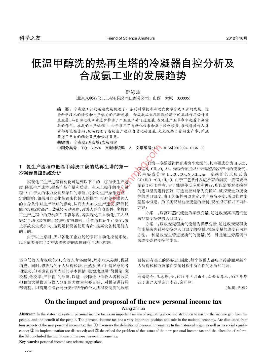 科學(xué)之友Friend of science Amateurs2012年10月低溫甲醇洗的熱再生塔的冷凝器自控分析及合成氨工業(yè)的發(fā)展趨勢(shì)靳海波(北京眾聯(lián)盛化工工程有限公司山西分公司,山西太原030006)摘要:合成氬工業(yè)的迅速發(fā)展促進(jìn)了一系列科學(xué)技術(shù)和近代化學(xué)合成工業(yè)的發(fā)展。隨著科學(xué)技術(shù)的進(jìn)步和生產(chǎn)能力的不斷發(fā)展,合成氨工業(yè)在國(guó)民經(jīng)濟(jì)中的基礎(chǔ)作用必將日益顯著。而自動(dòng)化技術(shù)的進(jìn)步推動(dòng)了工業(yè)生產(chǎn)的飛速發(fā)展,在促進(jìn)產(chǎn)業(yè)革命中起著十分重要的作用。在氨的生產(chǎn)流程中,由于采用了自動(dòng)化儀表和集中控制裝置,來(lái)代替操作人員的部分直接勞動(dòng),從而促進(jìn)了連續(xù)生產(chǎn)過(guò)程自動(dòng)化的發(fā)展,大大提高了勞動(dòng)生產(chǎn)率,并且獲得了巨大的社會(huì)效益和經(jīng)濟(jì)效益。關(guān)鍵詞:合成氨;再生塔;發(fā)展趨勢(shì)中圖分類號(hào):TQ113.266文獻(xiàn)標(biāo)識(shí)碼:A文章編號(hào):1000-8136(2012)24-0136-021氨生產(chǎn)流程中低溫甲醇洗工段的熱再生塔的第一(1)第一冷凝器管程介質(zhì)為半水煤氣,其主要成分為H2,COCO2,N2,CH4,O2,Ar。殼程介質(zhì)是從中壓廢熱鍋爐產(chǎn)出的變換氣冷凝器自控系統(tǒng)分析其主要成分為H2,CO,CO2,N2,CH4,Ar。變換爐的反應(yīng)式為實(shí)現(xiàn)化工生產(chǎn)過(guò)程自動(dòng)化可達(dá)到以下目的:①加快生產(chǎn)速C0+HO+CO2+H+Q由于工藝條件反應(yīng)所需的溫度一般需要控度降低生產(chǎn)成本提高產(chǎn)品產(chǎn)量和質(zhì)量。在人工操作的生產(chǎn)過(guò)制在230℃左右,為了能夠使反應(yīng)順利進(jìn)行,所以需要對(duì)變換爐程中,由于人的體力及自身?xiàng)l件的限制,將會(huì)對(duì)生產(chǎn)操作造成的進(jìn)口溫度進(jìn)行控制,可選被控對(duì)象為變換爐,被控變量為變換定的影響,如果用自動(dòng)化裝置來(lái)代替人的操作,可避免并改善人爐的進(jìn)口溫度由工藝條件可以確定,生產(chǎn)負(fù)荷不變,所以管程流的自身?xiàng)l件對(duì)生產(chǎn)帶來(lái)的影響,從而大大加快生產(chǎn)速度,降低耗量基本恒定。為了實(shí)現(xiàn)對(duì)被控變量的控制現(xiàn)在擬訂有以下兩種能,實(shí)現(xiàn)優(yōu)質(zhì)高產(chǎn)。②減輕勞動(dòng)強(qiáng)度,改善人的自身?xiàng)l件。多數(shù)化方案工生產(chǎn)過(guò)程中的勞動(dòng)條件不容樂(lè)觀,若實(shí)現(xiàn)化工自動(dòng)化,工人只方案一:以高壓蒸汽流量為操縱變量,通過(guò)改變高壓蒸汽量需對(duì)自動(dòng)化裝置的運(yùn)轉(zhuǎn)進(jìn)行監(jiān)視即可。③能夠保證生產(chǎn)安全,防來(lái)控制變換爐的入口溫度止事故發(fā)生或擴(kuò)大,達(dá)到延長(zhǎng)設(shè)備使用壽命、提高設(shè)備利用能力方案二:以改變殼程換氣流量為操縱變量,通過(guò)改變殼程換的目的氣流量來(lái)達(dá)到對(duì)變換爐入口溫度的控制。操縱變量的改變有兩種方法:一種是改變主管道變換氣的流量;另一種是通過(guò)旁路調(diào)節(jié)由于以上原因,所以各化工企業(yè)紛紛采用自動(dòng)化控制系統(tǒng)。來(lái)改變殼程變換氣流量。以下簡(jiǎn)要介紹了對(duì)中溫變換爐的溫度進(jìn)行自動(dòng)化控制。輕中低收入者稅收負(fù)擔(dān),高收入者多繳稅,縮小收入差距,促進(jìn)目標(biāo)還有很長(zhǎng)的路要走,因此,每個(gè)納稅人都應(yīng)當(dāng)冷靜面對(duì)新個(gè)消費(fèi)。同時(shí),修改后的個(gè)人所得稅法,雖然參照了社情民意的各人所得稅稅收政策在實(shí)施過(guò)程中所面臨的矛盾和問(wèn)題。項(xiàng)需求,但考慮到我國(guó)當(dāng)前的基本國(guó)情,穩(wěn)健地遵照“簡(jiǎn)稅制、寬稅基、低稅率、嚴(yán)征管”的原則,以進(jìn)一步降低中低收入者稅收負(fù)作者簡(jiǎn)介:王志華,女,1971年3月出生,山西太原人,2007年畢擔(dān)和加大稅收調(diào)節(jié)收入分配的力度為主要目標(biāo),對(duì)稅制進(jìn)行局業(yè)于浙江大學(xué)會(huì)計(jì)專業(yè),會(huì)計(jì)師。部調(diào)整。因離建立綜合與分類相結(jié)合的個(gè)人所得稅制度的改革(編輯:邊瑤)On the impact and proposal of the new personal income taxWang ZhAbstract: In the states tax system, personal income tax as an important means of regulating income distribution to narrow the income gap from thepeople, and the benefit of the people. The personal income tax has a very important position and role in the national economy. Are discussed fromfour aspects of the new personal income tax the: discusses the definition of personal income tax to the historical origin as well as its social signifi-cance:@2) its implementation are discussed; and @3 described the problem of the status of the new personal income tax and the direction of reform:the 4 concluded the limitations of the new personal income tax.Key words: personal income tax; reform; suggestions科學(xué)之友Friend of science Amateurs2012年10月由于變換反應(yīng)需H2O和CO量達(dá)到一定的比例,水蒸氣的流合成氨工業(yè)的迅速發(fā)展促進(jìn)了一系列科學(xué)技術(shù)和近代化學(xué)量不可過(guò)低,即水蒸氣的流量不可有太大的波動(dòng),所以選高壓蒸合成工業(yè)的發(fā)展。隨著科學(xué)技術(shù)的進(