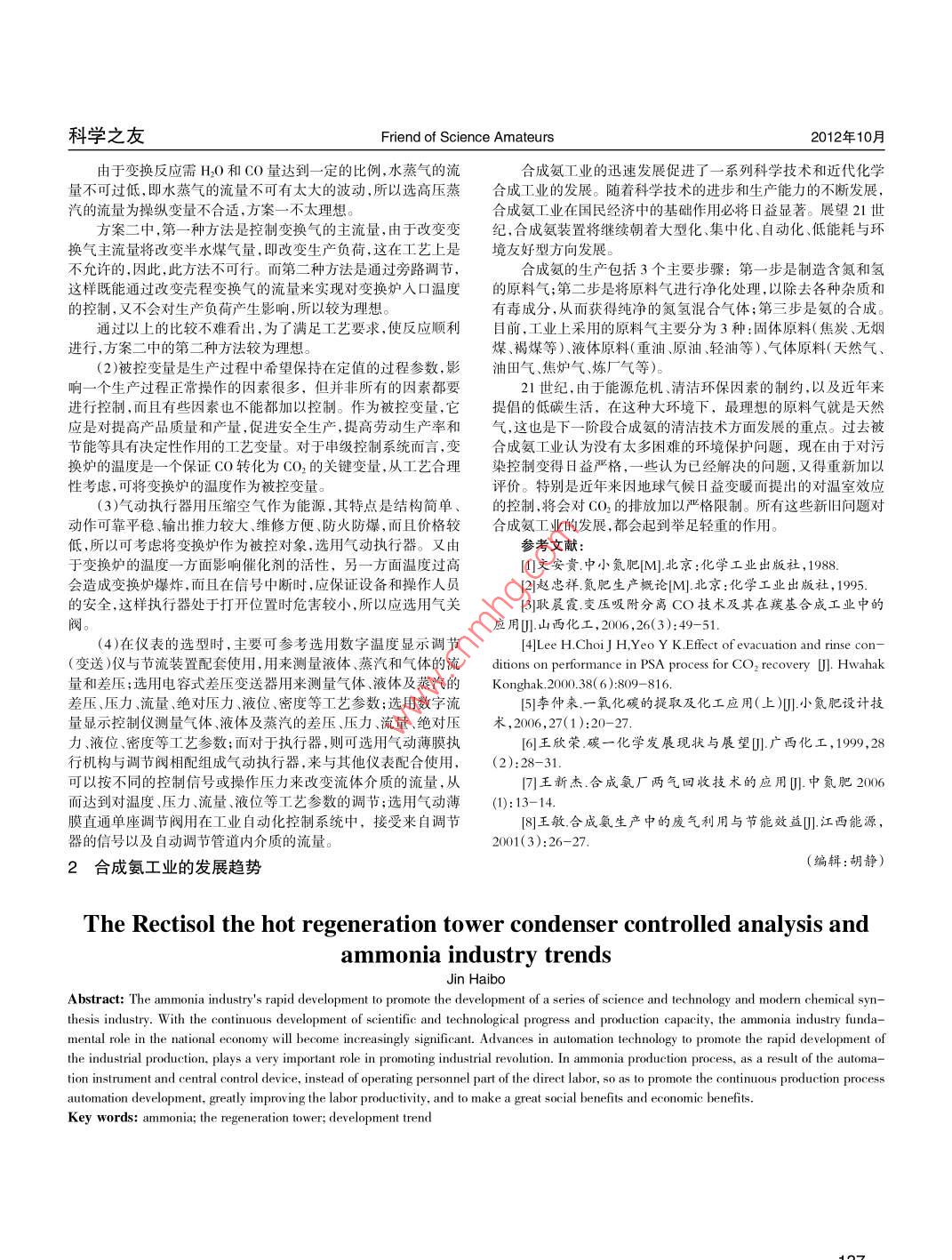 低溫甲醇洗的熱再生塔的冷凝器自控分析及合成氨工業(yè)的發(fā)展趨勢(shì)