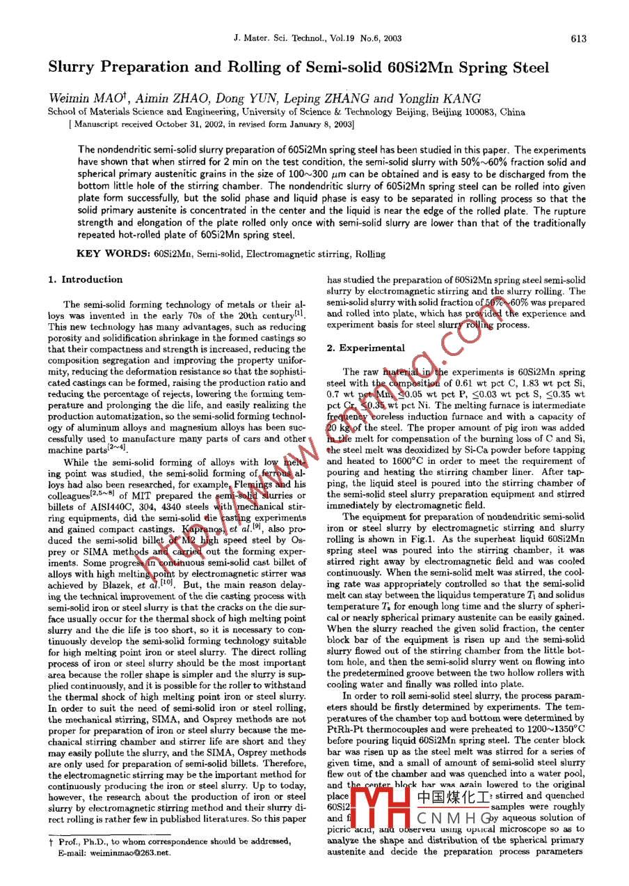 J. Mater. Sci. Technol, Vo1.19 No.6, 2003613Slurry Preparation and Rolling of Semi-solid 60Si2Mn Spring SteelWeimin MAOt, Aimin ZHAO, Dong YUN, Leping ZHANG and Yonglin KANGSchool of Materials Science and Engineering, University of Science & Technology Beijing, Beijing 100083, China[ Manuscript received October 31, 2002, in revised form January 8, 2003]The nondendritic semi-solid slurry preparation of 60Si2Mn spring steel has been studied in this paper. The experimentshave shown that when stirred for 2 min on the test condition, the semi-solid slurry with 50%~60% fraction solid andspherical primary austenitic grains in the size of 100~300 um can be obtained and is easy to be discharged from thebottom lttle hole of the strring chamber. The nondendritic slurry of 60Si2Mn spring steel can be rolled into givenplate form scessfully, but the solid phase and liquid phase is easy to be separated in rlling process so that thesolid primary austenite is concentrated in the center and the liquid is near the edge of the rolled plate. The rupturestrength and elongation of the plate rolled only once with semi-solid slurry are lower than that of the traditionallyrepeated hot-rolled plate of 60Si2Mn spring steel.KEY WORDS: 60Si2Mn, Semi-solid, Electromagnetic strring, Rolling1. Introductionhas studied the preparation of 60Si2Mn spring steel semi-solidslurry by electromagnetic stirring and the slurry rolling. TheThe semi-solid forming technology of metals or their asemi-solid shurry with solid fraction of 50%~60% was preparedloys was invented in the earlyDs of the 20th centuryl1.and rolled into plate, which has provided the experience andThis new technology has many advantages, such as reducingexperiment basis for steel slurry rolling process.porosity and solidification shrinkage in the formed castings sothat their compactness and strength is increased, reducing the2. Experimentalcomposition segregation and improving the property unifor-mity, reducing the deformation resistance so that the sophistj-The raw material in the experiments is 60Si2Mn springcated castings can be formed, raising the production ratio andsteel with the composition of 0.61 wt pct C, 1.83 wt pct Si,reducing the percentage of rejects, lowering the forming tem-0.7 wt pct Mn, <0.05 wt pct P,≤0.03 wt pct S, <0.35 wtperature and prolonging the die life, and easily realizing thepct Cr,≤0.35 wt pct Ni. The melting furnace is intermediateproduction automatization, so the semi-solid forming technol-frequency coreless induction furnace and with a capacity ofogy of aluminum alloys and magnesium alloys has been suC~-20 kg of the steel. The proper amount of pig iron was addedcessfully used tomanufacture many parts of cars and otherin the melt for compensation of the burning loss of C and Si,the steel melt was deoxidized by Si-Ca powder before tappingWhile the semi-solid forming of alloys with low melt-ing point was studied, the semi-solid forming of ferrous a小pouring and heating the stirring chamber liner. After tap-loys had also been researched, for example, Flemings and hisping, the liquid steel is poured into the stirring chamber ofcolleaguesl2,5~5l of MIT prepared the semi-golid slurries orthe semi-solid steel slurry preparation equipment and stirredbillets of AISI440C, 304, 4340 steels with mechanical stir-immnediately by electromagnetic field.ring equipments, did the semi- solid die casting experimentsThe equipment for preparation of nondendritic semi solidand gained compact castings. Kapranos, et al.l9, also pro-iron or steel slurry by electromagnetic stirring and slurryduced the serni-solid billet of M2 high speed steel by Os-rolling is shown in Fig.1. As the superheat liquid 60Si2Mnprey or SIMA methods and carried out the forming exper-spring steel was poured into the stirring chamber, it wasiments. Some progress in continuous semi-solid cast billet ofstirred rightaway by electromagnetic fend wasoledalloys with high melting point by electromagnetic stirrer wascontinuously. When the semi-solid melt was stirred, the cool-achieved by Blazck, et al,1o. But, the main reason delay-ing rate was appropriately controlled so that the semi-soliding the technical improvement of the die casting process withmelt can stay between the liquidus temperature T and solidussemi-solid iron or steel slurry is that the cracks on the die sur-temperature T: for enough long time and the slurry of spheri-face usually occur for the thermal sbock of high melting pointcal or nearly spherical primary austenite can be easily gained.slurry and the die life is too short, so it is necessary to con-When the slurry reached the given solid fraction, the centertinuously develop the semi-solid forming technology suitableblock bar of the equipment is risen up and the semi-solidfor high melting point iron or steel slurry. The direct rollingslurry flowed out of the stirring chamber from the little bot-procesof iron or steel slurry should be the most importanttom hole, and then the semi-solid slurry went on flowing intoarea because the roller shape is simpler and the slurry is sup-the predetermined groove between the two holow rollers withplied continuously, and it is possible for the roller to withstandcooling water and finally was rolled into plate.the thermal shock of high melting point iron or steel slurry.In order to roll semi solid steel slurry, the process param-In order to suit the need of semi-solid iron or stel rolling,eters should be firstly determined by experiments. The tem-tbe mechanical stirring, SIMA, and Osprey methods are notperatures of the chamber top and bottom were determined byproper for preparation of iron or steel slurry because the me-PtRh-Pt thermocouples and were preheated to 1200~1350°Cchanical stirring chamber and stirrer life are short and theybefore pouring liquid 60Si2Mn spring steel. The center blockmay easily pollute the slurry, and the SIMA, Osprey methodsbar was risen up as the steel melt was stirred for a series ofare only used for prepa
