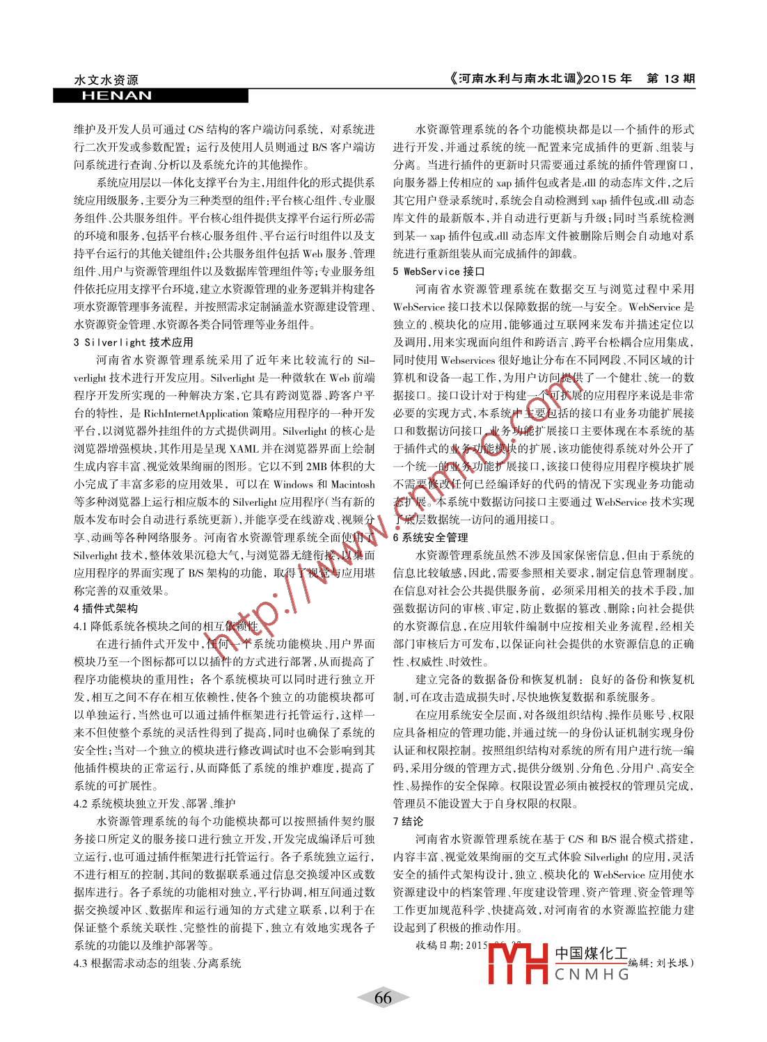 《河南水利與南水北調(diào)》2015年第13期水文水資源HENAN河南省水資源建設(shè)管理系統(tǒng)研究口姚廣華(許昌水文水資源勘測局)摘要:目前河南省水資源監(jiān)控能力建設(shè)正在如火如茶,水資源建設(shè)管理系統(tǒng)的開發(fā)應(yīng)用正恰逢其時。該管理系統(tǒng)通過采用較為領(lǐng)先的架構(gòu)模式、新興的技術(shù)應(yīng)用、安全可靠的接口技術(shù)對水資源建設(shè)過程產(chǎn)生的檔案管理、年度建設(shè)管理、資產(chǎn)管理、資金管理、人員管理、權(quán)限管理進(jìn)行分門別類、科學(xué)規(guī)范的管理,為河南省的水資源監(jiān)控能力建設(shè)工作帶來極大的便利。關(guān)鍵詞:混合模式;Silverlight技術(shù)應(yīng)用;插件式架構(gòu); WebService接口;系統(tǒng)安全管理中圖分類號:TV213文獻(xiàn)標(biāo)識碼:B文章編號: 1673-8853(2015)13-0065-021系統(tǒng)功能概述辦公設(shè)備,通過資產(chǎn)管理平臺,實現(xiàn)全面的.系統(tǒng)的掌握資產(chǎn)的1.1檔案管理模塊采購.變更管理、維護(hù)保養(yǎng)運(yùn)行狀態(tài)、以及各資產(chǎn)的維護(hù)人員與-是建設(shè)項目與監(jiān)理項目中的招、投標(biāo)文件,評標(biāo)文件,中 責(zé)任人等信息。標(biāo)通知,合同協(xié)議,驗收等紙質(zhì)照片、音頻影像等按年度、類型1.4 資金管理模塊存檔查詢與管理。二是建設(shè)項目驗收過程中的年度檢驗、自驗一是國家資金管理,按照國家下?lián)苜Y金的批次、建設(shè)的項和終驗中:建管方設(shè)計方、集成方、監(jiān)理方等各類型報告及附件目、使用計劃進(jìn)行管理;二是省配套資金管理,按照省配套資金備案的管理。三是公文管理:水利部文件水利廳文件財政廳下 撥的批次、建設(shè)的項目、使用計劃進(jìn)行管理;按年份建設(shè)總經(jīng)文件、項目辦文件及簡報分類型分年份管理,商業(yè)軟件數(shù)據(jù)庫、費(fèi)管 理,按照每年的建設(shè)資金總量,分批次、分類型(國家資金、操作系統(tǒng)、硬件等采購的各類協(xié)議合同分類分年份管理。省配套資金)、分項目(利用資金建設(shè)的項目)進(jìn)行管理。1.2年度建設(shè)管理模塊2混合模式架構(gòu)按年份分標(biāo)段對各類型公司(軟件公司勘測設(shè)計公司、建河南省水資源管理系統(tǒng)軟件采用C/S和B/S混合模式搭設(shè)公司、監(jiān)理公司等)中標(biāo)情況分類管理。如中標(biāo)的項目、監(jiān)測建, 主要以B/S模式為主。在組織架構(gòu)上采用三層模式進(jìn)行設(shè)點、應(yīng)用軟件、服務(wù)器等進(jìn)行備案管理,以便查詢與統(tǒng)計。計:數(shù)據(jù)訪問層、業(yè)務(wù)邏輯層、應(yīng)用層。1.3資產(chǎn)管理在系統(tǒng)控制層針對不同的用戶群,采用了C/S 和B/S混合按照資產(chǎn)類別把資產(chǎn)分為取用水戶水功能區(qū)、硬件、軟件、模式, 以滿足不同業(yè)務(wù)人員對系統(tǒng)的功能需求。在操作過程中,心公公公公公公公公公公公公公公公公公公公公公公公公:起點距記數(shù)器發(fā)生故障,在不具備直接讀距的情況下,可以它所 表現(xiàn)出的信號傳輸效果也是不同的,因此在處理信號傳輸臨時采用經(jīng)緯儀定位法和水準(zhǔn)儀測距法,如果有全站儀的情況問題時 ,要根據(jù)不同的特性做出相應(yīng)的處理。文章所介紹的信號下,使用全站儀更為方便,可以做為首選應(yīng)急補(bǔ)救措施。源是一-種普遍使用的綜合信號源其外部共有7個接線頭,其連3.3水深記數(shù)故障的應(yīng)急措施接在鉛魚尾部,由于其經(jīng)常在水下工作,長時間使用,接線頭容河底信號故障,導(dǎo)致水深無法及時施測,這個時候可以利用易損壞導(dǎo)致接觸不牢,因此,每次使用后要用布擦干,長時間不.當(dāng)時觀測的水位,查出與起點距相對應(yīng)的河底高程來計算出水使用時要 卸下來放回室內(nèi),使用一- 段時間后,要注意檢查綜合信深,水深較小時還可以在鉛魚和起重索結(jié)合部固定水尺板直接號 源的橡膠密封圈,如果損壞或密封效果不好要及時更換,以免讀取水深。測點水深的應(yīng)急辦法,可以參照固定水尺板直接讀取綜合信 號源內(nèi)滲水造成極板損壞。水深的方法直接讀取流速儀入水的相對水深,必要時可以加改經(jīng)過多年的探索和改進(jìn)后,新型的全自動水文纜道測流系正數(shù),確保流速儀準(zhǔn)確定位。如遇較大洪水,流速儀定位困難的統(tǒng)的信 號傳輸與以往相比,信號傳輸性能有了很大提高,抗干擾情況可以考慮施測水面流速。能力和靈敏度都有所改進(jìn),避免了以往信號傳輸過程中的相互4結(jié)語.干擾現(xiàn)象。中國煤化工有關(guān)信號傳輸?shù)膯栴},由于各種水文纜道具有不同的特性,收稿日期: 2015YHCNMH G編輯:劉長垠)65水文水資源《河南水利與南水北調(diào)》2015年第13期HENAN維護(hù)及開發(fā)人員可通過CIS結(jié)構(gòu)的客戶端訪問系統(tǒng),對系統(tǒng)進(jìn)水資源管理系統(tǒng)的各個功能模塊都是以一個插件的形式行二次開發(fā)或參數(shù)配置;運(yùn)行及使用人員則通過B/S客戶端訪進(jìn)行開發(fā) ,并通過系統(tǒng)的統(tǒng)- -配 置來完成插件的更新、組裝與問系統(tǒng)進(jìn)行查詢、分析以及系統(tǒng)允許的其他操作。分離。當(dāng)進(jìn)行插件的更新時只需要通過系