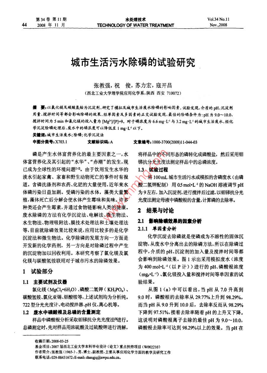 城市生活污水除磷的試驗(yàn)研究