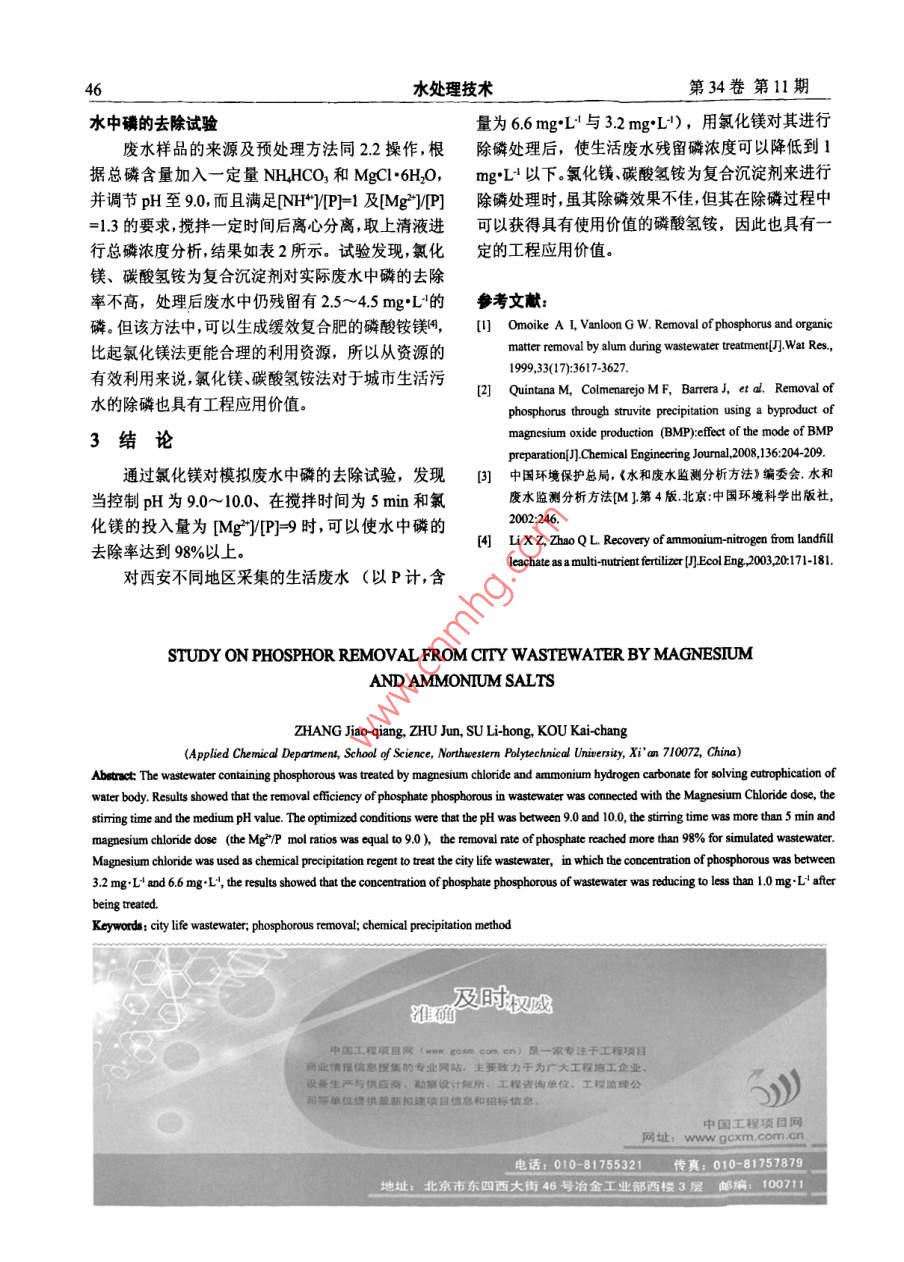 4第34卷第11期水處理技術(shù)VoL34 No 11009年11月TECHNOLOGY OF WATER TREATMENTNov,2008城市生活污水除磷的試驗(yàn)研究張教強(qiáng),???蘇力宏,寇開(kāi)昌(西北工業(yè)大學(xué)理學(xué)院應(yīng)用化學(xué)系,陜西西安710072)要:以氯化鎂及碳酸氬銨為沉淀劑,研究了模擬及城市生活慶水除磷的影響因素.試驗(yàn)發(fā)現(xiàn),介質(zhì)的pH、況淀劑用量攪拌時(shí)間等都會(huì)影響除磷的效果經(jīng)單因素及多因素的正交試驗(yàn)發(fā)現(xiàn),最佳的除磷條件為:pH為9.0~100攪拌時(shí)間為5mim和氯化鎂的投入量為[MgP-9.對(duì)于磷濃度為66mg“L4與32mg:L4的城市生活廢水,經(jīng)化學(xué)沉淀除磷處理后,廢水中的磷濃度可以降低至1mg·L以下關(guān)鍵詞:城市生活廢水;除磷;化學(xué)沉淀法中圖分類(lèi)號(hào):X7031文獻(xiàn)標(biāo)識(shí)碼:A文章編號(hào):100037002008)1040磷是產(chǎn)生水體富營(yíng)養(yǎng)化的最主要因素之一,水將樣品中的不同形態(tài)的磷轉(zhuǎn)化成磷酸鹽,然后采用鉬體富營(yíng)養(yǎng)化及其引起的“水華”、“赤潮”的發(fā)生,現(xiàn)銻抗分光光度法測(cè)定樣品中的總磷濃度。已成為全球性的環(huán)境問(wèn)題。由于飲用發(fā)生水華的1.3試驗(yàn)過(guò)程淡水引起家禽、家畜和野生動(dòng)物死亡的事件時(shí)有報(bào)將100mL城市生活污水或模擬的含磷廢水(由磷道。含磷洗滌劑和農(nóng)藥、化肥的大量使用,近年來(lái)水酸二氫鉀配制)用05molL!的NaOH溶液調(diào)節(jié)pH體磷污染日益加劇。受磷污染的水體,藻類(lèi)大量繁為9左右,加入沉淀劑進(jìn)行攪拌后過(guò)濾以鉬銻抗分光殖,藻體死亡后分解會(huì)使水體產(chǎn)生霉味和臭味。許多光度法測(cè)定母液中磷酸根的含量,計(jì)算磷的去除率。種類(lèi)還會(huì)產(chǎn)生霉素,并通過(guò)食物鏈影響人類(lèi)的健康。2結(jié)果與討論廢水除磷的方法有化學(xué)沉淀法、電解法、微生物法水生物法物理吸附法膜技術(shù)處理法和土壤處理法21影響除磷效果的因囊分析等目前就除磷效果比較來(lái)說(shuō),應(yīng)用比較多的是化學(xué)2.1單因素分析沉淀法和微生物法?;瘜W(xué)除磷的發(fā)展方向一方面是化學(xué)沉淀去除磷就是使磷成為不溶性的固體沉開(kāi)發(fā)新的化學(xué)藥劑,另一方向是對(duì)除磷過(guò)程中產(chǎn)生淀物從廢水中分離出去的除磷方法所以在除磷過(guò)的沉淀物加以回收利用。本研究考察了氯化鎂及氯程中,介質(zhì)的pH、沉淀劑的加入量及攪拌時(shí)間等都化鎂與碳酸氫銨聯(lián)用對(duì)于城市污水的除磷效果。會(huì)影響到除磷效果。圖1示出采用模擬廢水(濃度1試驗(yàn)部分為400molL4(以P計(jì)))進(jìn)行的pH、磷酸根濃度(mgL)、氯化鎂投入量和攪拌時(shí)間等單因素的試11主要試劑及儀最驗(yàn)結(jié)果。氯化鎂(MgCl"6H1O)磷酸二氫鉀(KHPO4)、從圖1(a)中可以看出,當(dāng)p從70升高到碳酸氫銨氯化亞錫、鉬酸銨等,上述試劑均為分析純。9.0時(shí),磷酸根的去除率從2977%上升到9829%722型分光光度計(jì)、電動(dòng)攪拌器pH儀、離心機(jī)等而當(dāng)pH從90升到100后,去除率反而從98.2912廢水中碘酸根及總確的含量測(cè)定下降到9751%,接著去除率隨著pH的上升又下降。樣品中磷酸根分析采取鉬銻抗分光光度法畊進(jìn)行。這說(shuō)明對(duì)磷酸根離子去除的最佳pH為90~10.0,總磷測(cè)定時(shí)先對(duì)樣品用濃硫酸及過(guò)硫酸鉀進(jìn)行消解,磷酸根去除率可達(dá)到9829%以上的效果。當(dāng)pH在收稿日期:20080325基金項(xiàng)目:2007屆西北工業(yè)大學(xué)本科畢業(yè)設(shè)計(jì)(論文)重點(diǎn)扶持項(xiàng)目(W002210)作者簡(jiǎn)介:張教強(qiáng)(1965-),男博士副教授,主要從事應(yīng)用化學(xué)方面的教學(xué)及研究工作聯(lián)系電話:02988431672;E-mail:zhangji@anpu.edu.cn張教強(qiáng)等城市生活污水除磷的試驗(yàn)研究而且上升的幅度越來(lái)越小,所以取MgP]=9。從圖1(c)可以看出,磷的去除率是隨攪拌時(shí)間的加長(zhǎng)而增加的,當(dāng)攪拌時(shí)間為1min的時(shí)候,去除率為9456%,而當(dāng)攪拌時(shí)間上升到5min的時(shí)候,磷酸根離子去除率已經(jīng)增加到9827%,當(dāng)攪拌時(shí)間繼續(xù)增加的時(shí)候,去除率雖然繼續(xù)有上升趨勢(shì),但上升的幅度已經(jīng)不大了PH根據(jù)以上的單因素試驗(yàn)結(jié)果,發(fā)現(xiàn)除磷的最佳圖1(a)pH對(duì)磷酸根離子去除率的影響試驗(yàn)條件為:介質(zhì)的pH為9~10,氯化鎂的使用量為MgJP]大于或等于9,攪拌時(shí)間為5min,磷的去除率可以達(dá)到98%以上。212三因素的正交試驗(yàn)分析表1為21中三個(gè)單因素的正交試驗(yàn)結(jié)果pH的水平分別為7、91lMg2y(P]的水平分別為3、69,攪拌時(shí)間的水平分別為1、5、10min[Mg”]nP1三因囊的正交被驗(yàn)數(shù)據(jù)圖1(b)氯化鎂用量對(duì)磷去除率的影響Table 1 Three factors orthogonal experimental data項(xiàng)目MgMPIB)攪拌時(shí)間()7187164031979528954222241.84182.83最優(yōu)從三因素的正交試驗(yàn)所得的極差R可以看出,pH對(duì)處理效果的影響最大(R=21767),其次是氯攪拌時(shí)間/min圖1(c)攪拌時(shí)間對(duì)磷去除率的影響化鎂的投入量(R=6000,最后是攪拌時(shí)間(R=圖1介質(zhì)敲堿度及沉淀劑用量等對(duì)除效果的影響3964)ig.I Effect of pH and precipitator do