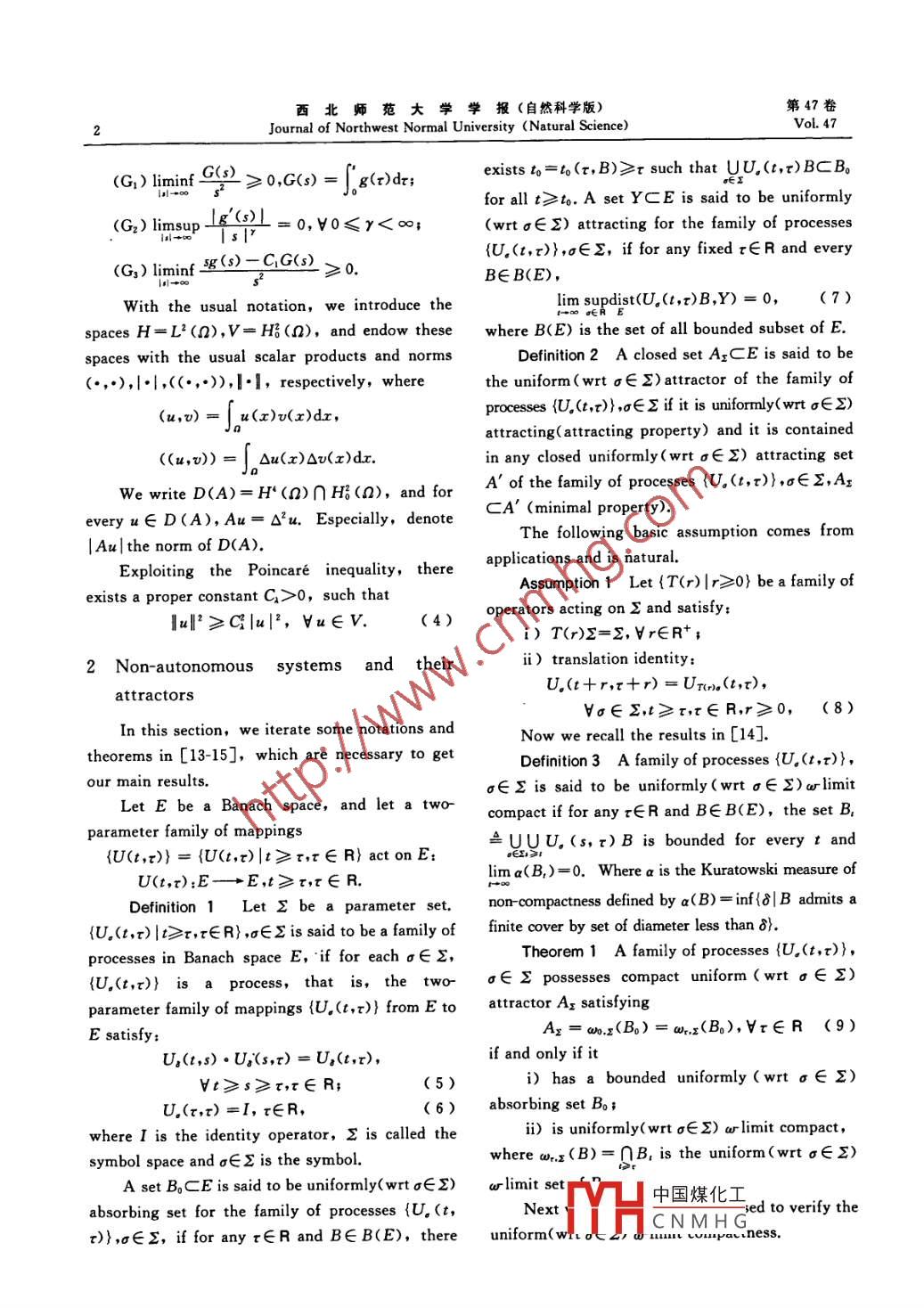 第47卷2011年第6期西北師范大學(xué)學(xué)報(自然科學(xué)版)Vol.472011No.6Journal of Northwest Normal University (Natural Science)吊橋方程的動力學(xué)性態(tài)馬巧珍,李志宇,汪璇(西北師范大學(xué)數(shù)學(xué)與信息科學(xué)學(xué)院,甘肅蘭州730070)摘要:研究弱阻尼非自治吊橋方程解的衰退估計,證明了讓方程在強(qiáng)拓?fù)淇臻g中存在一致吸引子關(guān)鍵詞:吊橋方程;一致嗄引子;一致條件(C);袁退估計中圖分類號:O175文獻(xiàn)標(biāo)識碼:A文章編號:1001-988X(2011)06-0001-07Dynamics of suspension bridge equationsMa Qiao-zhen, LI Zhi-yu, WANG Xuan(College of Mathematics and Information Science, Northwest Normal University, Lanzhou 730070, Gansu, China)Abstract: The decay estimates for the weakly damped nonautonomous suspension bridge equations areinvestigated in this paper, and then the existence of the uniform attractors in a stronger Hilbert space is proved.Key words: suspension bridge equation; uniform attractor; uniform condition(C); decay estimate1 Introductionbehavior of solution of 1 ) In [7 ],theexistence of global attractors in H(n)XL(n)forLet n be an open bounded subset of R2 with the autonomous suspension bridge equations, thatsufficiently smooth boundary r:. We study the is, h(r, t)=h(r) in(1), was investigated.following initial-boundary value problemConsequently, we achieved existence of stronguetAutaurtku+gu)=h(x,t),solutions and strong global attractors for the single(x,t)∈×R(1) suspension bridge equations and the coupled one=Va=0,x∈r,(2) respectively, in line with thermr=u,(r),a uImr = P, (x),rE R, (3) (C) introduced in [8, 9] and combining withwhere u(t, t)is an unknown function which techniques of the energy estimates(see [10, 11])represents the deflection of the road bed in the In this paper, we are going to focus on existencevertical plane, k>0 denotes a spring constant and of the uniform compact attractors of(1)-(38 is a positive constant.For a good survey of the literatures dedicated toThe suspension bridge equations were existence of attractors for the dynamical systemspresented by Lazer and McKenna as a new problem we would like to mention some monographs andin fields of the nonlinear analysis in[ 1 ] For works, such as [8-15] and so on(1), there were many literatures to studyFor the nonlinear function gE C(R, R)weexistence of solutions, see [1-6] and references presume the following general conditions: Theretherein. While we first studied the longtime exists a constant C>0 such that收稿日期:2011-03-18;修改稿收到日期:201109-15基金項目:國家自然科學(xué)基金資助項目(11101334);甘肅省自然科學(xué)基金資助項目(1107RJA223);甘肅省高?;究蒲袠I(yè)務(wù)費(fèi)項目中國煤化工作者簡介:馬巧珍(1972-),女,甘肅秦安人,教授,博士.主要研究方向為E-mail:maqzh@nwnu.edu.cnCNMH函統(tǒng)西北師范大學(xué)學(xué)報(自然科學(xué)版)第47卷Journal of Northwest Normal University (Natural ScienceVol 47exists to=to(r, B)>r such that UU,(t,t)BCBmify≥0G()=gx)dfor all t>to. a set Y Ce is said to be uniformly(G2) limsup4=0,v0≤y<∞;(wrt ges)attracting for the family of processesl→∞(G, )liminf _g(s)-C1G(s)U(t,r)},a∈Σ, if for any fixed t∈ R and every≥0B∈B(E),With the usual notation, we introduce thelim supdist(U, (t,T)B,Y)=0(7)spaces H=L'(n), V=H(n), and endow these where B(E)is the set of all bounded subset of E.spaces with the usual scalar products and normsDefinition 2 A closed set A=CE is said to be(…,),|,((…,),l1, respectively, wherethe uniform(wrt gE2)attractor of the family of(u, v)= u(r)v(r)dr,processes(L(,r)},o∈ E if it is uniformly(wrt∝∈E)attracting( attracting property)and it is contained(a,v)=△a(x)△v(x)dxin any closed uniformly (wrt oE2)attracting setWe write D(A)=H(n)n:(n), and forA' of the family of processes ( U(t,r)},d∈Σ,AxCA(minimal propertyevery u∈D(A),Aa=Δ2u. Especially, denoteI Au] the norm of D(A).The following basic assumption comes fromExploiting the Poincare inequality, thereapplications and is natural.exists a proper constant Ci>0, such thatAssumption 1 Let (T(r)Ir>o) be a family ofl|2≥clu|2,va∈V(4) operators acting on,?i)T(r)Σ=∑,r∈R;2 Non-autonomous systems and theirii)translation identity:U (t +r,+r)= Ur,(t,),attractorsd∈Σ,t≥r,r∈R,r≥0,(8)n this section we iterate some notations andNow we recall the results in [14]theorems in [13-15], which are necessary to getDefinition3 A family of processes (U, (t, t)our main results.∈Σ is said to be uniformly(wrta∈z) or limitLet e be a Banach space, and let a two compact if for any tER and BEB(E)the set Bparameter family of mappingsAUUU,(s, t)B is bounded for every t and{U(t,r)}={U(t,r)|t≥r,r∈R} act on EU(t,r):E→E,t≥r,r∈Rlim a(B, )=0. Where a is the Kuratowski measureDefinition 1 Let 2 be a parameter set. noncompactness defined by a(B)=inf (8 B admits a(U,(t,t)lt>r,tER), 0Ee is said to be a family of finite cover by set of diameter less than 8)processes in Banach space E, if for each g∈ΣTheorem 1 A family of processes (U, (t,t)U(t,r)} Is a process., that is, the twoσ∈Σ possesses compact uniform(wrta∈Σ)parameter family of mappings ( U, (t, r)) from E to attractor Ax satisfyingE satisfyAx=wx(Bo)=wr.(B),VTER (9)U2(t,s)·U(s,)=U(t,r),if and only if ityt≥s≥r,r∈Rbounded uniformly wrt oE 2U(r,r)=I,r∈R,6) absorbing set Boiwhere I is the identity operator, 2 is called the) is uniformly(wrta∈Σ) ar limit compact,symbol space and aE$ is the symbol.where a(B)=∩B, is the uniform(wrto∈E)a set B, Ce is said to be uniformly( wrt oEE) wr limit set中國煤化工absorbing set for the family of processes tU,(tNexted to verify theCNMHGr)},G∈∑, if for any t∈ R and B∈B(E), there uniform(wtVastness2011年第6期馬巧珍等:吊橋方程的動力學(xué)性態(tài)2011No.6Dynamics of suspension bridge equationsDefinition 4 A
