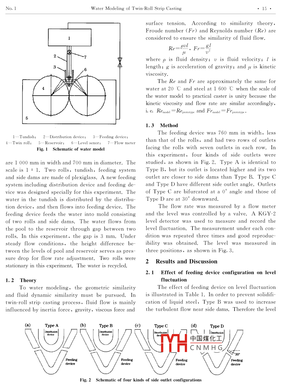 Available online at www.sciencedirect.comBCIENCE@.)DIn.CT.JOURNAL OF IRON AND STEEL RESEARCH, INTERNATIONAL. 2006, 13(1): 14-17Water Modeling of Twin-Roll Strip CastingWANG Bo'.2,ZHANG Jie-yu',F(xiàn)AN Jun-feit,ZHAO Shun-li2,F(xiàn)ANG Yuan' ,AN Shenglil2(1. School of Metallurgical and Ecological Engineering, University of Science and Technology Beiing, Beijing 100083, China;2. Material and Metallurgical School, Inner Mongolia University of Science and Technology, Baotou 014010, InnerMongolia,China; 3. College of Materials Science and Engineering, Shanghai University, Shanghai 20002,China;4. Research Institute, Baoshan Iron and Steel Co Ltd, Shanghai 201900, China)Abstract: Twin roll strip casting is regarded as a prospective technology of near net shape continuous casting. Thefluid flow field and level fluctuation in the pool have a strong influence not only on composition and temperaturehomogeneity of pool, but also on the strip quality. A1 : 1 water model of a twin- roll strip caster was set up basedon the criteria of Froude number and Reynold number similarity. The level fluctuation was measured. The influ-ence of pool depth, casting speed and feeding system configuration on level fluctuation in the pool was studied.The experimental results provided a basis for the optimization of feeding system and process parameters.Key words: twin roll strip casting ; level fluctuation; water modelingTwin- roll strip casting is regarded as a prospec-field pattern influences the solidification negatively.tive technology of near net shape continuous cast-The flow field pattern is affected by the geometry ofing. The thickness of strip produced is approximate-feeding system as well, and the heat transfer in thely 1-6 mm. Although thin strip casting has advan-mold formed by two roll surfaces is affected by thetages of low energy consumption,low investmentflow field pattern.and reduced emission, it has some problems OThe flow field study of twin- roll caster was con-smooth operation and product qualityt1.ducted with a water model to optimize feeding sys-During strip casting, the flow field pattern and lev-tem.' The effects of casting conditions and geometryel fluctuation in the pool affect the strip quality-2- 4.of feeding system on movement and distribution oWhen the level fluctuation exceeds土(1.6- 2) mm, thefluid in the pool were investigated. A water modellongitudinal cracking will be observed. On the con-of 1 : 1 was built based on a twin- roll strip caster attrary,if the meniscus is too calm, the turbulenceBaosteel. The level fluctuation was measured with awould be strengthened in lower part of the pool andlevel senor. The effect of roll rotation on the levelthe surface layer would solidify. Besides, the con-fluctuation was ignored. This resulted in the differ-figuration of feeding system, casting speed and poolence of boundary conditions and flow field compareddepth also affect flow field. So it is very difficult to .with practical process. Since only the effect of nozzlecontrol flow field in the pool.configuration on level fluctuation was considered ,At present, the key factors influencing the stripthe experimental results may provide a basis for thequality are dam edge, feeding system and character-optimihe. feedino. eretem.istics of rolls. The configuration of the feeding1v中國煤化工system is of decisive importance to flow field in theMYHCNMHG.pool. The molten steel must be supplied homogene-1.1 Experimental set-upously over the pool width, because asymmetric flowThe water model is depicted in Fig. 1. Two rollsFoundation Item: Item Sponsored by Provincial Natural Science Foundation of Inner Mongolia of China (200408020715)Biography : WANG Bo( 1974-),Male, Doctor Candidate, Lectureship; E-mail: wangbo197 4@ 263. net;Revised Date :December 2, 2004No. 1W ater Modeling of Twin Roll Strip Castingsurface tension. According to similarity theory,Froude number (Fr) and Reynolds number (Re) areconsidered to ensure the similarity of fluid flow.Re=ul, Fr=glV2-來where p is fluid density; v is fluid velocity; l is .43length; g is acceleration of gravity; and μ is kineticviscosity.The Re and Fr are approximately the same forwater at 20 C and steel at 1 600 C when the scale ofthe water model to practical caster is unity because thekinetic viscosity and flow rate are similar accordingly,i.e Remodel = Rerotype and Frmodel = Frpotrype.1.3 MethodThe feeding device was 760 mm in width,less4- Twin roll; 5- Reservoir; 6- Level senor; 7一 Flow meterthan that of the rolls, and had two rows of outletsFig. 1 Schematic of water modelfacing the rolls with seven outlets in each row. Irthis experiment, four kinds of side outlets wereare 1 000 mm in width and 700 mm in diameter. Thstudied, as shown in Fig. 2. Type A is identical toscale is 1 : 1. Two rolls, tundish, feeding systemType B,but its outlet is located higher and its twoand side dams are made of plexiglass. A new feedingoutlet are closer to side dams than Type B. Type Csystem including distribution device and feeding de-and Type D have different side outlet angle. Outletsvice was designed specially for this experiment. Theof Type C are bifurcated at a 0° angle and those ofwater in the tundish is distributed by the distribu-Type D are at 30° downward.tion device, and then flows into feeding device. TheThe flow rate was measured by a flow meterfeeding device feeds the water into mold consistingand the level was controlled by a valve. A KGY-2of two rolls and side dams. The water flows fromlevel detector was used to measure and record thethe pool to the reservoir through gap between twolevel fluctuation. The measurement under each con-rolls. In this experiment, the gap is 3 mm. Underdition was repeated three times and good reproduc-steady flow conditions, the height difference be-ibility was obtained. The level was measured intween the levels of pool and reservoir serves as pres-three positions, as shown in Fig. 3.sure drop for flow rate adjustment. Two r