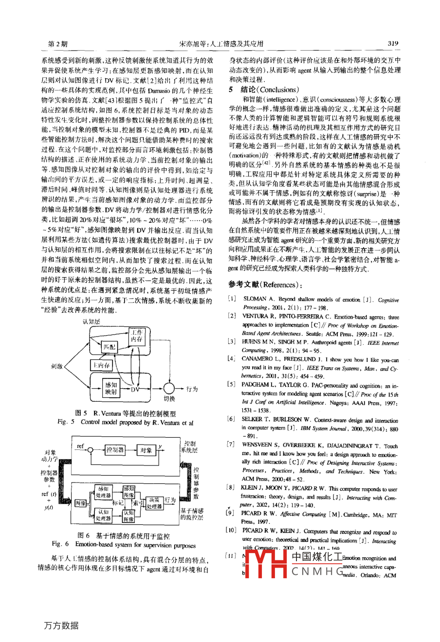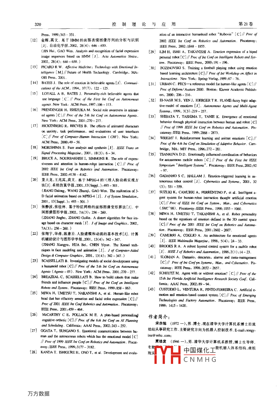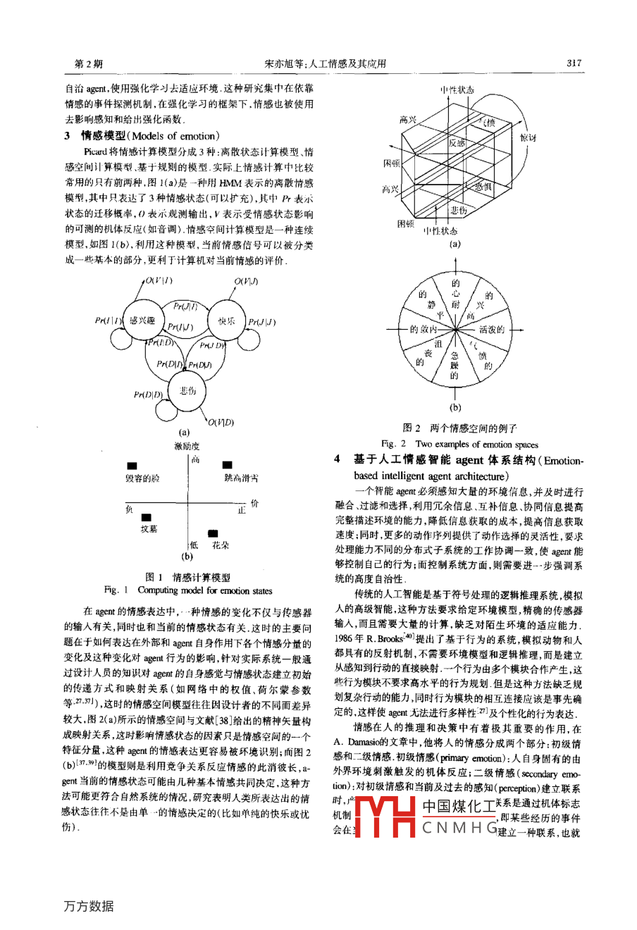 第21卷第2期控制理論與應(yīng)用Vol 21 No. 22004年4月Control Theory ApplicationsApr. 2004文章編號(hào):1000-8152(2004)02-0315-06人工情感及其應(yīng)用宋亦旭,賈培發(fā)(清華大學(xué)計(jì)算機(jī)系智能技術(shù)與系統(tǒng)國(guó)家重點(diǎn)實(shí)驗(yàn)室,北京10084)摘要:白然系統(tǒng)中,情感影響人的行為日前,人1情感在擬人agem的研究得到了越來(lái)越多的重視為此本文從工程角度綜述了人工情感研究的基問(wèn)題簡(jiǎn)要介紹了幾類情感模型,并著重討論了基于人L情感的 agent體系結(jié)構(gòu)的典型應(yīng)用人工情感的研究不僅休現(xiàn)在情感辨識(shí)情感表達(dá)等入機(jī)交互方面,同時(shí)情感的作用機(jī)理也影響到智能egcm的挖制體系結(jié)構(gòu)和算法設(shè)計(jì)某于人工情感的體系結(jié)構(gòu)具有混合分層的特點(diǎn),強(qiáng)調(diào)情感和其他過(guò)程的聯(lián)系以增強(qiáng)gent在與動(dòng)態(tài)環(huán)境交互屮的白適應(yīng)能力.在這個(gè)結(jié)構(gòu)中人工情感的核心作用主要體現(xiàn)在兩個(gè)方面:首先,人工情感是聯(lián)系 agent的內(nèi)部狀態(tài)和外部環(huán)境的基礎(chǔ),情感狀態(tài)影響到aem信息處理的整個(gè)過(guò)程,包括緊急情況下的快速響應(yīng)和規(guī)劃任務(wù)時(shí)的復(fù)雜推理其次,人工情感作為內(nèi)部驅(qū)動(dòng)機(jī)制對(duì)學(xué)習(xí)過(guò)程十分重要,人工情感作為強(qiáng)化刺激促使aent刨建更復(fù)雜的行為功能在設(shè)計(jì)屮引人人工情感,對(duì) agent實(shí)現(xiàn)智能化和個(gè)性化至關(guān)重要關(guān)鍵詞: agent;人工情感;體系結(jié)構(gòu)中圖分類號(hào):TP8文獻(xiàn)標(biāo)識(shí)碼:AArtificial emotion and its applicationsSONG YI-Xu, JIA Pei-fa( State Key Lab of Intelligent Technology and System, Department of Computer Science and TechnologyTsinghua Univcrsity, Beijing 100084, ChinaAbstract: The natural emotion plays a significant role in human behavior. Current research in Al shows an increasing in-terest in artificial emotion for developing the human-like agent. In this paper a survey of basic issues of artificial emotion fromthe engineering point of view is given, bricfly introducing several emotion models with emphasis on typical implementations ofartificial emotion-based agent architecture. Research on artificial emotion is reflected in the human-computer interaction(HCT)ch as emotion identification and emotion expression, the action mechanism of emotion also influences the control architectureand algorithm design of the intelligent agent. The emotion-based architecture being hybrid-layered emphasizes the links betweenemotion and other processes to enhance adaptive capability of agents in a dynamic environment. In the architecture the centralrole of artificial emotion is incarnated mainly in two aspects: First, the artificial emotion is the basis of connecting intemal statusof an agent with its extemal situation, and emotion affects the whole process of information processing, including both the quicksponse in an emergency and the complicated reasoning for planning a task; Second, the artificial emotion as an endogenouscreate more complex behavioral functionsEmbedding artificial emotion in the architecture is essential for agents to be more intelligent and personalizeKey words: agent; artificial emotion; architecture1引言( Introduction)的新發(fā)現(xiàn)支持了情感對(duì)人的智能活動(dòng)有著至關(guān)重要的影響對(duì)情感( emotion)的研究并不是很新的話題,早在1%67年的論斷A. Damasio的著名實(shí)驗(yàn)對(duì)此給出了比較充分的理論Simm就開(kāi)始了對(duì)人類認(rèn)知中有關(guān)情感的研究,Sm則從證據(jù)按照 Damasio的實(shí)驗(yàn)負(fù)責(zé)處理情感的神經(jīng)子系統(tǒng)出20世紀(jì)80年代初開(kāi)始擬人aen( human-like agent)建模方面的現(xiàn)問(wèn)題的病人,推理和決策能力也會(huì)受到很大的影響例如,研究,但早期的人工智能研究中對(duì)引入情感問(wèn)題存在爭(zhēng)論,這種病人甚至不能很好地處理和醫(yī)生進(jìn)行預(yù)約的計(jì)劃2有些學(xué)者認(rèn)為情感并不是必須的或者是只會(huì)干擾推理的Damasio的理論在A( artificial intelligence)領(lǐng)域的影響丿泛而以情感在傳統(tǒng)的人工智能研究中并沒(méi)有得到足夠的重視深刻從應(yīng)用角度,人們對(duì) agent(或 agent的硬件表達(dá)—機(jī)但是隨著科技的不斷發(fā)展,悄感研究逐漸變得重要起器人)擬人化的研究逐漸興起3,這種研究不僅需要更好的來(lái),這主要米自兩個(gè)方面的支持:從理論角度,神經(jīng)生物科學(xué)系統(tǒng)體系結(jié)構(gòu)支持 agent.或機(jī)器人具有更強(qiáng)的環(huán)境適應(yīng)性收稿日期:2002-12-24;收修改稿日期:203-09-04中國(guó)煤化工CNMHG控制理論與應(yīng)用第21卷同時(shí)要求其具有個(gè)性化的與人交流的能力② Agent的情感表達(dá)于此,近年來(lái)有關(guān)人工情感( artificial emotion)的研究栩栩如生”一直是小說(shuō)、戲劇、電影等藝術(shù)手段追求的不斷受到更多學(xué)者的重視,相關(guān)的文章、會(huì)議、雜志、網(wǎng)站逐效果,而在人工情感的研究中則提出 r believable agent14漸增多,人工情感研究的層面也逐漸豐富,并月在應(yīng)用上取及 Animated agent4,等,研究 agent如何更形象化地表達(dá)內(nèi)得了一系列的成果將情感納入人類精神活動(dòng)的框架,將情部情感狀態(tài),進(jìn)行“栩栩如生”