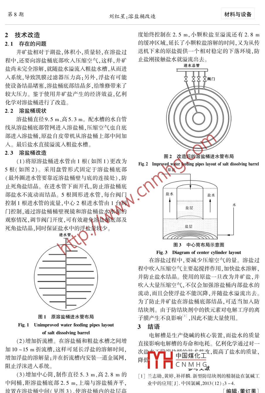 第51卷第8期氯堿工業(yè)Vol. 51 No015年8月Chlor- Alkali IndustryAug.,2015【材料與設(shè)備】溶鹽桶改造劉紅星(內(nèi)蒙古億利化學(xué)工業(yè)有限公司,內(nèi)蒙古鄂爾多斯014300)[關(guān)鍵詞]溶鹽桶;井礦鹽;一次鹽水;改造摘要]采用井礦鹽制燒堿可降低生產(chǎn)成本,為滿足使用井礦鹽的要求,對(duì)一次鹽水裝置的溶鹽桶進(jìn)行了技術(shù)改造:進(jìn)水管采用5根,增加折流槽和中心筒。[中圖分類號(hào)]TQ14.15[文獻(xiàn)標(biāo)志碼]B[文章編號(hào)]1008-133X(2015)08-0044-02Reform of salt dissolving barrelsLIU HongxinInner Mongolia Elion Chemical Industry Co, Ltd, Erdos 014300, ChinaKey words: salt dissolving barrel; mineral salt; primary brine; transformationAbstract: The production cost of caustic soda can be reduced by using mineral salt as raw materialTransformations were carried out on the salt dissolving barrel adopted in primary brine devices, includininstalling 5 water feeding pipes, adding a baffle tank and a center cylinder, in order to meet the require-ments of using mineral salt內(nèi)蒙古億利化學(xué)工業(yè)有限公司(以下簡(jiǎn)稱“億礦鹽的要求,因此對(duì)溶鹽桶進(jìn)行了改造利化學(xué)”)是擁有50萬(wàn) t/a pvc、36萬(wàn)Ua離子膜法1使用井礦鹽的優(yōu)勢(shì)燒堿的氯堿企業(yè)。為降低生產(chǎn)成本,億利化學(xué)加大井礦鹽與湖鹽的主要成分及價(jià)格見(jiàn)表1了井礦鹽的用量,而原溶鹽桶結(jié)構(gòu)無(wú)法滿足使用井表12013年5月使用的湖鹽與井礦鹽的組分及價(jià)格Table 1 Compositions and price of lake salt and well salt used in May 2013鹽類(NaC1)/%(Ca2+)/%m(Mg2)%m(S0)%m(水不溶物)/%價(jià)格(不含稅)/元井礦鹽98.290.0197.06由于Ca及Mg對(duì)電解槽影響較大,要盡量碳酸鈉價(jià)格按1300元/t,氫氧化鈉1950元/t除去鹽水中的Ca2及Mg。用Na2CO3除去Ca2,計(jì),生產(chǎn)1 t Naoh(折100%)所需費(fèi)用如下。生成CaCO3沉淀;用NaOH除去Mg2,生成井礦鹽:1.488×338+(3.55×1300+0.78×Mg(OH)2。生產(chǎn)1 t NaOh所需Na2CO3和NaOH的0.32×1950)÷1000=508.06元。量見(jiàn)表2。湖鹽:1.510×335+(5.6×1300+6.29×表2生產(chǎn)1 t NaOH所需Na2CO3和NaOH的量0.32×1950)÷1000=517.05元Table 2 Requirement of Naz CO即生產(chǎn)1t燒堿使用井礦鹽比湖鹽節(jié)約8.99and NaoH for production of one ton of NaOH元,36萬(wàn)ta燒堿裝置使用井礦鹽較湖鹽Ⅰ年可節(jié)鹽類原鹽用量/tNa2CO3/ kg NaOH/kg1.510中國(guó)煤化工井礦鹽HCNMHG*[作者簡(jiǎn)介]劉紅星(1984—),男,現(xiàn)任內(nèi)蒙古億利化學(xué)工業(yè)有限公司燒堿廠電解槽技術(shù)員。收稿日期]2014-07-27第8期劉紅星:溶鹽桶改造材料與設(shè)備2技術(shù)改造度始終控制在2.5m,小顆粒鹽至溢流還有2.8m2.1存在的問(wèn)題的緩沖區(qū)域,延長(zhǎng)了小顆粒鹽溶解的時(shí)間,又為從傳井礦鹽相對(duì)于湖鹽,體積小,質(zhì)量輕,在溶鹽過(guò)送機(jī)下來(lái)的原鹽提供一個(gè)相對(duì)穩(wěn)定的下落環(huán)境,防程中,還要向溶鹽桶底部吹入壓縮空氣,這樣,井礦鹽剛接觸鹽水就溢流出去鹽尚未完全溶解,就隨鹽水溢流入粗鹽水槽,從而進(jìn)進(jìn)水總管入系統(tǒng),導(dǎo)致凱膜過(guò)濾器壓力高;另外,浮鹽有可能區(qū)區(qū)區(qū)閥門使設(shè)備結(jié)晶堵塞,溶鹽桶底部結(jié)晶多,給維修帶來(lái)了較大壓力。鑒于使用井礦鹽產(chǎn)生的經(jīng)濟(jì)效益,億利化學(xué)對(duì)溶鹽桶進(jìn)行了改造。2.2溶鹽桶現(xiàn)狀溶鹽桶直徑9.5m、高5.3m。配水槽的水自管線從溶鹽桶底部管網(wǎng)進(jìn)入溶鹽桶,壓縮空氣也自底部進(jìn)入溶鹽桶,原鹽自皮帶機(jī)從溶鹽桶上部中間加人。最后鹽水直接溢流入粗鹽水槽。2.3溶鹽桶改造(1)將原溶鹽桶進(jìn)水管由1根(如圖1)更改為圖2改造后的溶鹽桶進(jìn)水管布局Fig 2 Improved water feeding pipes layout of salt dissolving barrel5根(如圖2)。采用盤管形式固定于溶鹽桶底部原鹽(最外圈進(jìn)水管要靠近溶鹽桶壁與底的連接處),防止死角鹽結(jié)晶。在進(jìn)水管下面開(kāi)孔,防止溶鹽桶底部鹽水不流動(dòng)而結(jié)晶。5根圓形進(jìn)水管,每臺(tái)閥門鹽水鹽水控制1根進(jìn)水管的流量,中心2根進(jìn)水管由1臺(tái)閥鹽層門控制,通過(guò)溶鹽桶桶壁視鏡和溶鹽桶鹽水水面的觀察情況,調(diào)節(jié)閥門開(kāi)度,可有效避免溶鹽桶底部及死角鹽結(jié)晶,同時(shí)保證鹽水中的浮鹽量較少。鹽層進(jìn)水管圖3中心筒布局示意圖Fig 3 Diagram of center cylinder layout在溶鹽過(guò)程中,要減少壓縮空氣的量。溶鹽過(guò)程中吹入壓縮空氣主要起攪拌作用,加快鹽水溶解并防止鹽水結(jié)晶。使用的原鹽一旦改為井礦鹽,并吹入大量壓縮空氣,不僅會(huì)加強(qiáng)溶鹽桶內(nèi)部鹽水的流動(dòng),而且會(huì)使浮鹽不能沉降,并隨鹽水溢流出去為了防止井礦鹽在溶鹽桶底部結(jié)晶,可適當(dāng)加入防結(jié)塊劑。由于防結(jié)塊劑中的鐵元素對(duì)電解工序的離圖1原溶鹽桶進(jìn)水管布局子膜產(chǎn)生不良影響,因此不能大量使用。Fig 1 Unimproved water feeding pipes layout3結(jié)語(yǔ)of salt dissolving barrel電解槽是生產(chǎn)燒堿的核心裝置,而鹽水的質(zhì)量(2)增加折流槽。在溶鹽桶和粗鹽水槽之間增直接影響電解槽的壽命和電耗。億利化學(xué)通過(guò)對(duì)加10-15m折流槽,這樣可延長(zhǎng)浮鹽的溶解時(shí)間,次鹽增加浮鹽的溶解量;并在折流槽內(nèi)安裝一道金屬