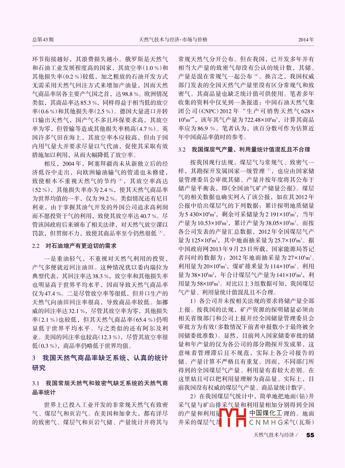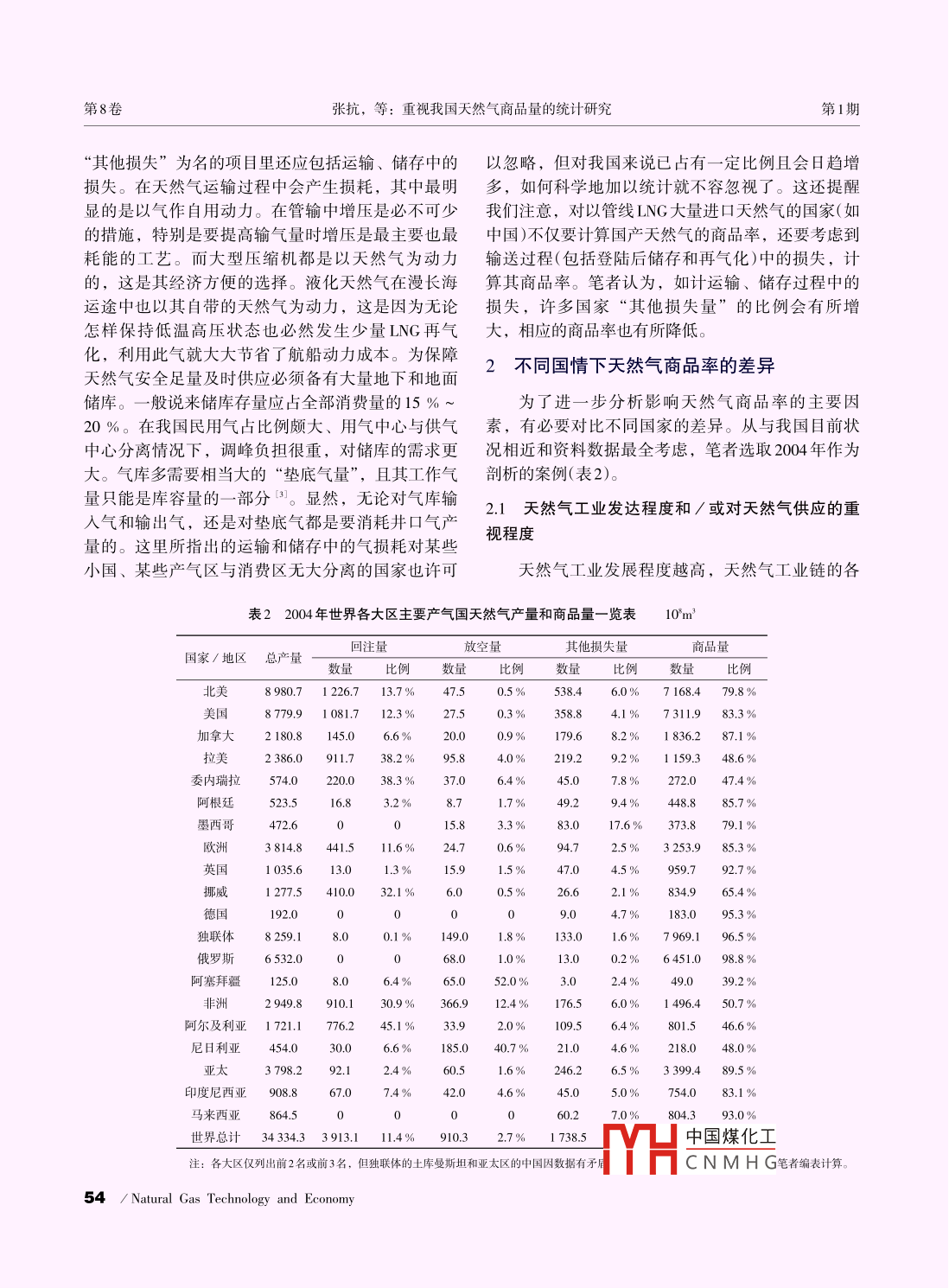 2014年天然氣技術(shù)與經(jīng)濟(jì)Vol 8, No. 1第8卷·第1期Natural Gas Technology and EconomyFeb.2014doi:10.3969/i.issn.2095-1132.2014.01.015重視我國(guó)天然氣商品量的統(tǒng)計(jì)研究張抗張玉銀(中國(guó)石化石油勘探開(kāi)發(fā)研究院,北京100083)摘要井口生產(chǎn)出的夭然氣部分被放空,部分為油氣田自用(如回注油田、稠油熱采和發(fā)電),部分在運(yùn)輸和儲(chǔ)存中自用和損耗,但大部分作為商品提供及下游用戶。世界天然氣的商品率在本世紀(jì)初約為80%,由于各國(guó)油氣工業(yè)發(fā)展程度不同,其商品率有很大差異。回注率低并注意天然氣節(jié)約,減少放空和損耗的國(guó)家,商品率可達(dá)9%以上,而回注率特高和/或不重視天然氣利用的國(guó)家,商品率則小于50%。我國(guó)對(duì)常規(guī)天然氣和致密氣缺乏系統(tǒng)的天然氣商品率統(tǒng)計(jì),對(duì)煤層氣產(chǎn)量和利用量的統(tǒng)計(jì)也不規(guī)范、不合理。為了更正確地反映市場(chǎng)的商品供應(yīng)量,需從上中游各基層單位做起,認(rèn)真統(tǒng)計(jì)其商品量。在獲得系統(tǒng)教據(jù)前,建議在對(duì)“十三五”規(guī)劃的研究中采用商品率9%以框算燃?xì)馍唐妨?。關(guān)鍵詞天然氣煤層氣商品率回注放空損耗文獻(xiàn)標(biāo)志碼:B文章編號(hào):2095-1132(2014)01-0052-050引言余可采儲(chǔ)量的前提。而剩余可采儲(chǔ)量比地質(zhì)儲(chǔ)量(累計(jì)探明)和可采儲(chǔ)量(技術(shù)及經(jīng)濟(jì))更直接地反映出其在我國(guó)天然氣統(tǒng)計(jì)中有儲(chǔ)、產(chǎn)量、進(jìn)口量的系開(kāi)采潛力,也是計(jì)算上市公司存量資產(chǎn)的基礎(chǔ)數(shù)統(tǒng)數(shù)字。國(guó)產(chǎn)量和進(jìn)口量之和被稱為供應(yīng)量,往往據(jù)。在國(guó)際上一般只要求列出剩余可采儲(chǔ)量并直稱亦被認(rèn)為是消費(fèi)量。而在規(guī)劃中常以消費(fèi)量與產(chǎn)量為儲(chǔ)量( reserves)我國(guó)上述數(shù)據(jù)鏈每年在《全國(guó)油氣間的缺口,預(yù)計(jì)屆時(shí)的應(yīng)進(jìn)口量。但在產(chǎn)量和國(guó)產(chǎn)礦產(chǎn)儲(chǔ)量通報(bào)》《全國(guó)各油氣田油氣礦產(chǎn)探明儲(chǔ)量表》氣的供應(yīng)量間缺少商品量的統(tǒng)計(jì)數(shù)字。在我國(guó)每年中公布。顯然,這是反映和研究油氣產(chǎn)業(yè)上游勘探公布的石油、天然氣供應(yīng)一消費(fèi)量的平衡表的可供開(kāi)發(fā)最重要的基礎(chǔ)數(shù)據(jù)。在油氣市場(chǎng)上,整個(gè)上下量項(xiàng)下都有年初年未庫(kù)存量變化的數(shù)字。日前,游的數(shù)據(jù)鏈中井口產(chǎn)量也就成為最初始的數(shù)據(jù),成天然氣庫(kù)存量和年變化量較小,對(duì)天然氣供銷平衡為其下各種數(shù)據(jù)的基礎(chǔ)來(lái)源。影響不大。因此,筆者僅討論產(chǎn)量與消量之間的商品量問(wèn)題。1.2井口產(chǎn)量與商品量的差別從天然氣井口產(chǎn)量到商品量在天然氣產(chǎn)業(yè)鏈中可把勘探開(kāi)發(fā)作為上游,運(yùn)1天然氣產(chǎn)量是構(gòu)建儲(chǔ)產(chǎn)量平衡表和產(chǎn)業(yè)數(shù)據(jù)鏈送)和存儲(chǔ)(包括儲(chǔ)氣庫(kù)、調(diào)峰和應(yīng)急的多種儲(chǔ)氣設(shè)的基礎(chǔ)施)作為中游,各種用戶的消費(fèi)作為下游。從廣大下天然氣井口產(chǎn)量是全部天然氣生產(chǎn)的原始數(shù)游用戶來(lái)看,他們從管道門(mén)站以及再氣化的液化天據(jù)。通過(guò)該數(shù)據(jù)可以建立儲(chǔ)產(chǎn)量平衡表,反映全然氣(LNG)門(mén)站獲得的氣才屬于從市場(chǎng)上購(gòu)買(mǎi)的商品國(guó)、各公司和各油氣田地質(zhì)儲(chǔ)量(累計(jì)探明)和可采氣。與其他大宗商品(如原油)不同的是,從井口產(chǎn)儲(chǔ)量(技術(shù)及經(jīng)濟(jì))、年產(chǎn)量、累計(jì)產(chǎn)量、剩余可采氣到市場(chǎng)上買(mǎi)賣的商品氣之間多有相當(dāng)大的消耗儲(chǔ)量等數(shù)據(jù)鏈。其中井口產(chǎn)量及其累計(jì)量是獲得??墒箖烧咴跀?shù)量上存在不容忽視的差別。收稿日期:2013-11-13修訂日期:2013-12-05作者簡(jiǎn)介:張抗(1940-),碩士,教授級(jí)高級(jí)工程師,從事油氣勘探開(kāi)發(fā)syky(@sinopee.com中國(guó)煤化工網(wǎng)絡(luò)出版時(shí)間:2013-12-20網(wǎng)址:hp/www.enki.net/kems/detail/51.177-HCNMHG52 / Natural Gas Technology and Economy總第43期天然氣技術(shù)與經(jīng)濟(jì)·市場(chǎng)與價(jià)格2014年1.2.1放空燃燒一燒了之”。從地區(qū)上看,有些偏遠(yuǎn)而經(jīng)濟(jì)欠發(fā)達(dá)地區(qū),油田開(kāi)發(fā)者對(duì)達(dá)不到利用經(jīng)濟(jì)下限的天然氣當(dāng)天然氣從井口產(chǎn)出后如不能及時(shí)找到用戶或往往任其長(zhǎng)期放空燃燒。隨著天然氣需求量的不斷因當(dāng)時(shí)當(dāng)?shù)貤l件送達(dá)用戶沒(méi)有經(jīng)濟(jì)效益,就只有放提高和利用設(shè)施的成本降低,總的看來(lái)放空比例有空。為了避免造成傷害則點(diǎn)火燃燒(俗稱點(diǎn)天燈)。所降低。大致說(shuō),20世紀(jì)60、70年代放空率為10%究其原因,有以下方面:從天然氣的不同類型來(lái)以上,80年代放空率大多在5%~10%,21世紀(jì)放看,與集中、高產(chǎn)的氣層氣相比,分散、量小的石空率降至2%~3%(表1)。但點(diǎn)天燈總是油氣產(chǎn)區(qū)油伴生氣(溶解氣)利
