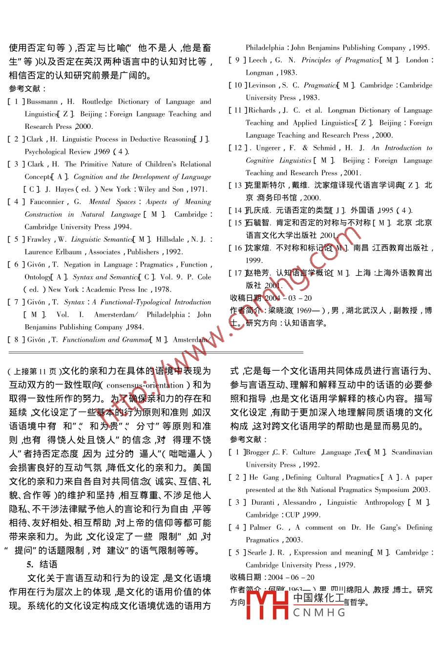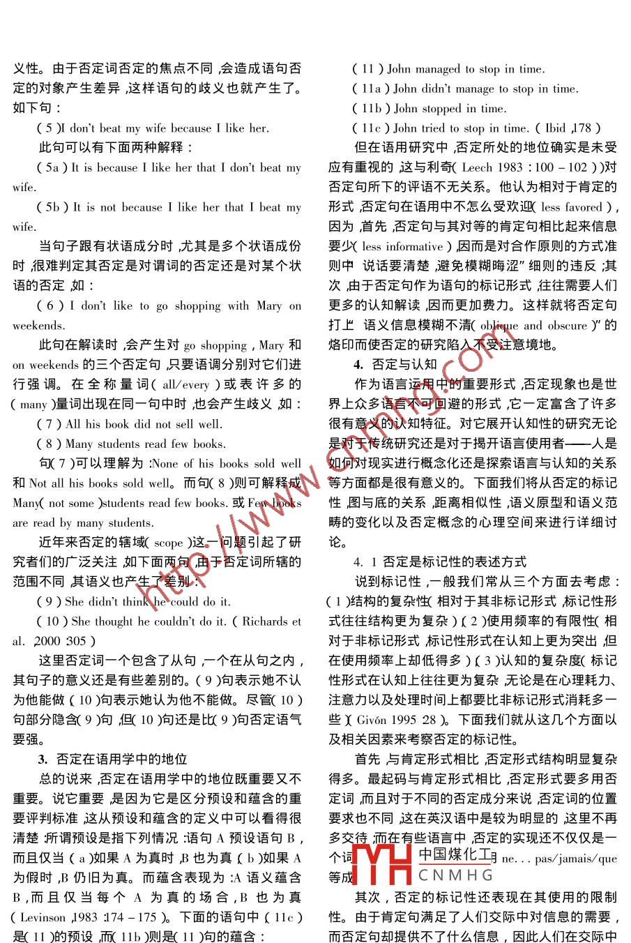 2004年第5期外語(yǔ)研究2004 ,No 5總第87期Foreign Languages ResearchSerial NO 87否定的認(rèn)知分析梁曉波(國(guó)防科學(xué)技術(shù)大學(xué)外語(yǔ)系湖南長(zhǎng)沙410073 )摘要:本文首先簡(jiǎn)單介紹了 否定在語(yǔ)義學(xué)中的特點(diǎn)分類及其在語(yǔ)用學(xué)中的研究地位然后從認(rèn)知語(yǔ)言學(xué)的角度對(duì)否定進(jìn)行了嘗試性的研究。文中重點(diǎn)論述和分析了否定現(xiàn)象的標(biāo)記性圖與底的關(guān)系距離相似性,語(yǔ)義原型和語(yǔ)義范疇的變化以及否定概念的心理空間等諸方面。論文證明,從認(rèn)知語(yǔ)言學(xué)角度來(lái)研究否定,有助于我們進(jìn)一步拓寬對(duì)否定的傳統(tǒng)研究加深我們理解人們是如何從語(yǔ)言的角度對(duì)世界進(jìn)行概念化以及語(yǔ)言和認(rèn)知的深層關(guān)系。關(guān)鍵詞:否定;內(nèi)部否定;認(rèn)知;范疇中圖分類號(hào):H314.3文獻(xiàn)標(biāo)識(shí)碼 :A .文章編號(hào):1005 -7242( 2004 )05 -0012-061.否定的概說(shuō)也稱弱weak )否定其否定落于命題之外與邏輯否定是語(yǔ)言中的重要表達(dá)形式,一直是哲學(xué)邏上說(shuō)的元語(yǔ)言否定( metalinguistic negation )相等同,輯學(xué)和語(yǔ)言學(xué)中的重要課題。從語(yǔ)言學(xué)研究領(lǐng)域來(lái)它并不對(duì)語(yǔ)句的真假作簡(jiǎn)單的評(píng)判而表示對(duì)某一看,語(yǔ)言中的否定表示對(duì)句子意義的部分或全部反說(shuō)法|的不接受或不滿意。羅素的否定句可以很好地駁克里斯特爾2000 237 )。在詞匯層面上,自然語(yǔ)說(shuō)明這兩種否定:言的否定可以通過(guò)以下幾個(gè)方面來(lái)實(shí)現(xiàn)( 1 )某些( 1 ) The present king of France is not bald. .副詞或副詞詞組( not never ,hardly by no means )不若將這句話解釋成如果當(dāng)今法國(guó)有-個(gè)國(guó)王,定代詞( nobody ,nothing ,none ) ,連接詞( neither...而且此國(guó)王不是禿頂?shù)哪敲创司涞姆穸ㄊ钦娴奈襫or )介詞without )和語(yǔ)句否定詞( no)( 2 )形態(tài)上們看到的就是內(nèi)部否定;如果理解成當(dāng)今沒(méi)有法國(guó)的否定詞綴( non- ,dis- ,im- ir- ,-less等);國(guó)王,這樣就形成我們所說(shuō)的外部否定(孔慶成,(3)語(yǔ)調(diào)的變化所形成的對(duì)比而造成的不同否定1995 :11 )。這時(shí),該語(yǔ)句對(duì)應(yīng)于下面的說(shuō)法:(通過(guò)不同的強(qiáng)調(diào),語(yǔ)句Jacob is not flying to New( 2 ) The king of France is not bald because thereYork tomorrow. 中的Jacob , flying ,New York 和is no king of France.tomorrow都可以被否定)( 4 )一些表否定的固定用Bussmann( 2000 323 )認(rèn)為還有一種否定 稱為法( For all I care... X Bussmann ,1996 323 )。另外,對(duì)比否定( contrastive negation ) ,它是強(qiáng)式否定的語(yǔ)像refuse prevent ,doubt deny等這類詞,由于隱含否用變體其否定形成多個(gè)詞項(xiàng)間的對(duì)比往往與否定定從某種意義上說(shuō)也可以算作否定詞。不過(guò)總的詞的否定范圍scope )有關(guān),常 見(jiàn)于not... but...的來(lái)說(shuō)英文最常見(jiàn)的否定還是使用否定操作詞/否定結(jié)構(gòu)中,如:The king of France is not bald ,but rather詞( negative operator/ negator )not 來(lái)實(shí)現(xiàn)的。wears glasses.從否定詞的個(gè)數(shù)來(lái)看,否定可以分為單一否定、根據(jù)否定在句法平面所影響的范圍,還可以將雙重否定( double negation )和多重否定( multiple否定分為語(yǔ)義否定( semantie negation )和成分否定negation )這在傳統(tǒng)的語(yǔ)法書中介紹很多筆者此處( constituent negation )前者對(duì)應(yīng)于對(duì)全句的否定后從略。值得指出的是,單-否定在各種語(yǔ)言中實(shí)現(xiàn)者對(duì)應(yīng)于對(duì)語(yǔ)句中動(dòng)詞以外的其它語(yǔ)句結(jié)構(gòu)成分的的手段是有差別的英、漢語(yǔ)大都由一個(gè)詞來(lái)完成,否定其否定范圍往往較窄。它們分別對(duì)應(yīng)于下面而法語(yǔ)則要通過(guò)兩個(gè)詞ne... pas來(lái)實(shí)現(xiàn)。從形式兩句:,上來(lái)看,語(yǔ)言中的否定可以有兩種類型(Frawley(3 )I don't run frequently.1992 :400 )( 1 )內(nèi)部否定( intermal negation ) ,又被稱YH中國(guó)煤化工and no birds.為強(qiáng)( strong )否定是自然語(yǔ)言否定的基本形式其CN MH G蓋全句,而句( 4 )中的否定局限于命題指的是-個(gè)否定式句子所表達(dá)的否定只是對(duì)birds的否定。命題為真當(dāng)且僅當(dāng)與這個(gè)句子對(duì)應(yīng)的肯定句所表2.否定的語(yǔ)義特征達(dá)的命題為假{ 2 )外部否定(( extermal negation ),否定在語(yǔ)義平面上較為突出的特點(diǎn)是否定的歧- 12義性。由于否定詞否定的焦點(diǎn)不同,會(huì)造成語(yǔ)句否( 11 ) John managed to stop in time.定的對(duì)象產(chǎn)生差異,這樣語(yǔ)句的歧義也就產(chǎn)生了。( 11a ) John didn't manage to stop in time.如下句:( 11b ) John stopped in time.( 5 )I don't beat my wife because I like her.( 11c ) John tried to stop in time. ( Ibid ,178 )此句可以有下面兩種解釋:但在語(yǔ)用研究中,否定所處的地位確實(shí)是未受(5a)It is because I like her that I don't beat my應(yīng)有重視的這與利奇( Leech 1983 :100- 102 ))對(duì)wife.否定句所下的評(píng)語(yǔ)不無(wú)關(guān)系。他認(rèn)為相對(duì)于肯定的(5b)It is not because I like her that I beat my形式,否定句在語(yǔ)用中不怎么受歡迎( less