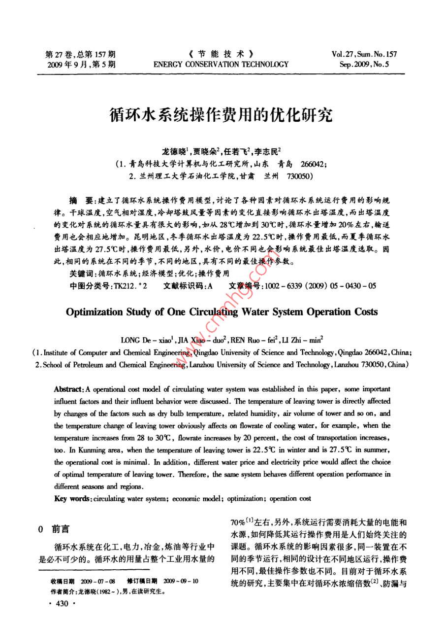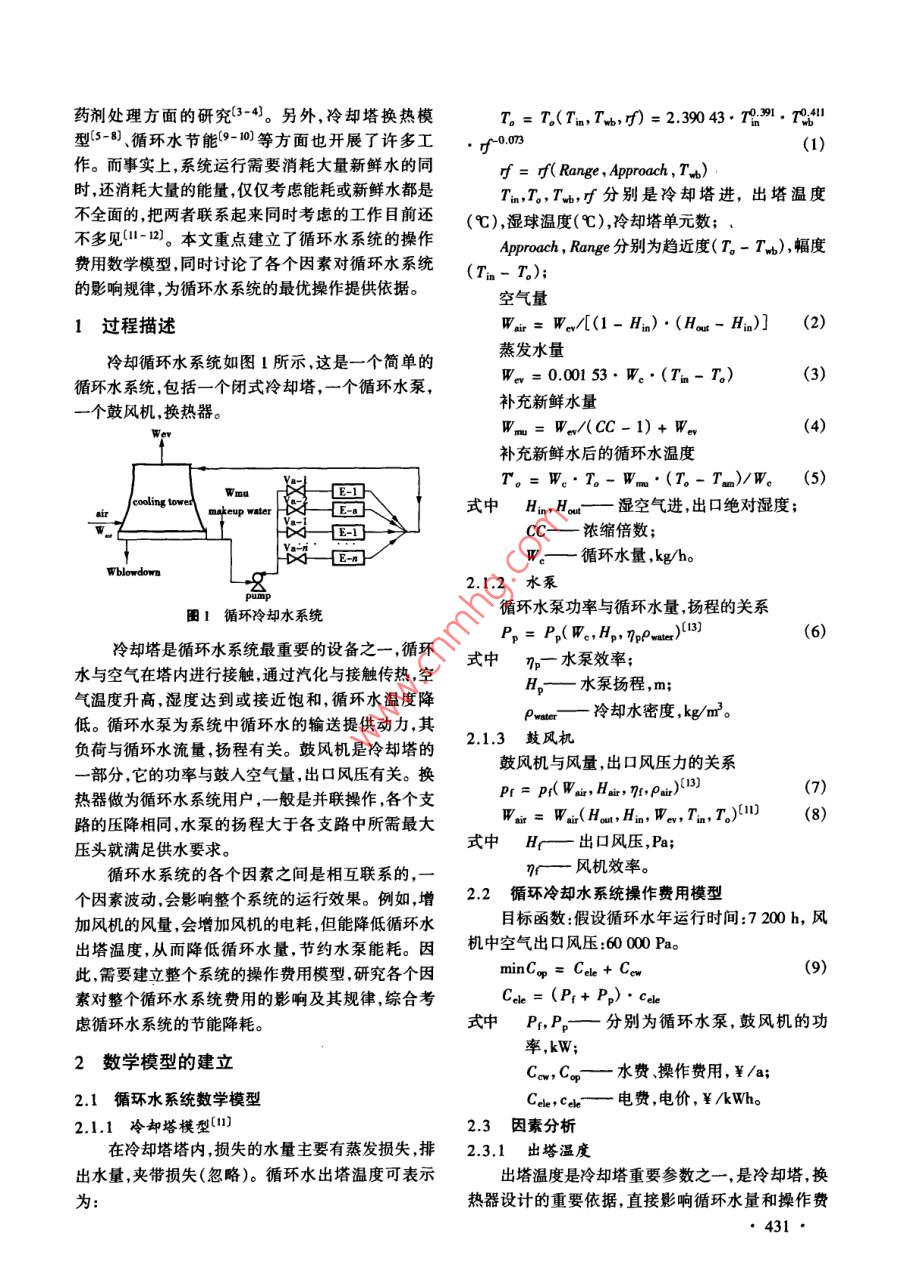 循環(huán)水系統(tǒng)操作費(fèi)用的優(yōu)化研究