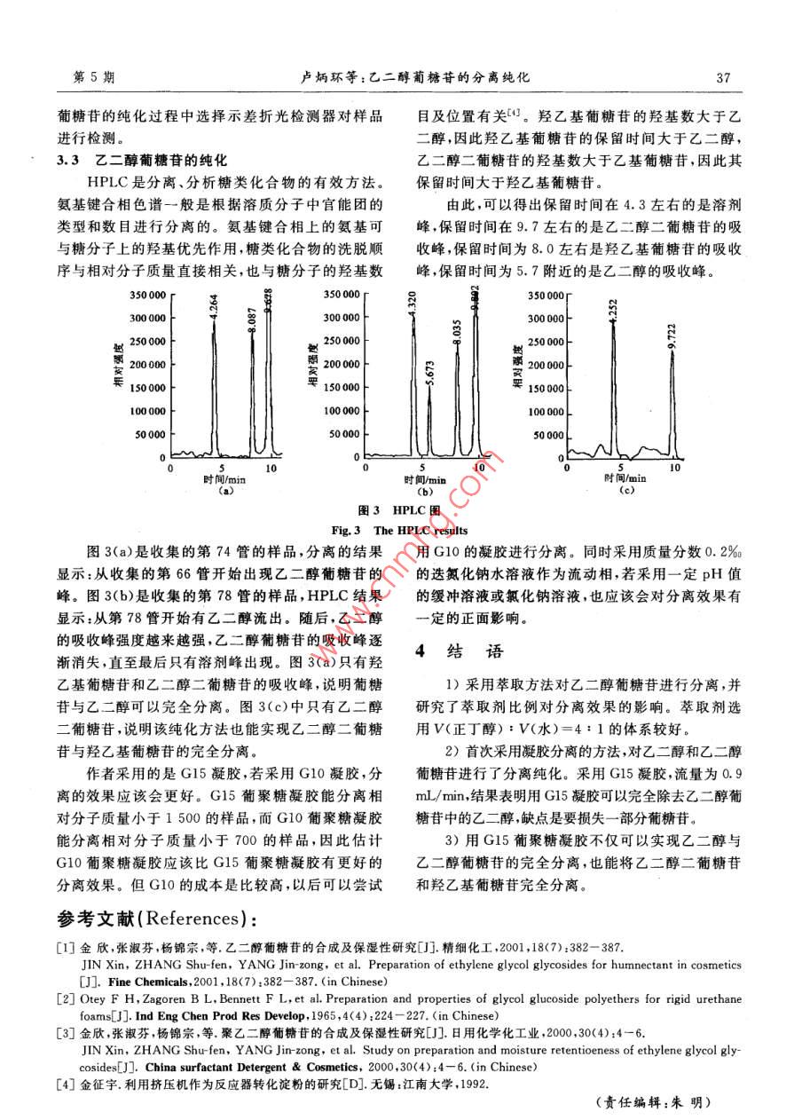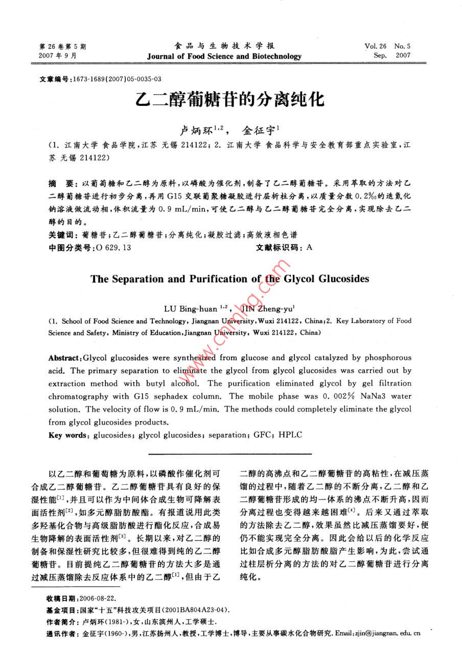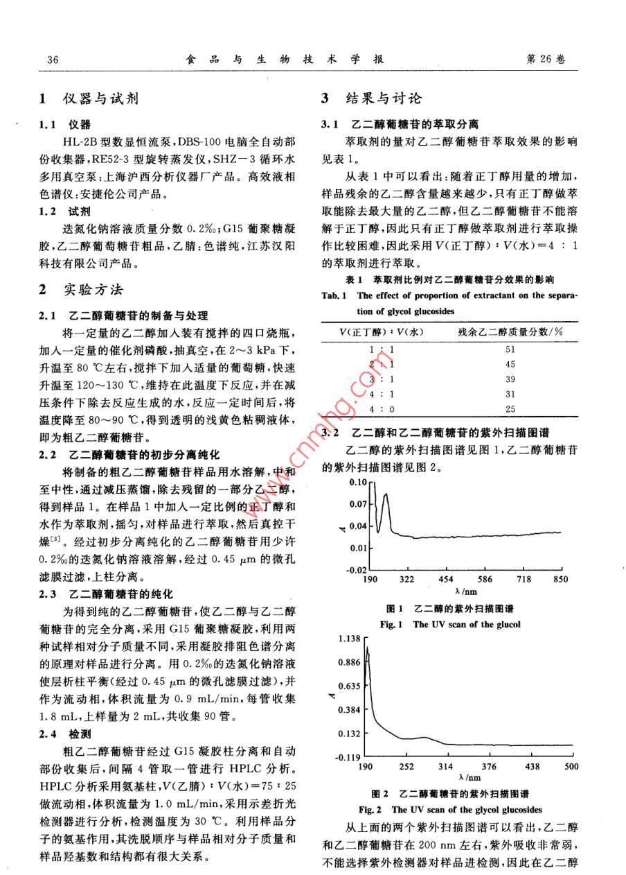 第26卷第5期食品與生物技術(shù)學報 Vol.26 No.52007年9月 Journal of Food Science and BiotechnologySep.2007文章編號:1673-1689(2007)05-0035-03乙二醇葡糖苷的分離純化盧炳環(huán)12,金征宇(1.江南大學食品學院,江蘇無錫2141222.江南大學食品科學與安全教育部重點實驗室,江蘇無錫214122)摘要:以葡萄糖和乙二醇為原料,以磷酸為催化劑制備了乙二醇葡糖苷。采用萃取的方法對乙二醇葡糖苷進行初步分離,再用G15交聯(lián)葡聚糖凝膠進行層析柱分離,以質(zhì)量分數(shù)0.2‰的迭氮化鈉溶液做流動相,體積流量為0.9mL/min,可使乙二醇與乙二醇葡糖苷完全分離,實現(xiàn)除去乙二醇的目的。關(guān)鍵詞:葡糖苷;乙二醇葡糖苷;分離純化凝膠過濾;高效液相色譜中圖分類號:O629.13文獻標識碼:A The Separation and Purification of the Glycol Glucosides LU Bing-huan 12, JIN Zheng-yu' (1. School of Food Science and Technology, Jiangnan University, Wuxi 214122, China; 2. Key Laboratory of Food Science and Safety, Ministry of Education, Jiangnan University Wuxi 214122, China) Abstract: Glycol glucosides were synthesized from glucose and glycol catalyzed by phosphorous acid. The primary separation to eliminate the glycol from glycol glucosides was carried out by extraction method with butyl alcohol. The purification eliminated glycol by gel filtration chromatography with G15 sephadex column The mobile phase was 0. 002% NaNa3 water solution. The velocity of flow is 0. 9 mL/min The methods could completely eliminate the glycol from glycol glucosides products. Key words: glucosides; glycol glucosides; separation; GFC;HPLC以乙二醇和葡萄糖為原料,以磷酸作催化劑可二醇的高沸點和乙二醇葡糖苷的高粘性,在減壓蒸合成乙二醇葡糖苷乙二醇葡糖苷具有良好的保餾的過程中,隨著乙二醇的不斷分離,乙二醇和乙濕性能,并且可以作為中間體合成生物可降解表二醇葡糖苷形成的均一體系的沸點不斷升高,因而面活性劑2,如多元醇脂肪酸酯。有報道說用此類分離過程也變得越來越困難。后來又通過萃取多羥基化合物與高級脂肪酸進行酯化反應,合成易的方法除去乙二醇,效果雖然比減壓蒸餾要好,便生物降解的表面活性劑長期以來,對乙二醇的仍不能實現(xiàn)完全分離。因此會給以后的化學反應制備和保濕性研究比較多,但很難得到純的乙二醇比如合成多元醇脂肪酸脂產(chǎn)生影響,為此,嘗試通葡糖苷目前提純乙二醇葡糖苷的方法大多是通過柱層析分離的方法的對乙二醇葡糖苷進行分離過減壓蒸餾除去反應體系中的乙二醇,但由于乙純化。收稿日期:2006-08-22.基金項目:國家“十五”科技攻關(guān)項目(2001BA804A23-04).作者簡介:盧炳環(huán)(1981-),女,山東濱州人,工學碩士通訊作者:金征字(1960-),男,江蘇揚州人,教授,工學博士,導,主要從事碳水化合物研究 Email: zjinjiangnan educn36食品與生物技術(shù)學報第26卷1儀器與試劑3結(jié)果與討論1.1儀器3.1乙二醇葡糖苷的萃取分離hl-2B型數(shù)顯恒流泵,DBS-100電腦全自動部萃取劑的量對乙二醇葡糖苷萃取效果的影響份收集器,RE52-3型旋轉(zhuǎn)蒸發(fā)儀,SHZ3循環(huán)水見表1多用真空泵:上海滬西分析儀器廠產(chǎn)品。高效液相從表1中可以看出:隨著正丁醇用量的增加,色譜儀:安捷倫公司產(chǎn)品。樣品殘余的乙二醇含量越來越少,只有正丁醇做萃1.2試劑取能除去最大量的乙二醇,但乙二醇葡糖苷不能溶迭氮化鈉溶液質(zhì)量分數(shù)0.2‰;G15葡聚糖凝解于正丁醇,因此只有正丁醇做萃取劑進行萃取操膠,乙二醇葡萄糖苷粗品,乙腈:色譜純,江蘇漢陽作比較困難,因此采用V(丁醇):V(水)=4:1科技有限公司產(chǎn)品。的萃取劑進行萃取。表1萃取劑比例對乙二醇葡糖苷分效果的影響2實驗方法 Tab. 1 The effect of proportion of extractant on the separa-2.1乙二醇葡糖苷的制備與處理 tion of glycol glucosides將一定量的乙二醇加入裝有攪拌的四口燒瓶,V(正丁醇):V(水)殘余乙二醇質(zhì)量分數(shù)/%加入一定量的催化劑磷酸,抽真空,在2~3kPa下,1:151升溫至80℃左右,攪拌下加入適量的葡萄糖,快速2:145升溫至120~130℃,維持在此溫度下反應,并在減3:1394:131壓條件下除去反應生成的水,反應一定時間后,將4:025溫度降至80~90℃,得到透明的淺黃色粘稠液體,即為粗乙二醇葡糖苷。.2乙二醇和乙二醇葡糖苷的紫外掃描圖譜2.2乙二醇葡糖苷的初步分離純化乙二醇的紫外掃描圖譜見圖1,乙二醇葡糖苷備的粗乙二醇葡糖苷樣品用水溶解,中和的紫外掃描圖譜見圖2。至中性,通過減壓蒸餾,除去殘留的一部分乙二醇,0.10得到樣品1。在樣品1中加入一定比例的正丁醇和0.07水作為萃取劑,搖勻,對樣品進行萃取,然后真控干0.04燥(3。經(jīng)過初步分離純化的乙二醇葡糖苷用少許0.010.2‰的選氮化鈉溶液溶解,經(jīng)過0.45m的微孔濾膜過濾,上柱分離。-0.02L1903224545867188502.3乙二醇葡糖苷的純化/nm為得到純的乙二醇葡糖苷,使乙二醇與乙二醇圖1乙二醇的紫外掃描圖譜葡糖苷的完全分離,采用G15葡聚糖凝膠,利用兩 Fig. The UV scan of the glucol種試樣相對分子質(zhì)量不同,采用凝膠排阻色譜分離1.138的原理對樣品進行分離。用0.2的氮化鈉溶液0.886使層析柱平衡(經(jīng)過0.45m的微孔濾膜過濾),并0.635作為流動相,體積流量為0.9mL/min,每管收集1.8mL,上樣量為2mL,共收集90管。0.3842.4檢測0.132粗乙二醇葡糖苷經(jīng)過G15凝膠柱分離和自動-0.119部份收集后,間隔4管取一管進行HPLC分析。190252314376438500 A/nmHPLC分析采用氨基柱,V(乙腈):V(水)=75:25圖