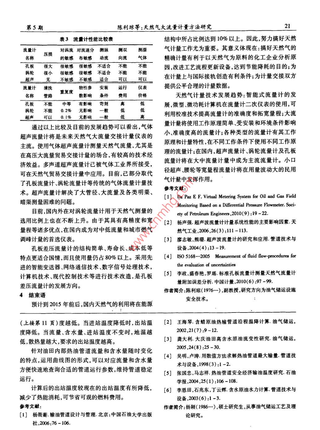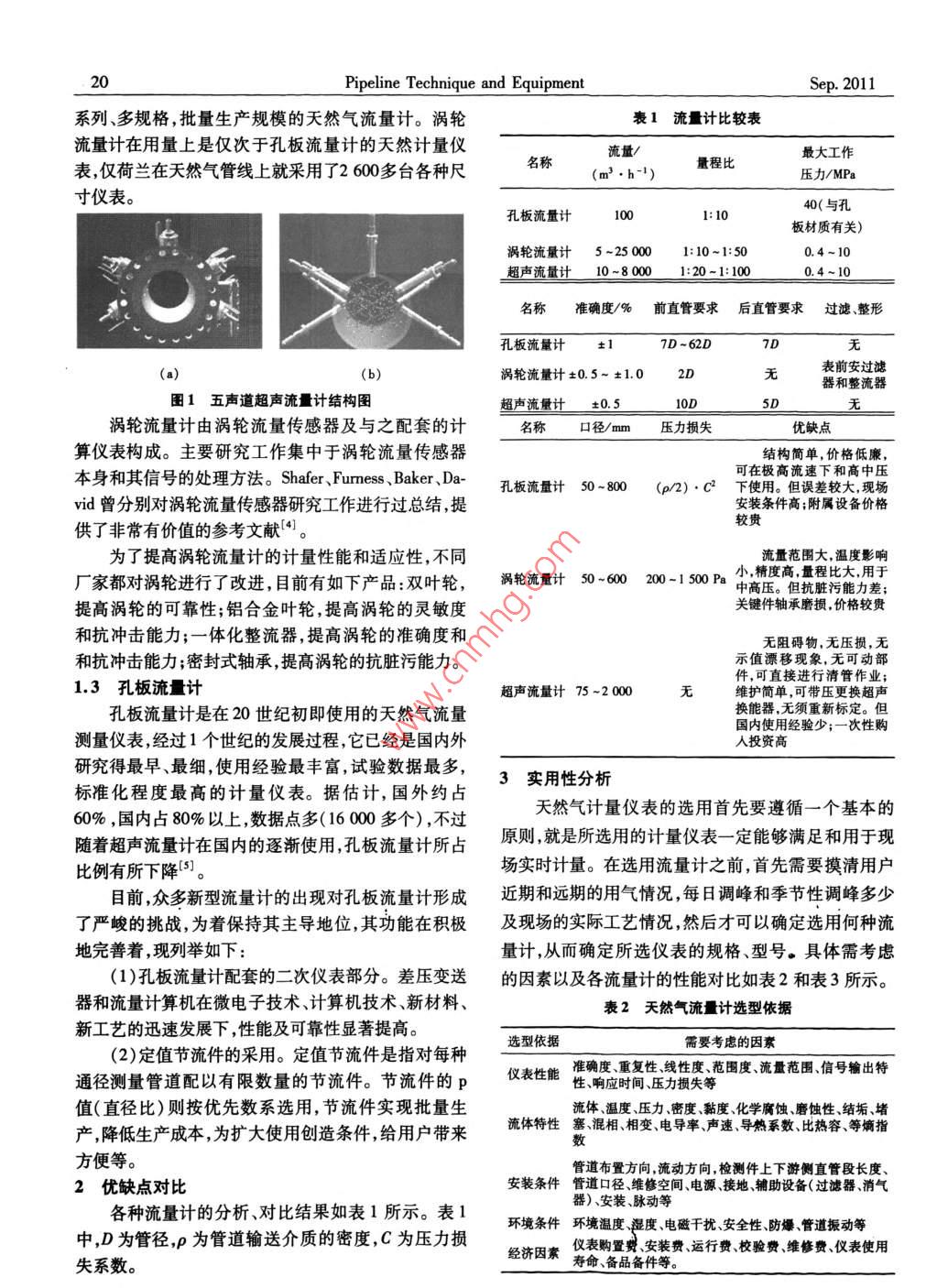 2011年管技術(shù)5設(shè)備2011第5期Pipeline Technique and Equipment天然氣大流量計(jì)量方法研究陳利瓊',溫曉峰,張虹繽(1西南石油大學(xué)四川成都6105002.昆侖銀行庫(kù)爾勒分行新疆庫(kù)爾勒841000)摘要:國(guó)內(nèi)在能源和資源的開(kāi)發(fā)利用及國(guó)際合作中,對(duì)于大口徑、大流量流量計(jì)標(biāo)準(zhǔn)裝暹的需求十分突出。計(jì)量交接逐步發(fā)展為集中式、大口徑、高氣量的貿(mào)易交挾方式,大流量天然氣的計(jì)量方式也已由草一的孔板流量計(jì)發(fā)展到孔板、渦輪、超聲流量計(jì)共用的格局。綜合分析現(xiàn)有的天然氣大流量計(jì)量方式,對(duì)比研究孔板、渦輪以及超聲流量計(jì)的優(yōu)缺點(diǎn),得出流量計(jì)在大流量計(jì)量方面的適用性以及流量計(jì)的發(fā)展趨勢(shì),以達(dá)到合理有效地使用各類計(jì)量?jī)x表的目的,提高天然氣的交接計(jì)量精確度。關(guān)鍵詞:計(jì)量方法;天然氣;大流量中圖分類號(hào):TE8文獻(xiàn)標(biāo)識(shí)碼:A文章編號(hào):1004-9614(2011)05-0019-03a Review of mass Flow Gas Measurement MethodsCHEN Li-qiong, WEN Xiao-feng, ZHANG Hong-bi(1. Southwest Petroleum University, Chengdu 610500, China; 2. Korla Branch, Bank of Kunlun, Korla 841000, China)Abstract: In the process of Chinas energy and resources exploitation and intemational cooperation, the need of large-diameter and big flow meter standard device is very obvious. Measurement for trade handover is gradually developing to a centralizedlarge-diameter and high flow trade method. Mass flow gas measurement methods have been developing from single orifice measure-ment to a pattern jointly shared by orifice, turbine and ultrasonic measurement. By analyzing the exisiting gas mass flow measure-ent methods. andmeasurement instruments, improve the measuring accuracy of natural gas handover and ensure fair trade settlement.Key words: measurement method; gas; mass flow0引言計(jì)近幾年,國(guó)內(nèi)天然氣產(chǎn)量增長(zhǎng)較快,流量計(jì)量在1.1超聲流量計(jì)國(guó)民經(jīng)濟(jì)中的作用也更加明顯。隨著西氣東輸三線、氣體超聲流量計(jì)的應(yīng)用始于20世紀(jì)90年代,以四線的動(dòng)工,預(yù)計(jì)到到2019年,這2個(gè)管線建設(shè)以后,前主要是用于液體測(cè)量,在超聲流量計(jì)應(yīng)用于氣體測(cè)初步形成的天然氣管網(wǎng)輸氣能力將達(dá)800多億m同量上,由于氣體聲阻抗大,氣體聲能衰減大這個(gè)課題時(shí),天然氣在一次能源結(jié)構(gòu)中的比重也在加大,預(yù)計(jì)直未能得到很好的解決氣體超聲的發(fā)展由此受到到2015年前后國(guó)內(nèi)天然氣的利用在能源結(jié)構(gòu)中所占限制2。20世紀(jì)80年代以來(lái)隨著高速數(shù)字信號(hào)處比例將達(dá)到10%以上理技術(shù)和先進(jìn)的壓電陶瓷技術(shù)的發(fā)展,氣體超聲流量據(jù)統(tǒng)計(jì),2008年國(guó)內(nèi)用于天然氣計(jì)量的器具為計(jì)測(cè)量天然氣技術(shù)有了突破性進(jìn)展900多臺(tái),預(yù)計(jì)2015年將可能達(dá)到2300多臺(tái)。從整體超聲流量計(jì)根據(jù)換能器數(shù)量分類,目前氣體超聲上來(lái)看在流量計(jì)使用上,20世紀(jì)70年代形成了孔板流量計(jì)有一至六聲道流量計(jì);根據(jù)超聲波在管壁上的使用高峰期,20世紀(jì)80年代形成了渦輪流量計(jì)使用反射情況,又可分為直射、單反射和雙反射3種。目的高峰期,20世紀(jì)90年代中后期則形成了使用超聲前超聲波流量計(jì)一般都采用單反射技術(shù),計(jì)量不確流量計(jì)的高峰期。定度為1.0%~2.0%。圖1中,五聲道超聲流量計(jì)有1天然氣計(jì)量類型3個(gè)聲道采用單反射技術(shù),2個(gè)聲道采用旋轉(zhuǎn)方向相在大流量計(jì)量方面,目前國(guó)內(nèi)外采用的流量計(jì)主反的雙反射技術(shù),對(duì)旋渦流的流量測(cè)量準(zhǔn)確度較高。要有3種類型:超聲流量計(jì)、渦輪流量計(jì)和孔板流量1.2渦輪流量計(jì)在歐洲和美國(guó),渦輪流量計(jì)是繼孔板流量計(jì)之后收稿日期:2010-12-09收修改稿日期:2011-04-21的第二個(gè)法定天然氣流量計(jì),已經(jīng)發(fā)展為多品種、全Pipeline Technique and EquipmentSep.2011系列、多規(guī)格,批量生產(chǎn)規(guī)模的天然氣流量計(jì)。渦輪表1流量計(jì)比較表流量計(jì)在用量上是僅次于孔板流量計(jì)的天然計(jì)量?jī)x流量表僅荷蘭在天然氣管線上就采用了2600多臺(tái)各種尺名稱量程比最大工作(m3·h-1)壓力/MPa寸儀表1:1040(與孔孔板流量計(jì)板材質(zhì)有關(guān))輪流量計(jì)5-250001:10~10.4-10超聲流量計(jì)10-80001:20-1:10004-10名稱準(zhǔn)確度/%前直管要求后直管要求過(guò)濾整形孔板流量計(jì)17D-62D(a)渦輪流量計(jì)±0.5~±1.02D表前安過(guò)濾器和整流器圖1五聲道超聲流量計(jì)結(jié)構(gòu)圖超聲流量計(jì)±0.5渦輪流量計(jì)由渦輪流量傳感器及與之配套的計(jì)名稱口徑/mm壓力損失優(yōu)缺點(diǎn)算儀表構(gòu)成。主要研究工作集中于渦輪流量傳感器結(jié)構(gòu)簡(jiǎn)單,價(jià)格低廉,本身和其信號(hào)的處理方法。 Shafer、 Furness、 Baker、Da可在極高流速下和高中壓板流量計(jì)50~800(p/2)·C2下使用。但誤差較大現(xiàn)場(chǎng)vid曾分別對(duì)渦輪流量傳感器研究工作進(jìn)行過(guò)總結(jié),提安裝條件高;附屬設(shè)備價(jià)格供了非常有價(jià)值的參考文獻(xiàn