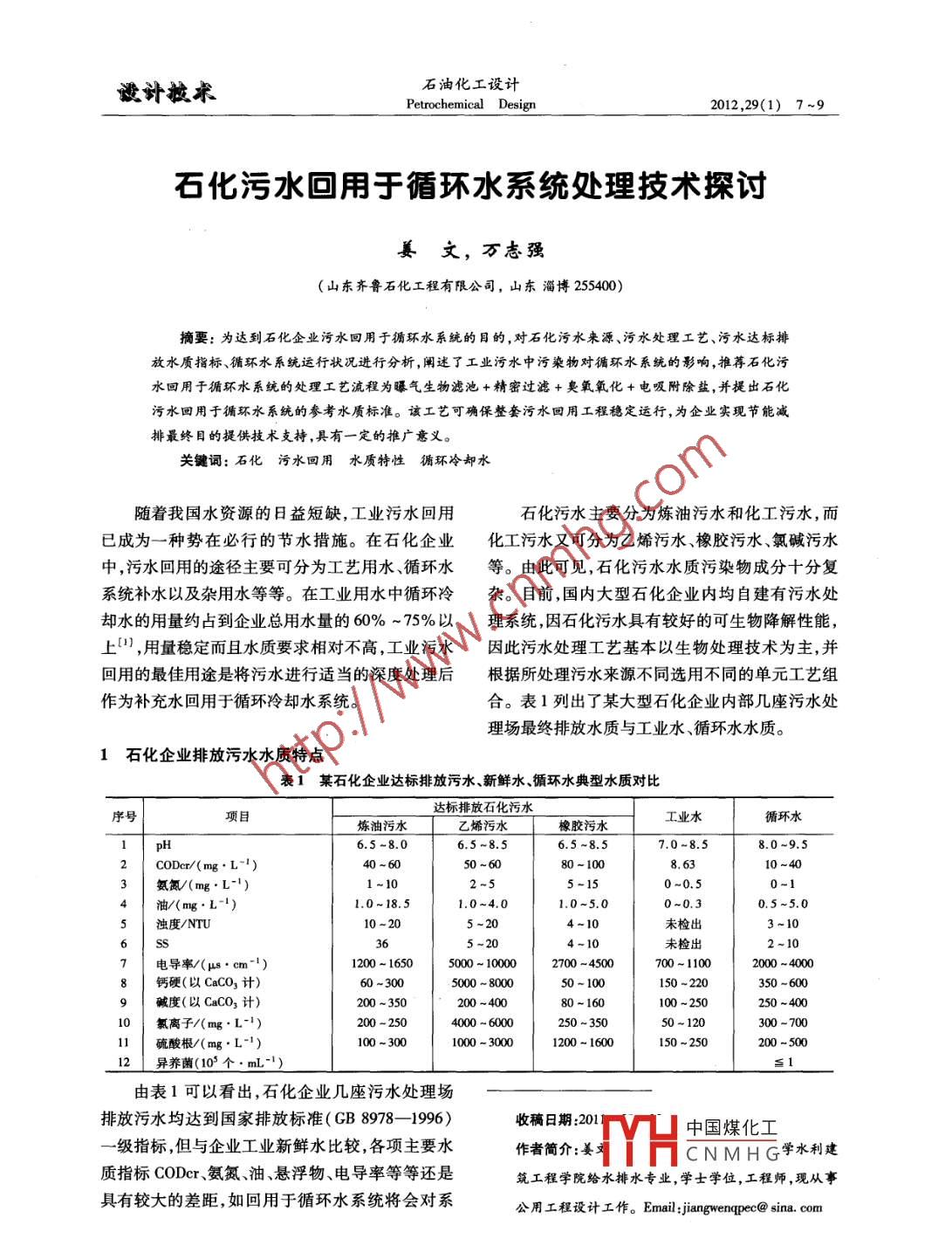 謾計(jì)掖術(shù)石油化工設(shè)計(jì)Petrochemical Design2012,29(1) 7~9石化污水回用于循環(huán)水系統(tǒng)處理技術(shù)探討姜文,萬(wàn)志強(qiáng)(山東齊魯石化工程有限公司,山東淄博255400)摘要:為達(dá)到石化企業(yè)污水回用于循環(huán)水系統(tǒng)的目的,對(duì)石化污水來(lái)源、污水處理工藝、污水達(dá)標(biāo)排放水質(zhì)指標(biāo)循環(huán)水系統(tǒng)運(yùn)行狀況進(jìn)行分析,闡述了工業(yè)污水中污染物對(duì)循環(huán)水系統(tǒng)的影響,推薦石化污水回用于循環(huán)水系統(tǒng)的處理工藝流程為曝氣生物濾池+精密過濾+臭氧氧化+電吸附除鹽,并提出石化.污水回用于循環(huán)水系統(tǒng)的參考水質(zhì)標(biāo)準(zhǔn)。該工藝可確保整套污水回用工程穩(wěn)定運(yùn)行,為企業(yè)實(shí)現(xiàn)節(jié)能減排最終目的提供技術(shù)支持,具有一定的推廣意義。關(guān)鍵詞:石化污水回用水質(zhì)特性 循環(huán)冷卻水隨著我國(guó)水資源的日益短缺,工業(yè)污水回用石化污水主要分為煉油污水和化工污水,而已成為一-種勢(shì)在必行的節(jié)水措施。在石化企業(yè)化工污水又可分為乙烯污水、橡膠污水、氯堿污水中,污水回用的途徑主要可分為工藝用水、循環(huán)水等。由此可見,石化污水水質(zhì)污染物成分十分復(fù)系統(tǒng)補(bǔ)水以及雜用水等等。在工業(yè)用水中循環(huán)冷雜。目前,國(guó)內(nèi)大型石化企業(yè)內(nèi)均自建有污水處卻水的用量約占到企業(yè)總用水量的60% ~ 75%以理系統(tǒng),因石化污水具有較好的可生物降解性能,上" ,用量穩(wěn)定而且水質(zhì)要求相對(duì)不高,工業(yè)污水因此污水處理工藝基本以生物處理技術(shù)為主,并回用的最佳用途是將污水進(jìn)行適當(dāng)?shù)纳疃忍幚砗蟾鶕?jù)所處理污水來(lái)源不同選用不同的單元工藝組作為補(bǔ)充水回用于循環(huán)冷卻水系統(tǒng)。合。表1列出了某大型石化企業(yè)內(nèi)部幾座污水處理場(chǎng)最終排放水質(zhì)與工業(yè)水、循環(huán)水水質(zhì)。1石化企業(yè)排放污水水質(zhì)特點(diǎn)表1某石化企業(yè)達(dá)標(biāo)排放污水、新鮮水循環(huán)水典型水質(zhì)對(duì)比達(dá)標(biāo)排放石化污水序號(hào)項(xiàng)目工業(yè)水循環(huán)水煉油污水乙烯污水橡膠污水H6.5-8.06.5-8.57.0-8.58.0~9.5CODer/(mg.L~ ')40~6050 ~6080-1008.6310~40氨氮(mg.L小)1~100~0.0-1油/(mg.L-1)1.0-18.51.0~4.01.0~5.00-0.30.5-5.0獨(dú)度/NTU10 ~205~204~10未檢出3~10364-10電導(dǎo)率/(μs●cm-+1)1200~ 16505000 ~ 100002700 ~ 4500700 ~ 11002000 ~4000鈣硬(以CaCO3計(jì))60-3005000 ~ 800050~ 100150 -220350 -600堿度(以CaCO,計(jì))200 ~350200 ~40080~160100 ~250250 ~40010氯離子/(mg.L-")200 - 2504000 ~ 6000250 ~35050~ 120300 -700.1| 硫酸根/(mg.L-1)100 -3001000 ~ 30001200 ~ 1600150 ~250200 -500_12異養(yǎng)菌(105個(gè). mL-1)當(dāng)1由表1可以看出,石化企業(yè)幾座污水處理場(chǎng)排放污水均達(dá)到國(guó)家排放標(biāo)準(zhǔn)( GB 8978- -1996)收稿日期:201中國(guó)煤化工一級(jí)指標(biāo),但與企業(yè)工業(yè)新鮮水比較,各項(xiàng)主要水作者簡(jiǎn)介:姜:CNMH G學(xué)水利建質(zhì)指標(biāo)CODer.氨氮、油、懸浮物、電導(dǎo)率等等還是筑工程學(xué)院給水排水專業(yè),學(xué)士學(xué)位,工程師,現(xiàn)從事具有較大的差距,如回用于循環(huán)水系統(tǒng)將會(huì)對(duì)系公用工程設(shè)計(jì)工作。Email:jiangwenqpec@ sina. com石油化工設(shè)計(jì)第29卷統(tǒng)造成巨大的影響,本文就水質(zhì)指標(biāo)對(duì)循環(huán)水系2.2 污水回用工藝優(yōu)化統(tǒng)的影響進(jìn)行簡(jiǎn)單敘述。2.2.1生 物深度處理技術(shù)(1)有機(jī)污染物。石化污水中的極性化合物由表1看出,乙烯污水、橡膠污水處理場(chǎng)達(dá)標(biāo)主要是C2~C2s的脂肪酸、環(huán)烷酸、苯羧酸、還有排放污水中CODer氨氮含量相對(duì)較高,如回用于酚、酮、醇、酯類化合物及微量的含氮、氧、硫、氯等循環(huán)水系統(tǒng)勢(shì)必會(huì)帶來(lái)不利影響,故必須進(jìn)行三雜原子的化合物。級(jí)生物處理以最大限度降低其有機(jī)污染物、氨氮(2)氨氮。水中的氨氮對(duì)循環(huán)水系統(tǒng)的影響含量。目前,應(yīng)用較為廣泛的處理技術(shù)主要有生主要有:促進(jìn)微生物的繁殖。在循環(huán)水中有充足物流化床、膜生物反應(yīng)器、曝氣生物濾池等等。生的碳源、磷源、氧氣、適宜的溫度,非常適用于細(xì)物流化床、膜生物反應(yīng)器為近年來(lái)新興生物處理菌藻類等微生物生長(zhǎng),若加上氮源,就會(huì)極大的技術(shù),雖然處理效果好,但投資費(fèi)用高,運(yùn)行管理促進(jìn)微生物的繁殖。同時(shí)氨的存在,硝化菌群大水平要求高,因此推廣應(yīng)用有一定的難度。量繁殖。污水中帶人的氨氮會(huì)在冷卻塔中脫逸而2.2.2除鹽工藝技術(shù)出,尤其在循環(huán)水的堿性處理方案中,更容易脫由表1可看出,乙烯污水、氯堿污水、橡膠污除,從而使循環(huán)水的pH值下降,影響系統(tǒng)水質(zhì)穩(wěn)水因受來(lái)水水質(zhì)影響,其含鹽量已嚴(yán)重超出循環(huán)定劑的緩蝕阻垢效果。水系統(tǒng)水質(zhì)要求范圍。如要實(shí)現(xiàn)污水回用于循環(huán)(3)懸浮物。污水中懸浮物含量高,會(huì)在循環(huán)水系統(tǒng),必須