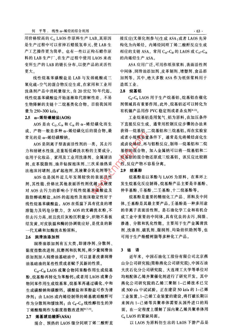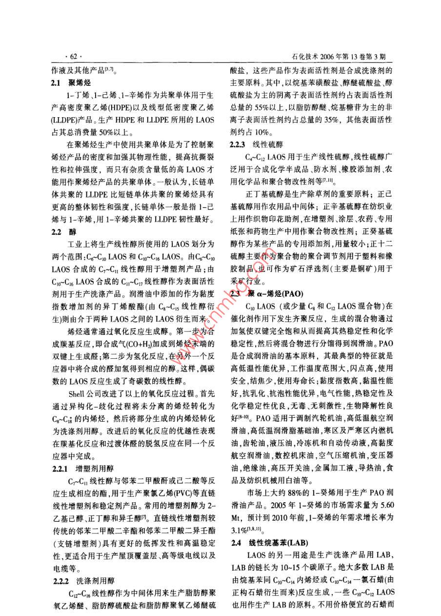 石化技術,2006.13(3); 61綜述PETROCHEMICAL INDUSTRY TECHNOLOCY線性c-烯烴的綜合利用何平栗同林(中國石油化工股份有限公司北京燕山分公司研究院,北京,102500)摘要:介紹了線性a-烯烴(LAOS)的性質、生產(chǎn)技術及國內(nèi)外市場供需情況,詳述了LAOS的主要用途。LAOS的物理性質和在工.業(yè)上的用途依據(jù)其碳鏈的長度決定.工業(yè)上有關LAOS最常見的反應包括:羰基合成反應、齊聚/聚合反應、簡單的加成反應、烷基化反應硫酸鹽化/磺化和氧化反應等。LAOS可用于生產(chǎn)聚烯烴共聚單體、表面活性劑中間體、合成潤滑劑、潤滑油舔加劑、油田化學品和紙漿助劑等。關鍵詞:線性a-烯烴 乙烯齊聚 聚烯烴共聚單體 表面活性劑線性a-烯烴([LAOS)是指雙鍵在分子末端或0.64 Mt。目前我國LAOS的生產(chǎn)以蠟裂解工藝為a位的直鏈碳氫化合物,其生產(chǎn)方法主要有蠟裂主,生產(chǎn)裝置雖有多套,但LAOS的生產(chǎn)量只有解法、萃取分離法、烷烴脫氫法、脂肪醇脫水法、內(nèi)0.15 Mt/a 左右,LAOS的產(chǎn)需之間存在著很大差烯烴異構法及乙烯齊聚法等。乙烯齊聚法生產(chǎn)的距。而且國內(nèi)生產(chǎn)的LAOS產(chǎn)品純度較低,只用于產(chǎn)品具有內(nèi)烯烴含量少線性化程度高、碳數(shù)分布生產(chǎn)合成潤滑油、降凝劑和潤滑油添加劑,與國外窄、產(chǎn)物分子由偶碳數(shù)原子組成、產(chǎn)品質量好及分同類產(chǎn)品相比,質量相差甚大,基于乙烯齊聚法生離費用低等優(yōu)點,因而近年來LAOS的生產(chǎn)逐步產(chǎn)的LAOS幾乎為空白12月。趨向采用乙烯齊聚法-9,產(chǎn)品是CrCx含偶數(shù)碳的烯烴,工業(yè)上比較成熟的是CPChem、BP和2LAOS產(chǎn)品應用Shell三類工藝。LAOS的物理性質和在工業(yè)上的用途依據(jù)其碳鏈的長度決定。室溫下1-丁烯為氣體,C6~Cg的1國內(nèi)外LAOS市場概況LAOS為無色透明液體,而Cp的LAOS則為蠟狀2004年,世界LAOS的總產(chǎn)能達到3.9 MVa,固體。其中北美占64%.歐州占25%、亞太地區(qū)占3%、工業(yè)上有關LAOS最常見的反應包括:羰基其他地區(qū)占8%。全球主要生產(chǎn)商占總產(chǎn)能的比合成反應、齊聚/聚合反應、簡單的加成反應、烷基例為:美國Shell公司、BP公司.Chevron Phillips化反應、硫酸鹽化/磺化和氧化反應等。公司分別占34% ,29%,17%,南非Sasol公司占LAOS的應用通常是由其雙鍵的活性決定,用8%,日本出光石化公司占1.5%, 其他公司占途極為廣泛。LAOS 可用于生產(chǎn)塑料、聚烯烴彈性10.5%。體、表面活性劑和中間體(洗滌劑醇類、線性烷基2005年,全球LAOS總需求量約為3.5 Mt,整苯、烷基二甲胺、a-烯烴磺酸酯、聯(lián)苯醚二磺酸個LAOS市場消費主要集中在北美、西歐和日本,酯),增塑劑用醇、合成潤滑油、石油添加劑、油田少量在其他地區(qū)。LAOS全球消費結構為:共聚物化學品;少量用于合成脂肪酸、烯基丁二醛、環(huán)氧占50% ,合成洗滌劑占25%,合成潤滑油占15%,化物硫醇、1-聚丁烯、戊醇高分子量蠟.金屬工增塑劑占6%,聚a- ~烯烴占4%,預計到2010年全收稿日期: 2006- 03-21。球LAOS需求量將增加到6.84Mt47。修改稿收到日期: 2006 08-07。2005年,我國LAOS的需求量為0.48 M,根作者簡介:何平,女,助理工程師。2004 年畢業(yè)于成都理據(jù)預測到2010年國內(nèi)LAOS的需求量將增加到I大學,現(xiàn)從事乙烯齊聚工作。聯(lián)系電話:010- 80344812?!?2.石化技術2006年第13卷第3期作液及其他產(chǎn)品B.%。酸鹽,這些產(chǎn)品作為表面活性劑是合成洗滌劑的2.1聚烯烴主要原料。其中,以烷基苯磺酸鹽、醇醚硫酸鹽、醇1-丁烯、1-己烯.1-辛烯作為共聚單體用于生硫酸鹽為主的陰離子表面活性劑約占表面活性劑產(chǎn)高密度聚乙烯(HDPE)以及線型低密度聚乙烯總量的55%以上,以脂肪醇醚、烷基糖苷為主的非([LDPE)產(chǎn)品。生產(chǎn)HDPE和LLDPE所用的LAOS離子表面活性劑約占總量的35%,其他表面活性占其總消費量50%以上。劑約占10%。在聚烯烴生產(chǎn)中使用共聚單體是為了控制聚2.2.3線性硫醇烯烴產(chǎn)品的密度和加強其物理性能,提高抗撕裂C_-C口LAOS用于生產(chǎn)線性硫醇,線性硫醇廣性和拉伸強度,而只有雜質含量低的高LAOS才泛用于 合成化學半成品、防水劑、橡膠添加劑、農(nóng)能用作聚烯烴產(chǎn)品的共聚單體。一般認為,長鏈單用化學品和聚合物改性劑等.I。體共聚的LLDPE比短鏈單體共聚的聚烯烴具有正丁基硫醇是生產(chǎn)除草劑的重要原料;正已更高的整體韌性和強度,長鏈單體- -般是指1-己基硫醇用作農(nóng)用品中間體;正辛基硫醇在紡織業(yè)烯與1-辛烯,用1-辛烯共聚的LLDPE韌性最好。上用作織物印花助劑,在增塑劑、涂層、農(nóng)藥、專用2.2醇紙張和藥物生產(chǎn)中用作聚合物改性劑;正癸基硫工業(yè)上將生產(chǎn)線性醇所使用的LAOS劃分為醇作為某些產(chǎn)品的專用添加劑,用量較小;正十二兩個范圍:C5-C LAOS和Cmo~Cr6 LAOS。由C~-C1o硫醇主要作為聚合物的聚合調節(jié)劑用于塑料和橡LAOS合成的Cr~Cn線性醇用于增塑劑產(chǎn)品;由膠制 品,也可作為礦石浮選劑(主要是銅礦)用于C1o-C16LAOS合成的Cir~Cn線性醇作為表面活性采礦行業(yè)。劑用于生產(chǎn)洗滌產(chǎn)品。潤滑油中添加的作為黏度2.3 聚c-烯烴(PAO)指數(shù)增加劑的異丁烯酸酯(由Cg~Cis線性醇衍Co LAOS (或少量Cq和Cp LAOS混合物)在生)則由介于兩種LAOS之間的LAOS衍生而來。催化劑作用下發(f