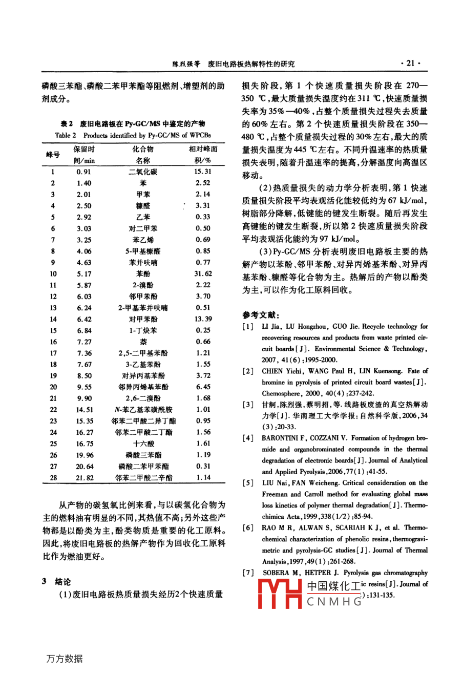 第37卷第5期Vol 37 No 52009年5月CHEMICAL ENGINEERING( CHINA)May 2009廢舊電路板熱解特性的研究陳烈強(qiáng)',周文賢,黃華杰1,劉曉丹2(華南理工大學(xué)1.傳熱強(qiáng)化與過(guò)程節(jié)能教育部重點(diǎn)實(shí)驗(yàn)室;2.化學(xué)科學(xué)學(xué)院,廣東廣州510640)摘要熱解是回收處理廢舊電路板中金屬及樹(shù)脂成分的重要方法。文中采用熱重差熱聯(lián)用分析儀和裂解氣相色譜質(zhì)譜聯(lián)用儀檢測(cè)了以酚醛樹(shù)脂為基板的廢舊電路板熱解特性;分析了不同速率下的動(dòng)力學(xué)參數(shù),及其熱解產(chǎn)物的化學(xué)成分。實(shí)驗(yàn)研究結(jié)果表明:廢舊電路板熱解過(guò)程主要有2個(gè)快速質(zhì)量損失階段(270-350℃,350480℃),其平均活化能分別約為67,97k/mol。其裂解產(chǎn)物主要是苯酚、對(duì)甲苯酚、鄰異丙烯基苯酚、鄰甲苯酚、對(duì)異丙基苯酚、糠醛等。關(guān)鍵詞:廢舊電路板;熱解;熱重分析;裂解氣相色譜質(zhì)譜聯(lián)用儀中圖分類(lèi)號(hào):TK093;X705文獻(xiàn)標(biāo)識(shí)碼:A文章編號(hào):1005-9954(2009)050018404Pyrolysis characteristics of waste printed circuit boardsCHEN Lie- qiang, ZHOU Wen-xian, HUANG Hua-jie, LIU Xiao-dan2(1. Key Lab of Enhanced Heat Transfer Energy Conservation of the Ministry of Education;2. College of Chemical Science, South China University of Technology, Guangzhou 510640Guangdong Province, ChinaAbstract The pyrolysis method was an essential method for recycling the metals and resin compounds blended intowaste printed circuit boards( WPCBs). The pyrolysis characteristics of phenolic-resin- based WPCBs and pyrolysiskinetic parameters at different heating rates were analyzed by thermogravimetry and differential scanning calorimetry(TG-DSC), pyrolysis gas chromatography mass spectrometry(Py-GC/MS). In addition, the compositions of productswere also analyzed. The result indicates that the decomposition of WPCBs takes place in two fast stages of mass lossat 270-350C, 350-480 C). The average activation energy of two fast mass losg stages was 67, 97 k]/molrespectively. The pyrolysis products were mainly composed of phenol, 4-methylphenol, o-isopropylenephenol2-methylphenol, p-isopropylphenol and furaldehyde, etc.Key words: waste printed circuit boards; pyrolysis; thermogravimetric analysis; pyrolysis gas chromatography mass我國(guó)廢舊家用電器已進(jìn)入了報(bào)廢的高峰期,由度、加熱速率、顆粒大小、熱解氣氛、催化劑等因素)此產(chǎn)生了大量廢舊電子電器產(chǎn)品(WEEE)。廢舊印對(duì)熱解產(chǎn)物產(chǎn)量和分布的影響2、熱解動(dòng)力學(xué)及機(jī)刷電路板( WPCBs)是WEEE中重要的組成部分,目理4等。對(duì)于酚醛樹(shù)脂為基板的電路板研究則比前對(duì)于廢舊印刷電路板的研究主要是以回收金屬為較少,隨著酚醛樹(shù)脂為基板的廢舊電路板逐漸增多目的,進(jìn)行火法冶金、濕法冶金提取金屬,或者是機(jī)研究其熱解回收利用有著重大的意義。因此,本文械物理方法分離回收金屬,這些方法都會(huì)造成二重點(diǎn)以紙基酚醛樹(shù)脂基板的廢舊電路板為研究對(duì)次污染象,用裂解氣相色譜質(zhì)譜聯(lián)用儀(Py-GC/MS)和熱用熱解技術(shù)回收處理固體廢棄物可以避免對(duì)環(huán)重差熱聯(lián)用分析儀( TG-DSC)對(duì)廢舊電路板進(jìn)行熱境的二次污染,受到國(guó)內(nèi)外許多研究人員的關(guān)注。解分析,研究其動(dòng)力學(xué)參數(shù)及熱解產(chǎn)物等熱解特性對(duì)于印刷電路板的熱解研究,以環(huán)氧樹(shù)脂基板電路這些結(jié)果舊申路板執(zhí)解工藝條件確定以及熱板為對(duì)象進(jìn)行較全面的研究,如熱解影響因素(溫解產(chǎn)中國(guó)煤化工重要依據(jù)?;痦?xiàng)目:廣東省科技重點(diǎn)計(jì)劃項(xiàng)目(20036703001);廣州市科技計(jì)劃項(xiàng)目CNMHG作者簡(jiǎn)介:陳烈強(qiáng)(1945-),男,教授研究方向?yàn)橘Y源與能源;周文賢(1983-),女,碩士,主要從事廢舊家電塑料資源化研究,Emalzhouwenxian@mailscut.edu.cn.陳烈強(qiáng)等廢舊電路板熱解特性的研究實(shí)驗(yàn)方法30%-36%。11材料實(shí)驗(yàn)所用廢舊電路板從汕頭市貴嶼鎮(zhèn)市場(chǎng)購(gòu)升溫速率/℃·min)買(mǎi)。將其磨成粉末,過(guò)40目的篩子(0.42一1.0mm),并在烘箱中于108℃烘干存放備用12熱重分析熱重分析實(shí)驗(yàn)采用Q600SDT熱重差熱聯(lián)用分析儀(美國(guó) TAINC公司),測(cè)溫靈敏度:0.001℃;天溫度℃平靈敏度:0.1μg。實(shí)驗(yàn)設(shè)定:氮?dú)饬髁繛閳D1廢舊電路板在不同升溫速率下的TG曲線(xiàn)100ml/min,樣品質(zhì)量為10mg,終溫為800℃,升Fig. 1 TG curves of WPCBs at different heating rates溫速率分別為10,15,20℃/min1.3裂解-色譜/質(zhì)譜分析GCMS-QP2010氣相色譜質(zhì)譜聯(lián)用儀(日本SHMADZU公司)配有自動(dòng)進(jìn)樣器以及PRY2A型裂解升溫速率/℃·min)器。裂解條件:裂解室溫度600℃,裂解時(shí)間10s色譜條件:彈性石英毛細(xì)管柱(15mx0.2mm,0.33um),柱始溫50℃,保溫2min,升溫速率100200300400500600700800溫度/c10℃/min,柱終溫240℃,保持15min;進(jìn)樣口溫度圖2廢舊電路板在不同升溫速率下的DG曲線(xiàn)280℃,載氣He,流量10mL/min,分流比50:1。質(zhì)Fig 2 DTG curves of WPCBs at different heating rates譜條件:EI源電子能量為70eV,離子源溫度為250℃,接口溫度250℃,質(zhì)量掃描范圍29450u不同升溫速率下TG曲線(xiàn)相似,DTG曲線(xiàn)幾乎重合在一起。升溫速率為10℃/min的DTG曲線(xiàn)最2結(ji