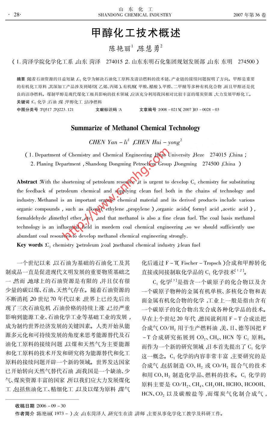 山東化工SHANDONG CHEMICAL INDUSTRY2007年第36卷甲醇化工技術(shù)概述陳艷麗',陳慧勇2( 1.菏澤學(xué)院化學(xué)化工系山東菏澤274015 2.山東東明石化集團(tuán)規(guī)劃發(fā)展部山東東明274500 )摘要隨著石油資源的日益短缺C,化學(xué)為解決石油化工原料及清潔燃料的技術(shù)鏈、產(chǎn)業(yè)鏈的接續(xù)問(wèn)題探明了方向。甲醇是重要的有機(jī)化工原料其深加工產(chǎn)品涉及到烯烴(乙烯、丙烯)有機(jī)酸甲酸、醋酸)甲醛、二甲醚等多種有機(jī)化合物,而且甲醇還是優(yōu)良的潔凈燃料。煤制甲醇是現(xiàn)代煤化工極具影響的技術(shù)領(lǐng)域應(yīng)該充分利用我國(guó)相對(duì)比較豐富的煤炭資源大力發(fā)展甲醇化工。關(guān)鍵詞C化學(xué)石油煤甲醇化工潔凈燃料中圖分類號(hào):TQ517 ;TQ223. 121文獻(xiàn)標(biāo)識(shí)碼A文章編號(hào):1008 -021X( 2007 )03 -0028 -03Summarize of Methanol Chemical TechnologyCHEN Yan-li' CHEN Hui - yong2( 1. Department of Chemistry and Chemical Engineering ,Heze University ,Heze 274015 ,China ;2. Planing Department , Shandong Dongming Petrochem Group ,Dongming 274500 .China )Abstract :With the shortening of petroleum resource ,it is urgent to develop C, chemistry for substitutingthe feedback of petroleum chemical and supplying clean fuel both in the chains of technology andindustry. Methanol is an important organic chemical material and its derived products include variousorganic compounds , such as alkene( ethylene ,propylene ) ,organic acids( formyl acid ,acetic acid ) ,formaldehyde dimethyl ether ,etc. ,and that methanol is also a fine clean fuel. The coal basis methanoltechnology is an influential field in mordern coal chemical engineering ,so we should sufficiently useabundant coal resources to develop methanol chemical engineering strongly.Key words :C chemistry petroleum icoal ;methanol chemical industry clean fuel一個(gè)世紀(jì)以來(lái),以石油為基礎(chǔ)的石油化工及其化后通過(guò)F -I( Fischer - Tropsch )合成和甲醇轉(zhuǎn)化制成品--直是促進(jìn)現(xiàn)代文明發(fā)展的重要物質(zhì)基礎(chǔ)之直接或間接制取化學(xué)品的C,化學(xué)技術(shù)12。一然而地球上的石油資源是有限的并且僅有很C化學(xué)習(xí)是指含一個(gè)碳原子的化合物以及含少量的碳以煤、石油、天然氣存在。隨著石油資源的-個(gè)碳原子物種的金屬有機(jī)單核、多核化合物和表不斷消耗20世紀(jì)70年代以來(lái)世界上已經(jīng)先后出面金屬有機(jī)化合物的化學(xué)工業(yè)上一.般是指由含有現(xiàn)了三次石油危機(jī)石油價(jià)格的持續(xù)上漲,已經(jīng)嚴(yán)重-一個(gè)碳原子的化合物出發(fā)合成各種化學(xué)品的技術(shù)。影響到能源工業(yè)石油化學(xué)工業(yè)等基礎(chǔ)工業(yè)的發(fā)展,早在上個(gè)世紀(jì)20年代德國(guó)就利用F-T合成法把成為制約世界經(jīng)濟(jì)發(fā)展的關(guān)鍵因素。人類開始從能合成氣C0/H2用于生產(chǎn)燃料油美、日、德等國(guó)把F源多元化和可持續(xù)發(fā)展的角度來(lái)思考能源替代及石-T合成研究拓展到CO2、CH4、HCN等C;原料。油化工原料的接續(xù)問(wèn)題,以煤和天然氣為主要能源而作為一個(gè)新的研究領(lǐng)域,日本首先提出了C化學(xué)和化工原料的技術(shù)開發(fā)和研究將為能源替代和化工這一概念。C化學(xué)的內(nèi)容非常豐富主要研究的是原料的接續(xù)問(wèn)題開辟--個(gè)新的領(lǐng)域。世界發(fā)達(dá)國(guó)家合成氣包括制造CO、H2或C0/H2混合氣的技術(shù)已開始轉(zhuǎn)向天然氣替代石油而我國(guó)是一- 個(gè)缺油、少和用CO、H2制造化學(xué)品、燃料的技術(shù)。C; 化學(xué)的氣煤炭資源豐富的國(guó)家所以我們應(yīng)大力發(fā)展煤化原料主要是C0/H2、CH4、CHJOH、HCHO、HC00H、工包括焦油化工、精細(xì)化工,以及以煤為原料煤氣HCN、CO2以及碳酸鹽等,而煤炭氣化制合成氣,收稿日期2006 -09-30作者簡(jiǎn)介煉艷麗( 1973- )女山東菏澤人研究生在讀講師主要從事化學(xué)化工教學(xué)及科研工作。第3期陳艷麗等甲醇化工技術(shù)概述CH4裂解制合成氣技術(shù)的開發(fā)和研制更豐富了C酸選擇性達(dá)99%。后來(lái)美國(guó)UCC公司采用Rh -化學(xué)的原料來(lái)源。用這些原料可以生產(chǎn)多碳分子,Mn/SiO2作催化劑在300C、0.7MPa下進(jìn)行氣固相直接或間接地制取化學(xué)品、燃料等從而為解決石油催化反應(yīng),醋酸選擇性達(dá)40%、CHzCHO占24%、化工原料及清潔燃料的技術(shù)鏈、產(chǎn)業(yè)鏈的接續(xù)問(wèn)題C2H,OH占11%、其它25%。我國(guó)西南化工研究設(shè)探明了方向(21。因此,C化學(xué)的研究目前倍受關(guān)計(jì)院從1972年起,進(jìn)行甲醇低壓羰基化合成醋注。酸”工藝技術(shù)的研制開發(fā)經(jīng)過(guò)20多年的努力取得從煤出發(fā)可以生產(chǎn)出眾多的化工產(chǎn)品除了合了突破性進(jìn)展并獲得國(guó)家知識(shí)產(chǎn)權(quán)局授予的發(fā)明成氨之外最受關(guān)注的就是合成甲醇。甲醇是一種專利這使得采用具有我國(guó)自主知識(shí)產(chǎn)權(quán)的醋酸工極為重要的有機(jī)化工原料,也是清潔代用燃料并藝技術(shù)與國(guó)外公司進(jìn)行競(jìng)爭(zhēng)成為可能。目前,甲醇且經(jīng)由甲醇可以生產(chǎn)化工原料、潔凈燃料、合成蛋羰基化合成醋酸技術(shù)的突破使羰化法生產(chǎn)醋酸成白質(zh