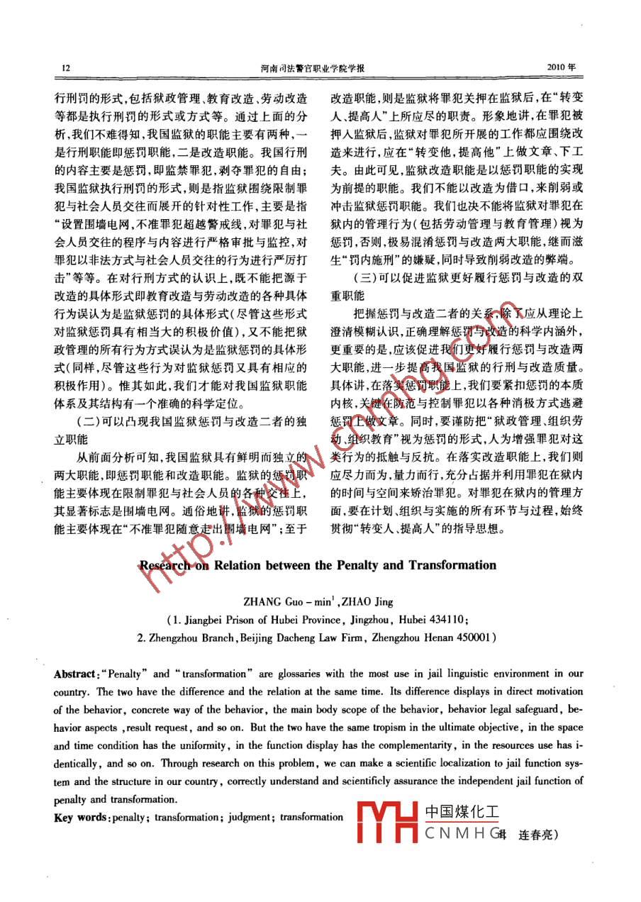 第8卷第3期河南司法警官職業(yè)學(xué)院學(xué)報(bào)2010年9月Vol 8 Na. 3Journal of Henan Judicial Police Vocational CollegeSeptember, 2010懲罰與改造的關(guān)系新探張國(guó)敏,趙靜(1.湖北江北監(jiān)獄,湖北荊州43410;2,北京大成律師事務(wù)所鄭州分所,河南鄭州45000◆◆。*…令·令摘要:“懲罰”與“改造”是我國(guó)監(jiān)獄語(yǔ)境中使用頻率最多的詞語(yǔ)。二者既有區(qū)別又有聯(lián)系。其區(qū)別表現(xiàn)在行為的直接動(dòng)機(jī)、行為的具體方式、行為的主體范圍、行為的法律保障、行為的結(jié)果要求等方面均不同。但是,二者在最終目標(biāo)上具有同向性,時(shí)空條件上具有一致性,功能發(fā)揮上具有互補(bǔ)性,資源利用上具有同一性等。通過(guò)對(duì)這一問題的研究,對(duì)我國(guó)監(jiān)獄職能體系及其結(jié)構(gòu)做出一個(gè)科學(xué)的定位,正確理解與科學(xué)把握懲罰與改造這一獨(dú)立的監(jiān)獄職能。關(guān)鍵詞:懲罰;改造;報(bào)應(yīng);矯正中圖分類號(hào):DF87文獻(xiàn)標(biāo)識(shí)碼:A文章編號(hào):1672-2663(2010)03-0009-04◆*嶺********令心眾所周知,“懲罰”與“改造”是我國(guó)監(jiān)獄語(yǔ)境中造的要義所在。使用頻率最多的詞語(yǔ),“懲罰”與“改造”也是我國(guó)監(jiān)從理論與實(shí)踐看,懲罰與改造這兩種行為有著獄的兩大職能。按理說(shuō),我們對(duì)二者的內(nèi)涵及其相以下不同點(diǎn):互關(guān)系應(yīng)有科學(xué)的定位和準(zhǔn)確的認(rèn)知,但從現(xiàn)有的(一)行為的直接動(dòng)機(jī)不同監(jiān)獄理論研究文章及現(xiàn)實(shí)實(shí)踐看,仍有不少同志對(duì)在這里,懲罰作為監(jiān)獄對(duì)罪犯所執(zhí)行的特殊刑其認(rèn)識(shí)是模糊的,甚至是偏頗的。因此,加強(qiáng)二者的罰,顯然具有刑罰的特質(zhì)。我們知道,刑罰是統(tǒng)治階內(nèi)涵及其相互關(guān)系的研究十分必要。級(jí)打擊犯罪懲治犯罪的最為嚴(yán)厲的一種強(qiáng)制手段,、懲罰與改造的區(qū)別點(diǎn)其效應(yīng)是通過(guò)對(duì)罪犯施加打擊與懲治而體現(xiàn)出來(lái)懲罰,在監(jiān)獄語(yǔ)境中,是監(jiān)獄執(zhí)行刑罰的代名詞,的。這表明,監(jiān)獄懲罰的直接動(dòng)機(jī)在于打擊與懲治其特定內(nèi)涵為:監(jiān)獄代表國(guó)家對(duì)罪犯的人身自由實(shí)施而不是其他,這就是我們常說(shuō)的“報(bào)應(yīng)”。它給罪犯相應(yīng)程度的限制使罪犯與社會(huì)環(huán)境相對(duì)隔離開來(lái),的直觀感受就是“失去了利益,遭受了痛苦”。而改其主要標(biāo)志是“圍墻電網(wǎng)”。使罪犯在相應(yīng)程度上喪造則不同,它緊扣思想決定行為的規(guī)律,刻意在罪犯失人身自由,是監(jiān)獄懲罰的核心要義。在這里,懲罰受刑的同時(shí),努力在改變罪犯的錯(cuò)誤思想上有所作與監(jiān)獄對(duì)服刑人員在獄內(nèi)違紀(jì)所施加的批評(píng)扣分,為使罪犯真正有所轉(zhuǎn)變。其直接動(dòng)機(jī)是使罪犯甚至禁閉的“處罰”有本質(zhì)的區(qū)別。換言之,處罰不“消除錯(cuò)誤的思想,形成正確的觀點(diǎn),提升科學(xué)的認(rèn)在懲罰之列,懲罰具有特指性與確定性限制罪犯與知”避免罪犯一錯(cuò)再錯(cuò),失去更大的利益與機(jī)會(huì)。社會(huì)人員(主要指監(jiān)獄內(nèi)的民警與服刑人員以外的社改造與懲罰不同,它并沒有從動(dòng)機(jī)到行為,使罪犯在會(huì)人員)交往才是懲罰的應(yīng)有內(nèi)涵。物質(zhì)利益和人身自由上受到損失,遭遇不幸,相反,在我國(guó)監(jiān)獄語(yǔ)境中,改造則主要強(qiáng)調(diào)消除罪犯它顯然出于一種善意,出于拯救與重塑。從這個(gè)角的犯罪思想扭轉(zhuǎn)罪犯的不良行為習(xí)慣使其樹立符度講改造還是一種撫慰的手段。運(yùn)用好改造手段,合社會(huì)進(jìn)步要求的觀念,養(yǎng)成良好的為人處世態(tài)度還可以有效安撫罪犯因遭受國(guó)家刑罰打擊而導(dǎo)致的與習(xí)慣。從我國(guó)監(jiān)獄改造理論來(lái)看,強(qiáng)調(diào)“改造人”心靈創(chuàng)傷主要是改造人的錯(cuò)誤世界觀,應(yīng)該是理論界的主流(二)行為的具體方式不同觀點(diǎn)。由此可見,努力實(shí)現(xiàn)罪犯世界觀的轉(zhuǎn)變,是改監(jiān)獄懲罰的核心要義在于使罪犯的人身自由受M凵中國(guó)煤化工收稿日期:2010-06-03CNMHG作者簡(jiǎn)介:1.張國(guó)敏(1966-),男,湖北監(jiān)利人,中國(guó)監(jiān)獄學(xué)會(huì)會(huì)員了,北監(jiān)獄學(xué)分會(huì)秘書長(zhǎng),主要從事監(jiān)獄學(xué)基礎(chǔ)理論研究;2趙靜(1968-),女,河南鄭州人,北京大成律師事務(wù)所鄭州分所律師河南司法警官職業(yè)學(xué)院學(xué)報(bào)2010年到相應(yīng)程度的剝奪。從監(jiān)獄實(shí)踐來(lái)看,就是使罪犯看,我們并不認(rèn)為“組織勞動(dòng)與思想教育”是監(jiān)獄懲在與社會(huì)人員交往上受到相應(yīng)程度的限制。監(jiān)獄為罰的具體形式。了實(shí)施這種懲罰,采取的相應(yīng)行為主要是設(shè)置圍墻前面著重探析了監(jiān)獄懲罰的具體行為,那么,改電網(wǎng),設(shè)立警戒區(qū)域制定和落實(shí)罪犯與社會(huì)人員交造的具體行為與方式是什么呢?從理論與實(shí)踐看,往的審批制度,利用監(jiān)控設(shè)備監(ji