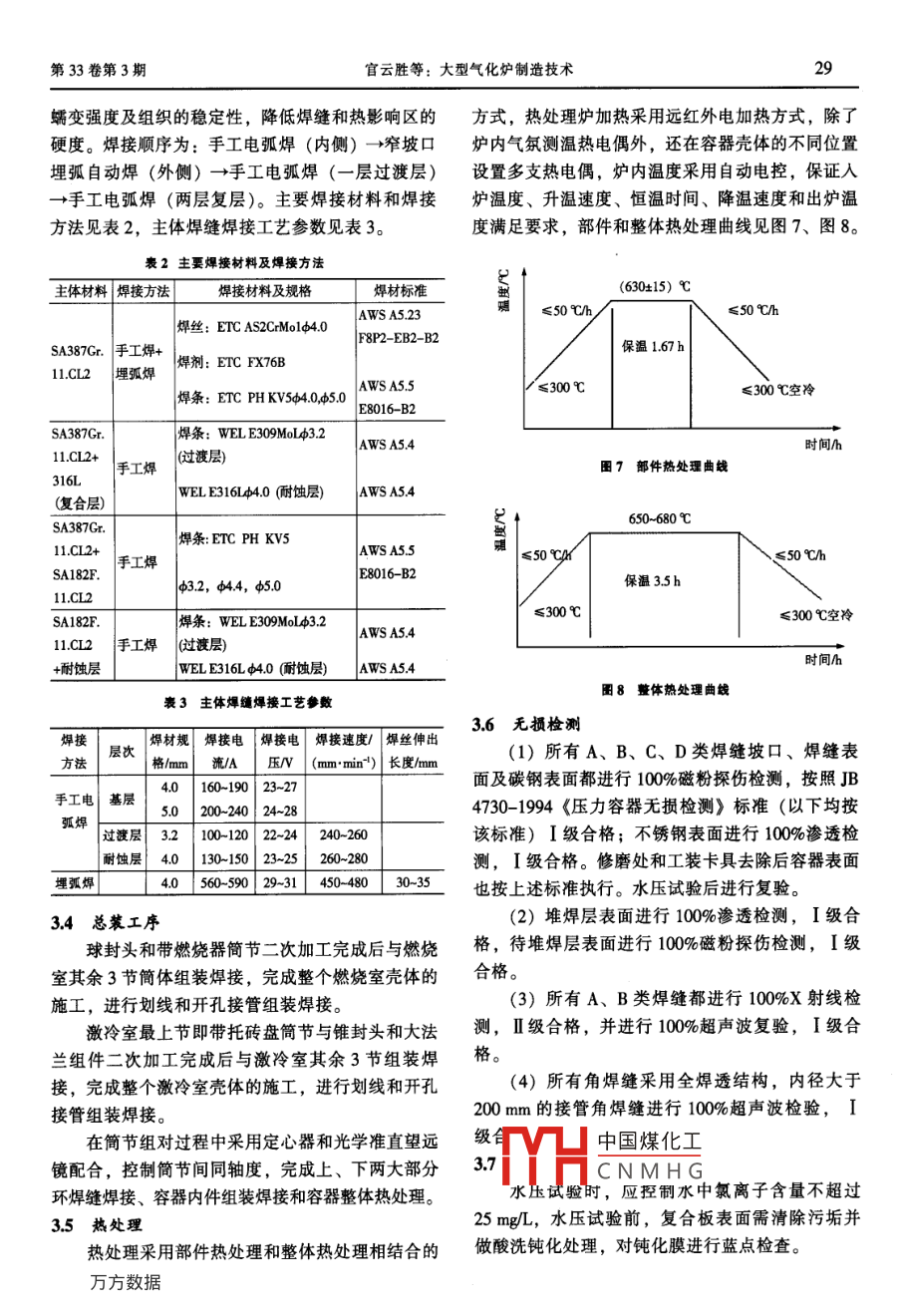 26石油工程建設(shè)2007年6月《)《)(《*《xC《沖《)《《)、《*了沖《)《★《))了《)三★★(★()(了★)(《了所)(★大型氣化爐制造技術(shù)官云勝,郭晚春(大慶油田建設(shè)集團(tuán)建材公司,黑龍江大慶163453)摘要:氣化爐是煤化工的核心設(shè)備,大慶油田金屬結(jié)構(gòu)廠與哈爾濱鍋爐廠合作,為某大型石化企業(yè)制造了一臺(tái)側(cè)壁4個(gè)燒嘴對(duì)置式新型氣化爐,該氣化爐是目前國(guó)內(nèi)同類(lèi)產(chǎn)品中最大的氣化爐。文章介紹了該氣化爐的結(jié)構(gòu)、技術(shù)特性及制造技術(shù)要求,闡述了其制造工藝、關(guān)鍵技術(shù)和質(zhì)量保證措施,包括筒體成型、機(jī)加工、組裝焊接、熱處理、組件二次加工及精密檢測(cè)等。通過(guò)采取系列工藝措施,實(shí)現(xiàn)了氣化爐的各項(xiàng)設(shè)計(jì)指標(biāo),保證了產(chǎn)品的制造精度,氣化爐一次投料成功。關(guān)鍵詞:氣化爐;制造工藝;精度控制中圖分類(lèi)號(hào):TE963文獻(xiàn)標(biāo)識(shí)碼:B文章編號(hào):1001-2206(2007)03-0026-05發(fā)展煤化工是緩解國(guó)家能源緊張的重要途徑之備用燃燒器法蘭氣化爐是煤化工的核心設(shè)備,在引進(jìn)德士古等球封頭國(guó)外技術(shù)的同時(shí),國(guó)內(nèi)開(kāi)發(fā)了4個(gè)燒嘴對(duì)置式新型燃燒器法蘭氣化爐,形成了具有自主知識(shí)產(chǎn)權(quán)的技術(shù),大慶油燃燒器筒節(jié)田金屬結(jié)構(gòu)廠與哈爾濱鍋爐廠合作,為某大型石化燃燒室企業(yè)制造了一臺(tái)目前國(guó)內(nèi)同類(lèi)產(chǎn)品中最大的氣化8爐,該氣化爐現(xiàn)已投人運(yùn)行。托磚盤(pán)筒節(jié)1產(chǎn)品結(jié)構(gòu)及技術(shù)特性該氣化爐爐殼由燃燒室、激冷室、頂部備用燒8244D3392嘴、4個(gè)對(duì)置側(cè)壁燒嘴、托磚盤(pán)等部件組成。燃燒室內(nèi)徑3400mm,材質(zhì)SA387G:11CL2,厚度82mm,麟路如ncm錐封頭筒節(jié)激冷室內(nèi)徑為3392mm,材質(zhì)SA387Gr.11CL2+316L,復(fù)合板厚(82+4)mm。設(shè)備總質(zhì)量1997t,為第3類(lèi)壓力容器,設(shè)計(jì)壓力為48MPa,工作壓圖1氣化爐結(jié)構(gòu)示意力40MPa2主要制造技術(shù)要求氣化爐其他技術(shù)參數(shù)見(jiàn)表1,結(jié)構(gòu)見(jiàn)圖1。該設(shè)備不僅具有一般氣化爐的制造難度,如衰1氣化爐技術(shù)參數(shù)SA387Gr11CI2低合金耐熱鋼(厚82mm)加項(xiàng)目316L超低碳不銹鋼(厚4mm)復(fù)合板的焊接、錐燃燒室激冷室體成型和整體熱處理等,且采用對(duì)置式燃燒器,所殼體設(shè)計(jì)溫度代以對(duì)燃燒器的方位、管口方位和密封面等加工精度殼體工作溫度210工作介質(zhì)高溫煤氣、溶渣|煤氣、溶渣、黑水提出了更高的要求,具體要求如下:腐蝕余量/mm中國(guó)煤化工袖線(xiàn)應(yīng)處于同一平面焊接接頭系數(shù)偏差CNMHG法蘭沿圓周均布;每全容積/m42.5兩個(gè)相對(duì)的側(cè)壁燒嘴法蘭同軸度偏差不大于3mm保溫層厚度m安裝后法蘭面與軸線(xiàn)的垂直度不大于1mm;法充水后質(zhì)量/kg386195蘭軸線(xiàn)與殼體軸線(xiàn)的垂直度不大于2mm第33卷第3期官云勝等:大型氣化爐制造技術(shù)(2)頂部燒嘴安裝法蘭與殼體的同軸度偏差不件結(jié)構(gòu)如圖2所示大于5mm,法蘭與軸線(xiàn)的垂直度不大于3mm。燃燒器法蘭(3)液位計(jì)兩接管距離允差為±15mm;通過(guò)兩接管中心垂線(xiàn)的間距不大于15mm;法蘭面的24-M48×3密封槽垂直度公差不大于05%。(4)托磚盤(pán)上托磚板水平度偏差不大于8mm。D34003制造工藝及質(zhì)量保證措施31咸型田2球封頭組爆件結(jié)構(gòu)示意激冷室筒體規(guī)格為3392mmx(82+4)mm,3.2.2燃燒器筒節(jié)材質(zhì)SA387Gr11CL2+316L,復(fù)合板為正火+回火在該筒節(jié)的同一標(biāo)高處周向均勻布置4個(gè)主燃狀態(tài)供貨,不允許熱成型,因奧氏體不銹鋼的敏化溫度在450~850℃,為提高材料塑性,防止厚板卷燒器,對(duì)其法蘭精度提出了很高要求,是該設(shè)備制造關(guān)鍵控制點(diǎn)。燃燒器法蘭單個(gè)零件加工時(shí),由于制脆性,故采用150~200℃卷制成型的方法。錐封頭的大口直徑為3392mm,下口直徑為其密封形式采用八角墊結(jié)構(gòu),為了保證尺寸精度,密封面及法蘭內(nèi)孔留二次機(jī)加工余量,八角槽暫不1575mm,材質(zhì)SA387Cr11.CI2+316L,厚度(844)mm,高度1580mm。將錐體按展開(kāi)尺寸加工,待與筒節(jié)組裝焊接及中間熱處理后,再二次加工燃燒器法蘭密封面及八角槽(與八角墊配合加分4等份下料,在直邊和高度方向各預(yù)留50mm工),并同時(shí)加工法蘭內(nèi)孔,采用加工中心設(shè)備的單邊余量,在壓力機(jī)上壓型,并用徑向和弧向樣次鏜加工完成,以保證兩對(duì)應(yīng)燃燒器法蘭的同心度板檢驗(yàn),同時(shí)檢驗(yàn)對(duì)角線(xiàn)翹曲,合格后對(duì)直邊進(jìn)行要求二次切割,上下直口待機(jī)加工,組焊后在滾板機(jī)上進(jìn)行校型,壓制校型溫度為150~200℃筒節(jié)上、下端口采用機(jī)加工,先加工成平口并留有加工余量,保證單節(jié)筒節(jié)平行和垂直度。在筒采用上述方法可以保證筒節(jié)和錐體橢圓度節(jié)上內(nèi)外端部及開(kāi)孔中心畫(huà)出0°,90°,180°,≤5mm,使不銹鋼復(fù)合層對(duì)口錯(cuò)邊量≤2mm,棱270°方位基準(zhǔn)線(xiàn)。在開(kāi)孔前焊接具有足夠剛度的防角度≤3mm,滿(mǎn)足技術(shù)要求