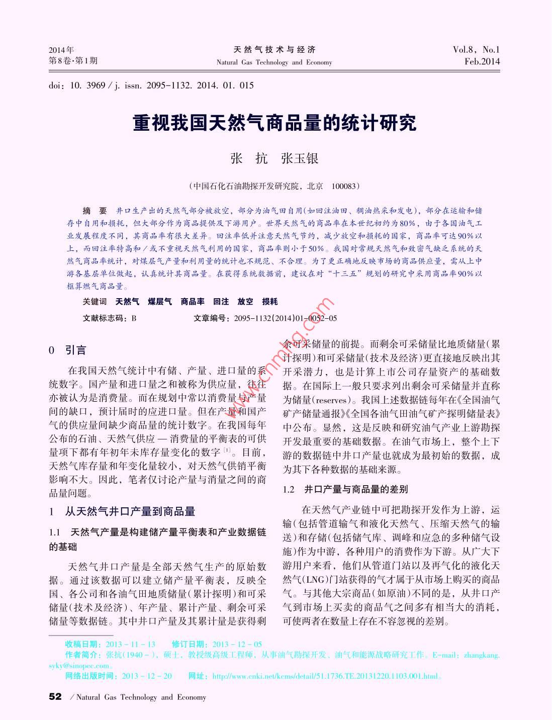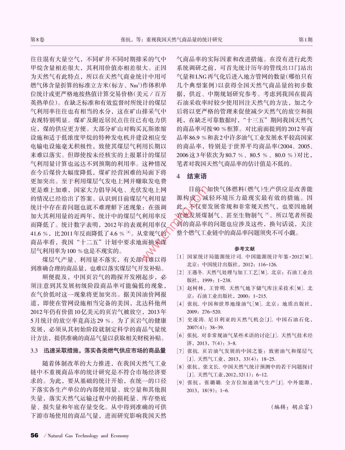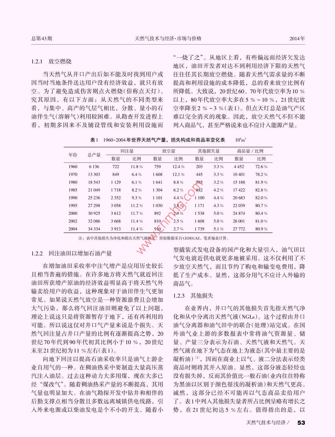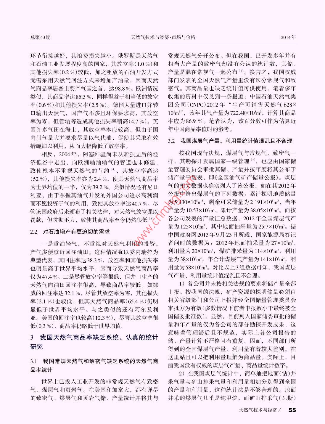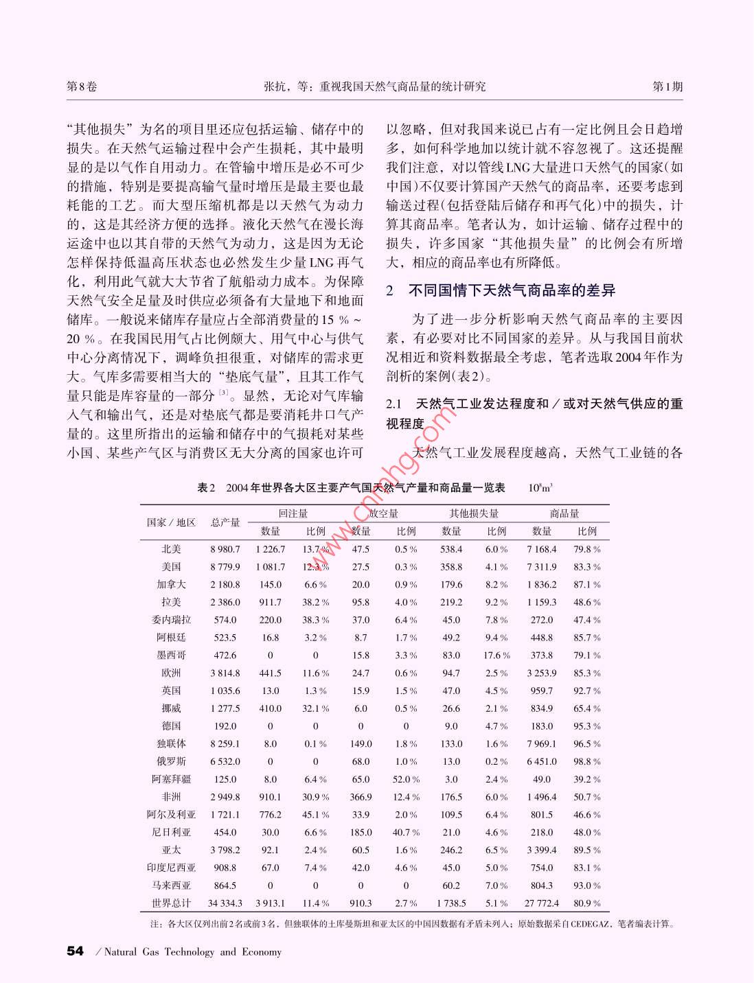 2014年天然氣技術(shù)與經(jīng)濟Vol.8, No.1第8卷.第1期Natural Gas Technology andconomyFeb.2014doi: 10. 3969/ j. issn. 2095-1132. 2014. 01. 015重視我國天然氣商品量的統(tǒng)計研究,張抗張玉銀(中國石化石油勘探開發(fā)研究院,北京100083)摘要井口生產(chǎn)出的天然氣部分被放空,部分為油氣田自用(如回注油田、稠油熱采和發(fā)電),部分在運輸和儲存中自用和損耗,但大部分作為商品提供及下游用戶。世界天然氣的商品率在本世紀(jì)初約為80%,由于各國油氣工業(yè)發(fā)展程度不同,其商品率有很大差異。回注率低并注意天然氣節(jié)約,減少放空和損耗的國家,商品率可達90%以上,而回注率特高和/或不重視天然氣利用的國家,商品率則小于50%。我國對常規(guī)天然氣和致密氣缺乏系統(tǒng)的天然氣商品率統(tǒng)計,對煤層氣產(chǎn)量和利用量的統(tǒng)計也不規(guī)范、不合理。為了更正確地反映市場的商品供應(yīng)量,需從上中游各基層單位做起,認(rèn)真統(tǒng)計其商品量。在獲得系統(tǒng)數(shù)據(jù)前,建議在對“十三五”規(guī)劃的研究中采用商品率90%以框算燃氣商品量。關(guān)鍵詞天然氣煤層氣商品率回注放空損耗文獻標(biāo)志碼: B文章編號: 2095-1132(2014)01-0052-050引言余可采儲量的前提。而剩余可采儲量比地質(zhì)儲量(累計探明)和可采儲量(技術(shù)及經(jīng)濟)更直接地反映出其在我國天然氣統(tǒng)計中有儲、產(chǎn)量、進口量的系開采潛力, 也是計算上市公司存量資產(chǎn)的基礎(chǔ)數(shù)統(tǒng)數(shù)字。國產(chǎn)量和進口量之和被稱為供應(yīng)量,往往據(jù)。在國際上--般只要求列出剩余可采儲量并直稱亦被認(rèn)為是消費量。而在規(guī)劃中常以消費量與產(chǎn)量為儲量(reserves)。我國上述數(shù)據(jù)鏈每年在《全國油氣間的缺口,預(yù)計屆時的應(yīng)進口量。但在產(chǎn)量和國產(chǎn)礦產(chǎn)儲量通報》《全國各油氣田油氣礦產(chǎn)探明儲量表》氣的供應(yīng)量間缺少商品量的統(tǒng)計數(shù)字。在我國每年中公布。顯然,這是反映和研究油氣產(chǎn)業(yè)上游勘探公布的石油、天然氣供應(yīng)一消費量的平衡表的可供開發(fā)最重要的基礎(chǔ)數(shù)據(jù)。在油氣市場上,整個上下量項下都有年初年未庫存量變化的數(shù)字用。目前,游的數(shù)據(jù)鏈中井口產(chǎn)量也就成為最初始的數(shù)據(jù),成天然氣庫存量和年變化量較小,對天然氣供銷平衡為其下各種數(shù)據(jù)的基礎(chǔ)來源。影響不大。因此,筆者僅討論產(chǎn)量與消量之間的商1.2井口產(chǎn)量與商品量的差別品量問題。1從天然氣井口產(chǎn)量到商 品量在天然氣產(chǎn)業(yè)鏈中可把勘探開發(fā)作為上游,運1.1天然氣產(chǎn)量是構(gòu)建儲產(chǎn)量平衡表和產(chǎn)業(yè)數(shù)據(jù)鏈輸(包括管道輸氣和液化天然氣、壓縮天然氣的輸送)和存儲(包括儲氣庫、調(diào)峰和應(yīng)急的多種儲氣設(shè)的基礎(chǔ)施)作為中游,各種用戶的消費作為下游。從廣大下天然氣井口產(chǎn)量是全部天然氣生產(chǎn)的原始數(shù)游用戶來看,他們從管道門站以及再氣化的液化天據(jù)。通過該數(shù)據(jù)可以建立儲產(chǎn)量平衡表,反映全然氣(LNG)F ]站獲得的氣才屬于從市場上購買的商品國、各公司和各油氣田地質(zhì)儲量(累計探明)和可采氣。與其他大宗商品(如原油)不同的是,從井口產(chǎn)儲量(技術(shù)及經(jīng)濟)、年產(chǎn)量、累計產(chǎn)量、剩余可采氣到市 場上買賣的商品氣之間多有相當(dāng)大的消耗,儲量等數(shù)據(jù)鏈。其中井口產(chǎn)量及其累計量是獲得剩可使兩者在數(shù)量上存在不容忽視的差別。收稿日期: 2013-11-13修訂日期: 2013-12-05作者簡介:張抗(1940-),碩士,教授級高級工程師,從事油氣勘探開發(fā)、油氣和能源戰(zhàn)略研究工作。E-mail: zliangkang.網(wǎng)絡(luò)出版時間: 2013- 12- 20網(wǎng)址: hp:/:/w eninetlkemdeail/51.1736.TE.20131220.1 103.00.hml.52 ! Natural Gas Technology and Economy總第43期天然氣技術(shù)與經(jīng)濟市場與價格2014年“一燒了之”。從地區(qū)上看,有些偏遠而經(jīng)濟欠發(fā)達1.2.1放空燃燒地區(qū),油田開發(fā)者對達不到利用經(jīng)濟下限的天然氣當(dāng)天然氣從井口產(chǎn)出后如不能及時找到用戶或往往任其長期放空燃燒。隨著天然氣需求量的不斷因當(dāng)時當(dāng)?shù)貤l件送達用戶沒有經(jīng)濟效益,就只有放提 高和利用設(shè)施的成本降低,總的看來放空比例有空。為了避免造成傷害則點火燃燒(俗稱點天燈)。所降低。 大致說,20世紀(jì)60、70年代放空率為10 %究其原因,有以下方面:從天然氣的不同類型來以上,80年代放空率大多在5 % ~ 10 %,21世紀(jì)放看,與集中、高產(chǎn)的氣層氣相比,分散、量小的石空率降至2 %~3 %(表1)。但點天燈總是油氣產(chǎn)區(qū)油伴生氣(溶解氣)利用較困難。從勘查開發(fā)進程上難以完全消滅的現(xiàn)象。因此,放空天然氣不但不能看,初期多因來不及鋪設(shè)管線和安裝利用設(shè)施而列入商品氣,甚至嚴(yán)格說來也不應(yīng)計人能源產(chǎn)量。表1 1960-2004 年世界天然氣產(chǎn)量、損失構(gòu)成和商品率變化表10'm'回注量放空量其他損失量商品量/比例年份總產(chǎn)量數(shù)量比例1960613672211.8%759 12.4 %033.3 %445272.69197013 3036.4%453.3%10 40178.2%98018