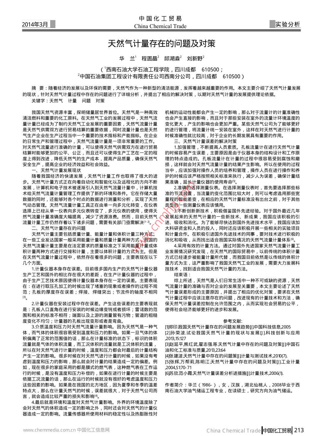 中國化工貿(mào)易014年3月China Chemical Trade實(shí)驗(yàn)分析天然氣計(jì)量存在的問題及對策華蘭程圓晶2邱湖淼2劉新野2(西南石油大學(xué)石油工程學(xué)院,四川成都6105002中國石油集團(tuán)工程設(shè)計(jì)有限責(zé)任公司西南分公司,四川成都610500)摘要:隨著經(jīng)濟(jì)的發(fā)展以及環(huán)保的需要,天然氣作為一種新型的清潔能源,發(fā)揮著越來越重要的作用。本文主要介紹了天然氣計(jì)量發(fā)展的現(xiàn)狀,針對夭然氣計(jì)量過程中存在的問題進(jìn)行了詳細(xì)分析,并提出了相應(yīng)的解決對策,以期對天然氣計(jì)量的發(fā)展提供理論依據(jù)關(guān)鍵字:天然氣計(jì)量問題對策我國天然氣資源豐富,探明儲(chǔ)量居世界首位。天然氣是一種高效機(jī)械的運(yùn)動(dòng)性能都會(huì)產(chǎn)生一定的影響,那么對于流量計(jì)的計(jì)量準(zhǔn)確性凊潔燃料和重要的化工原料。在天然氣工業(yè)的發(fā)展過程中,天然氣流也會(huì)產(chǎn)生直接的影響,而且對于那些安裝在室外的流量計(jì)環(huán)境溫度的量計(jì)量已經(jīng)成為了制約天然氣工業(yè)發(fā)展的重要因素,天然氣流量計(jì)量變化更大,產(chǎn)生的影響也會(huì)更加嚴(yán)重。某些天然氣公司為了能夠更好是天然氣供需雙方進(jìn)行貿(mào)易結(jié)算的重要依據(jù),同時(shí)流量計(jì)量也是天然的進(jìn)行管理,將流量計(jì)統(tǒng)一安裝在室外,這樣在對天然氣進(jìn)行計(jì)量的氣生產(chǎn)企業(yè)在生產(chǎn)過程當(dāng)中一個(gè)重要旳技術(shù)指標(biāo)和產(chǎn)能指標(biāo)。在企業(yè)時(shí)候準(zhǔn)確性就比較高,對于企業(yè)的長期發(fā)展具有重要的作用的日常生產(chǎn)和管理過程中,天然氣流量計(jì)量是一項(xiàng)非常重要的工作。三、天然氣計(jì)量誤差的解決對策對天然氣流量進(jìn)行準(zhǔn)確的計(jì)量,可以使得天然氣供需雙方在進(jìn)行貿(mào)易1加強(qiáng)管理,不斷提高人員素質(zhì)??装辶髁坑?jì)在進(jìn)行天然氣計(jì)量結(jié)算時(shí)能夠更加的公平、公正,而且還可以使得生產(chǎn)工藝在一定的程的時(shí)候容易產(chǎn)生誤差,主要原因是由于儀器本身的結(jié)構(gòu)設(shè)計(jì)和工作原度上得到改進(jìn),降低天然氣的生產(chǎn)成本,提高產(chǎn)品質(zhì)量,確保天然氣理的特點(diǎn)造成的??装辶髁坑?jì)在計(jì)量的過程中很容易受到腐蝕和磨安全生產(chǎn),提高企業(yè)的經(jīng)濟(jì)效益和社會(huì)效益損,這樣就會(huì)對天然氣流量計(jì)量的結(jié)果產(chǎn)生影響。所以在使用的過程一、天然氣計(jì)量發(fā)展現(xiàn)狀當(dāng)中,應(yīng)該加強(qiáng)對操作人員的培養(yǎng)和管理,操作人員在進(jìn)行操作和養(yǎng)隨著我國經(jīng)濟(jì)的快速發(fā)展,天然氣計(jì)量工作也取得了很大的進(jìn)護(hù)的時(shí)候應(yīng)該嚴(yán)格按照相關(guān)標(biāo)準(zhǔn)來執(zhí)行,減少人為誤差,確保計(jì)量結(jié)天然氣計(jì)量方式正在向著自動(dòng)化和智能化以及遠(yuǎn)程化的方向不斷果準(zhǔn)確,延長計(jì)量儀器的使用壽命。發(fā)展,計(jì)箅機(jī)和電子技術(shù)被逐漸引入到天然氣流量計(jì)量中,計(jì)算機(jī)技2準(zhǔn)確的選擇測量儀表。在選擇測量儀表時(shí),首先要選擇那些標(biāo)術(shù)給天然氣流量計(jì)量管理工作提供了新的環(huán)境和條件。它在存儲(chǔ)大量準(zhǔn)的節(jié)流裝置,當(dāng)流量的變化范圍比較大時(shí),則可以考慮選用那些寬數(shù)據(jù)的同時(shí),還能夠?qū)Ω鱾€(gè)時(shí)點(diǎn)的數(shù)據(jù)進(jìn)行測量和分析,實(shí)現(xiàn)了天然量程的智能差變,在相應(yīng)的天然氣計(jì)量標(biāo)準(zhǔn)沒有出臺(tái)之前,對于其他天然氣流量計(jì)量工具正在由單一向多元化轉(zhuǎn)變,在儀表類型的一些測量儀表應(yīng)該慎用。選擇上已經(jīng)從單一儀表向多元儀表轉(zhuǎn)變了,多元儀表的使用,使得天3.不斷創(chuàng)新新技術(shù),積極借鑒國外先進(jìn)經(jīng)驗(yàn)。對于國外最近幾年然氣流量計(jì)量準(zhǔn)確度大幅提高,減少了資源浪費(fèi)。然而,目前天然氣發(fā)展起來的天然氣計(jì)量的一些新技術(shù)、新成果,我國應(yīng)該積極的引流量計(jì)量工作仍然存著以下諸多問題,需要有關(guān)部門亟需解決。進(jìn)、吸收和消化。為了能夠盡快達(dá)到國外先進(jìn)技術(shù)水平,我國應(yīng)該加天然氣計(jì)量存在的問題大科研資金和人員的投入,同時(shí)還應(yīng)該積極開展一些相關(guān)的實(shí)驗(yàn)項(xiàng)目天然氣計(jì)量主要包括質(zhì)量計(jì)量、能量計(jì)量和體積計(jì)量三種方式。和計(jì)量合作。在積極引進(jìn)國外先進(jìn)技術(shù)的同事,要對技術(shù)進(jìn)行積極的在一些工業(yè)發(fā)達(dá)國家一般采用能量計(jì)量和質(zhì)量計(jì)量兩種方式,我國的消化和吸收,從而找出適合我國實(shí)際情況的天然氣流量計(jì)量體系天然氣流量計(jì)量主要是在法定要求的質(zhì)量標(biāo)準(zhǔn)之下采用能量計(jì)量或體4采用有效的計(jì)量方法。通過對國外先進(jìn)國家天然氣流量計(jì)量工積計(jì)量兩種方式進(jìn)行交接和計(jì)量,主要以體積計(jì)量的方式為主。但是業(yè)發(fā)
