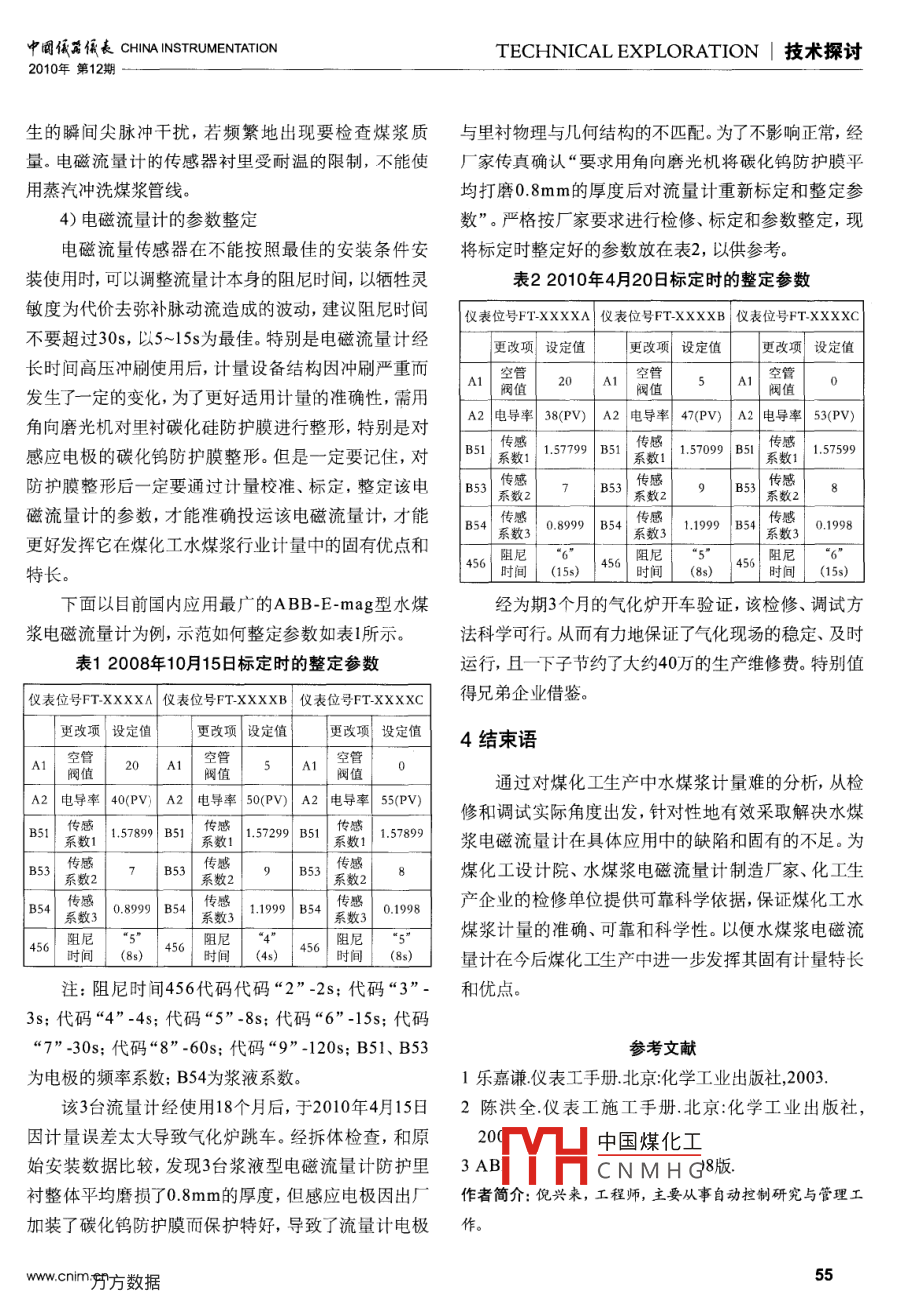 中儀佤長(zhǎng) CHINA INSTRUMENTATIONTECHNICAL EXPLORATION技術(shù)探討2010年第12期漿液型電磁流量計(jì)在煤化工水煤漿行業(yè)的研究應(yīng)用Research and Improvement of Strach a Liquid Typethe electromagnetism Flowmeter in the coal chemicalEngineering Water Coal Syrup Profession1引言倪興來薛凌飛(兗州煤業(yè)榆林能化有限公司,1990年山東魯南化肥廠在中國(guó)第一家成功引進(jìn)了陜西榆林719000德士古”型氣化爐制煤氣技術(shù),隨之“對(duì)置式四噴嘴新型氣化爐制煤氣技術(shù)”、“魯奇BGL氣化爐制煤氣技摘要:通過對(duì)水煤漿計(jì)量難的科學(xué)分析,對(duì)電磁流術(shù)”、“西門子GSP氣化爐制煤氣技術(shù)”、“GE高壓氣量計(jì)的出廠特殊加工、現(xiàn)場(chǎng)安裝使用、檢修和化爐制煤氣技術(shù)”等氣化爐制煤氣技術(shù)很快在中國(guó)得調(diào)試實(shí)際應(yīng)用研究,認(rèn)為為漿液型電磁流量計(jì)「到了突飛猛進(jìn)的發(fā)展,而所有的氣化爐制煤氣工藝控在煤化工有廣闊的應(yīng)用前景。制的核心技術(shù)是對(duì)經(jīng)過磨煤機(jī)磨化篩選、煤漿泵加壓關(guān)鍵詞:煤化工水煤漿漿液型電磑流量計(jì)計(jì)量「后的水煤漿流暈與工藝氧流量比科學(xué)、準(zhǔn)確監(jiān)控。參數(shù)整定目前,工藝氧流量測(cè)量技術(shù)巳經(jīng)足夠成熟。但新型的煤化工工藝和惡劣多變的現(xiàn)場(chǎng)條件,導(dǎo)致特殊工Abstract: Pass to calculate difficult science analysis to況的水煤漿介質(zhì)流量監(jiān)測(cè)不穩(wěn)定性始終困惑著各個(gè)water coal syrup, to of the electromagnetism flowmeter煤化工企業(yè)與流量計(jì)廠家。因此,攻克煤化工水煤漿the factory Be special to process, the spot usage流量監(jiān)測(cè)的技術(shù)難題就成了眾多流量計(jì)廠家的奮斗目gearing, check fix and adjust to try actual application tistudy, for strach liquid type's electromagnetism經(jīng)眾多流量計(jì)廠家和煤化工企業(yè)共同開發(fā)、研flowmeter is at the coal chemical engineering究、篩選和應(yīng)用,一致總結(jié)出:到目前為止,速度式測(cè)application middle finger the applied foreground of量原理的“漿液型電磁流量計(jì)”是測(cè)量煤化工水煤漿science and vast流量的最佳首選流量計(jì)。Key words: Coal chemical engineering但是在電磁流量計(jì)實(shí)際使用過程中存在著工頻干Water coal starches擾噪聲、流體介質(zhì)特性產(chǎn)生的電化學(xué)干擾嘈聲、供電電Strach a liquid type electromagnetism源性等干擾,造成了相應(yīng)的水煤漿計(jì)量難flow-meter2煤中國(guó)煤化工比隹點(diǎn)Calculate The parameter is whole to settle什HCNMHG21水煤漿成分復(fù)雜因煤炭在采掘過程中含有鐵絲、銅絲等金屬屑,www.cnim沔方數(shù)據(jù)技術(shù)探討| TECHNICAL EXPLORATIONCHINA INSTRUMENTATION*闞低長(zhǎng)2010年第12期通過皮帶輸送到棒磨機(jī)或球磨機(jī)里,和造紙廢液、甲形成極化電壓,會(huì)加大電磁流暈計(jì)本身的測(cè)量精度和醇廢水等添加劑進(jìn)行研磨,生成含量為60%~70%、操進(jìn)一步造成增大波動(dòng)量。而不銹鋼管線基本不存在此作密度為1250~1286kg/m3動(dòng)力粘度為700~3000cp問題。的水煤漿。棒磨機(jī)或球磨杋在研磨煤炭碰撞會(huì)進(jìn)一步脫落部分金屬顆粒,后續(xù)設(shè)備不可能完全過濾、去除3漿液型電磁流量計(jì)的應(yīng)用研究水煤漿中含有金屬顆粒,計(jì)量過程中的沖擊和磨損容3.1電磁流量計(jì)的特別安裝要求易造成加壓泵及其它計(jì)量主輔設(shè)備的易損壞。嚴(yán)格按照電磁流量計(jì)安裝要求安裝,并且盡可能22水煤漿介質(zhì)特性影響地將3臺(tái)電磁流量計(jì)安裝在汽化爐頂部。延長(zhǎng)流量計(jì)在測(cè)量水煤漿、泥漿等液、固兩相混合導(dǎo)電性介的前直管段是解決煤漿加壓泵工作時(shí)造成脈動(dòng)的最質(zhì)流量時(shí),在固體顆?;蛘呃w維介質(zhì)擦過電極表面佳辦法。時(shí),電級(jí)表面的接觸電化學(xué)電勢(shì)突然變化,造成從傳3.2電磁流量計(jì)的特殊加工感器輸出的電極檢測(cè)信號(hào)出現(xiàn)尖脈沖漿液(干擾)噪用專用量具量出電磁流量計(jì)的法蘭接口尺寸并經(jīng)聲,它將造成顯示和信號(hào)輸出波動(dòng),波動(dòng)量大小與傳計(jì)算和設(shè)計(jì),用316錳絡(luò)合金等特殊材質(zhì)加工成接口感器的勵(lì)磁電流頻率lf的頻譜特性關(guān)系。金屬顆粒的法蘭的防護(hù)沖刷磨損套。對(duì)電磁流量計(jì)的腔室渡上碳摩擦?xí)a(chǎn)生更加嚴(yán)重的瞬間尖脈沖干擾,最終造成電化硅(對(duì)電磁干擾有防護(hù)作用)防護(hù)沖刷磨損膜。對(duì)磁流量信號(hào)所受干擾嚴(yán)重而導(dǎo)致測(cè)量不穩(wěn)定。電磁流量計(jì)感應(yīng)電極度上碳化鎢防護(hù)沖刷磨損膜23加壓泵的影響33電磁流量計(jì)使用建議加壓泵工作時(shí)存在脈動(dòng)流是必然的。在水煤漿(1)在單機(jī)試車階段嚴(yán)禁對(duì)電磁流量計(jì)送電,先制造及普通鍋爐燃燒的加壓環(huán)節(jié)基本上采用“螺杄做好煤漿循環(huán)管線磨損防護(hù),利用水煤漿對(duì)煤漿管線泵”,因其結(jié)構(gòu)及工作方式在不同的轉(zhuǎn)速下脈動(dòng)流內(nèi)壁除銹,否則鐵銹會(huì)被電磁傳感器內(nèi)壁的磁場(chǎng)吸附的波動(dòng)量很小(波動(dòng)量一般在0.5%~5%),一般情況在電