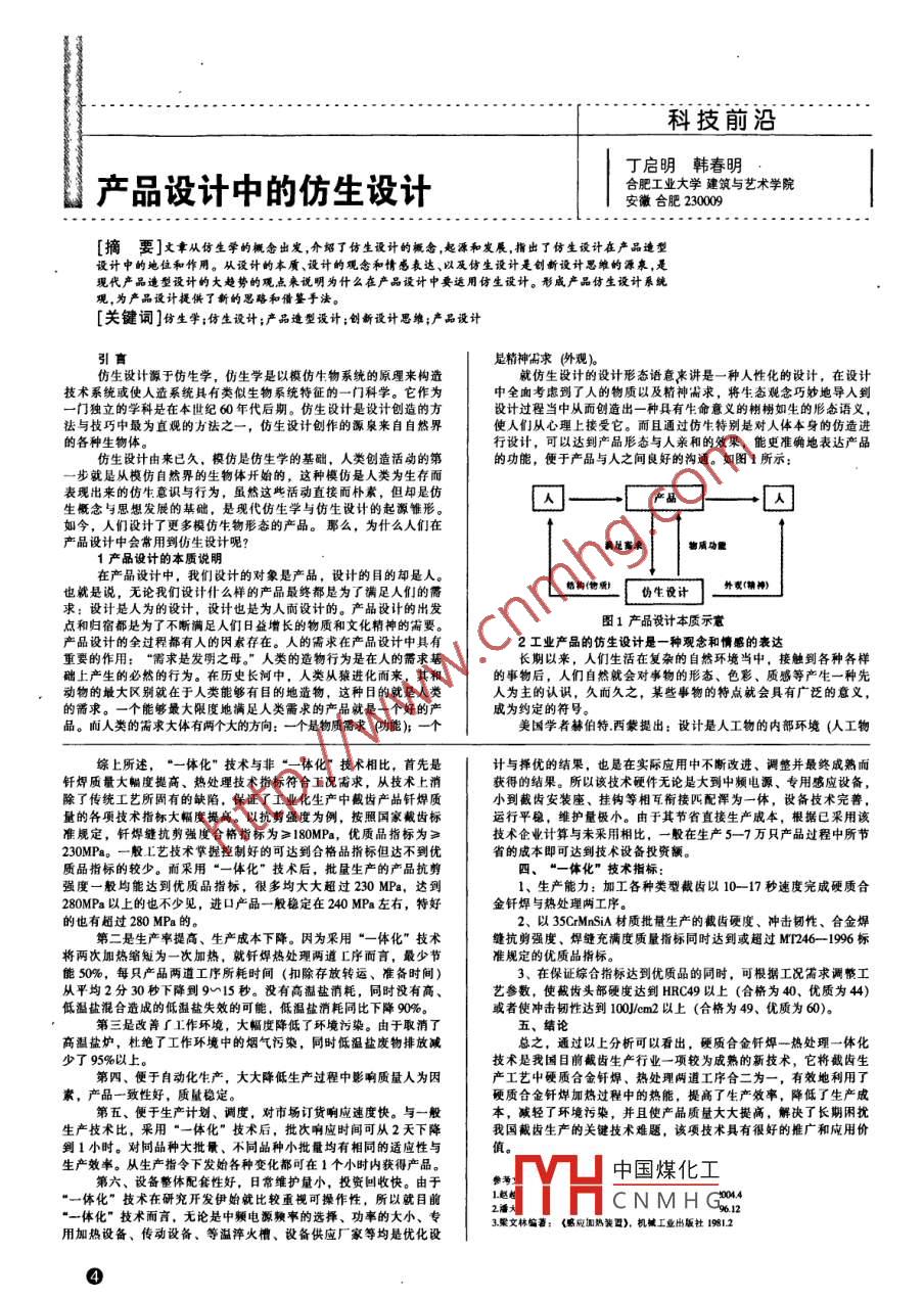 科技前沿丁啟明韓春明產(chǎn)品設(shè)計中的仿生設(shè)計合肥工業(yè)大學(xué)建筑與藝術(shù)學(xué)院安徽合肥230009[摘要]文章從仿生學(xué)的概念出發(fā),介紹了 仿生設(shè)計的概念,起源和發(fā)展,指出了仿生設(shè)計在產(chǎn)品造型設(shè)計中的地位和作用。從設(shè)計的本質(zhì)、設(shè)計的觀念和情感表達、以及仿生設(shè)計是創(chuàng)新設(shè)計思維的源泉,是現(xiàn)代產(chǎn)品造型設(shè)計的大趨勢的觀點來說明為什么在產(chǎn)品設(shè)計中要運用仿生設(shè)計。形成產(chǎn)晶仿生設(shè)計系統(tǒng)觀,為產(chǎn)品設(shè)計提供了新的思路和借鑒手法。.[關(guān)鍵詞]仿生學(xué);仿生設(shè)計;產(chǎn)品造型設(shè)計;創(chuàng)新設(shè)計思維;產(chǎn)品設(shè)計引盲是精神需求(外觀)。仿生設(shè)計源于仿生學(xué),仿生學(xué)是以模仿生物系統(tǒng)的原理來構(gòu)遣就仿生設(shè)計的設(shè)計形態(tài)語意來講是一一種 人性化的設(shè)計,在設(shè)計技術(shù)系統(tǒng)或使人造系統(tǒng)具有類似生物系統(tǒng)特征的一一門科學(xué)。它作為中全面考慮到了人的物質(zhì)以及精神需求,將生態(tài)觀念巧妙地導(dǎo)人到一門獨立的學(xué)科是在本世紀60年代后期。仿生設(shè)計是設(shè)計創(chuàng)造的方法與枝巧中最為直觀的方法之一,仿生設(shè)計創(chuàng)作的源泉來自自然界使人們從心理上接受它。而且通過仿生特別是對人體本身的仿造進的各種生物體。行設(shè)計,可以達到產(chǎn)品形態(tài)與人親和的效果,能吏準確地表達產(chǎn)品仿生設(shè)計由來已久,模仿是仿生學(xué)的基礎(chǔ),人類創(chuàng)造活動的第的功能,便于產(chǎn)品與人之間良好的溝通。如圖1所示:-步就是從模仿自然界的生物體開始的,這種模仿是人類為生存而表現(xiàn)出來的仿生意識與行為,雖然這些活動直接而樸素,但卻是仿生慨念與思想發(fā)展的基礎(chǔ),是現(xiàn)代仿生學(xué)與仿生設(shè)計的起源錐形。如今,人們設(shè)計了更多模仿生物形態(tài)的產(chǎn)品。那么,為什么人們在產(chǎn)品設(shè)計中會常用到仿生設(shè)計呢?滿足畜求物質(zhì)功覺1產(chǎn)品設(shè)計的本質(zhì)說明在產(chǎn)品設(shè)計中,我們設(shè)計的對象是產(chǎn)品,設(shè)計的目的卻是人。也就是說,無論我們設(shè)計什么樣的產(chǎn)品最終都是為了滿足人們的需結(jié)構(gòu)(物愛)傷生設(shè)計求:設(shè)計是人為的設(shè)計,設(shè)計也是為人而設(shè)計的。產(chǎn)晶設(shè)計的出發(fā)點和歸宿都是為了不斷滿足人們?nèi)找嬖鲩L的物質(zhì)和文化精神的需要。圈1產(chǎn)品設(shè)計本質(zhì)示意產(chǎn)品設(shè)計的全過程都有人的因素存在。人的需求在產(chǎn)品設(shè)計中具有2工業(yè)產(chǎn)品的仿生設(shè)計是-種觀念和情感的表達重要的作用:“需求是發(fā)明之母?!?人類的造物行為是在人的需求基長期以來,人們生活在復(fù)雜的自然環(huán)境當(dāng)中,接觸到各種各樣.礎(chǔ)上產(chǎn)生的必然的行為。在歷史長河中,人類從猿進化而來,其和的事物后,人們自然就會對事物的形態(tài)、色彩、質(zhì)感等產(chǎn)生一種先動物的最大區(qū)別就在于人類能夠有目的地造物,這種目的就是人類人為主的認識,久而久之,某些事物的特點就會具有廣泛的意義,的需求。- -個能夠最大限度地滿足人類需求的產(chǎn)品就是一個好的產(chǎn)成為約定的符號。品。而人類的需求大體有兩個大的方向:一個是物質(zhì)需求(功能); 一個美國學(xué)者赫伯特.西蒙提出:設(shè)計是人工物的內(nèi)部環(huán)境(人工物綜上所述,“一體化” 技術(shù)與非“一體化”技術(shù)相比,首先是:計與擇優(yōu)的結(jié)果,也是在實際應(yīng)用中不斷改進、調(diào)整并最終成熟而釺焊質(zhì)量大幅度提高、熱處理技術(shù)指標符合工況需求,從技術(shù)上消獲得的結(jié)果。所以該技術(shù)硬件無論是大到中頻電源、專用感應(yīng)設(shè)備,除了傳統(tǒng)工藝所固有的缺陷,保證了工業(yè)化生產(chǎn)中截齒產(chǎn)品釬焊質(zhì)小到截齒安裝座、掛鉤等相互銜接匹配渾為一體,設(shè)備技術(shù)完善,量的各項技術(shù)指杯大幅度提病。以抗剪強度為例,按照國家截齒標運行平穩(wěn),維護量極小。由于其節(jié)省直接生產(chǎn)成本,根據(jù)巳采用該準規(guī)定,釬焊縫抗剪強度合格指標為≥180MPa,優(yōu)質(zhì)品指標為≥技術(shù)企業(yè)計算與未采用相比,一般在生產(chǎn)5- 7萬只產(chǎn)品過程中所節(jié)230MPa。一般上藝技術(shù)紫握控制好的可達到合格品指標但達不到優(yōu)省的成本即可達到技術(shù)設(shè)備投資額。質(zhì)品指標的較少。而采用“-體化"技術(shù)后,批量生產(chǎn)的產(chǎn)品抗剪9、 “-體化”技術(shù)指標:,強度一般均能達到優(yōu)質(zhì)品指標,很多均大大超過230 MPa,達到1、生產(chǎn)能力:加工各種類型截齒以10--17秒速度完成硬質(zhì)合280MPa以上的也不少見,進口產(chǎn)品一般穩(wěn)定在240 MPa左右,特好金釬焊與熱處理兩工序。的也有超過280MPa的。2、以35CrMnSiA材質(zhì)批量生產(chǎn)的截齒硬度、沖擊切性、合金焊第二是生產(chǎn)率提高、生產(chǎn)成本下降。因為采用“一體化”技術(shù).縫抗剪強度、焊縫充