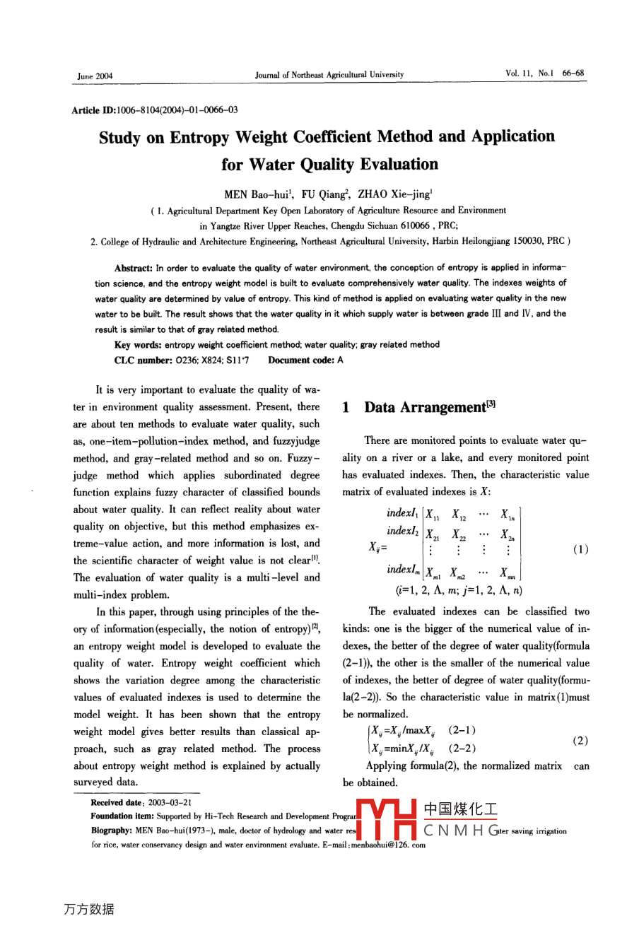 Study on Entropy Weight Coefficient Method and Application for Water Quality Evaluation