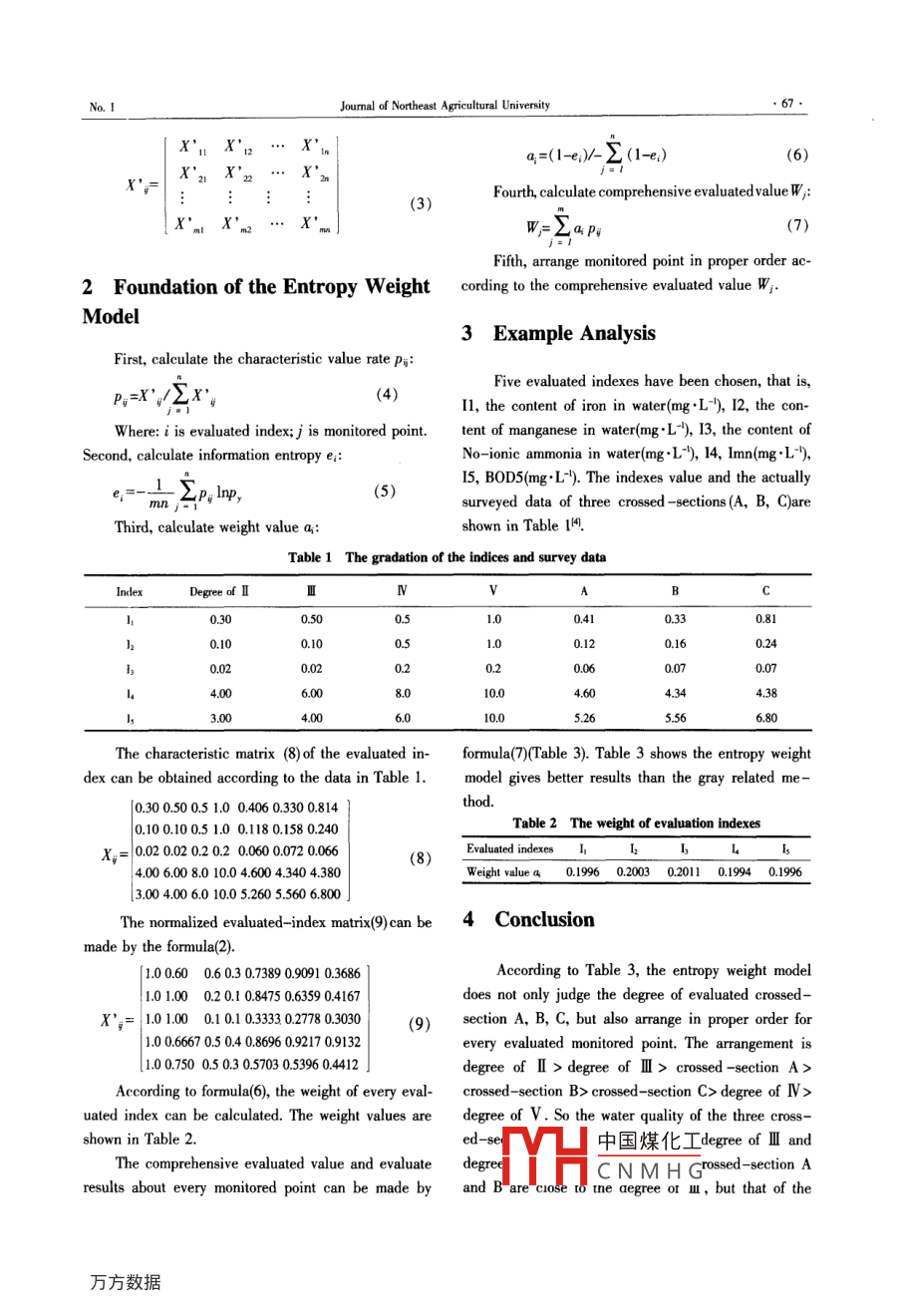 June 2004Joumal of Northeast Agricultural UniversityVol. 11, No.1 66-68Article ID:1006- 8104(2004)-01-0066-03Study on Entropy Weight Coefficient Method and Applicationfor Water Quality EvaluationMEN Bao -huil, FU Qiang, ZHAO Xie-jing'( 1. Agricultural Department Key Open Laboratory of Agriculture Resource and Environmentin Yangtze River Upper Reaches, Chengdu Sichuan 610066 , PRC;2. Cllge of Hydraulice and Arehiteture Engineering, Northeast Agriculural University, Harbin Heilongjiang 150030, PRC )Abstract: In order to evaluate the quality of water environment, the conception of entropy is applied in informa-tion science, and the entropy weight model is built to evaluate comprehensively water quality. The indexes weights ofwater quality are determined by value of entropy. This kind of method is applied on evaluating water quality in the newwater to be built. The result shows that the water quality in it which supply water is between grade II and IV, and theresult is similar to that of gray related method.Key words: entropy weight cofficient method; water quality; gray related methodCLC number: 0236; X824; S117Document code: AIt is very important to evaluate the quality of wa-ter in environment quality assessment. Present, there1 Data Arrangement3lare about ten methods to evaluate water quality, suchas, one-item-pollution index method, and fuzzyjudgeThere are monitored points to evaluate water qu-method, and gray -related method and so on. Fuzzy-ality on a river or a lake, and every monitored pointudge method which applies subordinated degreehas evaluated indexes. Then, the characteristic valuefunction explains fuzzy character of classified boundsmatrix of evaluated indexes is X:about water quality. It can reflect reality about waterindex1|[x,X2 ... Xnquality on objective, but this method emphasizes ex-indexI|x, x。... xtreme-value action, and more information is lost, andX;=(1)the scientifiec character of weight value is not clearl".The evaluation of water quality is a multi -level andindex1m[x.Xn... X.(i=1,2, A, m; j=1,2,A, n)multi-index problem.In this paper, through using principles of the the-The evaluated indexes can be classifed twoory of inormation (especiall, the notion of entropy)網(wǎng),kinds: one is the bigger of the numerical value of in-an entropy weight model is developed to evaluate thedexes, the better of the degree of water qulityformulaquality of water. Entropy weight coeffcient which(2-1)), the other is the smaller of the numerical valueshows the variation degree among the characteristicof indexes, the better of degree of water qualityformu-values of evaluated indexes is used to determine thela(2-2). So the characteristic value in matrix(1)mustmodel weight. It has been shown that the entropybe normalized.weight model gives better results than classical ap-{Xw=Xg/maxXg (2-1)(2)proach, such as gray related method. The process|xy =minXg/Xy (2-2)about entropy weight method is explained by actuallyApplying formula(2), the normalized matrix cansurveyed data.be obtained.Received date: 2003- 03-21中國(guó)煤化工Foundation item: Supported by Hi-Tech Research and Development ProgrBiography: MEN Bao-hui(1973-), male, doctor of hydrology and water re:MYHC N M H Giter seving inigationfor rice, water conservancy design and water environment evaluate. E-mail :menbaohui@126. comNo. 1Jourmal of Northeast Agricultural University.67.a=(1-e)- 2(1-e;)(6)X'g=Fourth, calculate comprehensive evaluatedvalue W;(3)X'mX'm2...X'mw=Zapo(7)Fifth, arrange monitored point in proper order ac-2 Foundation of the Entropy Weightcording to the comprehensive evaluated value Wj.Model3 Example AnalysisFirst, calculate the characteristic value rate pw: .Five evaluated indexes have been chosen, that is,P,=X"v/Ex',(4)Il, the content of iron in water(mg'L-), I2, the con-Where: i is evaluated index;j is monitored point.tent of manganese in water(mg.L~), I3, the content ofSecond, calculate information entropy e;: .No- ionic ammonia in water(mg.L ), 14, lmn(mg.L),I5, BOD5(mg.L9). The indexes value and the actuallye.=-m 2plIp,(5)surveyed data of three crossed -sections(A, B, C)aremn,Third, calculate weight value q:shown in Table 14.Table 1 The gradation of the indices and survey dataIndexDegreeof IMIVAC0.300.50).5.00.330.810.101.00.120.160.02.20.07.074.006.0010.04.604.344.383.006.05.265.566.80The characteristic matrix (8) of the evaluated in-formula(7)(Table 3). Table 3 shows the entropy weightdex can be obtained according to the data in Table 1.model gives better results than the gray related me -[0.30 0.50 0.5 1.0 0.406 0.330 0.814 ,|0.10 0.10 0.5 1.0 0.118 0.158 0.240Table 2 The weight of evaluation indexesx,=0.02 0.02 0.2 0.2 0.060 0.072 0.066(8)Evaluated indexes1| 4.00 6.00 8.0 10.0 4.600 4.340 4.380Weight valuea 0.1996 0.2003 0.2011 0.1994 0.1996(3.00 4.00 6.0 10.0 5.260 5.560 6.800The normalized evaluated-index matrix(9)can be4 Conclusionmade by the formula(2).[1.00.60 0.6 0.3 0.7389 0.9091 0.3686According to Table 3, the entropy weight model|1.0 1.00 0.2 0.1 0.8475 0.6359 0.4167does not only judge the degree of evaluated crossed-X'j= |1.0 1.00 0.1 0.1 0333 0.2778 0.3030(9)section A, B, C, but also arrange in proper order for1.0 0.6667 0.5 0.4 0.8696 0.9217 0.9132every evaluated monitored point. The arrangement is1.0 0.750 0.5 0.3 0.5703 0.5396 0.412degree of I > degree of I > crossed -section A >According to formula(6), the weight of every eval-crossed- -section B> crossed- -section C> degree of IV>uated index can be calculated. The weight values aredegree of V. So the water quality of the three cross-shown in Table 2.中國(guó)煤化Idegreeof M andThe comprehensive evaluated value and evaluatedegreeCN MH Grosed. -ecion Aresults about every monitored point can be made byand B are close to tne aegree or山,but that of the.68.Joumal of Northeast Agriculural UniversityVol. 11Table 3 The evaluation resultNVVCEvaluated method1.00000.80380.37940.23970.67150.65560.4881Entopy weight modelD⑥⑦③④⑤mI