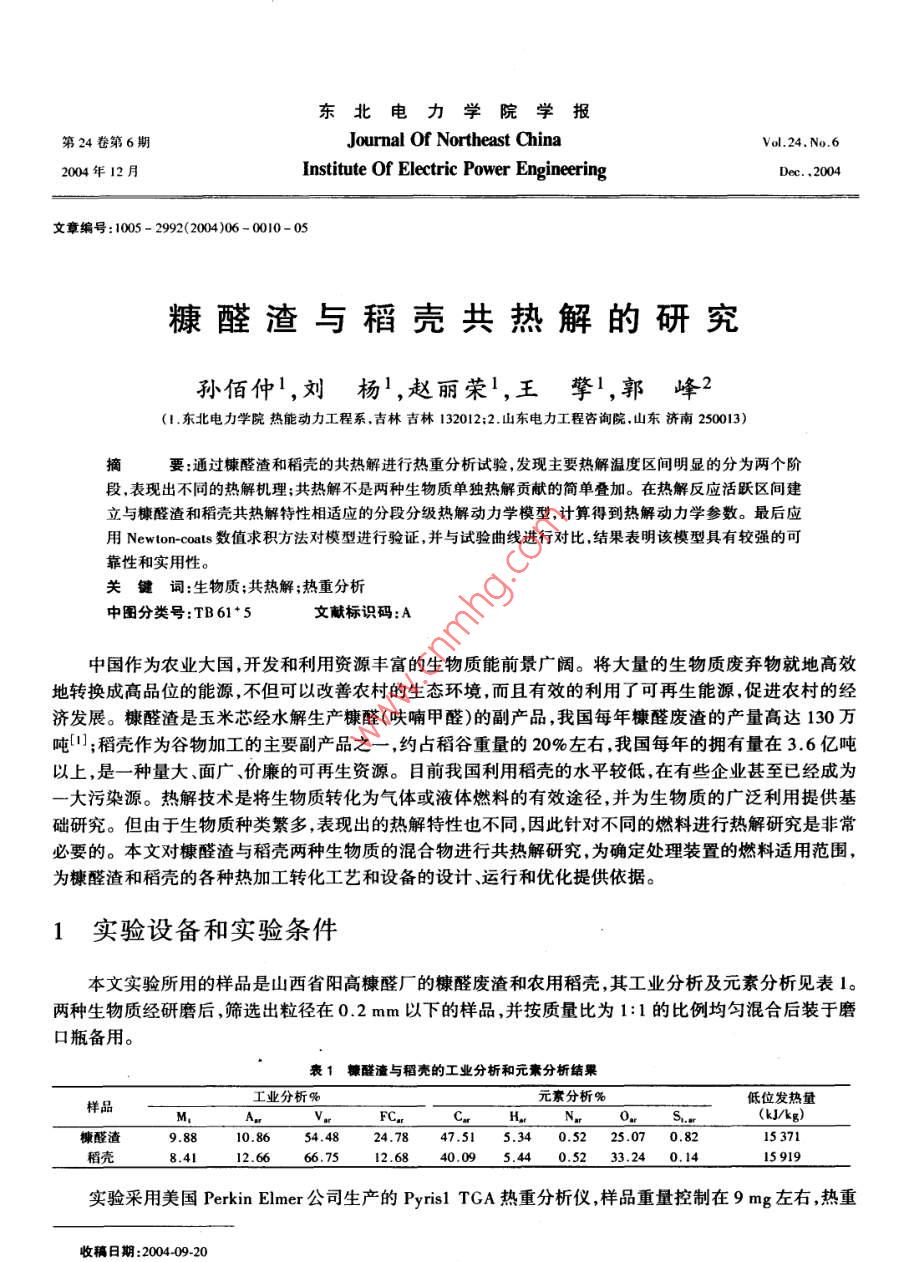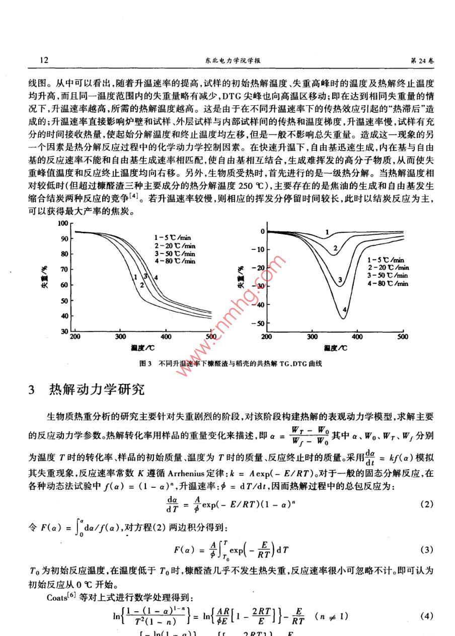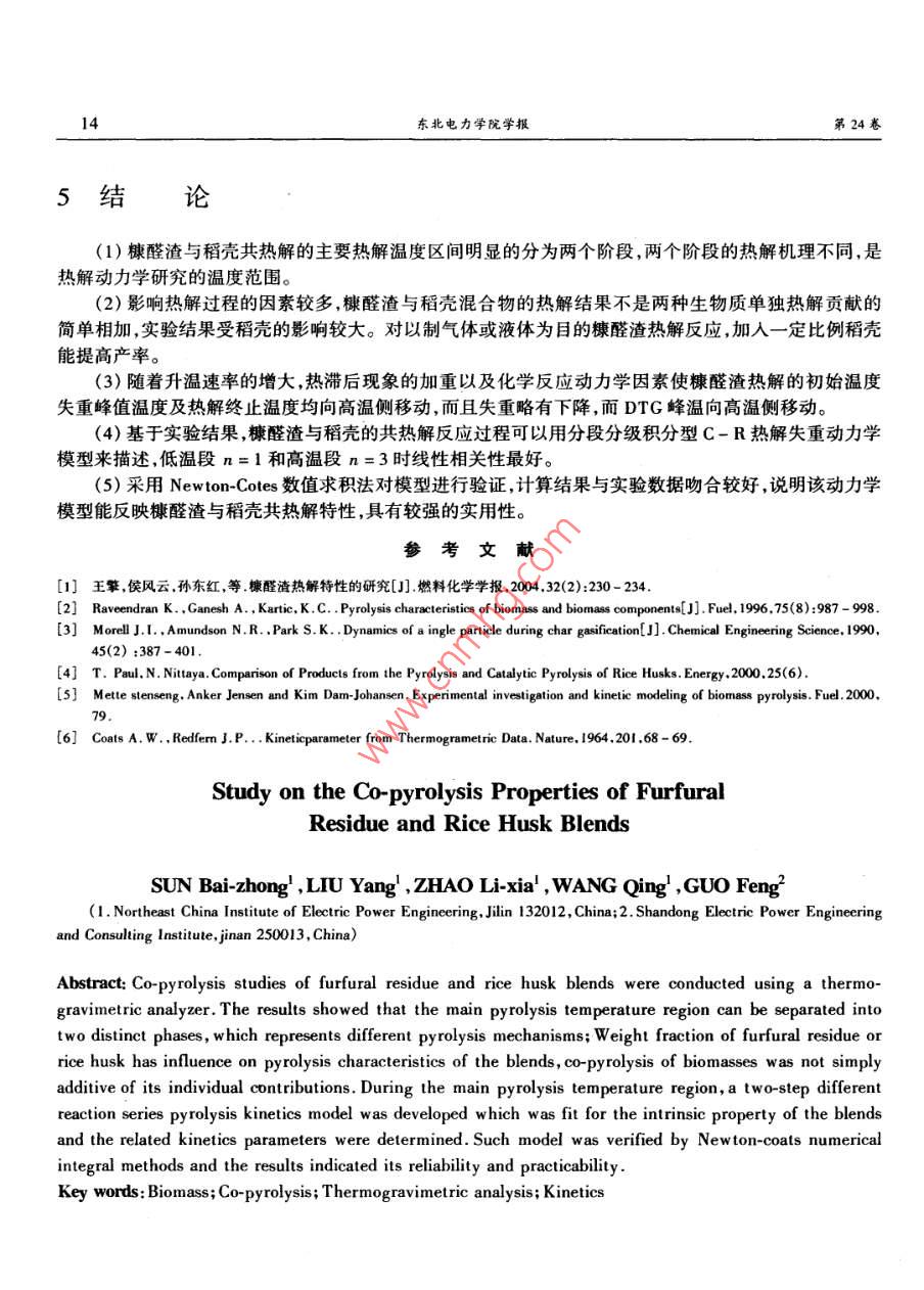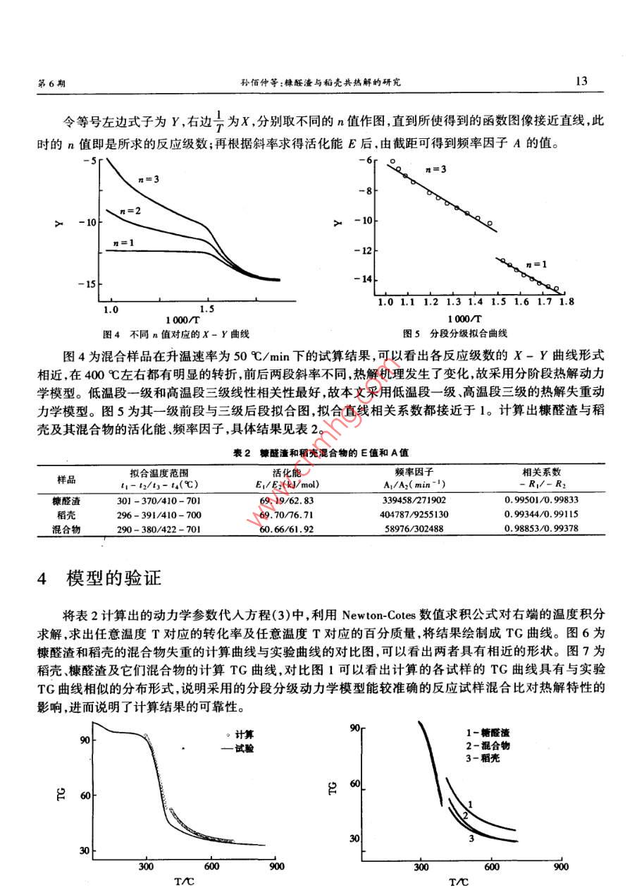 東北電力學院學報第24卷第6期urnal of Northeast ChinaVol 24. N2004年12月Institute Of Electric Power Engineering文章編號:1005-2992(2004)06-0010-05糠醛渣與稻殼共熱解的研究孫佰仲,劉楊1,趙麗榮,王擎1,郭峰2(1.東北電力學院熱能動力工程系,吉林吉林132012;2山東電力工程咨詢院山東濟南250013)要:通過糠醛渣和稻殼的共熱解進行熱重分析試驗,發(fā)現(xiàn)主要熱解溫度區(qū)間明顯的分為兩個階段,表現(xiàn)岀不同的熱解機理;共熱解不是兩種生物質(zhì)單獨熱解貢獻的簡單疊加。在熱解反應活躍區(qū)間建立與糠醛渣和稻殼共熱解特性相適應的分段分級熱解動力學模型,計算得到熱解動力學參數(shù)。最后應用 Newton-coats數(shù)值求積方法對模型進行驗證,并與試驗曲線進行對比,結(jié)果表明該模型具有較強的可靠性和實用性。關鍵詞:生物質(zhì);共熱解;熱重分析中圖分類號:TB61+5文獻標識碼:A中國作為農(nóng)業(yè)大國,開發(fā)和利用資源豐富的生物質(zhì)能前景廣闊。將大量的生物質(zhì)廢棄物就地高效地轉(zhuǎn)換成高品位的能源,不但可以改善農(nóng)村的生態(tài)環(huán)境,而且有效的利用了可再生能源,促進農(nóng)村的經(jīng)濟發(fā)展??啡┰怯衩仔窘?jīng)水解生產(chǎn)糠醛(呋喃甲醛)的副產(chǎn)品,我國每年糠醛廢渣的產(chǎn)量高達130萬噸;稻殼作為谷物加工的主要副產(chǎn)品之一,約占稻谷重量的20%左右我國每年的擁有量在3.6億噸以上,是一種量大、面廣、價廉的可再生資源。目前我國利用稻殼的水平較低,在有些企業(yè)甚至已經(jīng)成為大污染源。熱解技術是將生物質(zhì)轉(zhuǎn)化為氣體或液體燃料的有效途徑,并為生物質(zhì)的廣泛利用提供基礎研究。但由于生物質(zhì)種類繁多,表現(xiàn)出的熱解特性也不同,因此針對不同的燃料進行熱解研究是非常必要的。本文對糠醛渣與稻殼兩種生物質(zhì)的混合物進行共熱解研究,為確定處理裝置的燃料適用范圍,為糠醛渣和稻殼的各種熱加工轉(zhuǎn)化工藝和設備的設計、運行和優(yōu)化提供依據(jù)。實驗設備和實驗條件本文實驗所用的樣品是山西省陽高糠醛廠的糠醛廢渣和農(nóng)用稻殼,其工業(yè)分析及元素分析見表1。兩種生物質(zhì)經(jīng)研磨后,篩選出粒徑在02mm以下的樣品,并按質(zhì)量比為1:1的比例均勻混合后裝于磨口瓶備用。表1糠醛渣與稻殼的工業(yè)分析和元素分析結(jié)果工業(yè)分析%元素分析%樣品低位發(fā)熱量(kI/kg)糠醛渣9.8810.8654.4824.7847.515340.5225.070.8153718.4112.6666.7512.6840.095.440.5233.240.1415919實驗采用美國 Perkin Elmer公司生產(chǎn)的 Pyrisl TGA熱重分析儀樣品重量控制在9mg左右,熱重稿日期:20040920第孫佰仲等:糠醛渣與稽殼共熱解的研究IL分析用的載氣為流量80mL/min的高純氮氣,主要用來創(chuàng)建一個近似的僅受試樣本身不可逆熱解反應動力學控制的實驗條件。升溫速率分別采用5℃/min,20℃/min,50℃/min,80℃/min,終溫控制在850℃。為了便于比較分析,另外在相同實驗條件下分別對糠醛渣和稻殼樣品進行熱解研究。試驗開始前預先通入氮氣20分鐘,用以將熱天平加熱區(qū)的空氣驅(qū)出,穩(wěn)定后稱樣品的重量,而后熱天平將按設定程序自動加熱,并記錄重量變化的信號。2實驗結(jié)果與分析2.1共熱解過程及動力學曲線分析圖1給出了升溫速率為50℃/min時糠醛渣和稻1-糠醛渣殼共熱解的失重(TG)曲線。可以看出共熱解的TG2-混合物3-稻殼曲線與兩種生物質(zhì)單獨熱解的曲線有相似的形狀。從環(huán)境溫度到110℃左右的階段為干燥過程,試樣主要脫除水分和其他吸附氣體,失重明顯階段的溫度范圍為280℃-700℃,失重量約占總熱解失重量的85%~90%,其中280℃到400℃左右的區(qū)域反應速度較快,失重量約占總熱解失重量的65%;400℃~650℃左右的區(qū)域熱解反應繼續(xù)進行,但與前一階段相比速率明顯減慢,熱解機理發(fā)生了變化。一般認為所有的圖1糠醛渣與稻殼混合物的TG與DTG線圖生物質(zhì)都是由纖維素、半纖維素、木質(zhì)素以及少量的提取物組成的,各成分對熱解的貢獻不同,各組分熱解活躍溫度區(qū)間也不同,且它們在各自的熱解活躍溫度范圍內(nèi)反應速率隨溫度呈拋物線形狀變化。 Ravendan121等對生物質(zhì)的主要組分分別進行熱解試驗,發(fā)現(xiàn)半纖維素最先熱解;纖維素和木質(zhì)素的熱解失重明顯溫度區(qū)間分別為300℃-430℃和250℃~500℃。按溫度區(qū)間劃分,在250℃~300℃主要是半纖維素的熱解;300℃~400℃主要是纖維素和木質(zhì)素的熱解,但是纖維素的失重速率遠高于木質(zhì)素;420℃后幾乎僅是木質(zhì)素的熱解;400℃左右纖維素和木質(zhì)素的熱解失重速率都達到最大值,幾乎同時占主導地位,因此理論上對這一區(qū)間的動力學計算非常復雜。在糠醛渣和稻殼中,這些成分之間的比例不同。假定糠醛渣與稻殼混合物的失重是兩種生物質(zhì)原料單獨熱解失重的疊加,即任意熱解溫度下如下實驗一計算公式成立(1)g其中x為混合物中生物質(zhì)i的質(zhì)量份額,V為生物質(zhì)i的揮發(fā)分產(chǎn)量。計算的TG曲線如圖2所示,發(fā)現(xiàn)計算的混合試樣疊加TG曲線高于實驗TG曲線,即與實驗結(jié)果相比有較大偏差。所以在本實驗條件下,糠醛渣與稻殼混合物的共熱解并不是兩種生物T/C質(zhì)單獨熱解貢獻的簡單疊加,實際的熱解過程受稻圖2按公式(1)