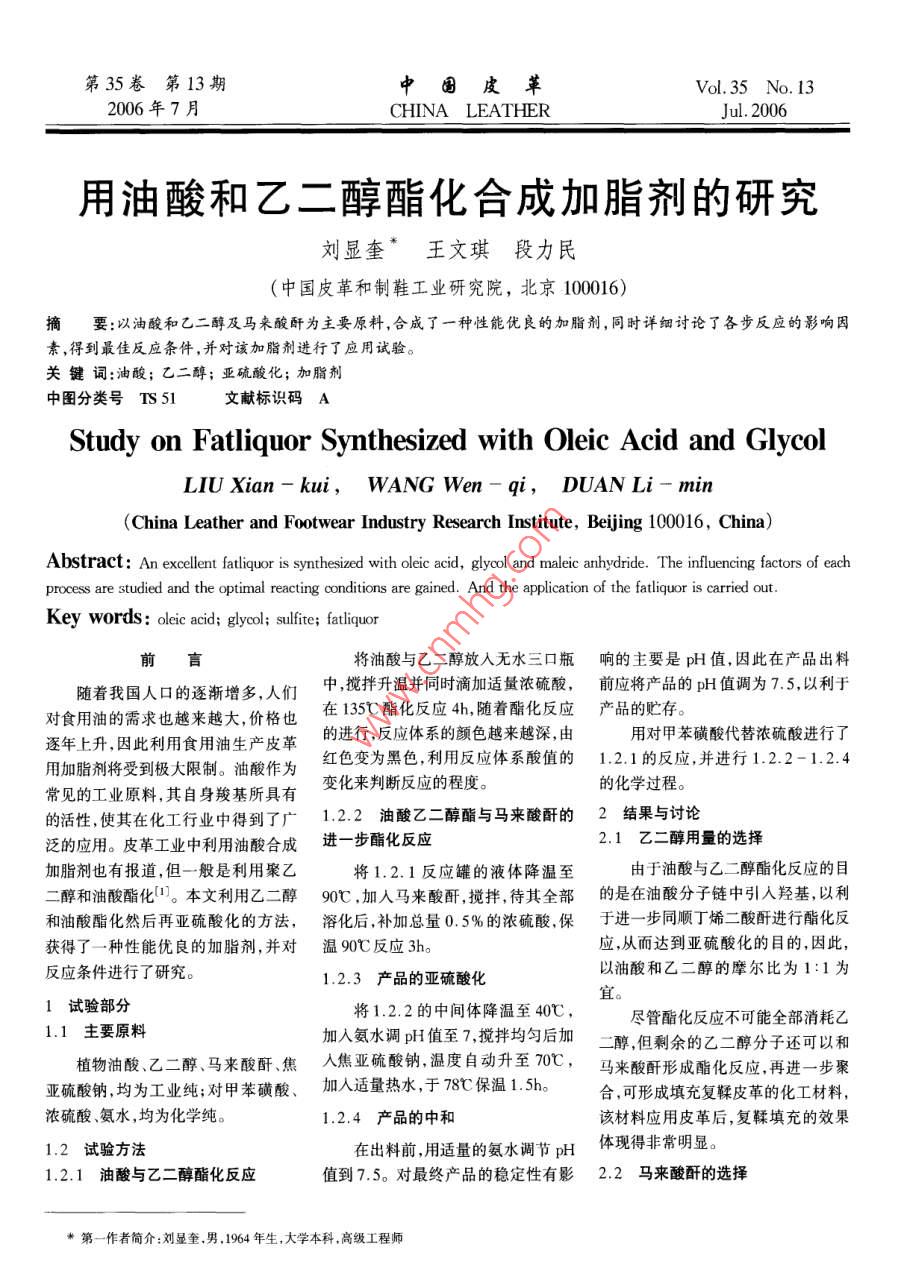 第35卷第13期中國皮蘋Vol 35 No 132006年7月CHINA LEATHERJul.2006用油酸和乙二醇酯化合成加脂劑的研究劉顯奎”王文琪段力民(中國皮革和制鞋工業(yè)研究院,北京100016)摘要:以油酸和乙二醇及馬來酸酐為主要原料,合成了一種性能優(yōu)良的加脂劑,同時詳細討論了各步反應的影響因素,得到最佳反應條件,并對該加脂劑進行了應用試驗。關鍵詞:油酸;乙二醇;亞硫酸化;加脂劑中圖分類號TS51文獻標識碼AStudy on Fatliquor Synthesized with Oleic Acid and glycolLIU Xian-kui, WANG Wen-qi, DUAN Li-minChina Leather and Footwear Industry Research Institute, Beijing 100016, China)Abstract: An excellent fatliquor is synthesized with oleic acid, glycol and maleic anhydride. The influencing factors of eachorocess are studied and the optimal reacting conditions are gained. And the application of the fatliquor is carried outKey words: oleic acid; glycol; sulfite; fatliquor將油酸與乙二醇放入無水三口瓶響的主要是pH值,因此在產(chǎn)品出料隨著我國人口的逐漸增多,人們中,攪拌升溫并同時滴加適量濃硫酸,前應將產(chǎn)品的時H值調(diào)為7.5以利于對食用油的需求也越來越大,價格也在135℃酯化反應4h,隨著酯化反應產(chǎn)品的貯存。逐年上升,因此利用食用油生產(chǎn)皮革的進行,反應體系的顏色越來越深由用對甲苯磺酸代替濃硫酸進行了用加脂劑將受到極大限制。油酸作為紅色變?yōu)楹谏?利用反應體系酸值的1.2.1的反應,并進行12.2-1.24常見的工業(yè)原料,其自身羧基所具有變化來判斷反應的程度的化學過程。的活性,使其在化工行業(yè)中得到了廣1.2.2油酸乙二醇酯與馬來酸酐的2結果與討論泛的應用。皮革工業(yè)中利用油酸合成進一步酯化反應2.1乙二醇用量的選擇加脂劑也有報道,但一般是利用聚乙將1.2.1反應罐的液體降溫至由于油酸與乙二醇酯化反應的目二醇和油酸酯化1。本文利用乙二醇90℃,加入馬來酸酐,攪拌,待其全部的是在油酸分子鏈中引入羥基,以利和油酸酯化然后再亞硫酸化的方法,溶化后,補加總量0.5%的濃硫酸,保于進一步同順丁烯二酸酐進行酯化反獲得了一種性能優(yōu)良的加脂劑,并對溫90℃反應3h應,從而達到亞硫酸化的目的,因此反應條件進行了研究1.2.3產(chǎn)品的亞硫酸化以油酸和乙二醇的摩爾比為1:1為宜1試驗部分將1.2.2的中間體降溫至40℃盡管酯化反應不可能全部消耗乙11主要原料加入氨水調(diào)p值至7,攪拌均勻后加二醇,但剩余的乙二醇分子還可以和植物油酸、乙二醇、馬來酸酐、焦人焦亞硫酸鈉溫度自動升至70馬來酸酐形成酯化反應,再進一步聚亞硫酸鈉,均為工業(yè)純;對甲苯磺酸、加入適量熱水,于78℃保溫1h合,可形成填充復鞣皮革的化工材料,濃硫酸、氨水,均為化學純1.2.4產(chǎn)品的中和該材料應用皮革后,復鞣填充的效果1.2試驗方法在出料前用適量的氨水調(diào)節(jié)P體現(xiàn)得非常明顯。12.1油酸與乙二醇酯化反應值到7.5。對最終產(chǎn)品的穩(wěn)定性有影2.2馬來酸酐的選擇*第一作者簡介:劉顯奎,男,1964年生,大學本科,高級工程師第13期劉顯奎等用油酸和乙二醇酯化合成加脂劑的研究試驗研究馬來酸酐用量的多少,決定了該2.4反應溫度和反應時間的影響結果表明:加脂劑1:9的溶液對皮革加脂劑親水程度的強弱。從摩爾理論上講酯化反應溫度一般控于1m氨水是十分穩(wěn)定的加入量配比看,占乙二醉摩爾用量1/3時的制在參與酯化反應的化合物的低沸點是原來的10倍也不會出現(xiàn)分層現(xiàn)象馬來酸酐,合成出來的產(chǎn)品穩(wěn)定性更的溫度附近根據(jù)本試驗的具體要求,對于1moL鹽酸,當乳液pH值小于好,但復鞣填充性相對而言較弱;而綜合考慮后將第一步的反應溫度控制2.5時,才會出現(xiàn)沉淀現(xiàn)象。11用量的馬來酸酐合成的產(chǎn)品透明在135℃,反應時間4h3加脂劑結構的紅外光譜圖表征狀態(tài)要好,復鞣效果非常明顯,具體結第二步的酯化溫度控制在90℃,果見表1。樣品的處理過程:該聚合物不溶時間3h。亞硫酸化的溫度控制在從表1結果可以看出:作為一般78℃,反應時間1.5h于乙醇、甲醇、丙酮、乙酸乙酯、乙醚、性加脂劑,占乙二醇13用量的馬來石油醚等一系列常用溶劑。與二氯甲酸酐已夠用但如果想使其具有一定25不同催化劑的影響烷等有較好的相溶性。所以先將大約的復鞣填充作用,或者想使其乳化其選擇濃硫酸、對甲苯磺酸,對本試10mL樣品溶于10mL二氯甲烷(或三它油類,則馬來酸酐用量大些為好。驗中酯化反應進行催化的結果是:用氯甲烷)中,然后向其中加入大約2.3焦亞硫酸鈉用量選擇濃硫酸作為催化劑,產(chǎn)品呈透明狀,水30mL甲醇,立即有米黃色固體析出。溶性極好,可和水以任何比例互溶;而室溫攪拌約1h,過濾,濾液為米黃色焦亞硫酸鈉用量是根據(jù)馬來酸酐用對甲苯磺酸作為催化劑的產(chǎn)品,只小顆粒,并很快粘結在一起,變?yōu)樽睾值挠昧慷?從試驗結果來看,其用量能水乳化而呈現(xiàn)乳狀液。色固狀物,由此可見,該聚合物具有極般是馬來酸酐用量的60%~80%應用效果和產(chǎn)品外觀較好。這是因為2.6該加脂劑的耐酸堿穩(wěn)定性測試的反應活性。將該物進行紅外檢測,見圖1。用量較小時產(chǎn)品對于酸值過于敏感根據(jù)《制革用加脂劑測試方法》中1733cm1為C=O伸縮振動吸用量過大時導致產(chǎn)品中鹽分含量較的規(guī)定測定了該加脂劑耐1moL氨收峰,1607cm1是羧基的不對稱振高穩(wěn)定性