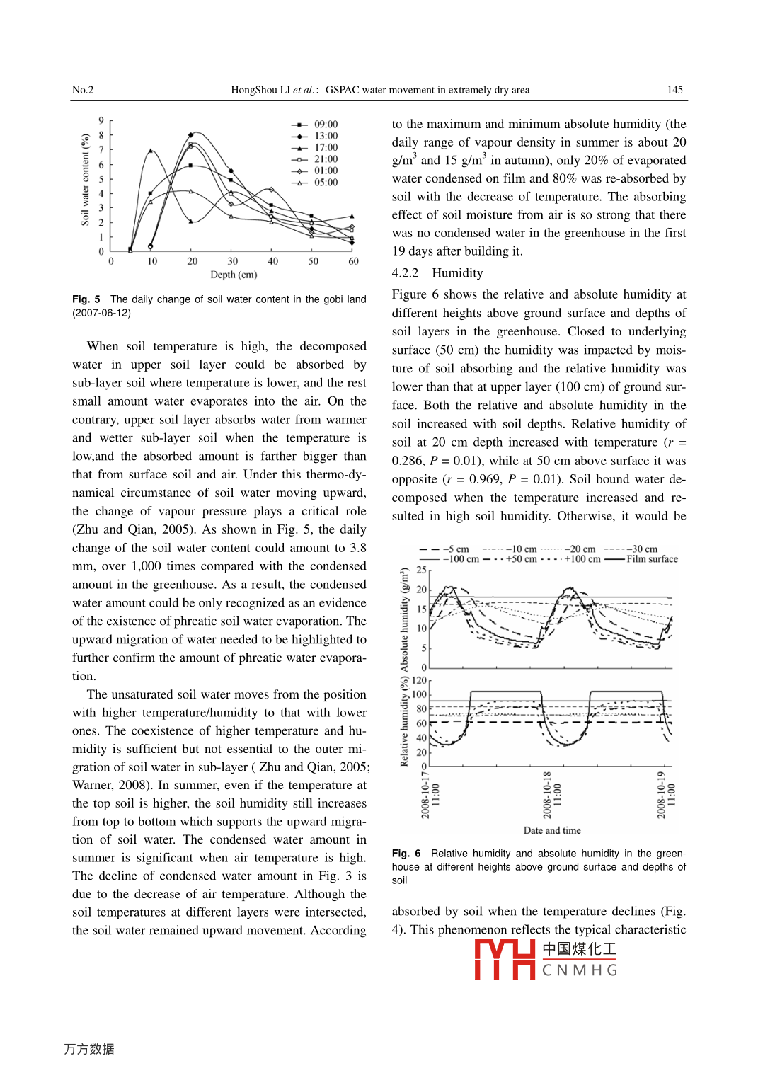 JOURNAL OF ARID LAND, 2011, VOL.3, NO.2, 141-149GSPAC water movement in extremely dry areaHongShou L1,2*, WanFu WANG1.2, GuoBin ZHANG1,2, ZhengMo ZHANG1,2, XiaoWei WANG1,21 The Conservation Institute of Dunhuang Academy, Dunhuang 736200, China;2 Key Scientific Research Base of Conservation for Ancient Mural State Administration for Cultural Heritage, Dunhuang 736200,ChinaAbstract: Under an extremely arid condition, a PVC greenhouse was built on the top of Mogao Grottoesin gobi area. The results of 235-day constant extraction of condensed water on the greenhouse film and soilwater content showed that 2.1 g/(m^.d) groundwater moved up and exported into the soil, and a phreaticwater evaporation existed in the extreme dry area where the groundwater is buried deeper than 200 m.After a prolonged export, the soil water content in the greenhouse was not lower but obviously higher thanthe original control ones. According to the monitored parameters including relative humidity and absolutehumidity of soil, and temperature outside and inside the greenhouse, it was found that there is the availablecondition and mechanism for the upward movement of groundwater, and also it can be sure that the ex-ported water was not from the soil and atmosphere outside the greenhouse. Phreatic water, an importantsource for soil water, interacts with atmosphere moisture via soil respiration. Soil salinity also has importanteffects on soil water movement and spatial-temporal heterogeneity. The extremely dry climate, terrestrial .heat and change of upper soil temperature are the fundamental driving forces of water transportation andphreatic water evaporation in the Groundwater-Soil-Plant Atmosphere Continuum (GSPAC) system.Keywords: greenhouse method; GSPAC system; extremely dry area; water movement1 Introductionrainfall once-in-a-decade in Mogao Grotteos within 20days (Li et al., 2010a). .Water circle is important to ecosystem. Vertical waterAccording to previous investigations, the soil watercircle is constituted by the water movement in the Gr-content was high in the proluvial clay layer at 1.4 mound water-Soil-Plant-Atmosphere Continuum (GSPAC)depth of the gobi land around the Grottoes (Li et al.,system (Wang et al., 2004; Zhou et al, 2005). It is2009), and it could reach 24% at 4 m depth (Yang etwell known that when groundwater level is shallow,al, 2009). Further, the experiments conducted inphreatic water is an important supplement to soil,closed system revealed that the annual precipitation inplant and atmosphere moisture through capillary acthis area (42.2 mm) is not enough to supply soil watertion (Yang, 1999; Chen et al., 2004; Ren et al., 2006). .content (Li et al., 2010a). Therefore, other water re-However, it remains unclear whether phreatic watersources supplying soil water indeed exist.can contribute to soil water, which is a key to under-The only possible resource of soil water except pre-stand whether there is a maximum depth of phreaticcipitation is phreatic water. The research work on thewater evaporation (Zhu and Qian, 2005).climate, geology and vegetation in this area proved theA common belief is that soil water in extremely drypossibility of vertical transportation of phreatic waterarea is the remain of last precipitation (Warner, 2008).(Li et al., 2009). However, as the phreatic water in thisHowever, Liu et al. (2006) found that precipitation isarea is buried deeper than 200 m, water could not beinvalid if its amount is less than or equal to 13.44 mm,transported upward due to capillary action. To furtherbecause water would be evaporated completely beforeverify the existence of phreatic water evaporation, apermeating into deep soil. In former simulated pre-PVC greenhouse was used to eliminate the influencecipitation experiments we found that a rainfall rangingfrom 5 mm to 10 mm could be evaporated entirelyReceived 2010- 10 28, accepted 2011-01-06doi: 10.3724/SPJ.1227.2011.00149within 8 days and 12 days respectively, and a 15 mm● Crresponding author: HongShou Lu (E-mail: dlbs69@ 163.com).中國煤化工YHCNMH G.142JOURNAL OF ARID LANdVol. 3of precipitation and atmosphere (Li et al, 2010a), andloose gravel sand, and the lower layer is gravel. Thethe amount of phreatic water evaporation by measur-gobi land is formed by Pleistocene diluvia conglomer-ing condensed water on film and soil water contentate, mid-Pleidiluvial alluvial Jiuquan conglomerate (Liwere calculated (Li et al, 2010b). Additionally, small 2005). The geology and water structure of study areamonitors were buried in soil to directly gauge theare shown in Fig. 1.temperature and relative/absolute humidity. TheThe upper 0- -50 cm soil is abundant in salts. Theanalysis work on the movement of GSPAC systemconstitution and contents of dissolved salts are shownwould provide scientific grounds for the effective in Table 1. The soil porosity is 20% to 30%. The aridityutilization of phreatic water in this extremely arid re-index is 32, indicating an extremely arid climate, andgion.the relative humidity is 31%. The radiation intensity is .Mogao Grottoes, with nearly 45,000 m2 frescos, is .1.1 KW/m2 and the percent of sunshine is 71%. Thethe biggest and most completed Buddhism relic in theannual average temperature is 11.23°C, wind speed 4.1world. The frescos are confronted with a series ofm/s (in 2005) and annual precipitation 42.2 mm. Inquestions concerning soil water, but it is still unclear2007, 19 times of rainfall were recorded and the pre-where the water comes from (Li, 2005). Consequently,cipitation totaled 64 mm. From the beginning to thethe understanding of the water movement in theend of experiments there were only 5 times of rainfallGSPAC system on the top of Mogao Grottoes will bewith a total precipitation of 8.2 mm. Conducted in thebeneficial to explain water resource in the surroundingyear with notably less rainfall, this research on GSPACrocks of the Grottoes and to protect the precious cul-water would make it more clear that the