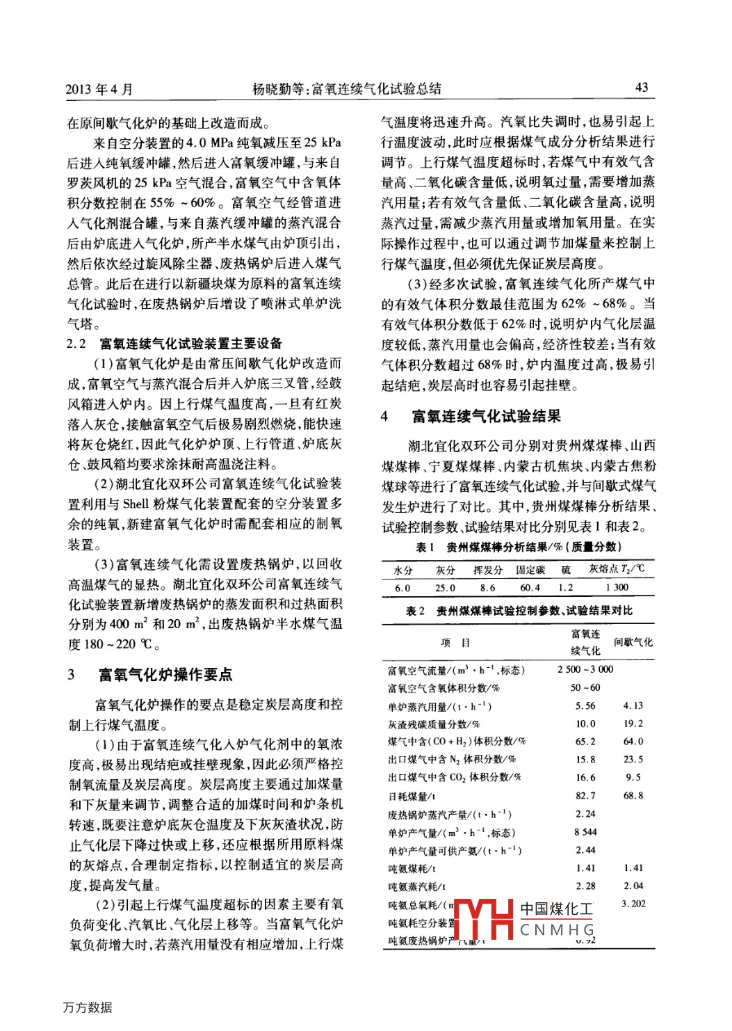 化肥工業(yè)第40卷第2期富氧連續(xù)氣化試驗總結(jié)楊曉勤,古永紅(湖北宜化集團有限責(zé)任公司湖北宜昌443000摘要簡要介紹了富氧連續(xù)氣化技術(shù)的特點、工藝流程、主要設(shè)備以及富氧氣化爐的操作要點,并提出了設(shè)計中需要注意的事項。富氧連續(xù)氣化試驗結(jié)罘表明:富氧氣化爐的哋氨煤耗在1.4t左右,產(chǎn)氣量比間歇氣化爐提高50%以上,廢熱鍋爐和夾套所產(chǎn)蒸汽基本能自給。關(guān)鍵詞富氧氣化炭層控制上行煤氣溫度試驗Sum-Up of Experiments on Continuous Gasification with Oxygen-Enriched AirYang Xiaoqin, Gu YoHubei Yihua Group Co, Ltd. Hubei Yichang 443000)Abstract A brief introduction is given to the continuous gasification technology with oxygenenriched air, its special features, technological process, main pieces of equipment and main points inthe operation of the gasification with oxygen-enriched air, and points for attention are mentioned in itsdesign. The experimental results indicate that the gasifier consumes about 1. 4 t of coal per ton ofammonia,its gas production is over 50% higher than that of the batch coal gasifier, and the steamfrom the waste heat boiler and the jacket is basically self-sufficientKeywords gasification with oxygen-enriched air carbon layer control upgoing gas temperature1富氧連續(xù)氣化技術(shù)特點越高,對純氧的消耗量也越高。由于需要消耗氧氣,因此富氧連續(xù)氣化技術(shù)實施的關(guān)鍵在于能否富氧連續(xù)氣化和間歇氣化技術(shù)均屬于常壓固獲得穩(wěn)定、經(jīng)濟的富氧源。湖北宜化集團有限責(zé)任定層氣化,前者是以純氧、富氧空氣和水蒸氣為氣公司通過對國內(nèi)采用富氧連續(xù)氣化技術(shù)的河南平化劑同時從爐底進(jìn)入,所產(chǎn)煤氣由爐頂引出;后者頂山、安徽淮化,福建三明3家化肥企業(yè)的考察:富是以空氣和水蒸氣為氣化劑,由空氣吹風(fēng)和水蒸氧連續(xù)氣化所需的氧濃度一般在55%~60%(體氣上、下吹交替制取半水煤氣。積分?jǐn)?shù));對于φ2740,φ3000和φ3300mm煤與間歇氣化技術(shù)相比,富氧連續(xù)氣化技術(shù)具氣爐,富氧空氣流量在200-4000m3/h;這有如下特點:工藝流程及生產(chǎn)操作大為簡化,安全3家企業(yè)全部采用深冷法制氧,河南平頂山的制性也得以提高;由于沒有吹風(fēng)階段的大流量空氣氧能力是6500m3/h,安徽淮化利用與德士古水通過床層,炭層中的氣體流速大幅降低,因而可以煤漿氣化裝置配套的2800m3/h空分裝置所產(chǎn)使用粒度較小的原料煤,灰渣含碳量也較間歇氣的部分氧氣,福建三明是利用附近鋼鐵企業(yè)的氧化技術(shù)的低,氣化反應(yīng)區(qū)溫度穩(wěn)定,氣化強度可比氣(5300m3/h)。由于富氧連續(xù)氣化對氧氣的濃間歇氣化提高50%以上;不存在間歇氣化工藝中度要求不高,因此可考慮采用變壓吸附制氧閥門頻繁切換的問題,從而大大延長有效制氣時間,使氣化強度及單爐氣化能力大幅提高;可充分2富氧氣“中國煤化主要設(shè)備利用原有的常壓固定層氣化爐,投資增加不大。2.1富氧CNMHG般氧氣純度越高,氣化強度越大,氣化效率湖北宜化雙環(huán)公司富氧連續(xù)氣化試驗裝置是2013年4月楊曉勤等:富氧連續(xù)氣化試驗總結(jié)在原間歇氣化爐的基礎(chǔ)上改造而成。氣溫度將迅速升高。汽氧比失調(diào)時,也易引起上來自空分裝置的4.0MPa純氧減壓至25kPa行溫度波動,此時應(yīng)根據(jù)煤氣成分分析結(jié)果進(jìn)行后進(jìn)入純氧緩沖罐,然后進(jìn)入富氧緩沖罐,與來自調(diào)節(jié)。上行煤氣溫度超標(biāo)時,若煤氣中有效氣含羅茨風(fēng)機的25kPa空氣混合,富氧空氣中含氧體量高、二氧化碳含量低,說明氧過量,需要增加蒸積分?jǐn)?shù)控制在5%~60%。富氧空氣經(jīng)管道進(jìn)汽用量;若有效氣含量低、二氧化碳含量高,說明入氣化劑混合罐,與來自蒸汽緩沖罐的蒸汽混合蒸汽過量,需減少蒸汽用量或增加氧用量。在實后由爐底進(jìn)入氣化爐,所產(chǎn)半水煤氣由爐頂引出,際操作過程中,也可以通過調(diào)節(jié)加煤量來控制上然后依次經(jīng)過旋風(fēng)除塵器廢熱鍋爐后進(jìn)入煤氣行煤氣溫度,但必須優(yōu)先保證炭層高度??偣堋4撕笤谶M(jìn)行以新疆塊煤為原料的富氧連續(xù)(3)經(jīng)多次試驗,富氧連續(xù)氣化所產(chǎn)煤氣中氣化試驗時,在廢熱鍋爐后增設(shè)了噴淋式單爐洗的有效氣體積分?jǐn)?shù)最佳范圍為62%~68%。當(dāng)氣塔。有效氣體積分?jǐn)?shù)低于62%時,說明爐內(nèi)氣化層溫2.2富氧連續(xù)氣化試驗裝置主要設(shè)備度較低,蒸汽用量也會偏高,經(jīng)濟性較差;當(dāng)有效(1)富氧氣化爐是由常壓間歇氣化爐改造而氣體積分?jǐn)?shù)超過68%時,爐內(nèi)溫度過高極易引成,富氧空氣與蒸汽混合后并入爐底三又管經(jīng)鼓起結(jié)疤,炭層高時也容易引起掛壁。風(fēng)箱進(jìn)入爐內(nèi)。因上行煤氣溫度高,一旦有紅炭落入灰倉,接觸富氧空氣后極易劇烈燃燒,能快速4富氧連續(xù)氣化試驗結(jié)果將灰倉燒紅,因此氣化爐爐頂、上行管道爐底灰湖北宜化雙環(huán)公司分別對貴州煤煤棒、山西倉、鼓風(fēng)箱均要求涂抹耐高溫澆注料煤煤棒、寧夏煤煤棒、內(nèi)蒙古機焦塊、內(nèi)蒙古焦粉(2)湖北宜化雙環(huán)公司富氧連續(xù)氣化試驗裝煤球等進(jìn)行了富氧連續(xù)氣化試驗,并與間歇式煤氣置利用與She粉煤氣化裝置配套的空分裝置
